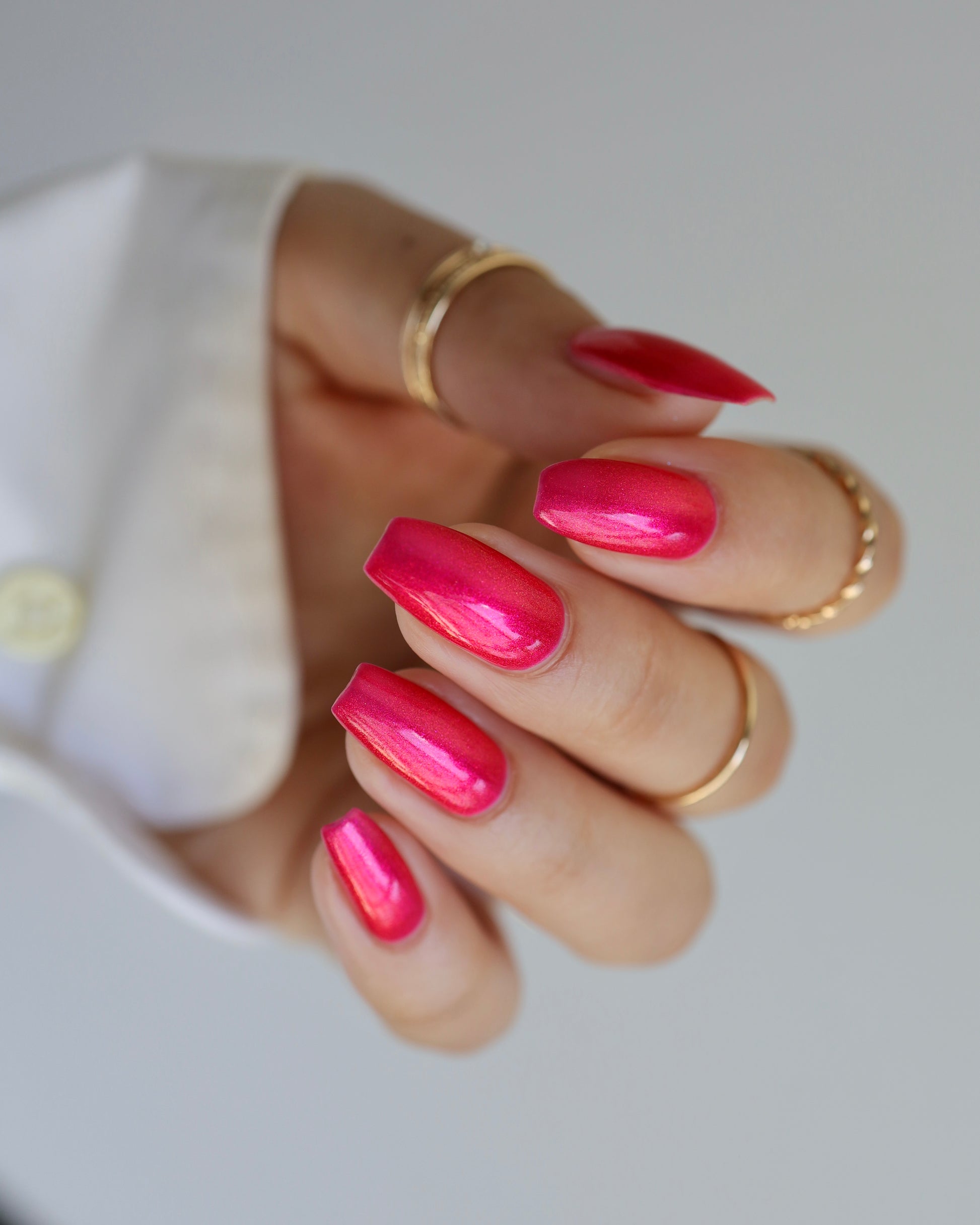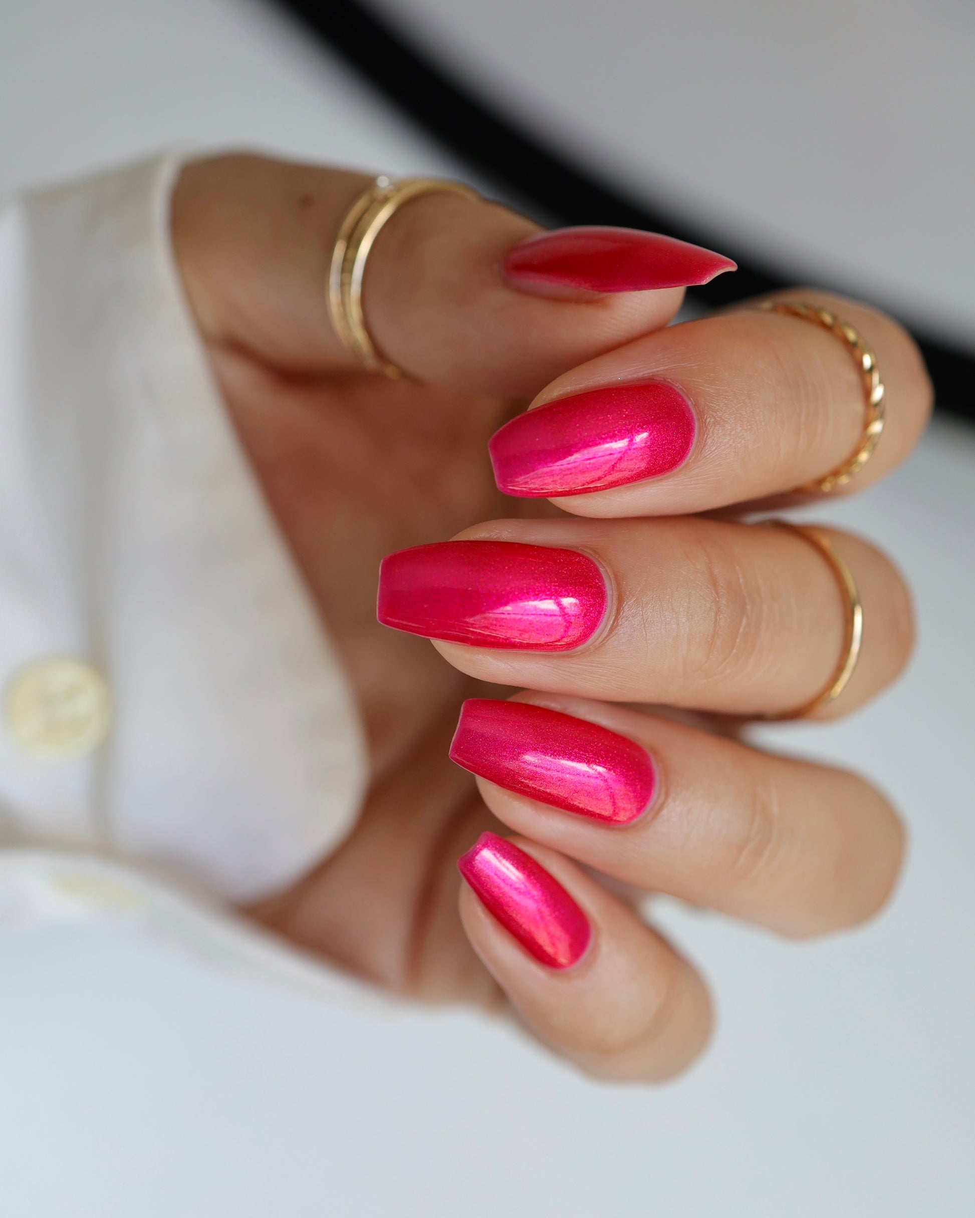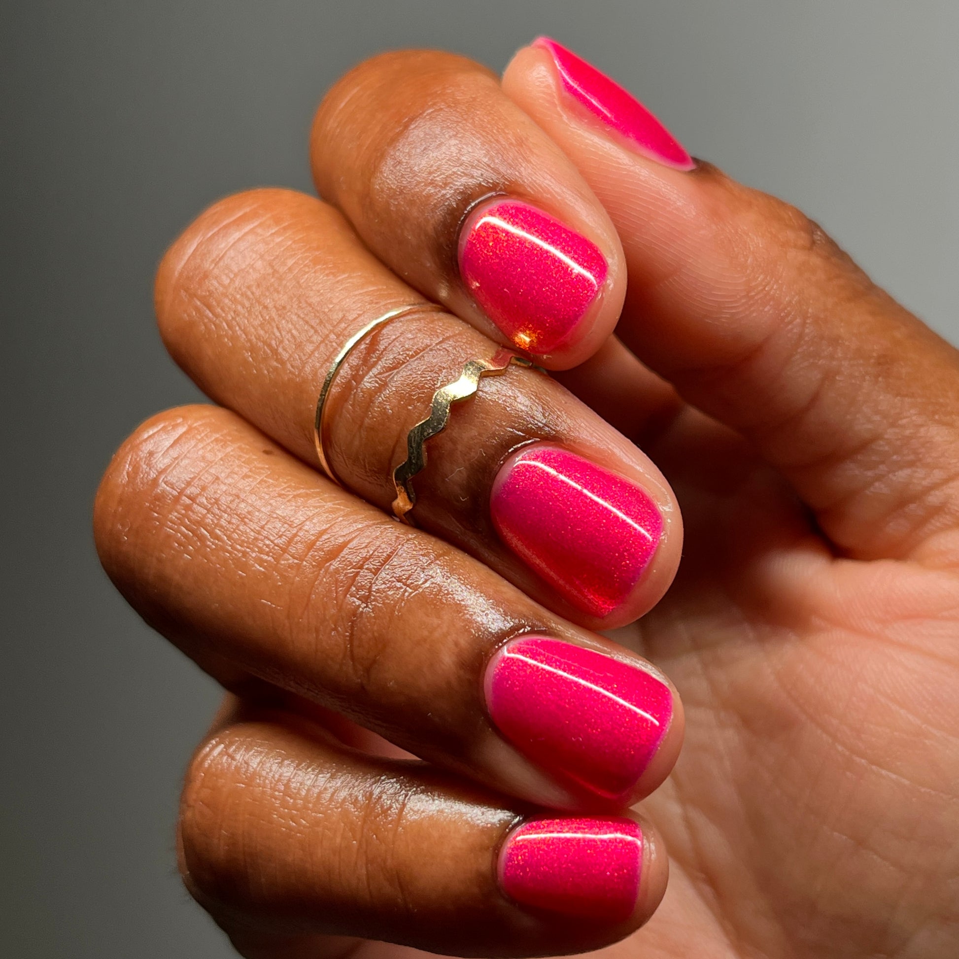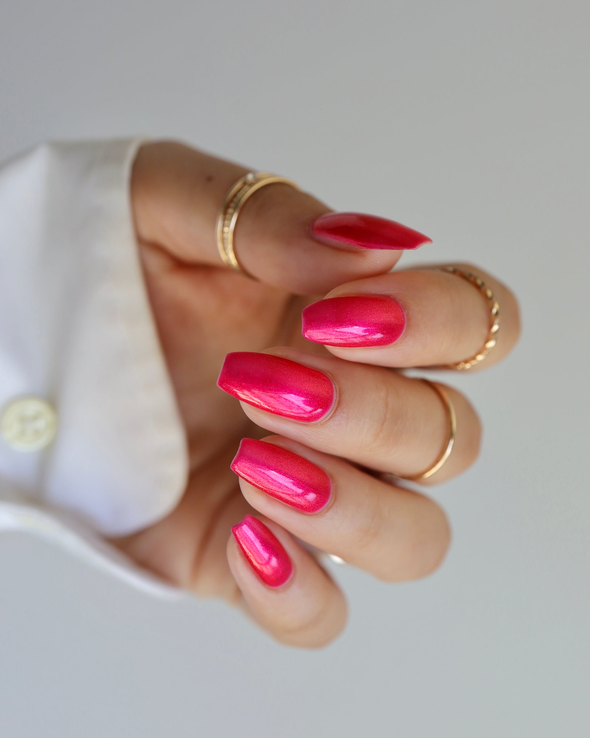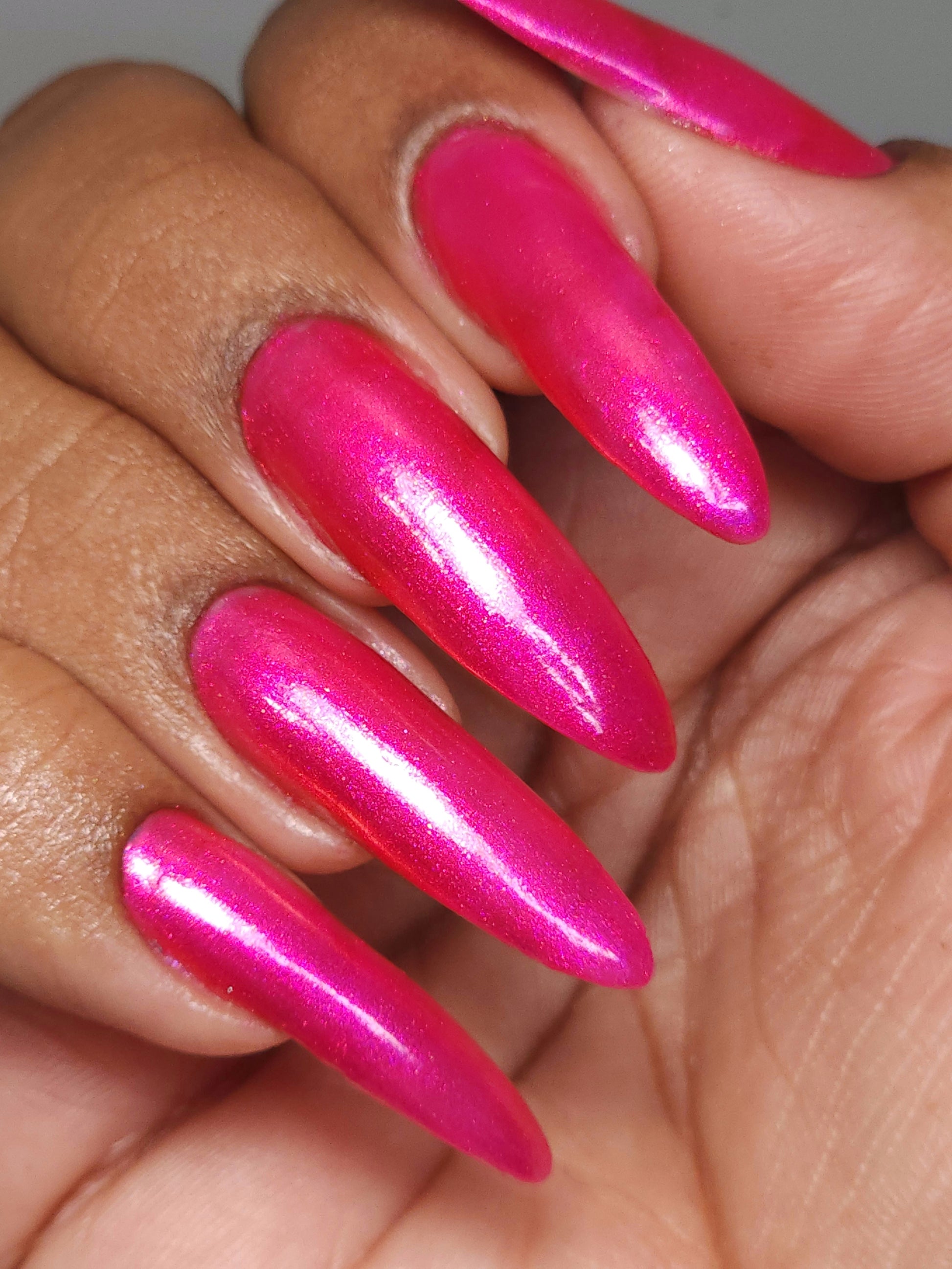 A pinkish-red jelly base with aurora shimmer that shifts from pink to orange to gold