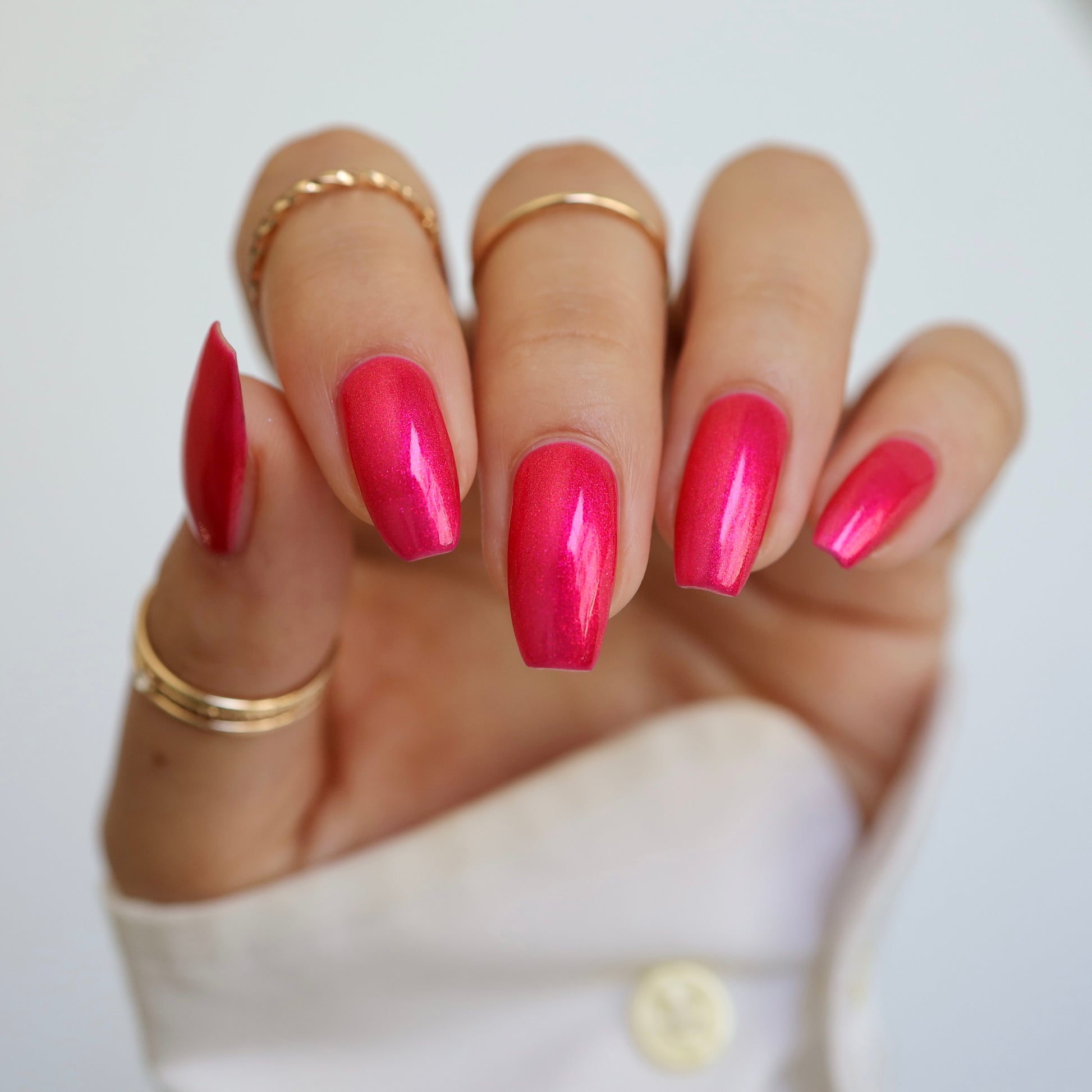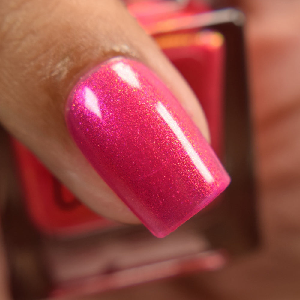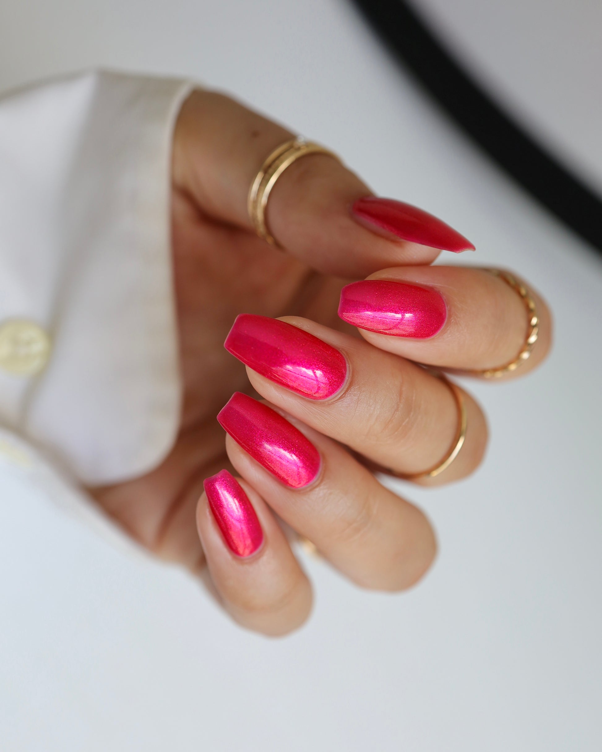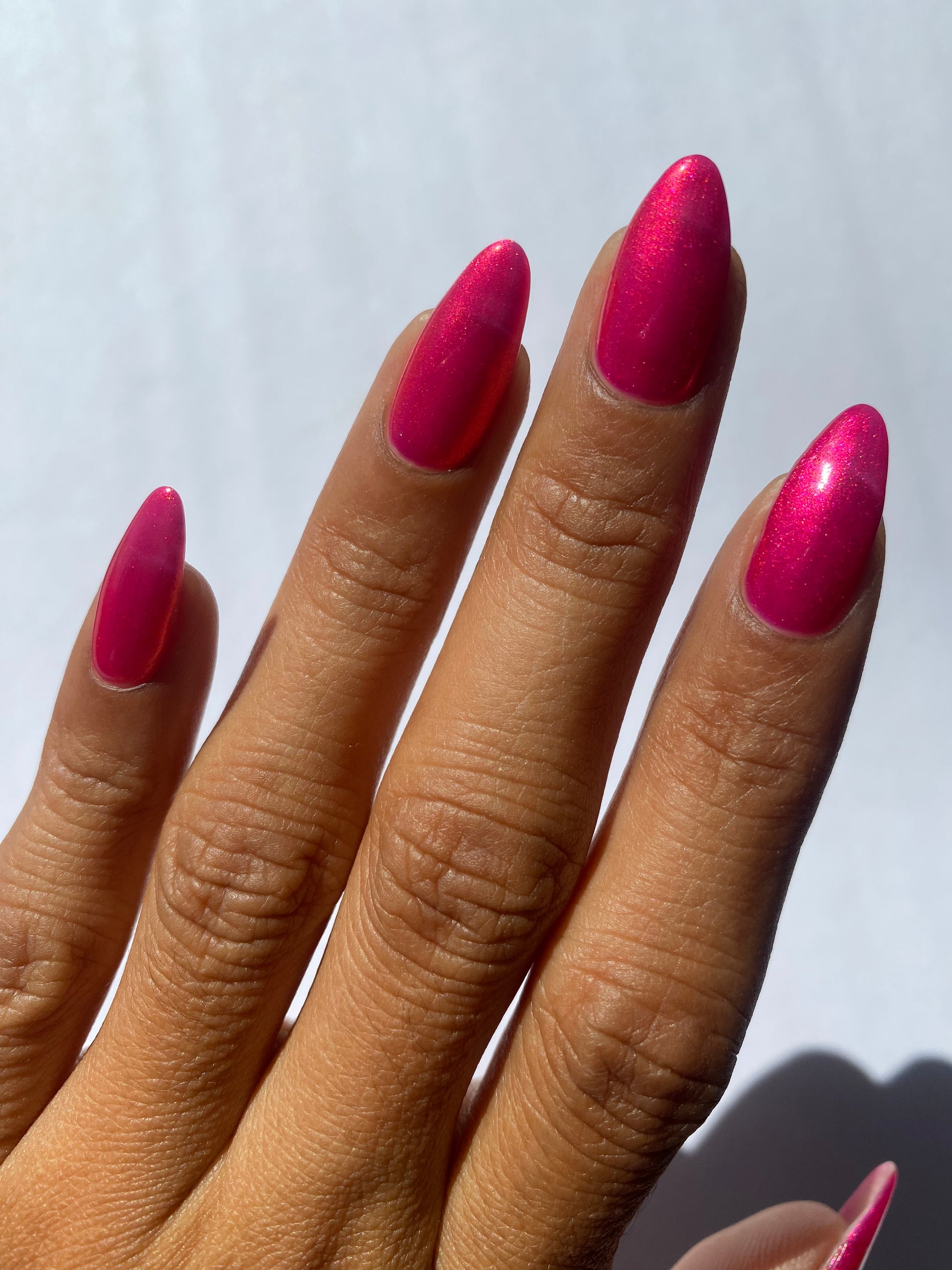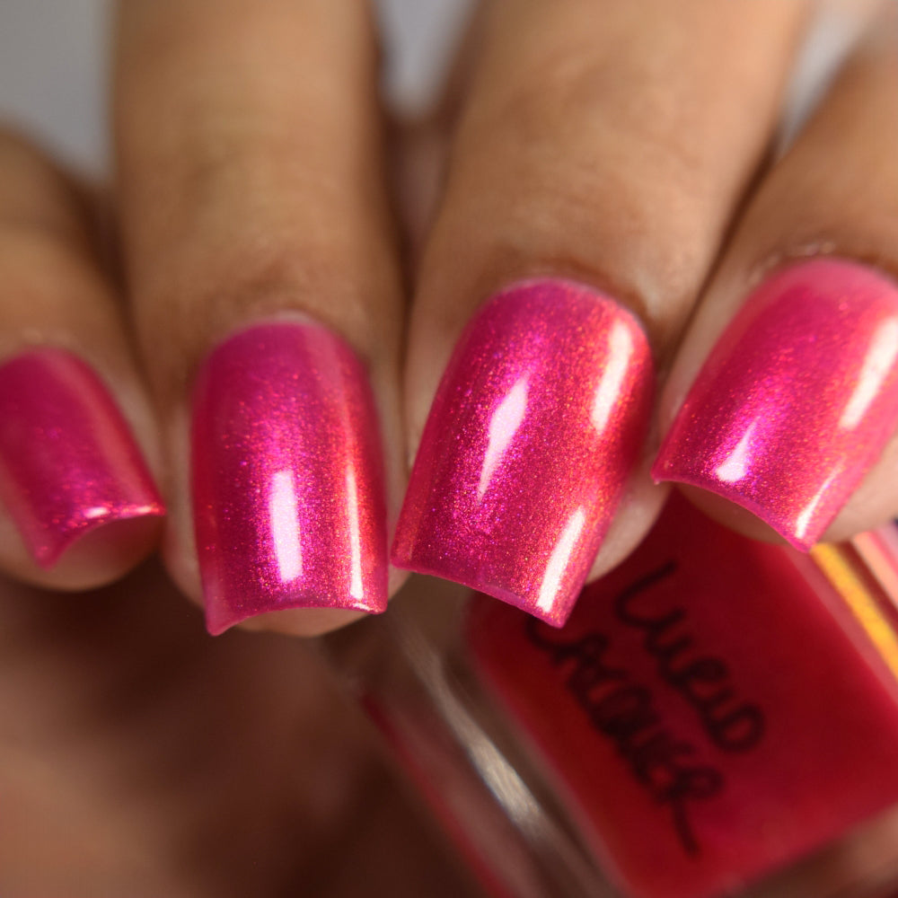 A pinkish-red jelly base with aurora shimmer that shifts from pink to orange to gold