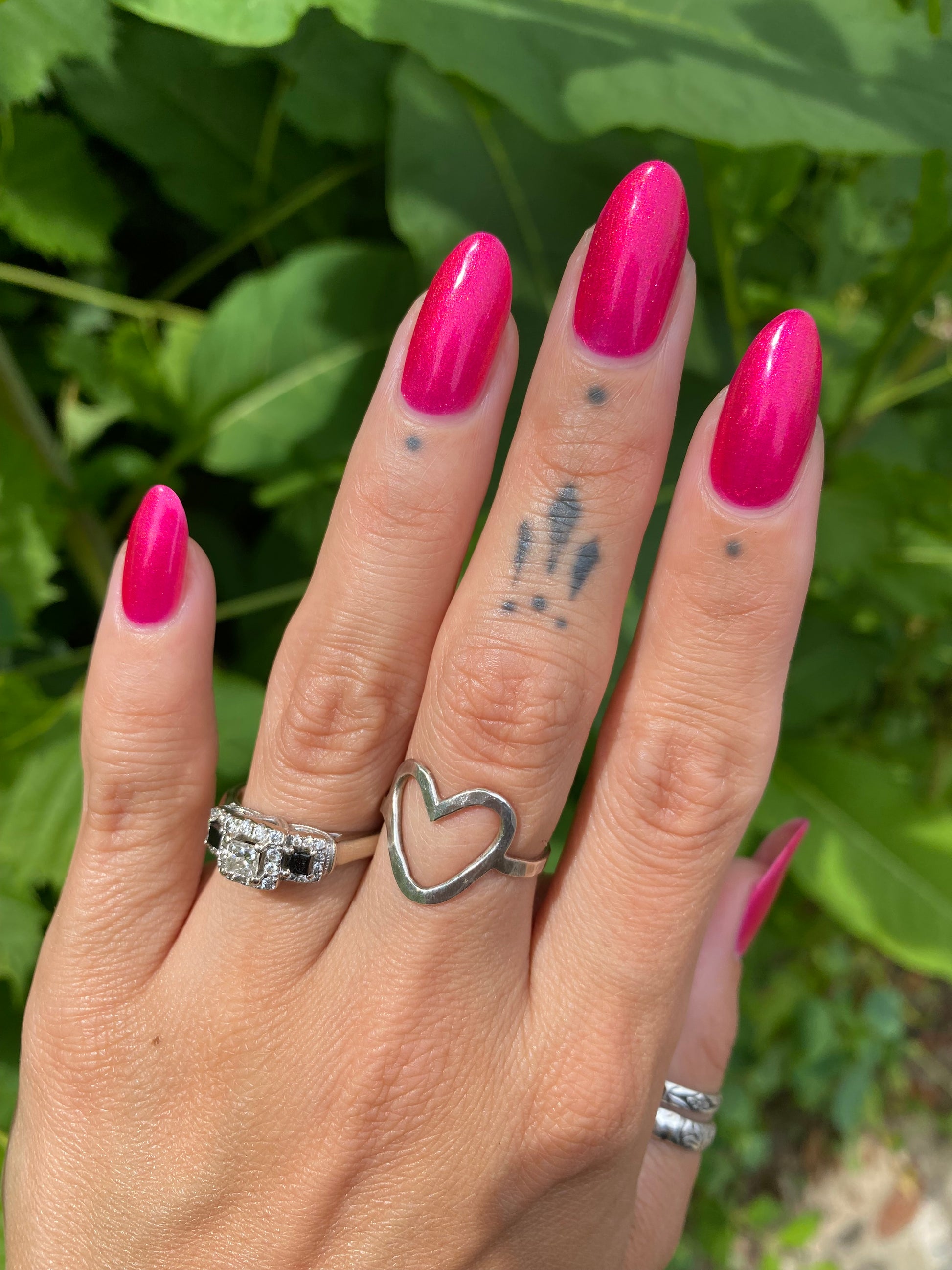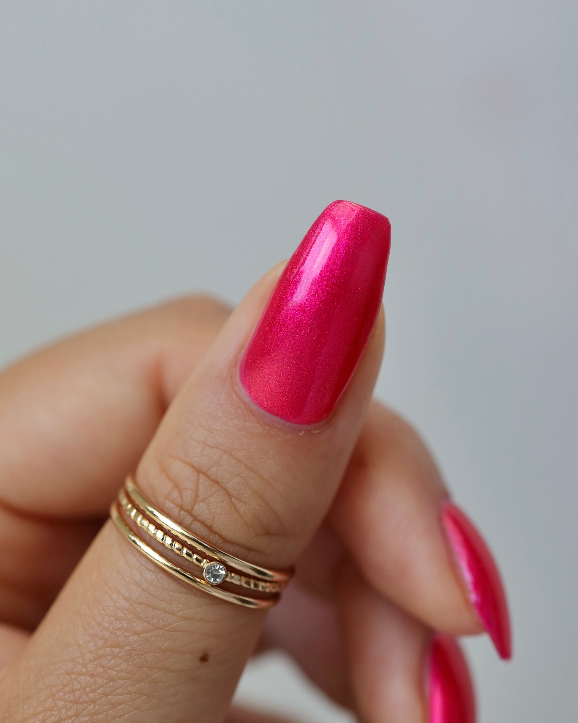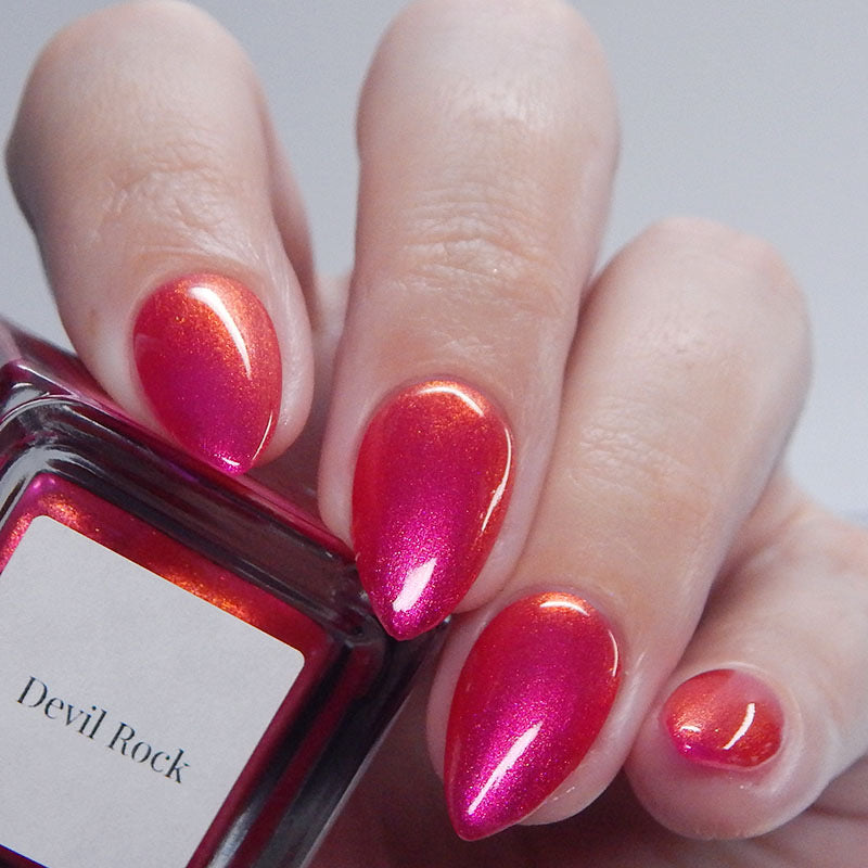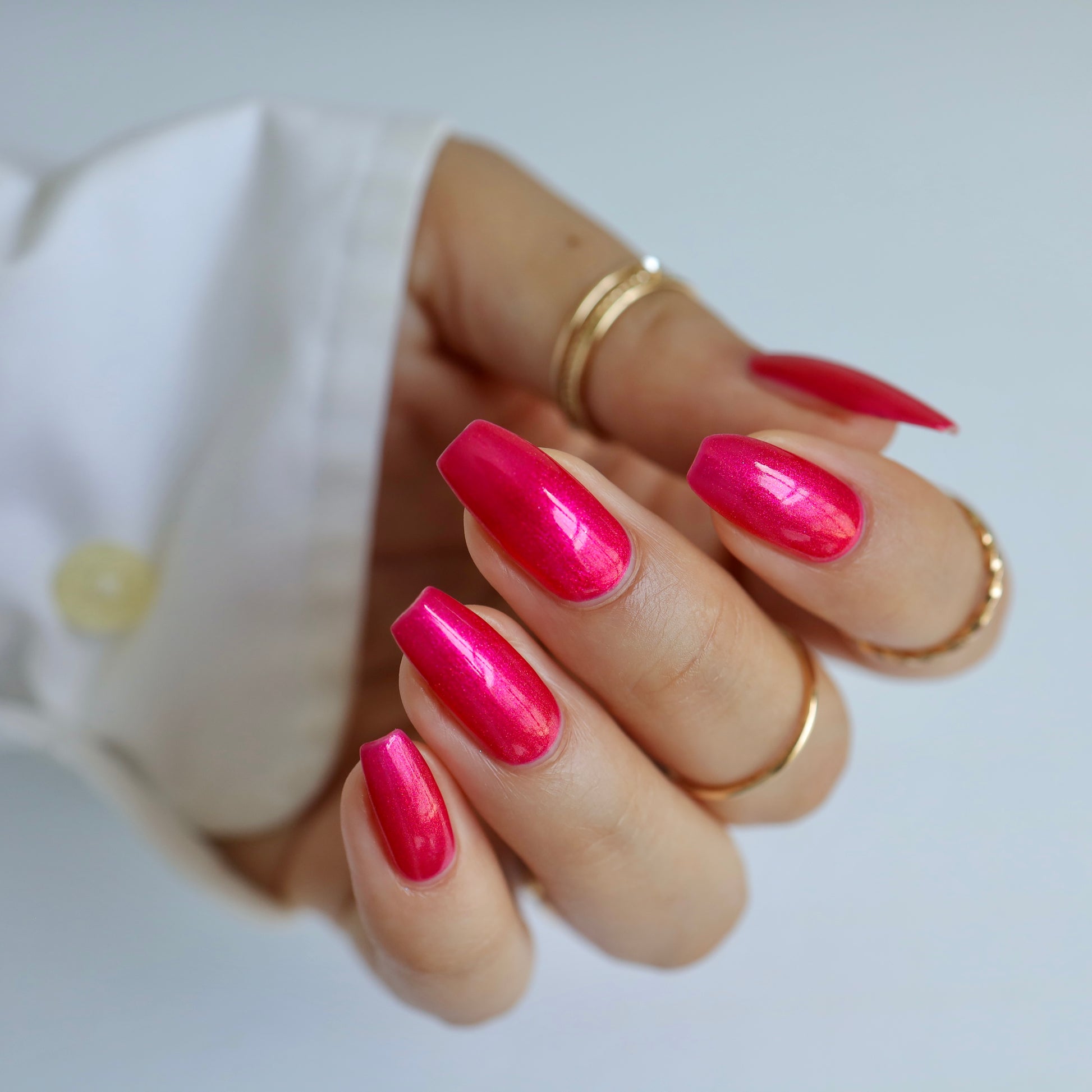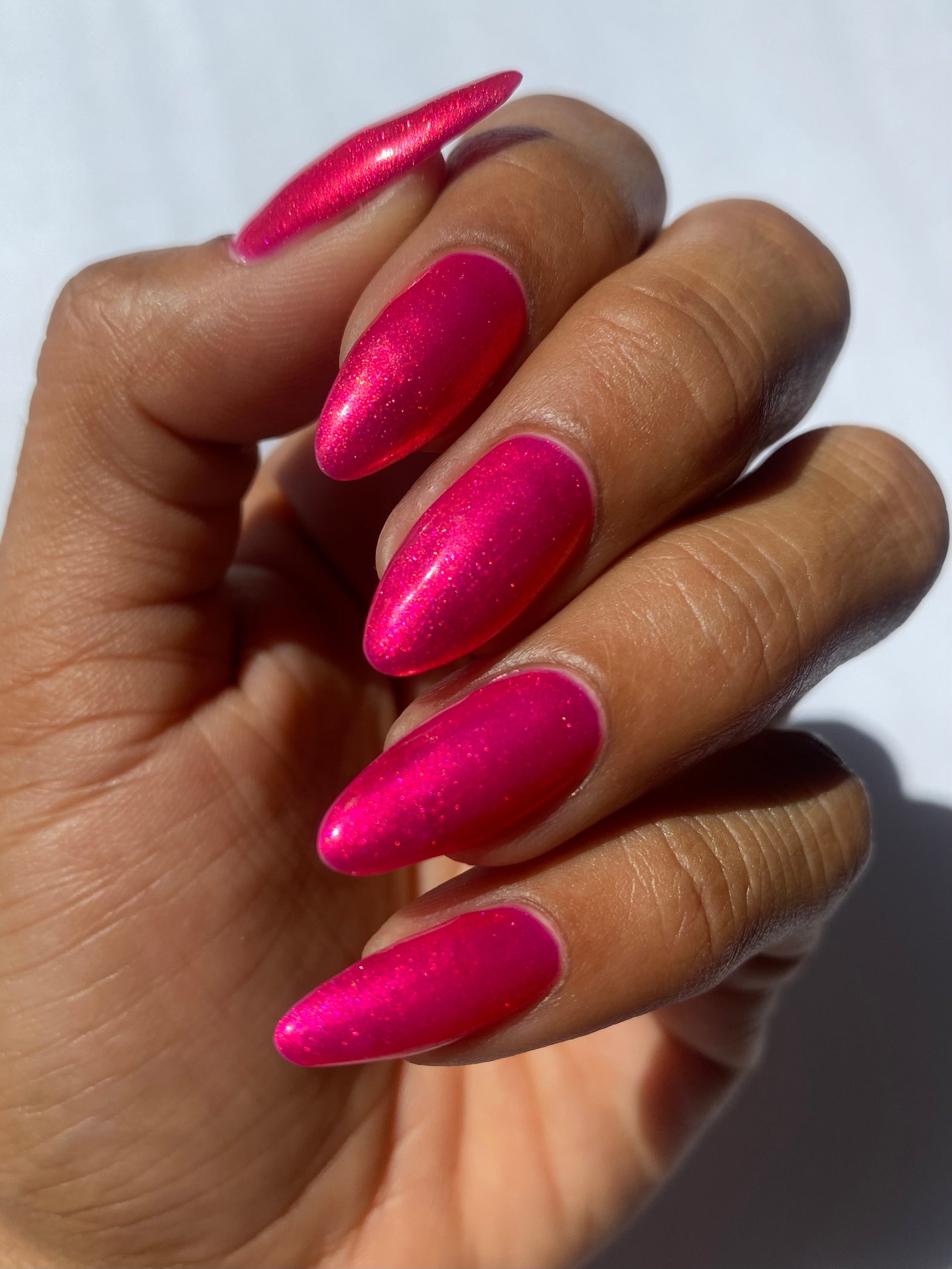 A pinkish-red jelly base with aurora shimmer that shifts from pink to orange to gold