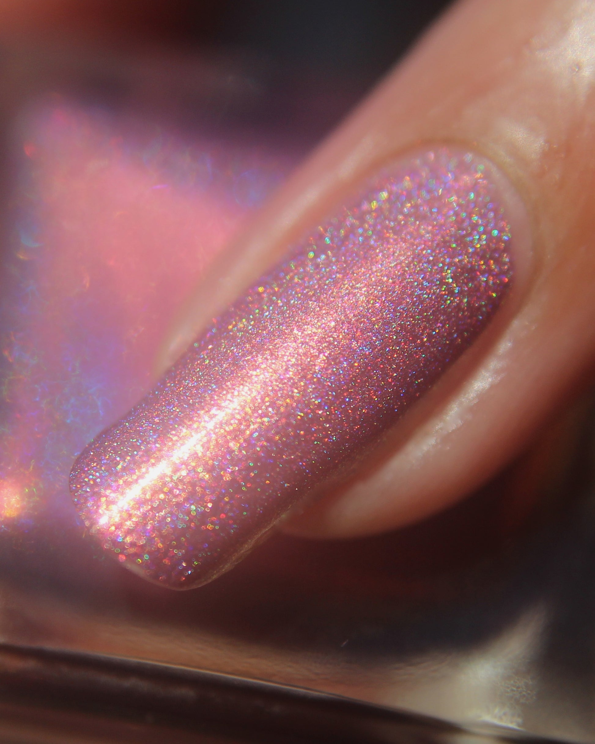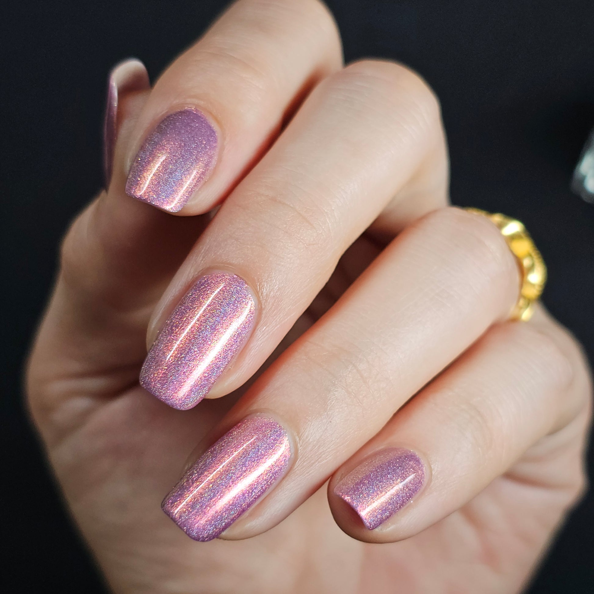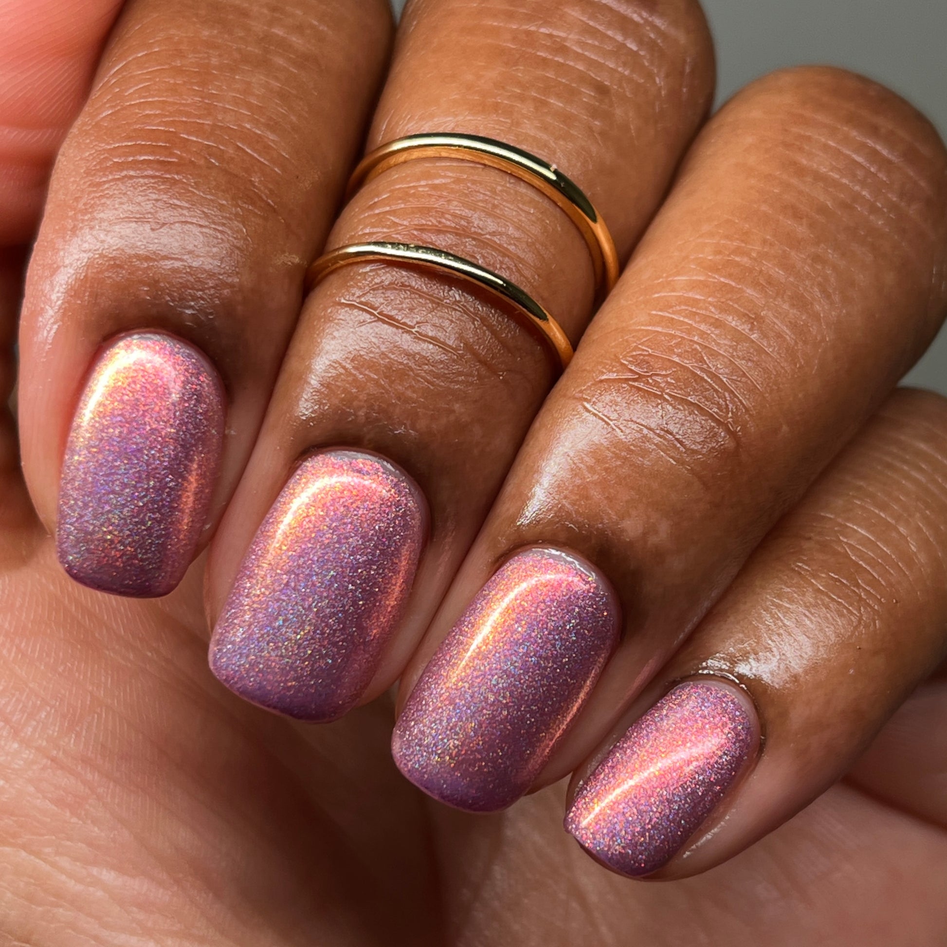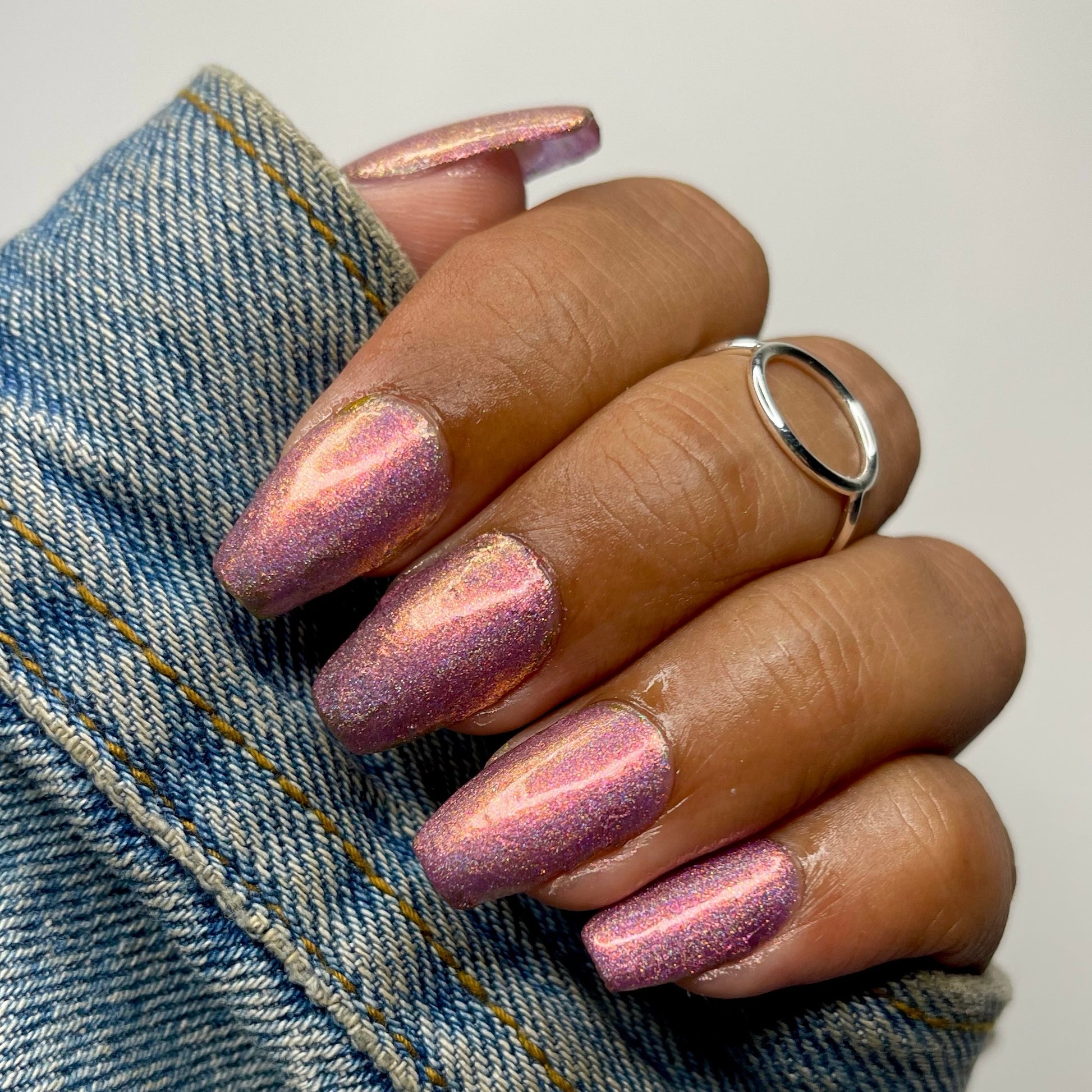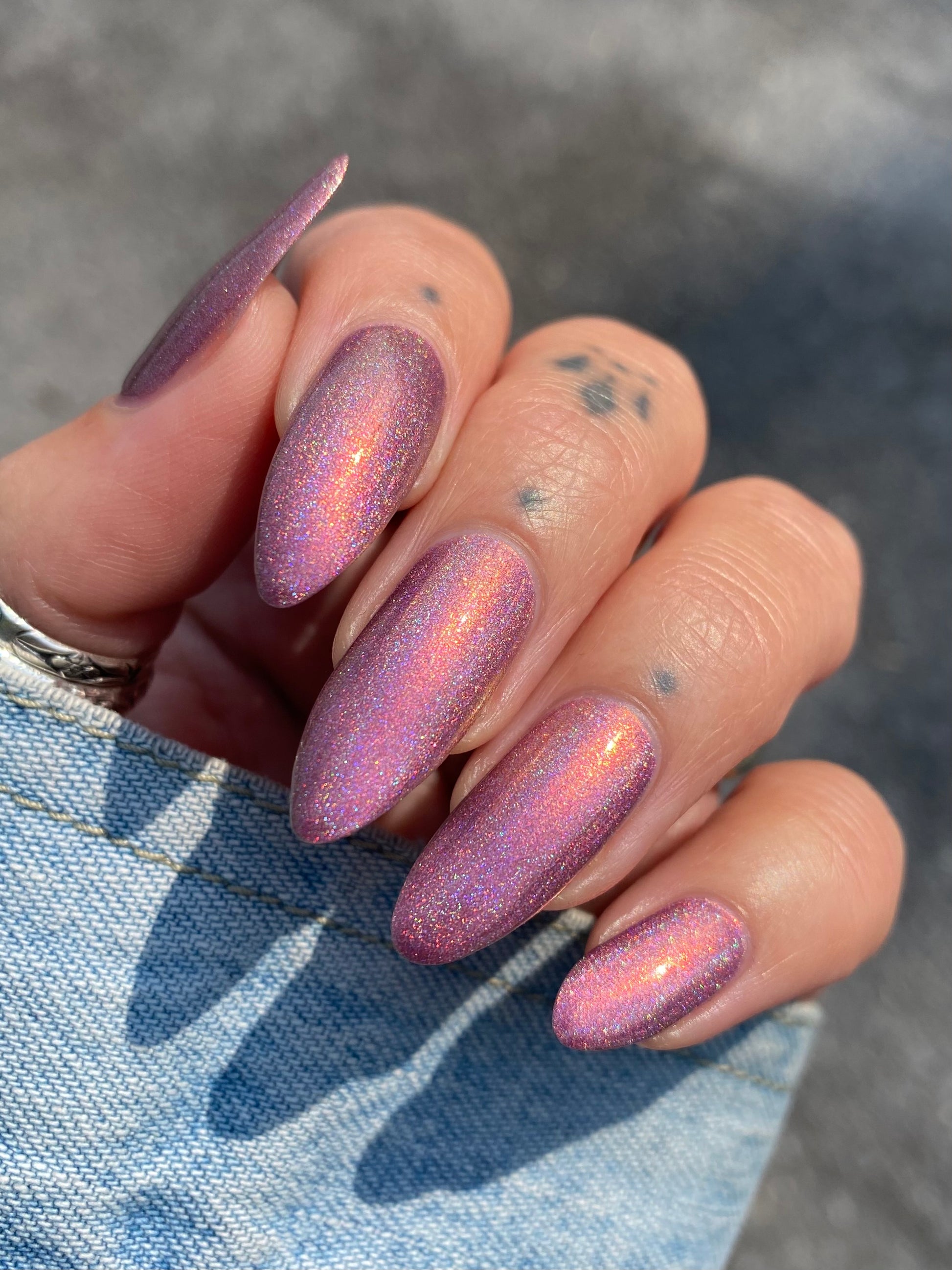 A pink base with holographic pigment and aurora shimmer that shifts from orange to gold
