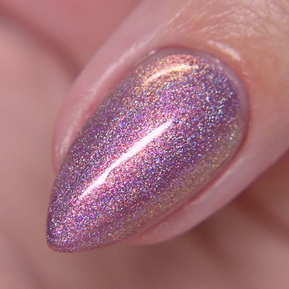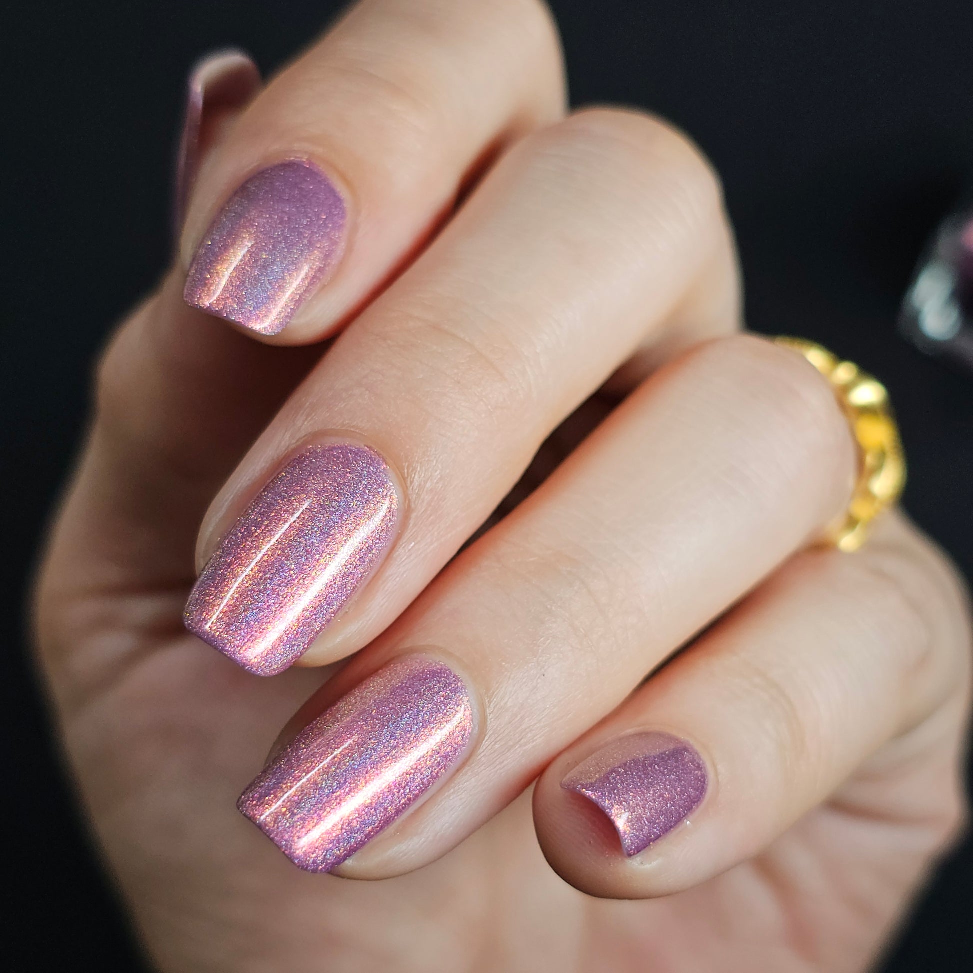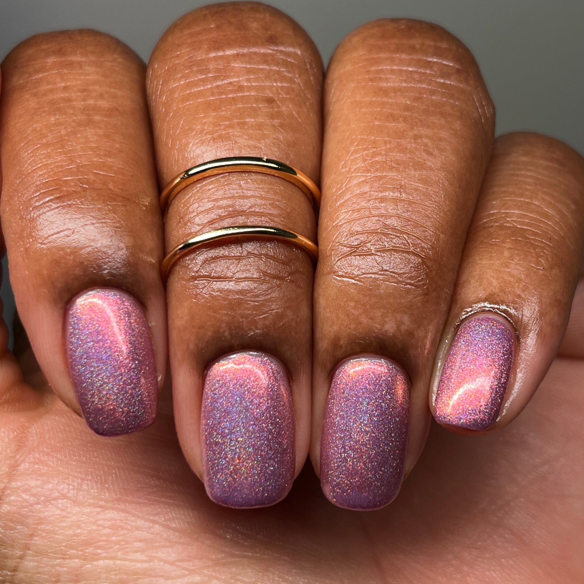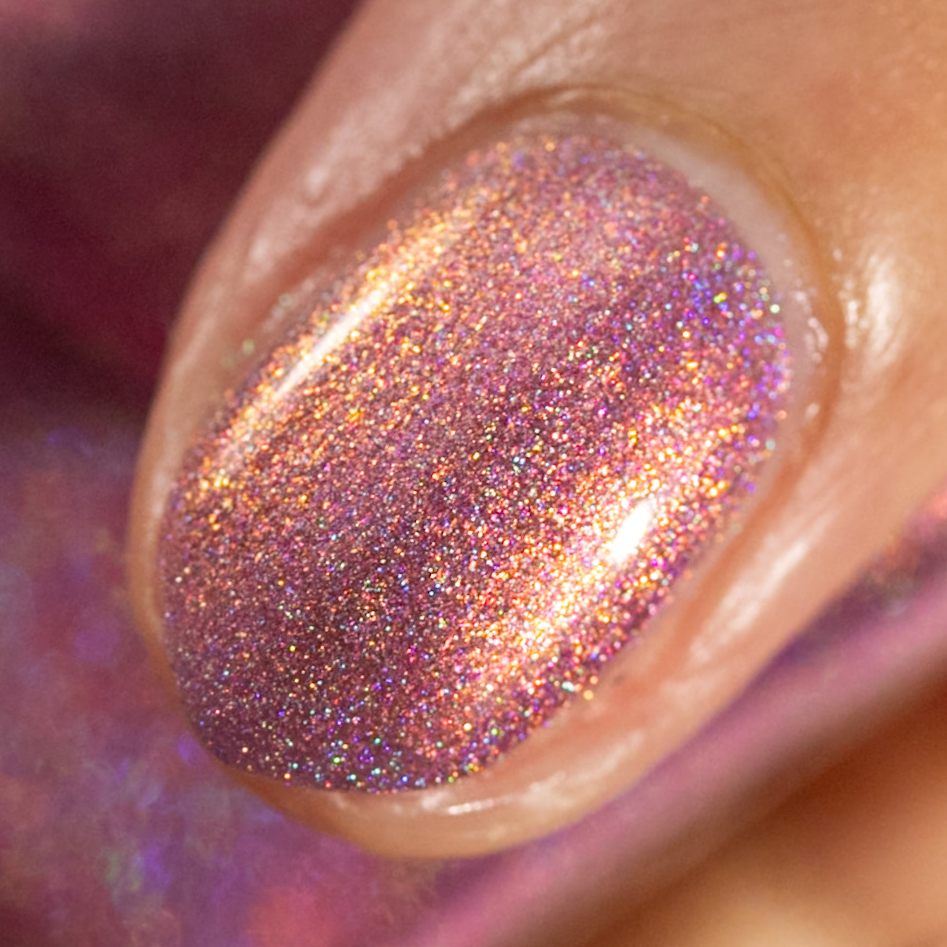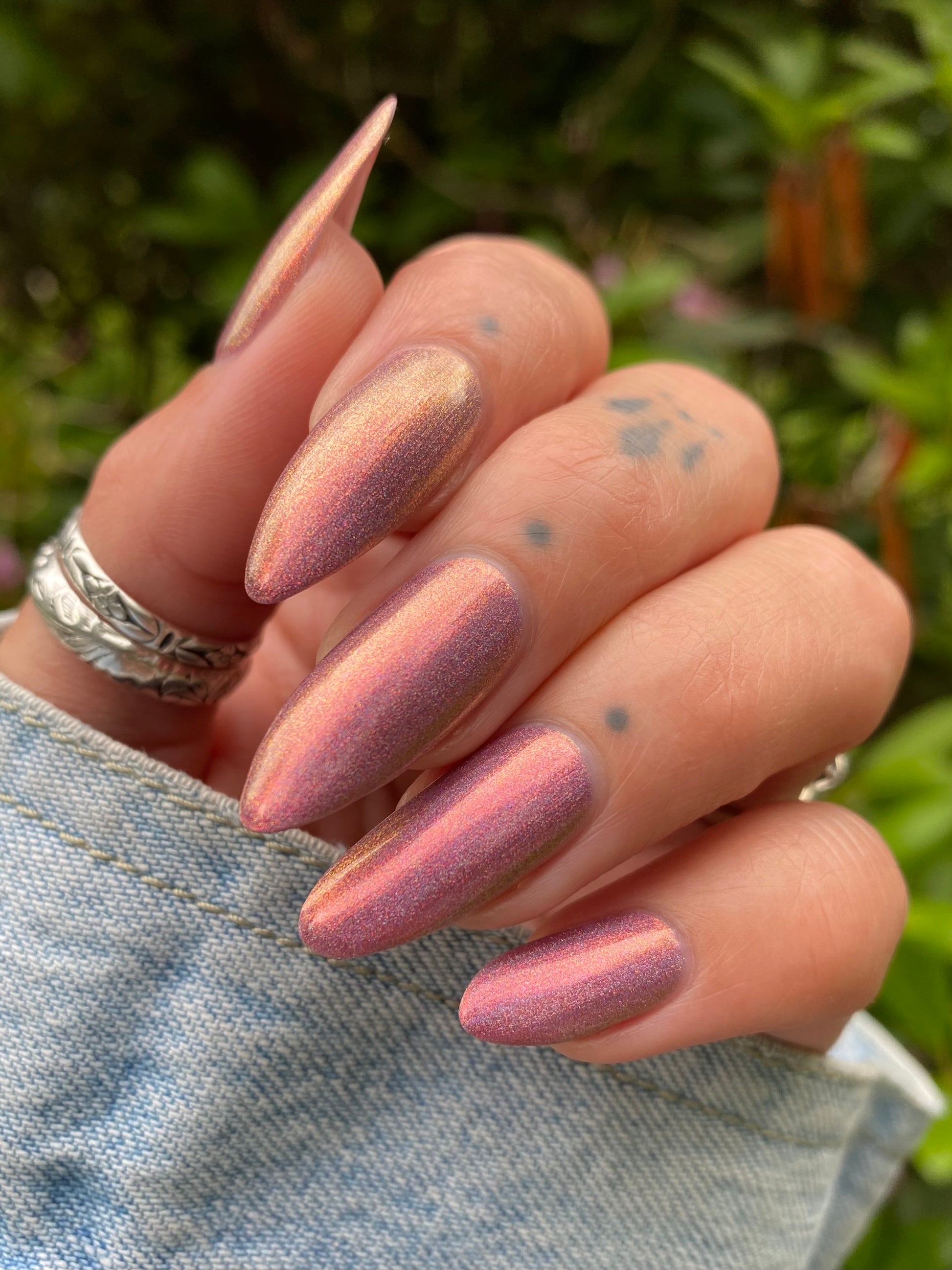 A pink base with holographic pigment and aurora shimmer that shifts from orange to gold