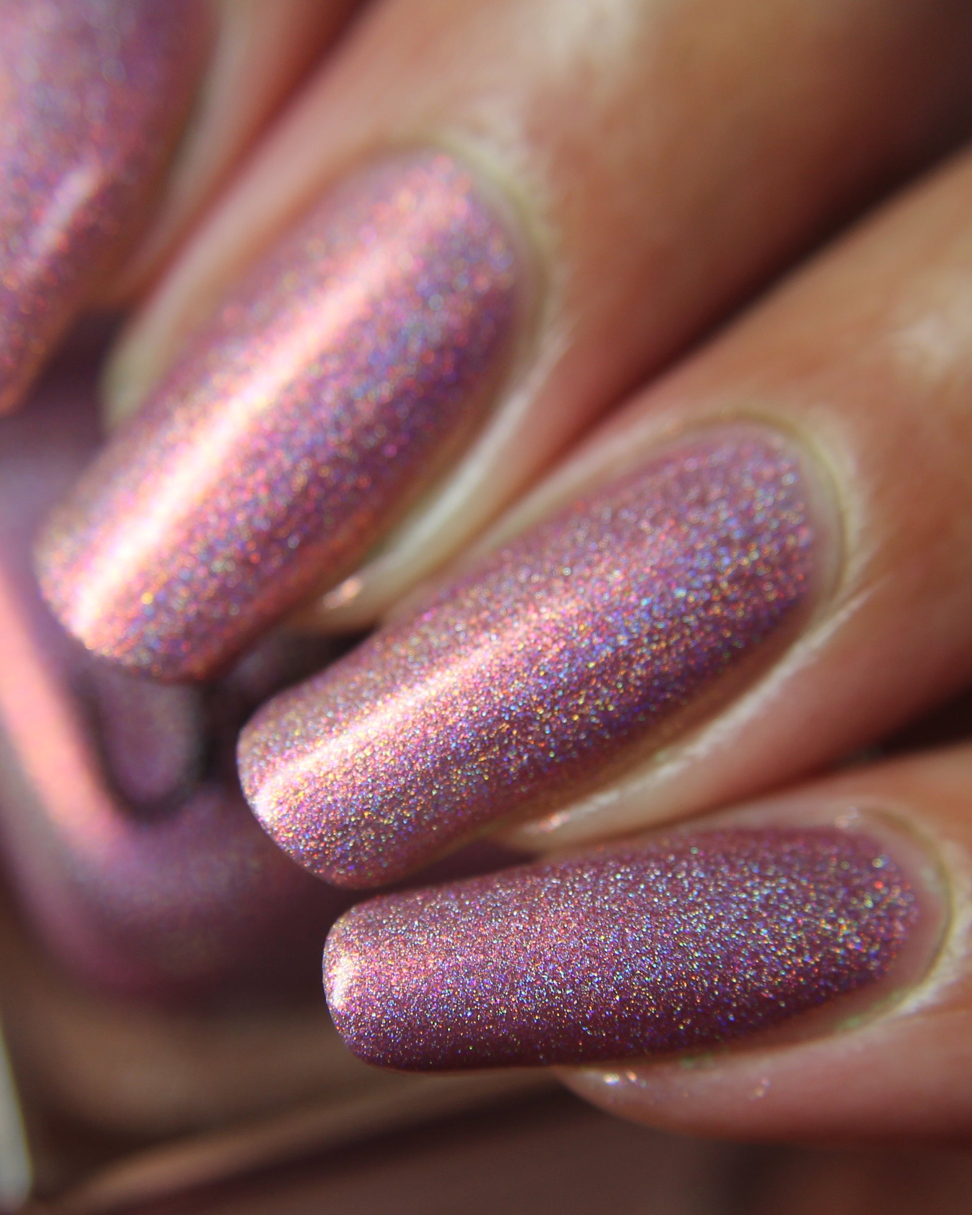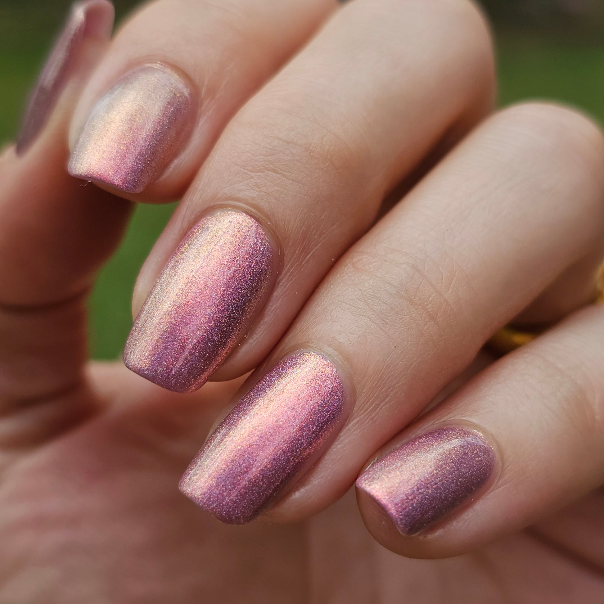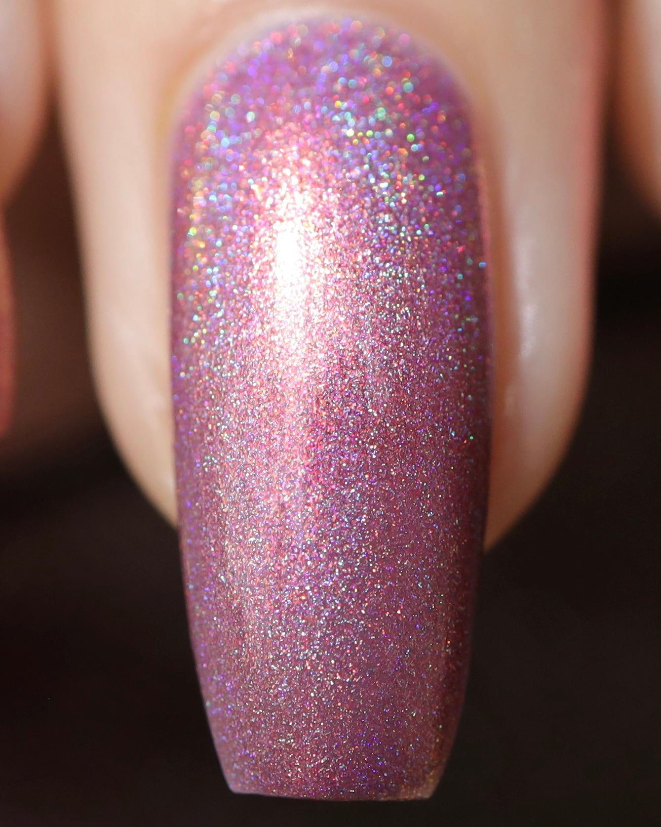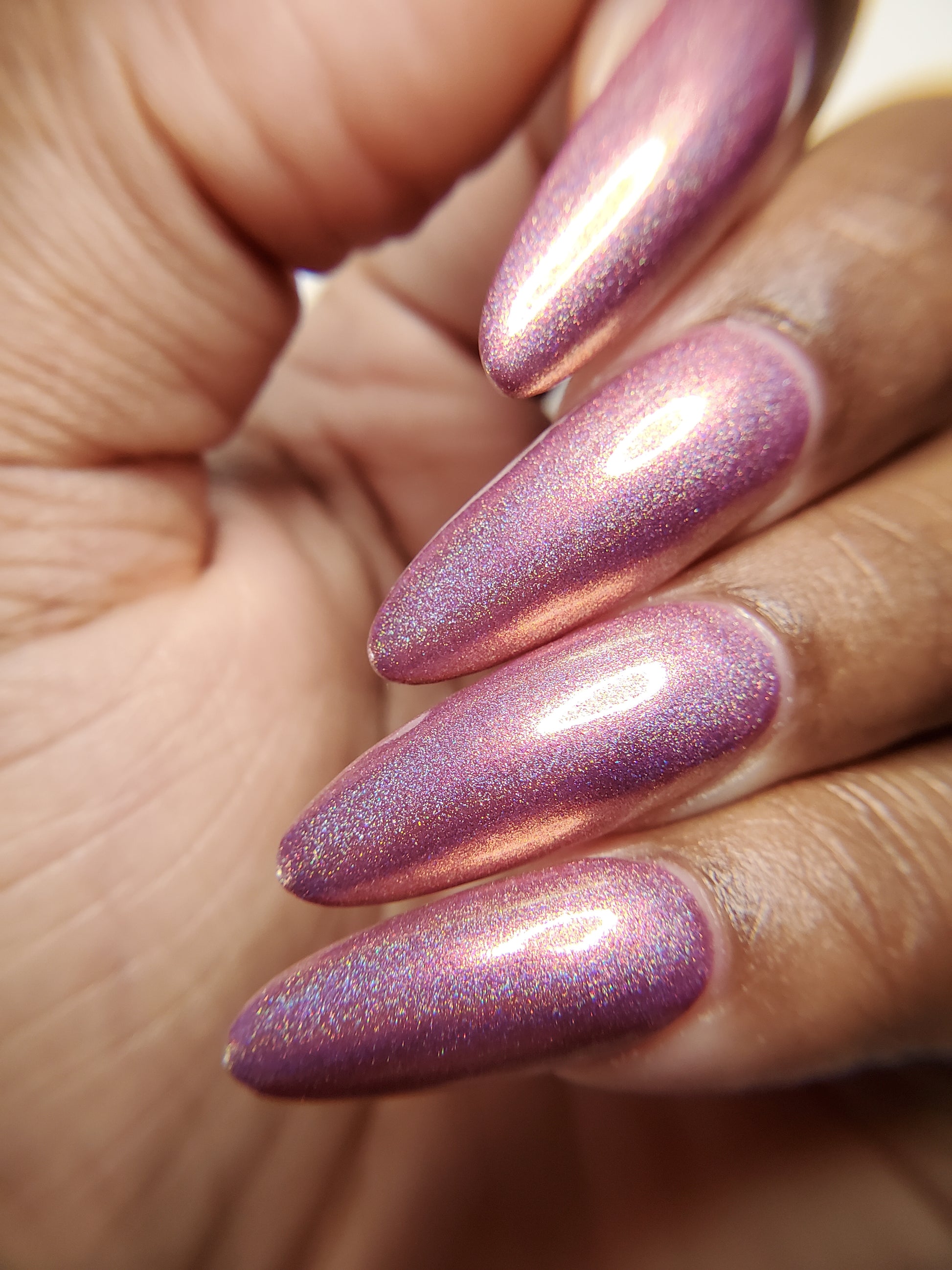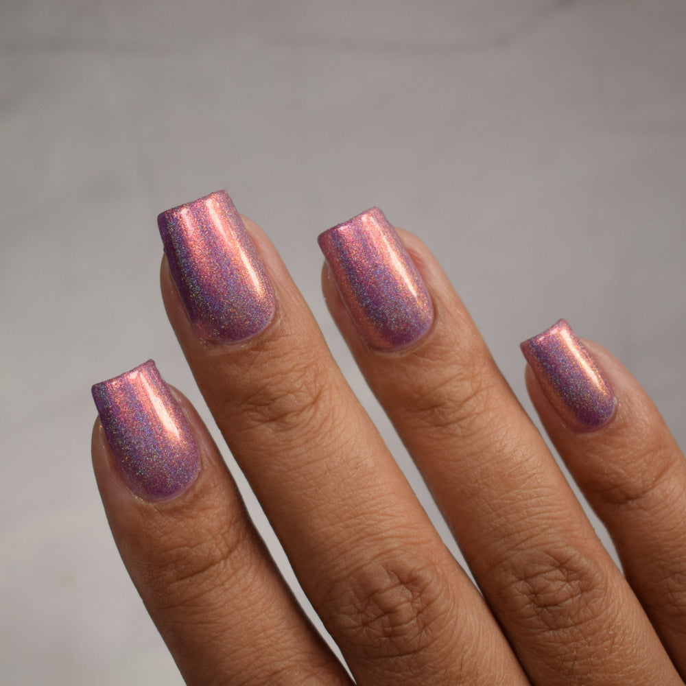 A pink base with holographic pigment and aurora shimmer that shifts from orange to gold