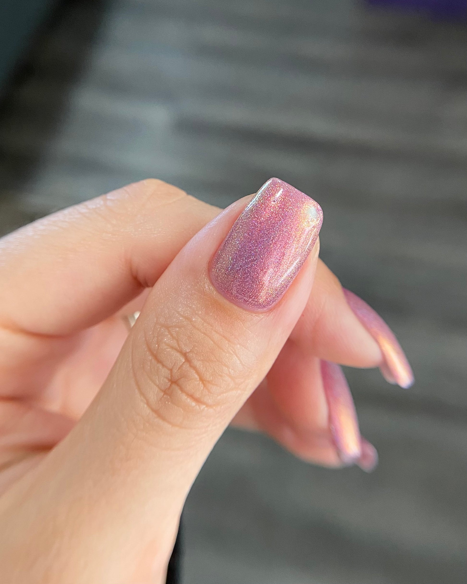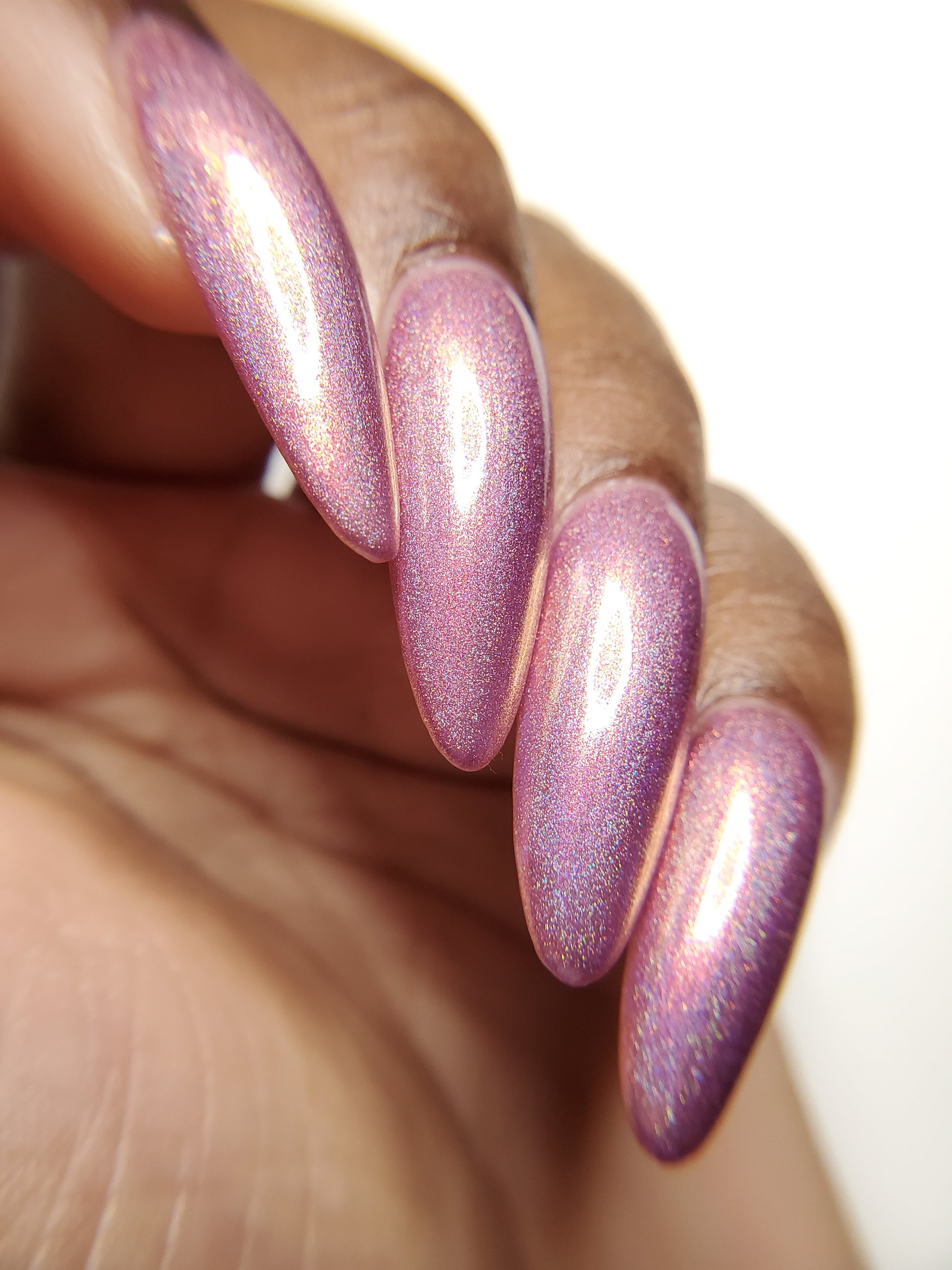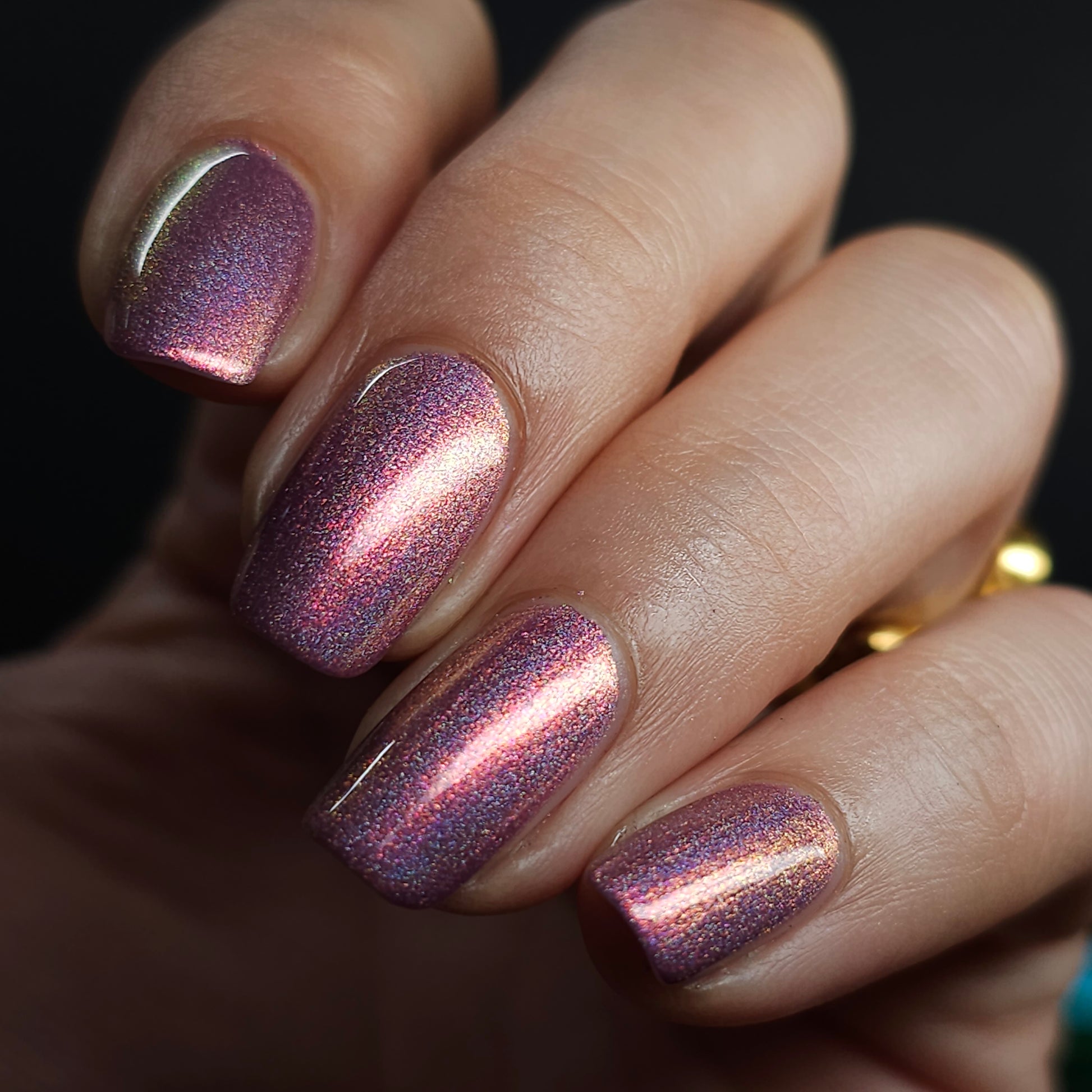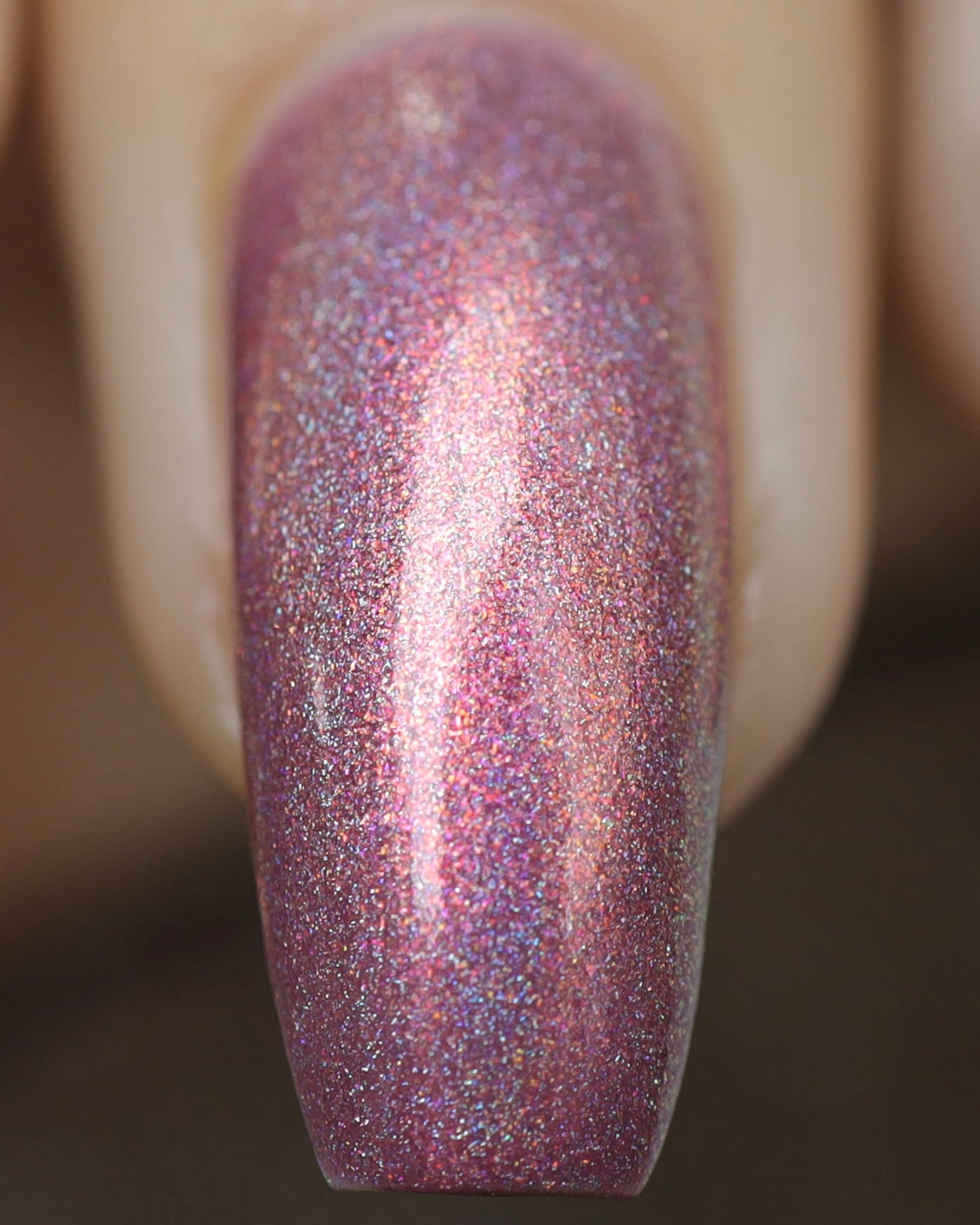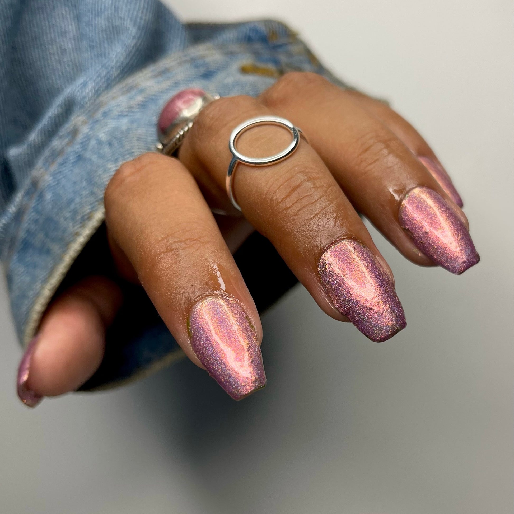 A pink base with holographic pigment and aurora shimmer that shifts from orange to gold