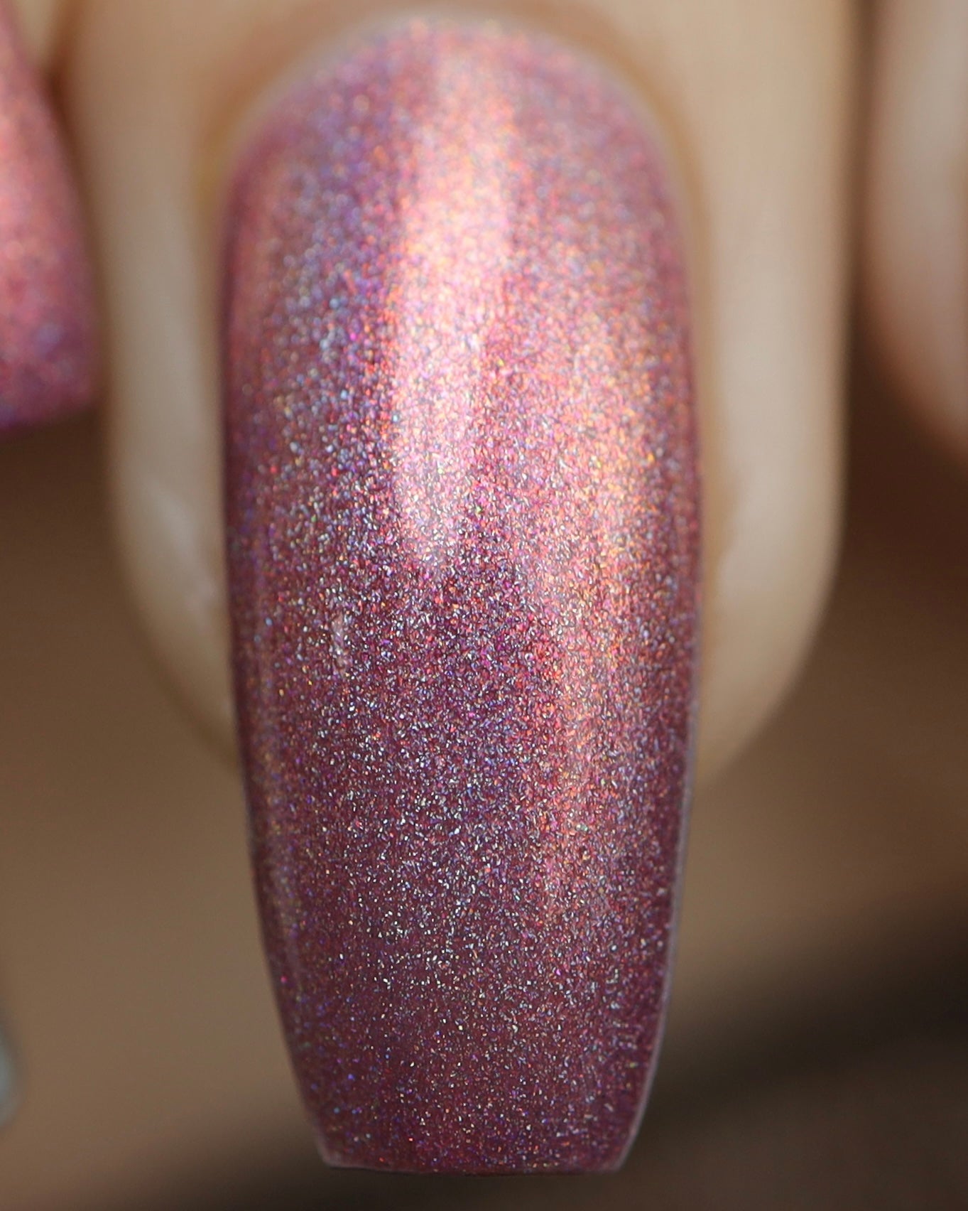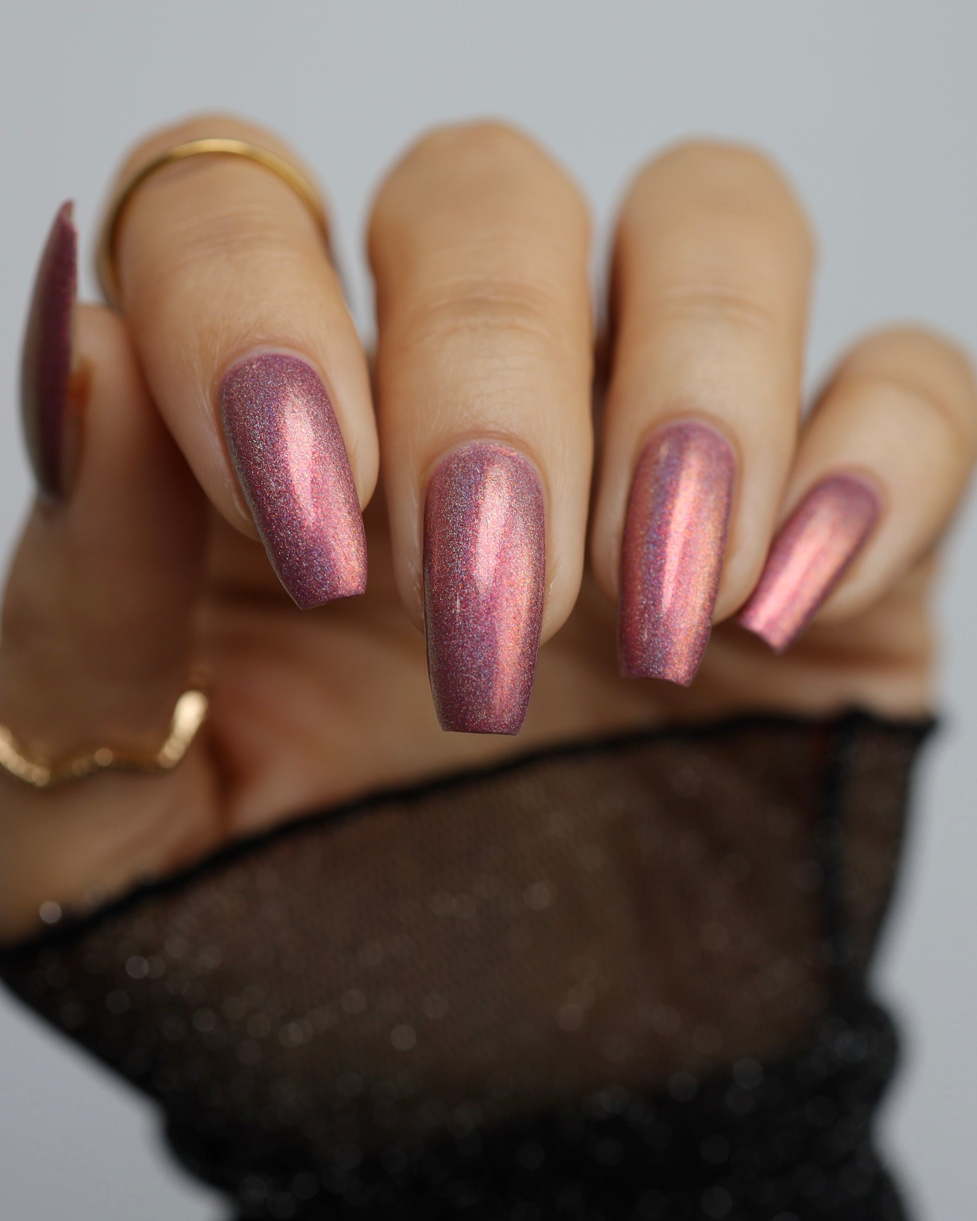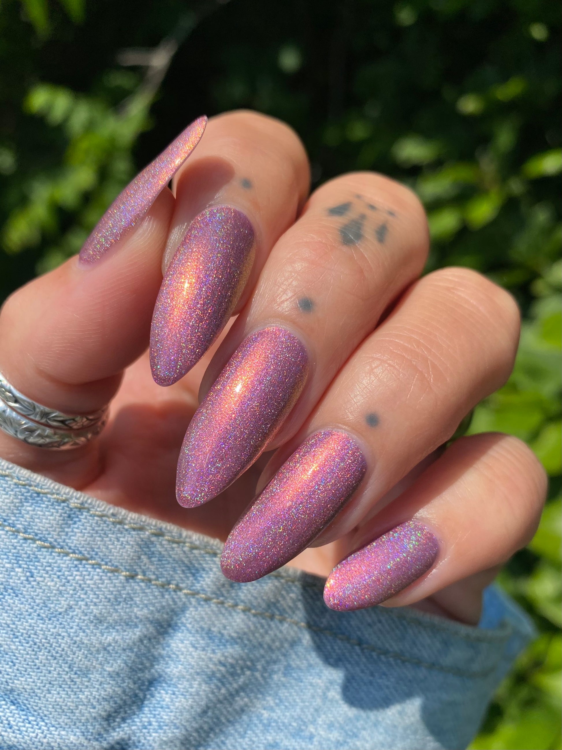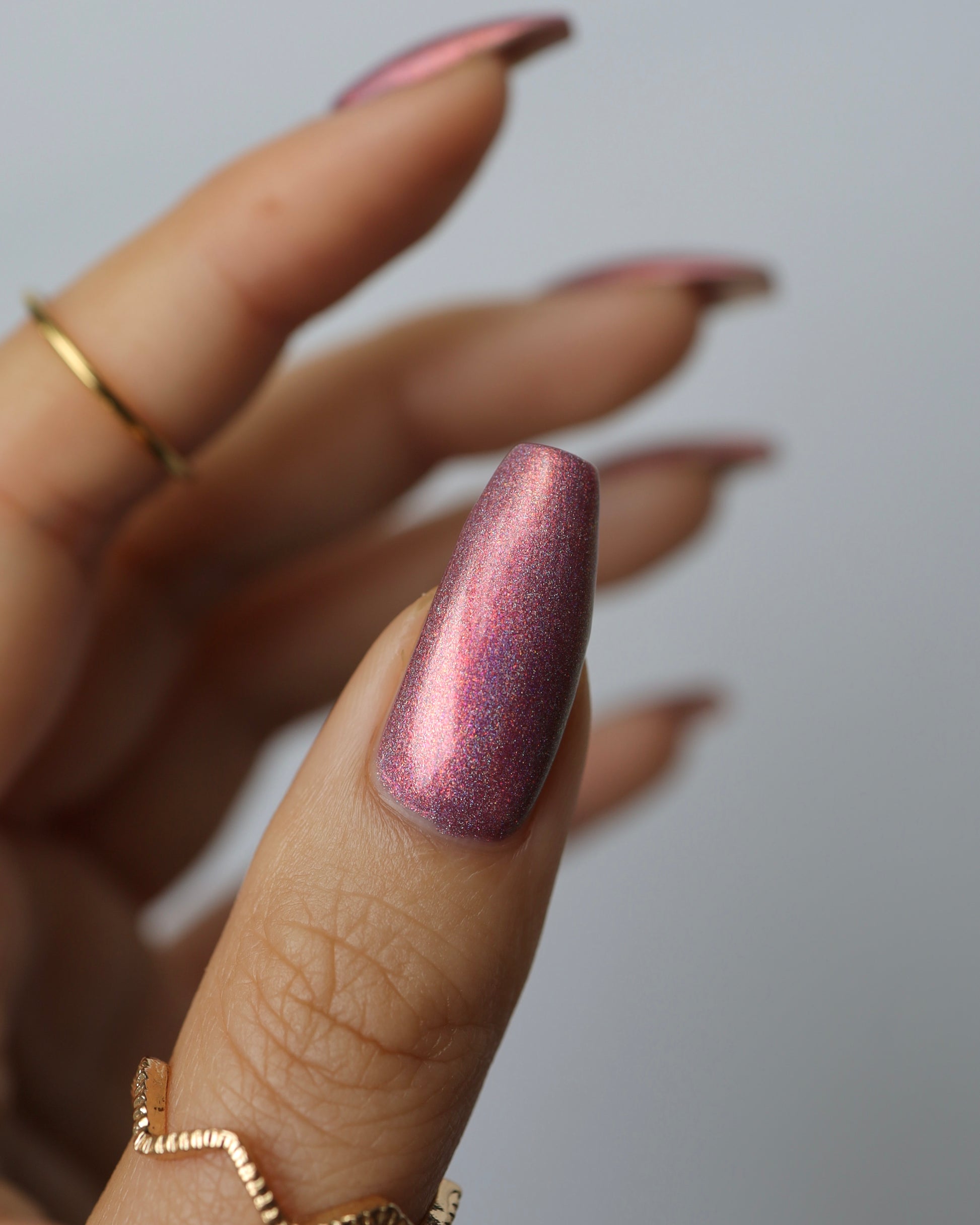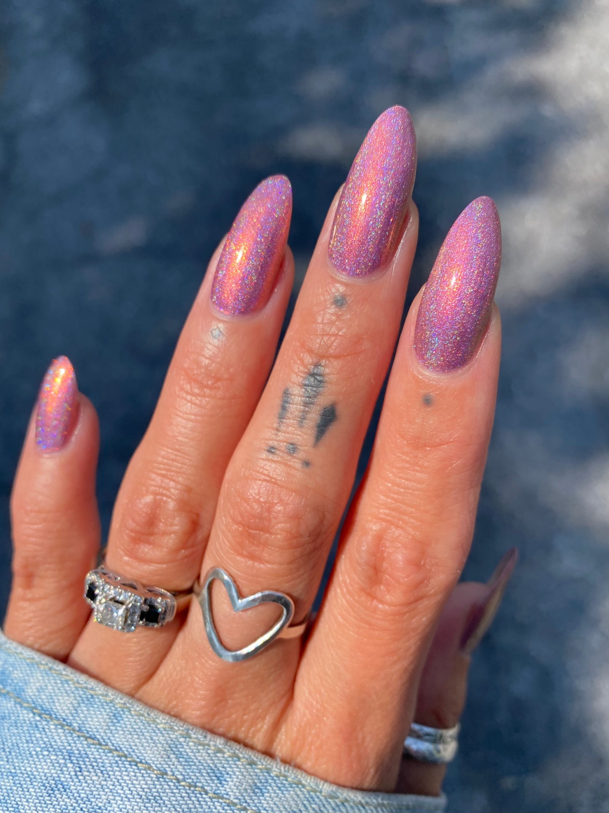 A pink base with holographic pigment and aurora shimmer that shifts from orange to gold