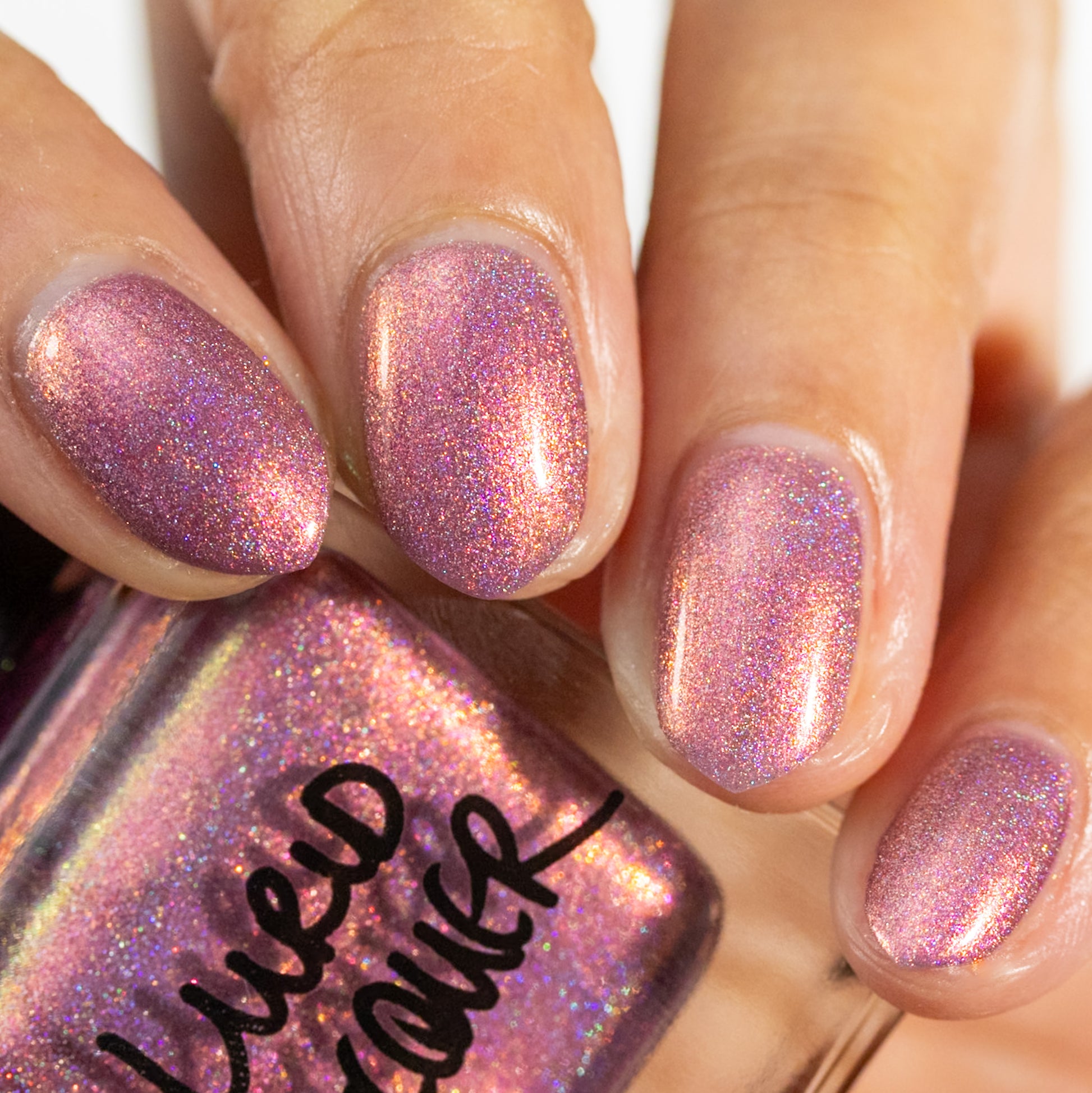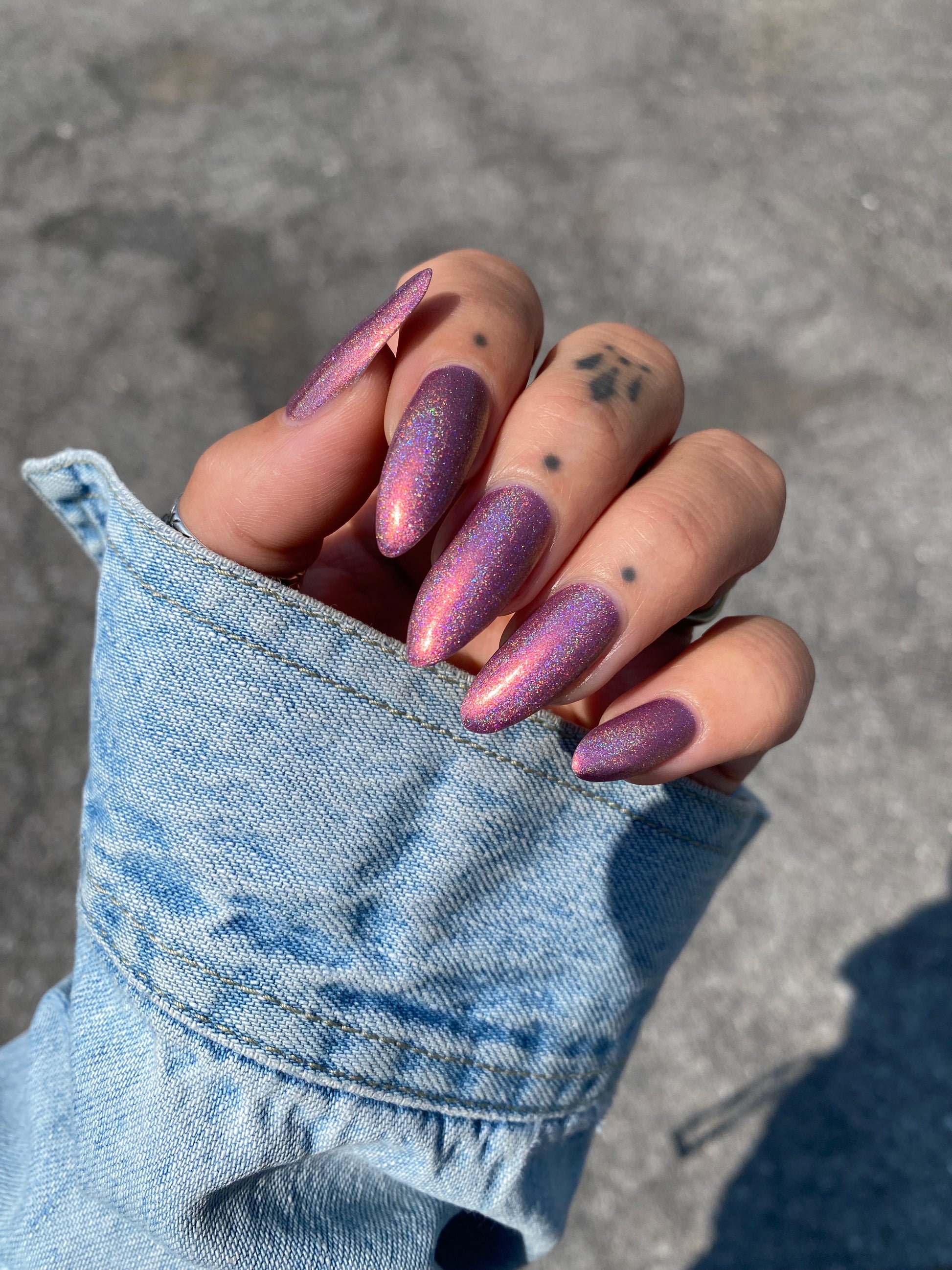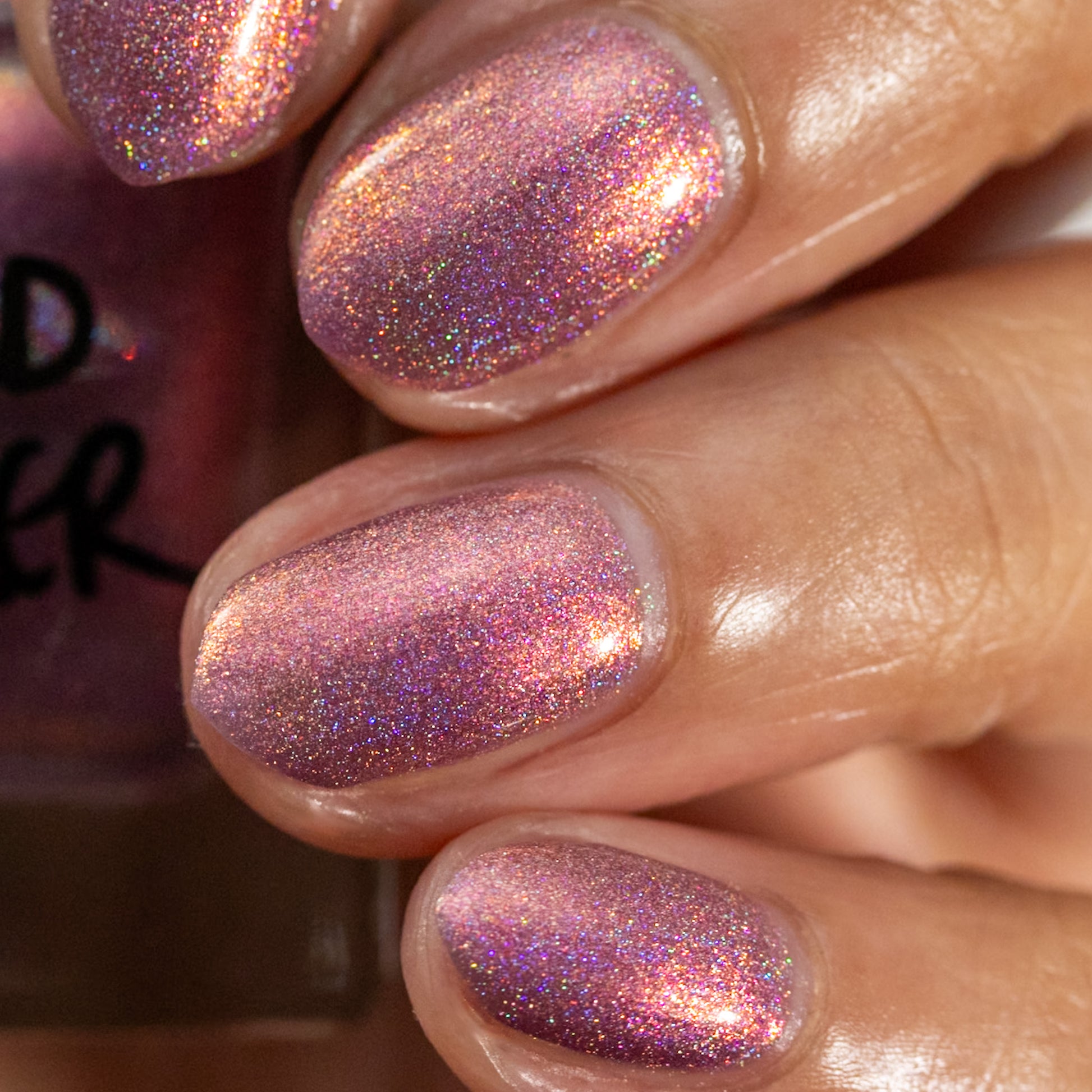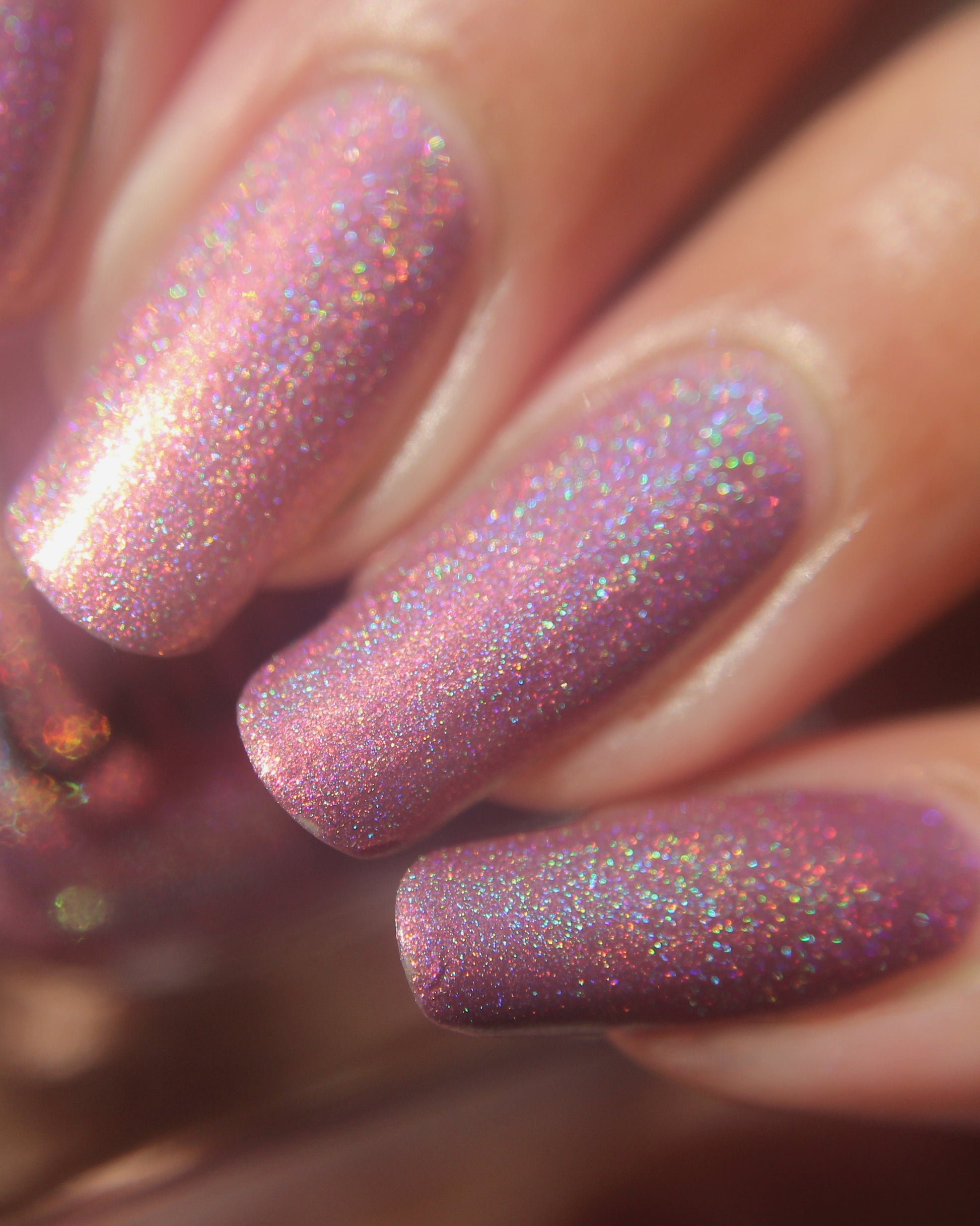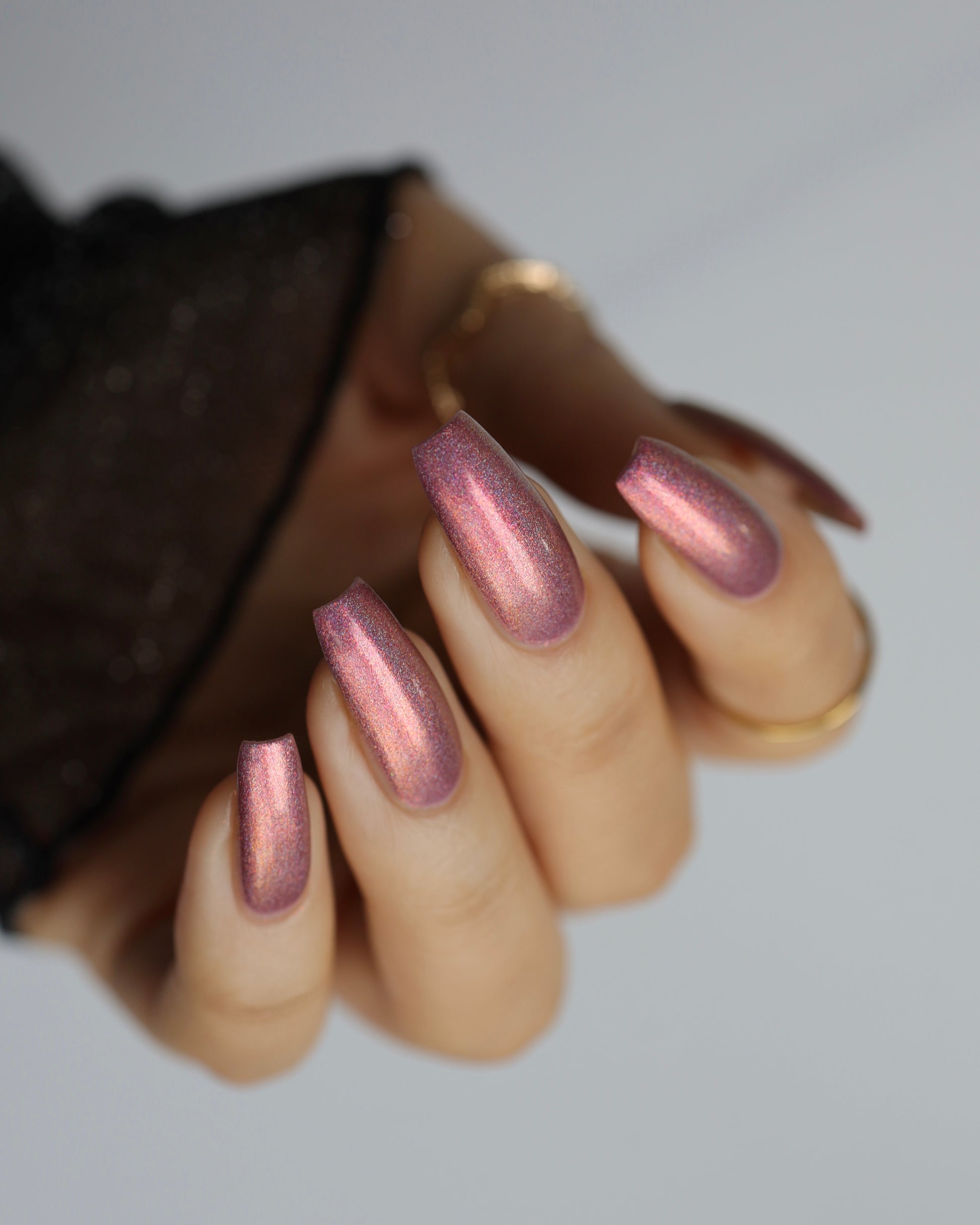 A pink base with holographic pigment and aurora shimmer that shifts from orange to gold
