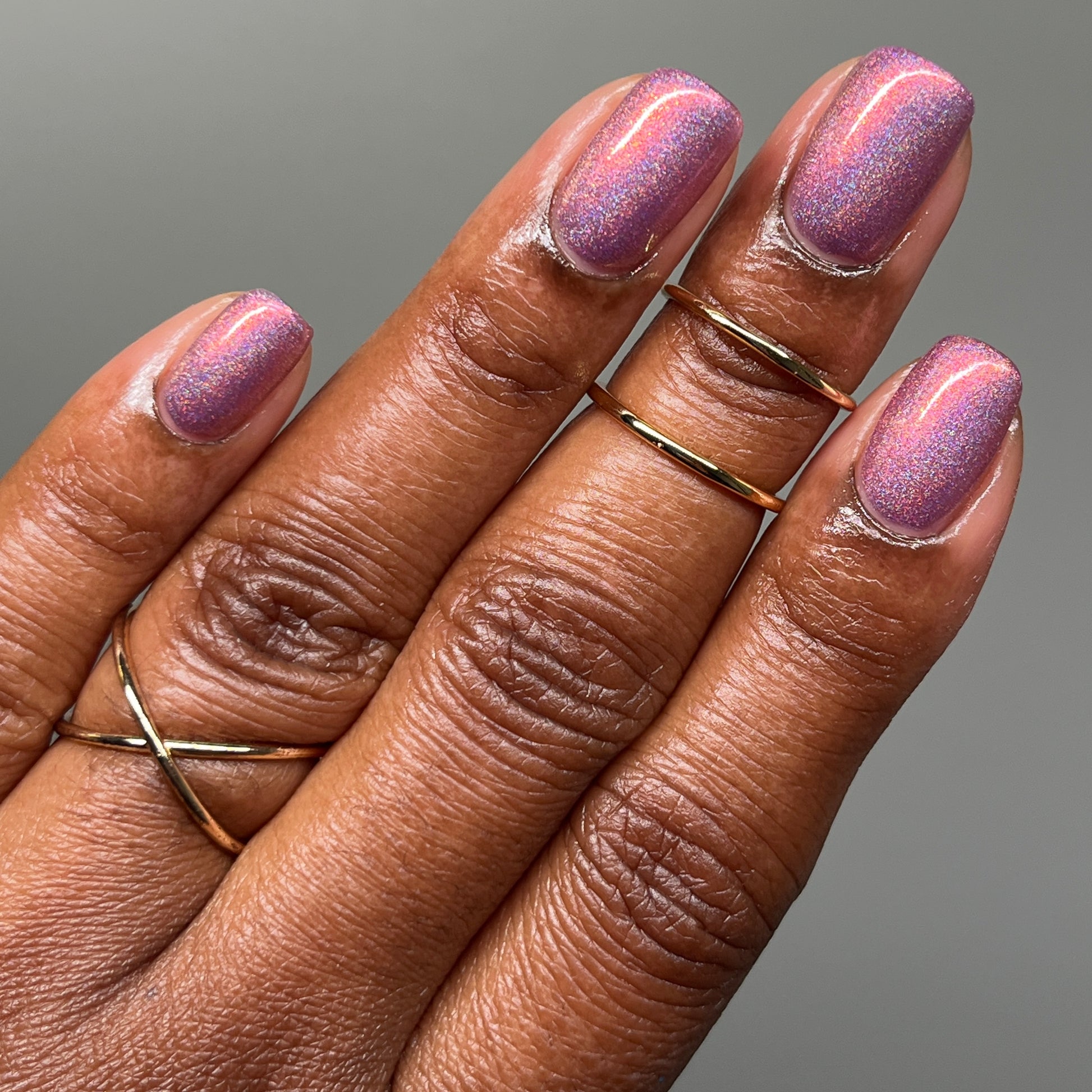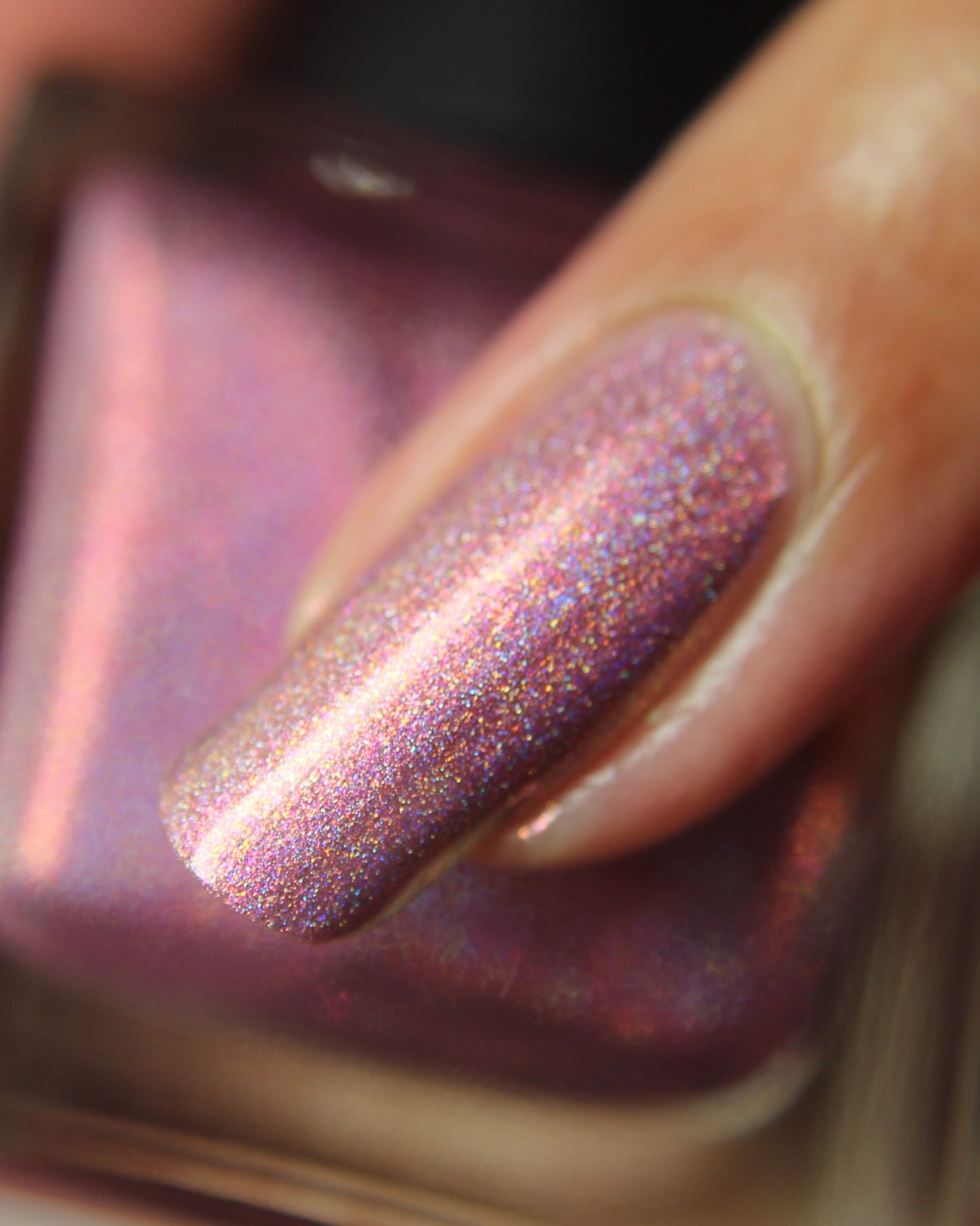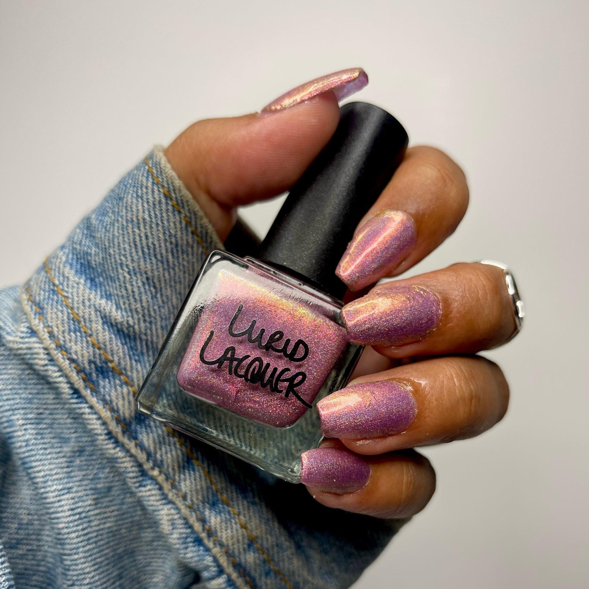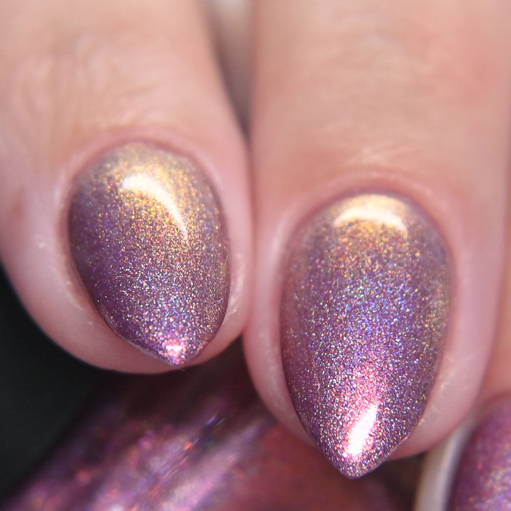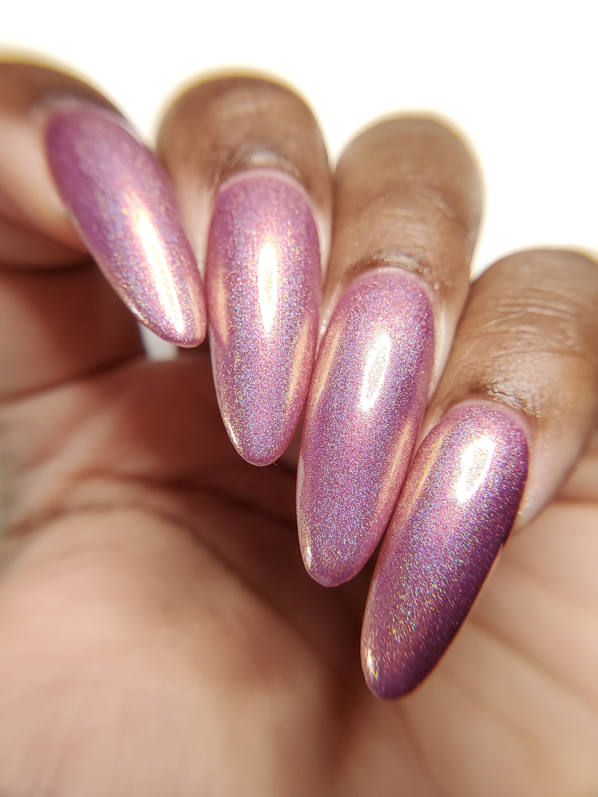 A pink base with holographic pigment and aurora shimmer that shifts from orange to gold