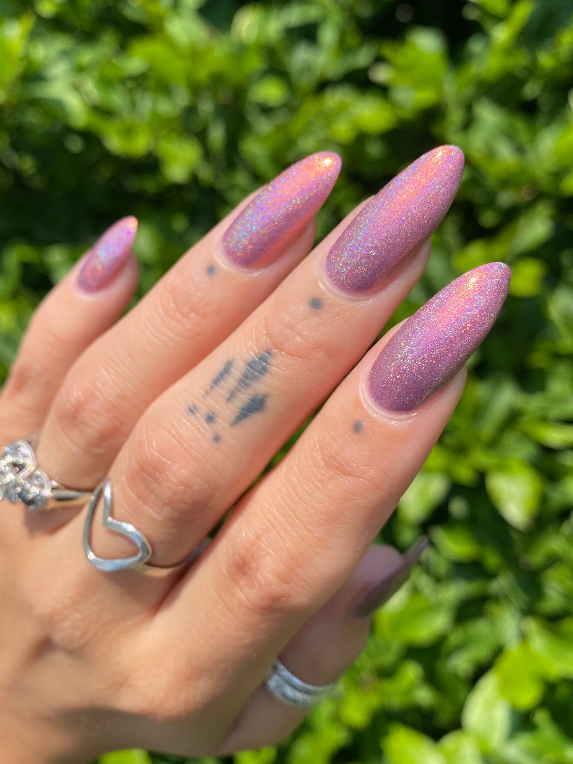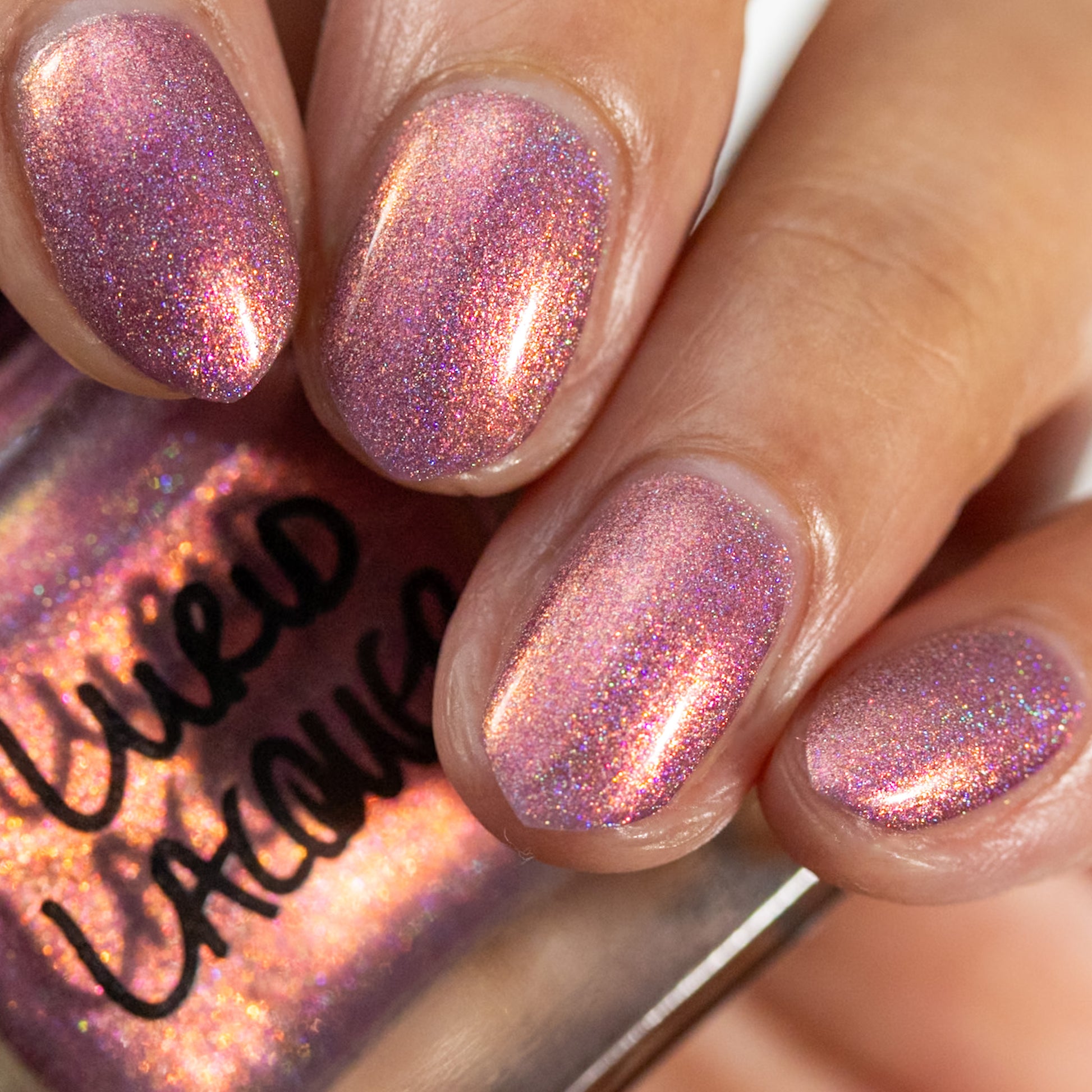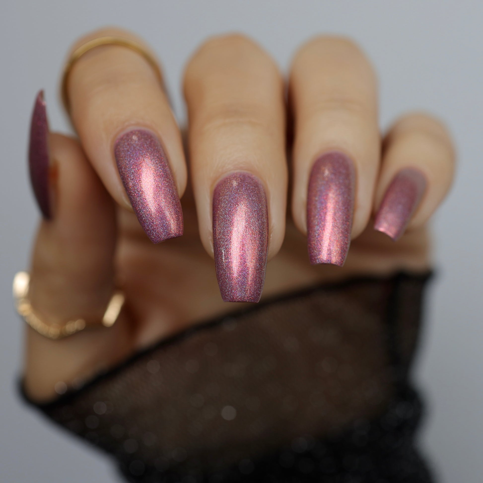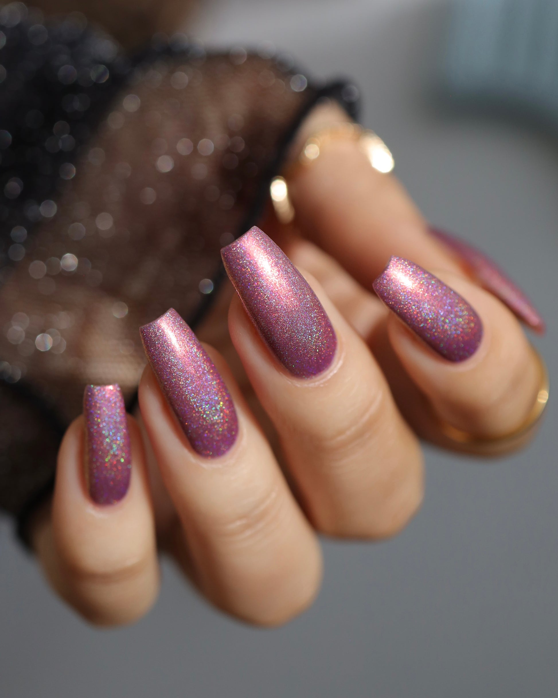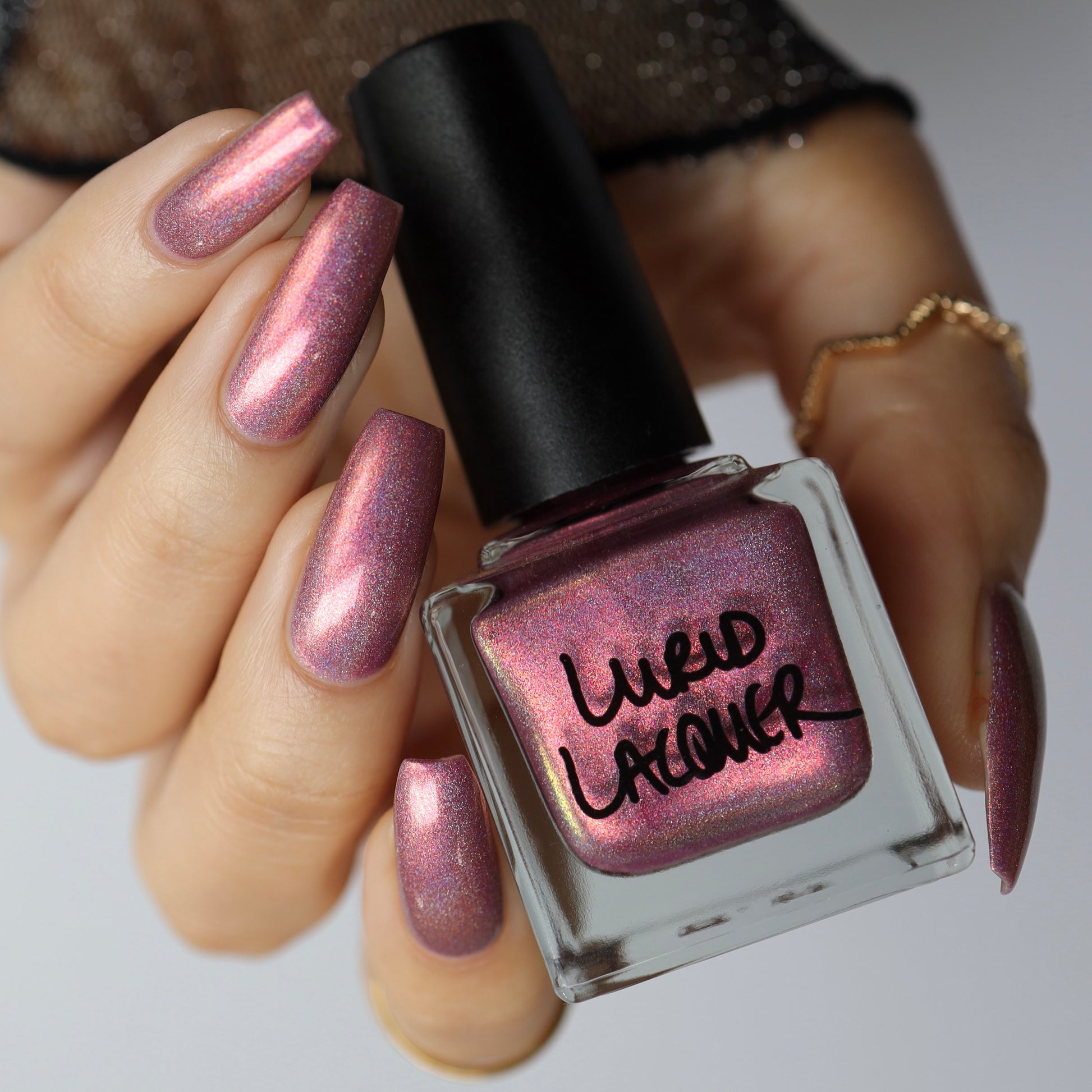 A pink base with holographic pigment and aurora shimmer that shifts from orange to gold