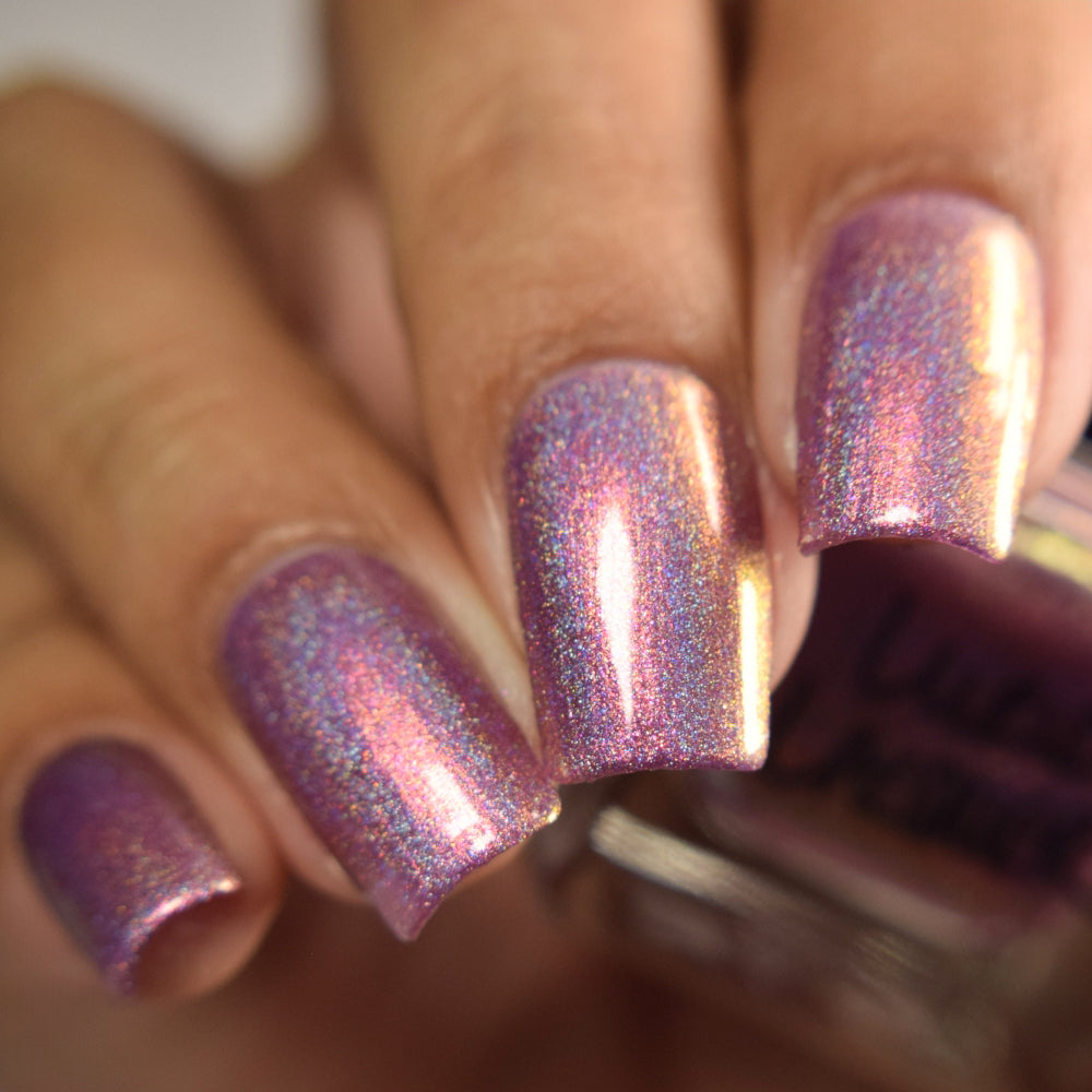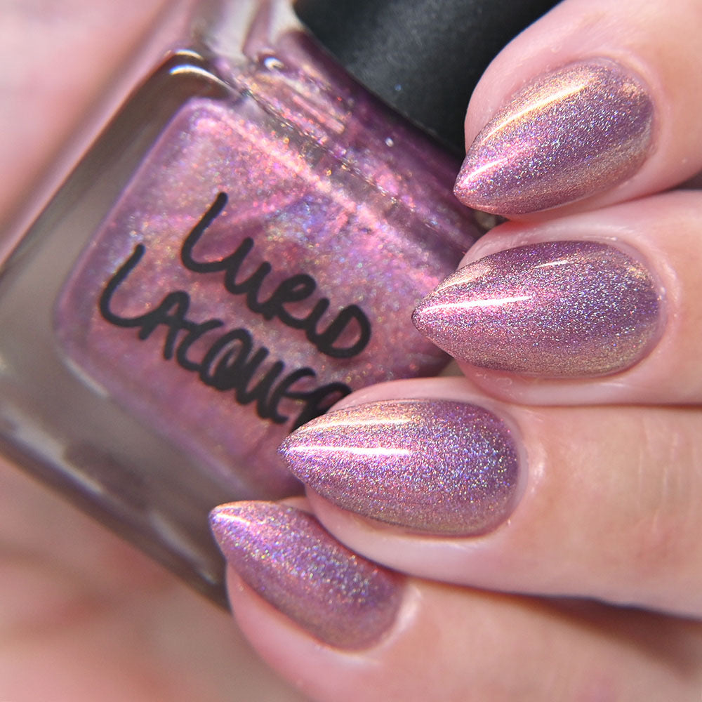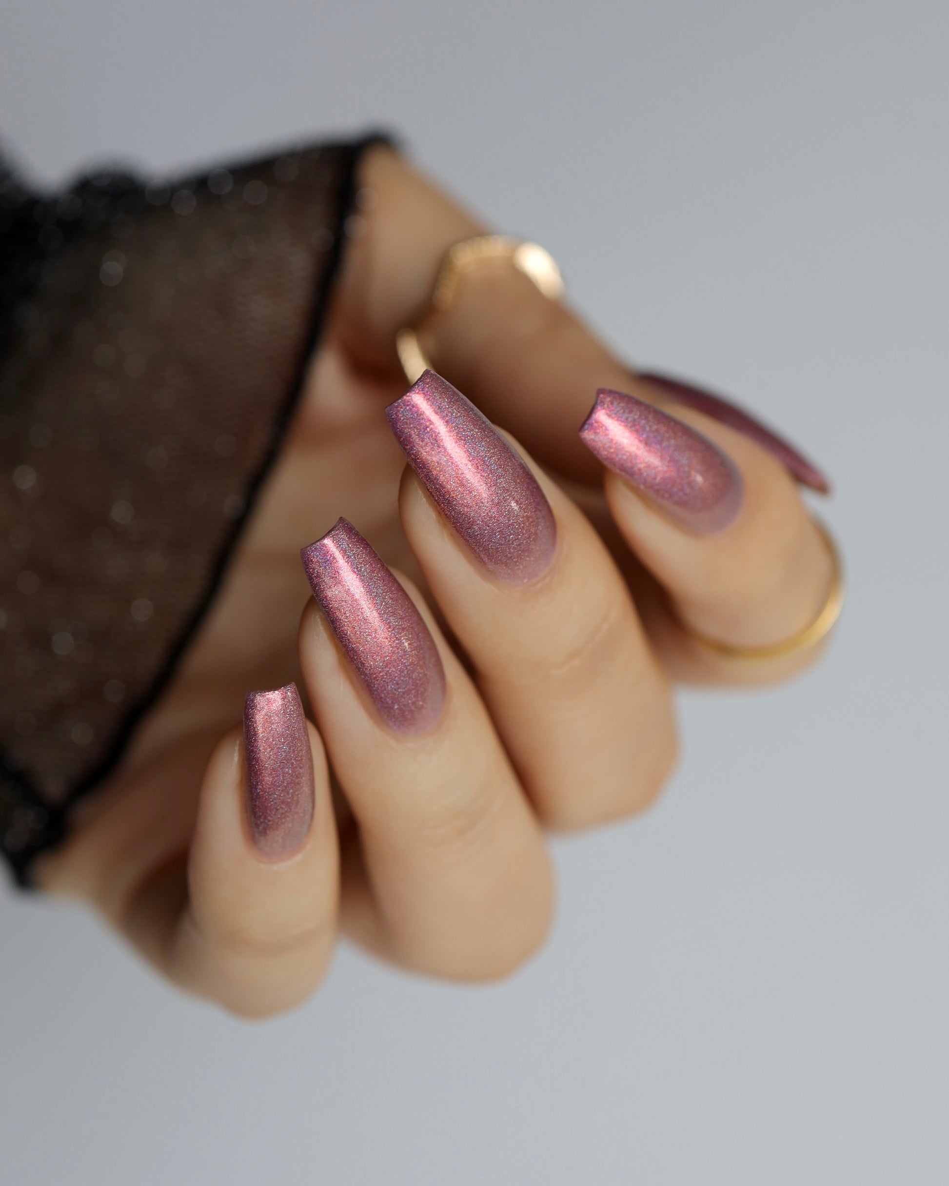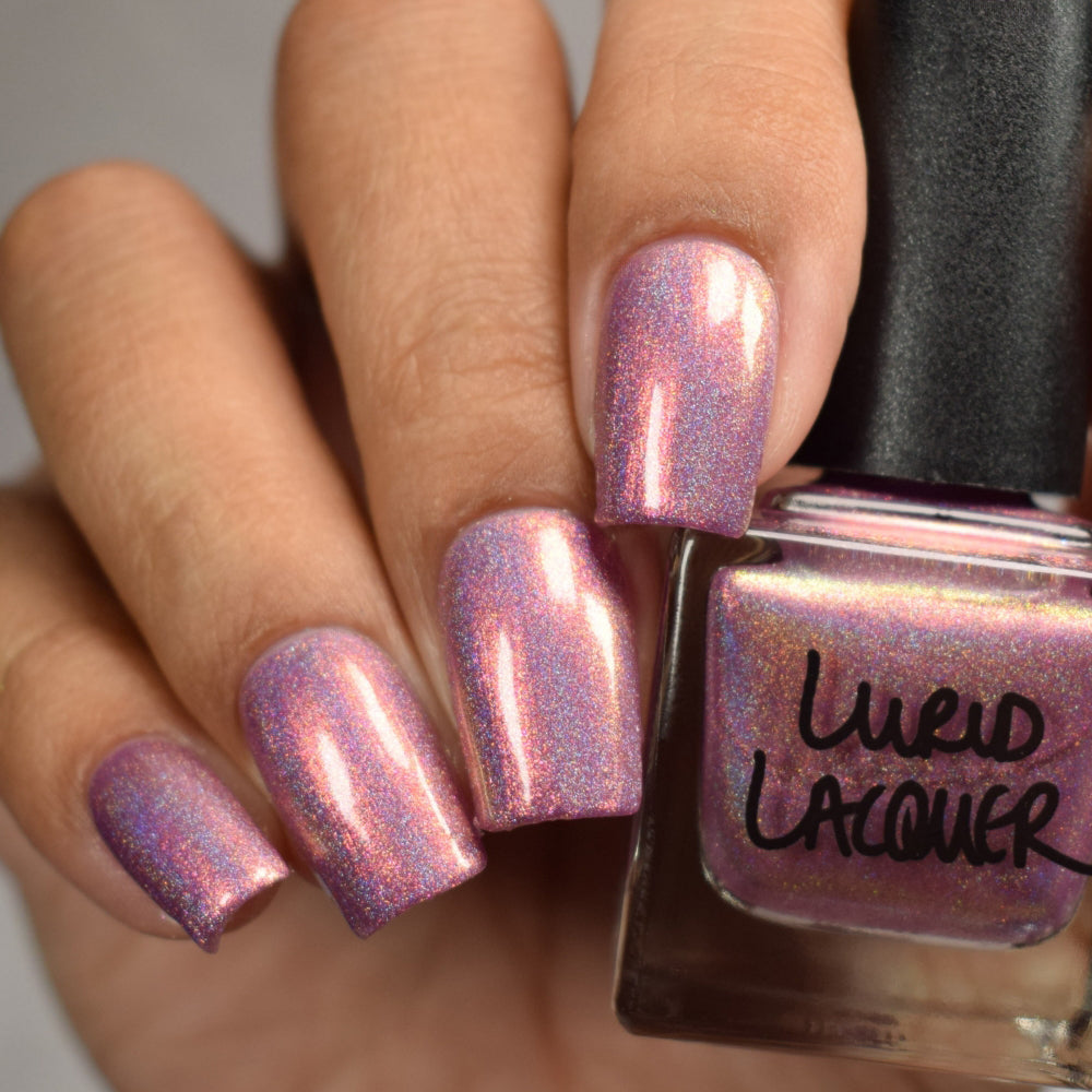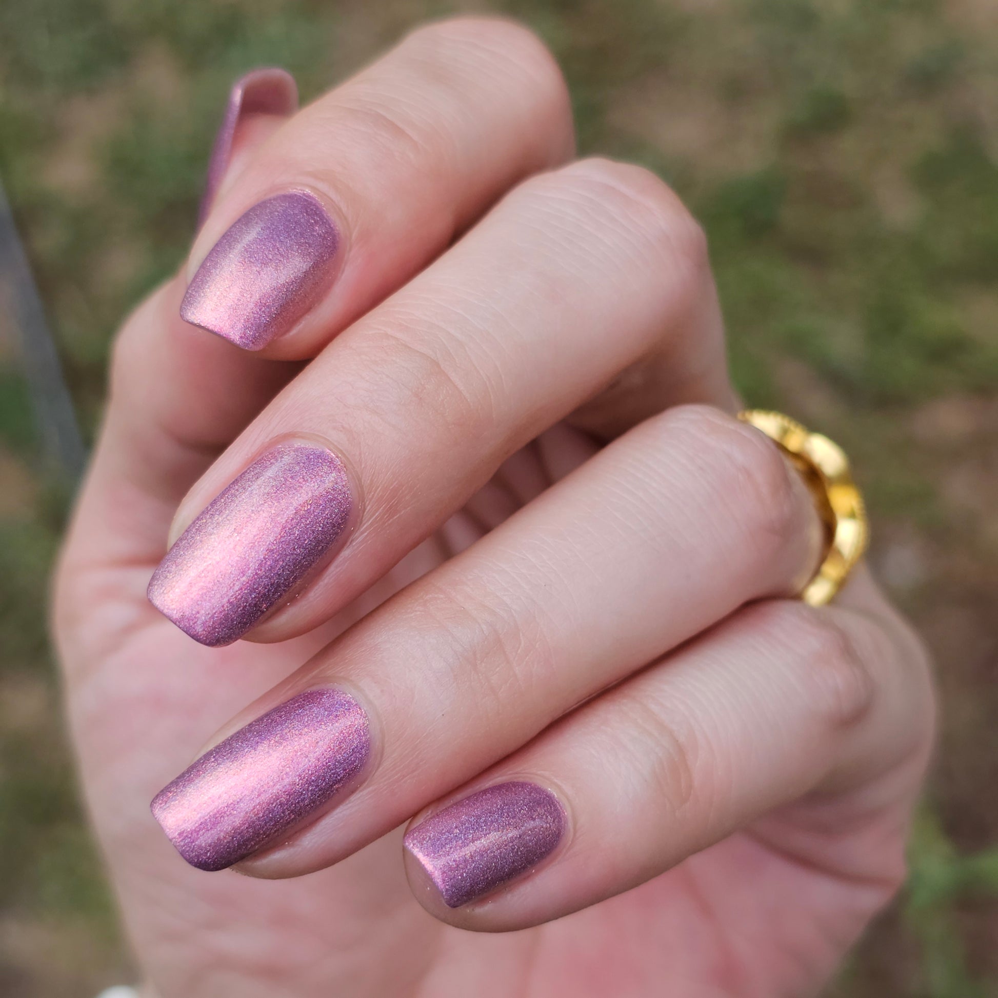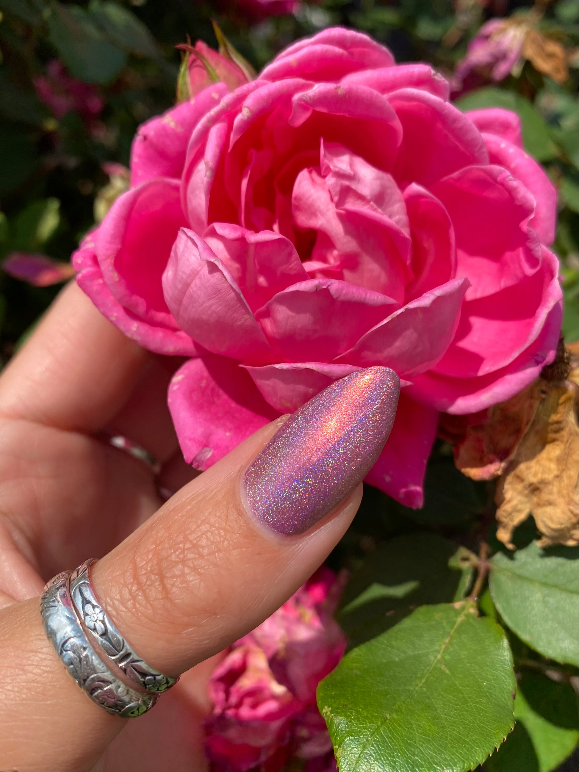A pink base with holographic pigment and aurora shimmer that shifts from orange to gold