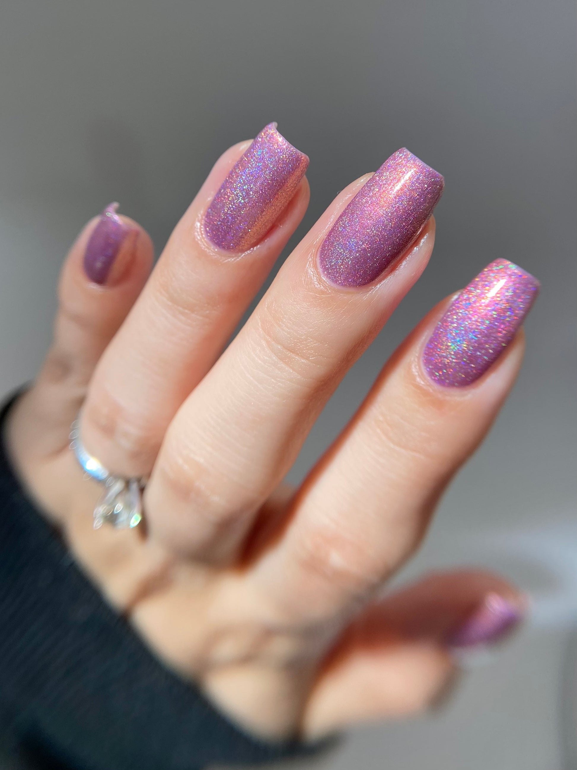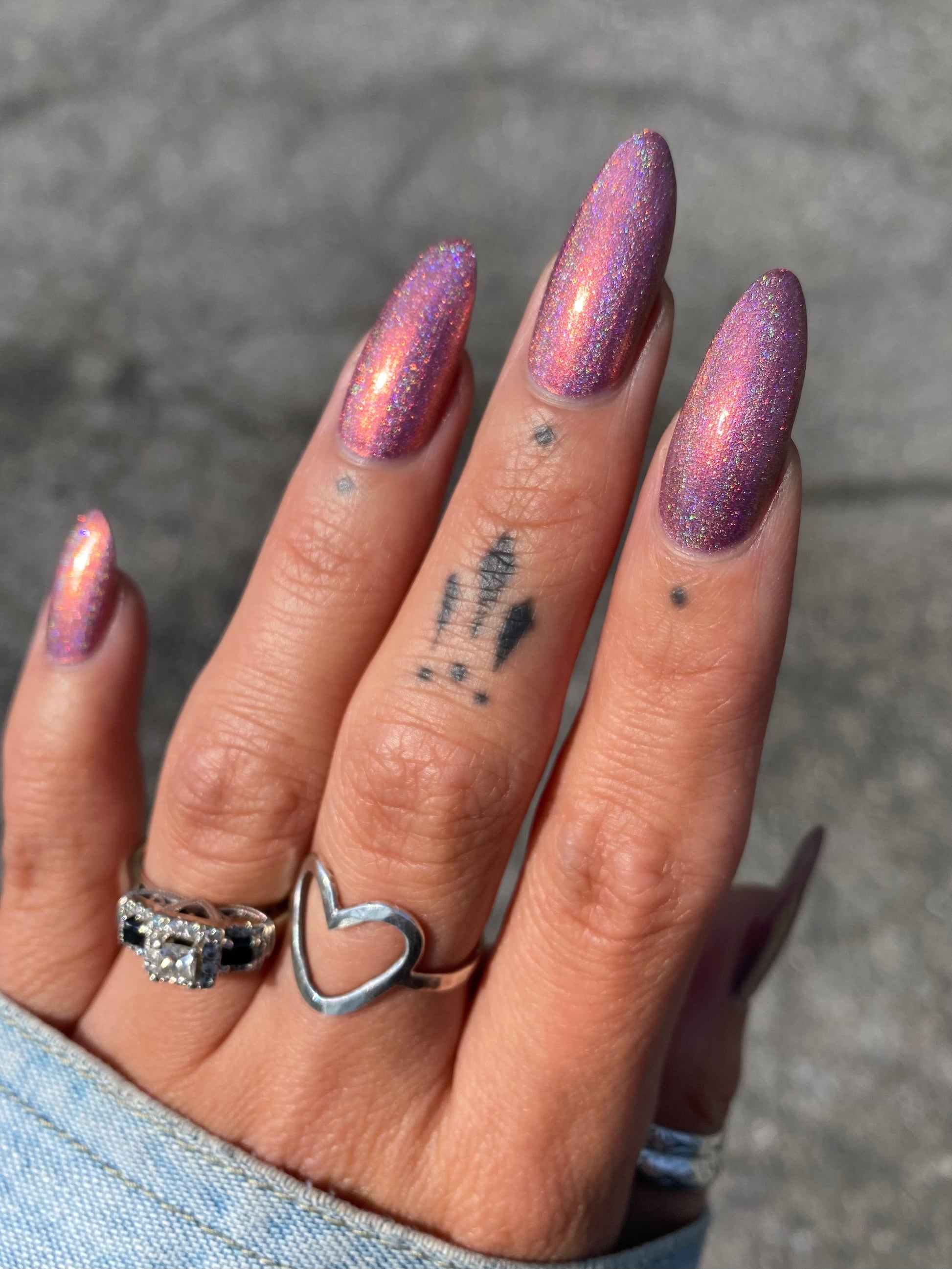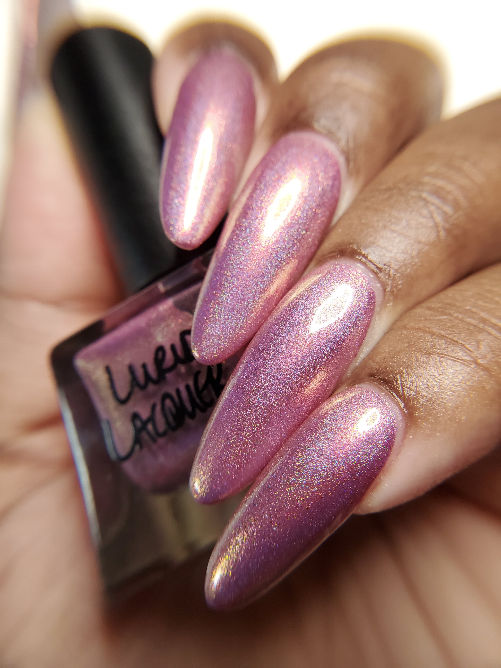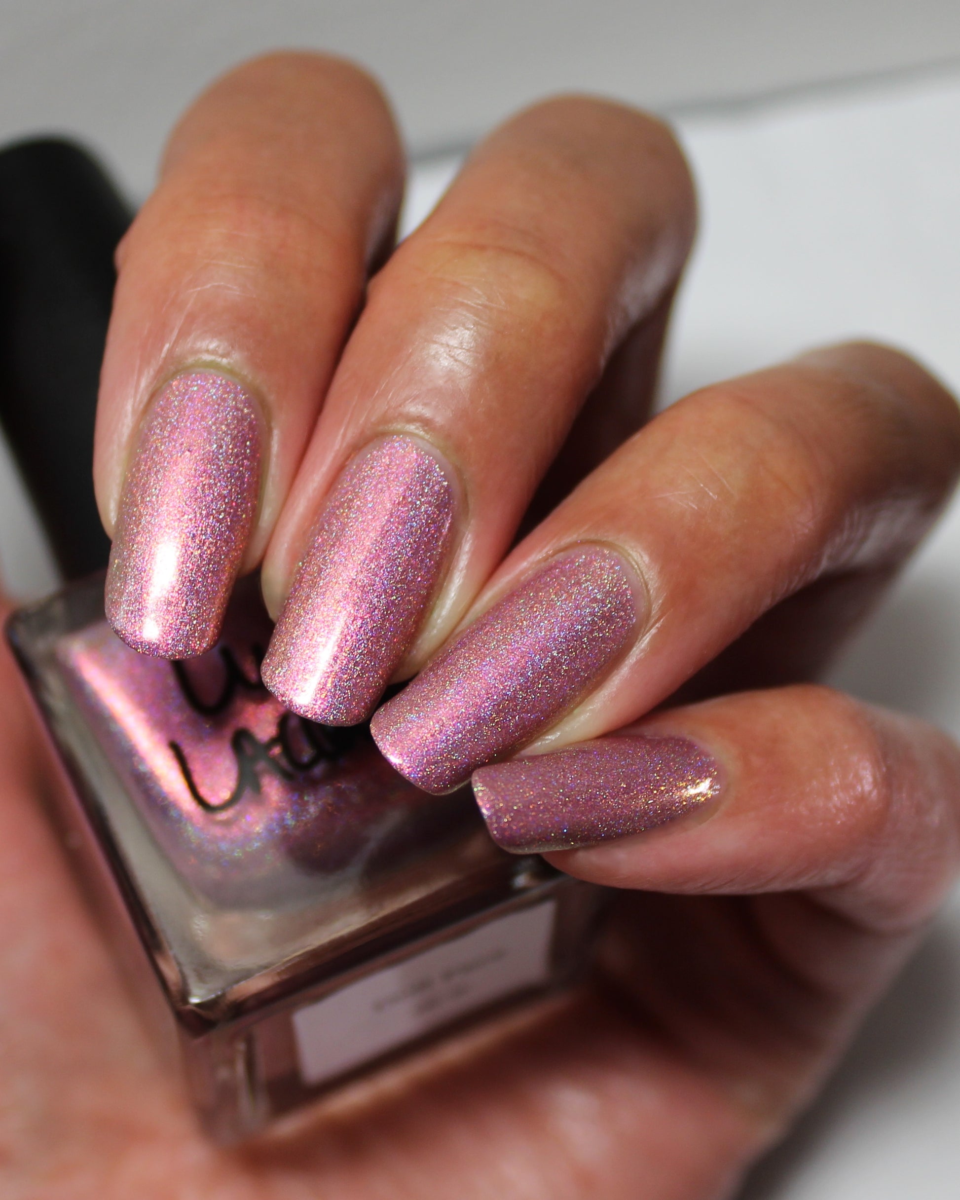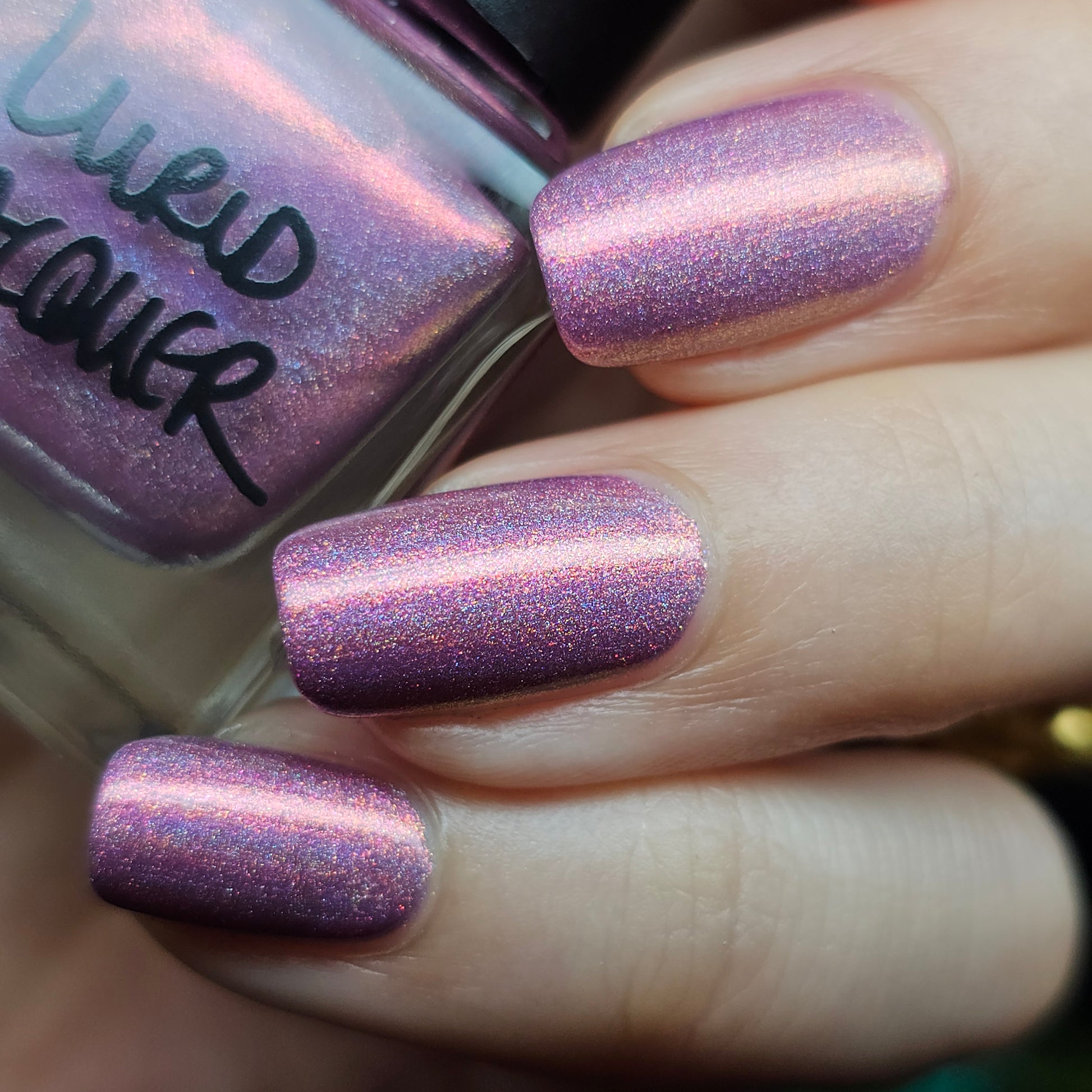 A pink base with holographic pigment and aurora shimmer that shifts from orange to gold