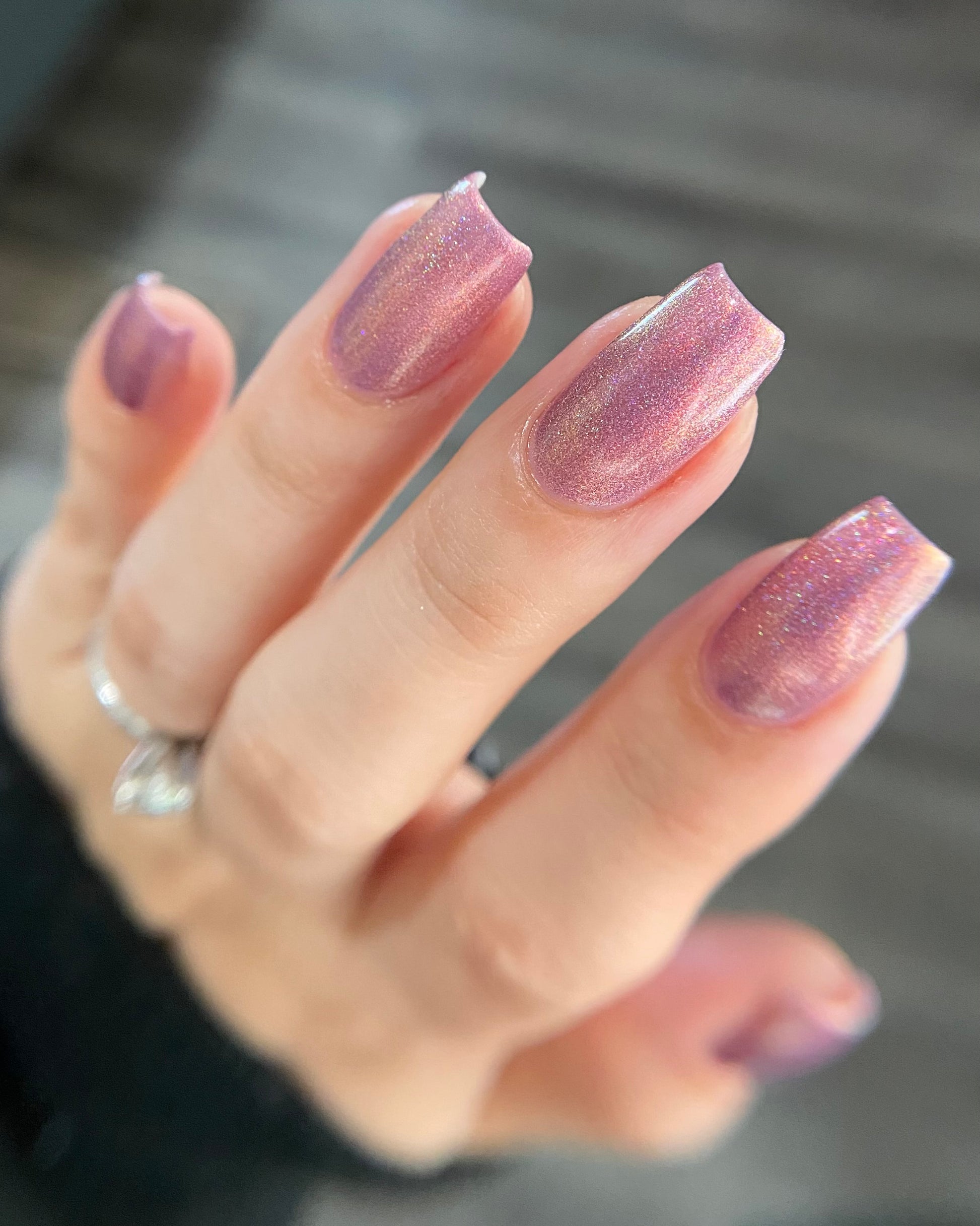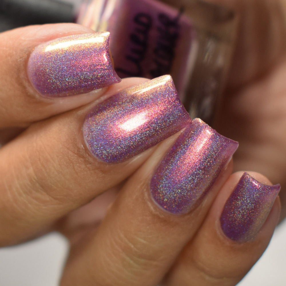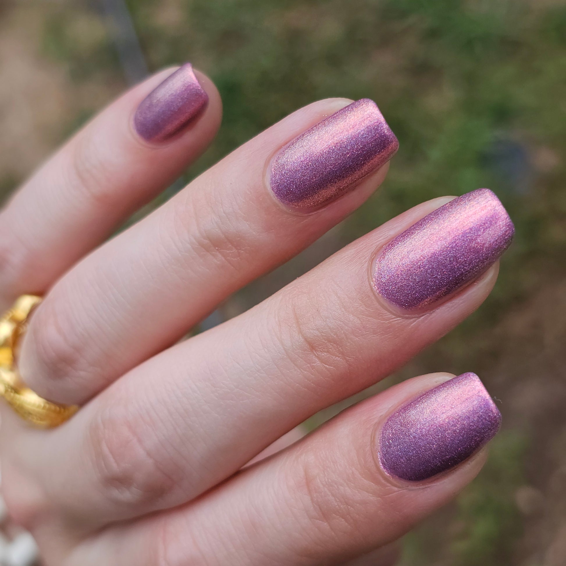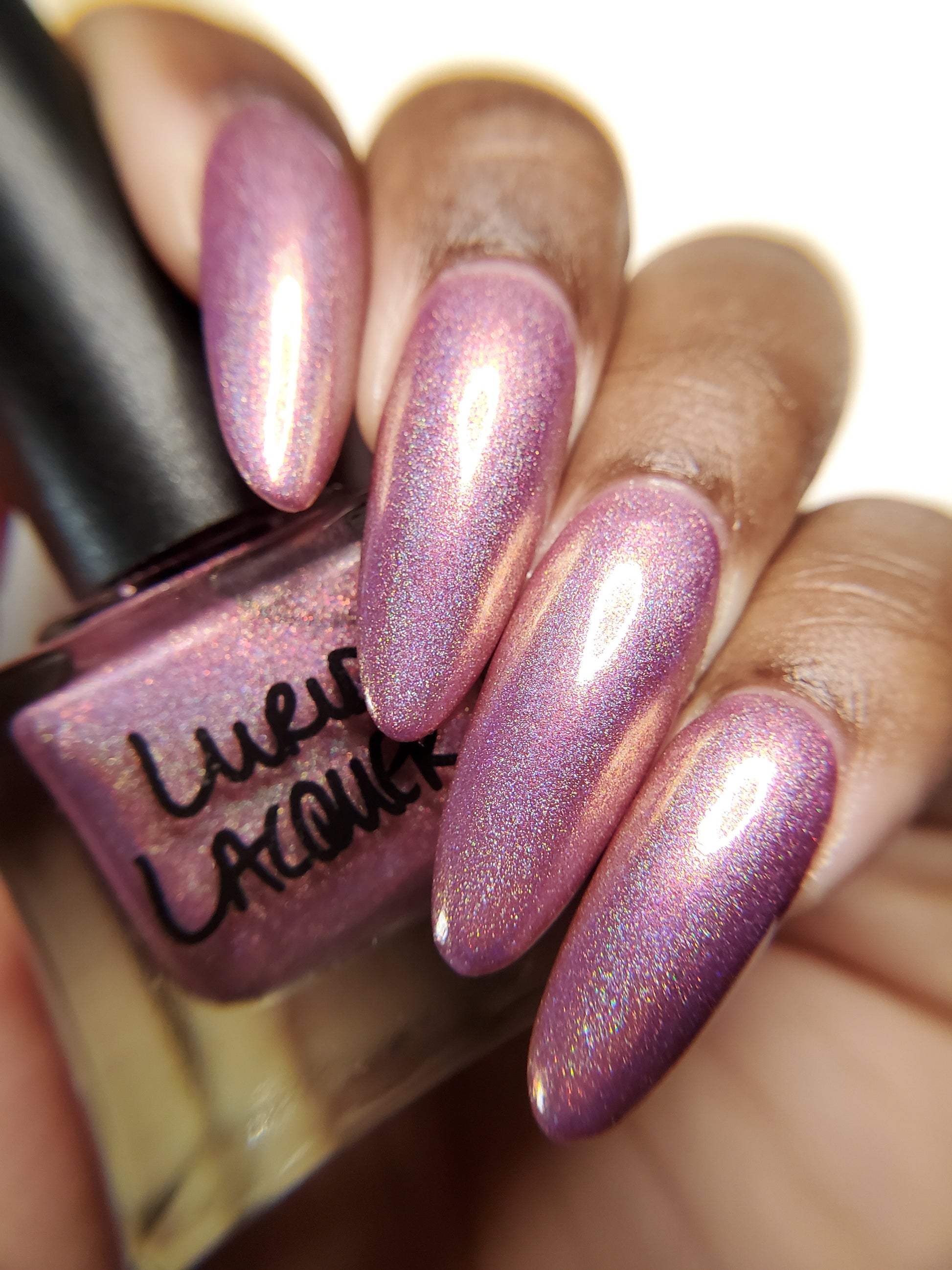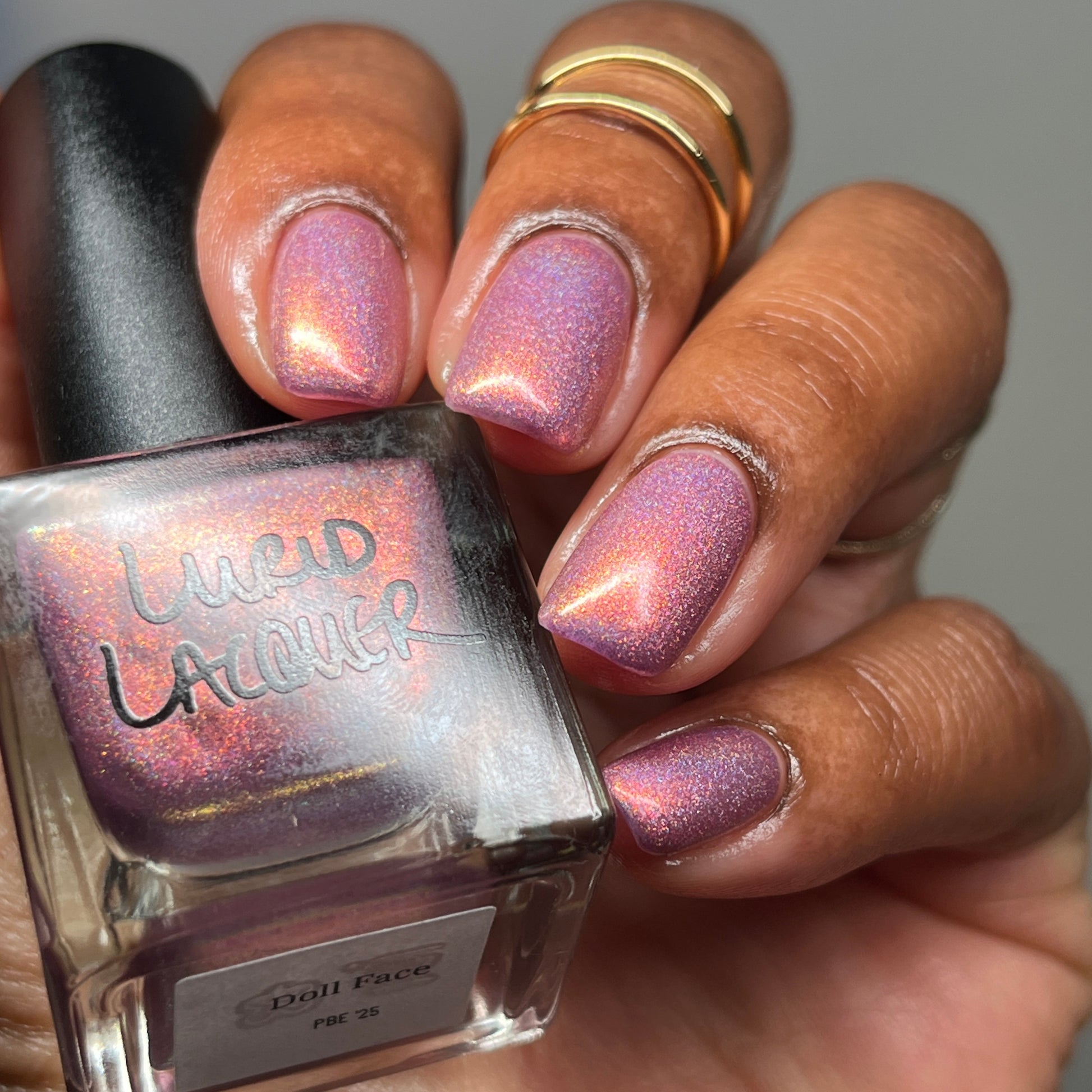 A pink base with holographic pigment and aurora shimmer that shifts from orange to gold