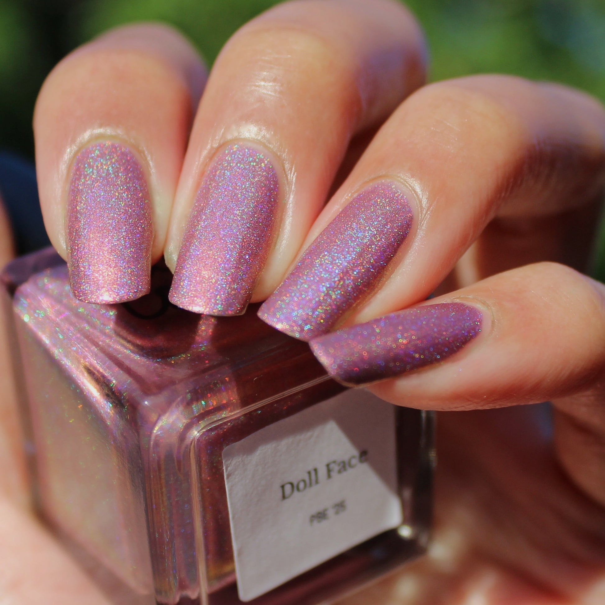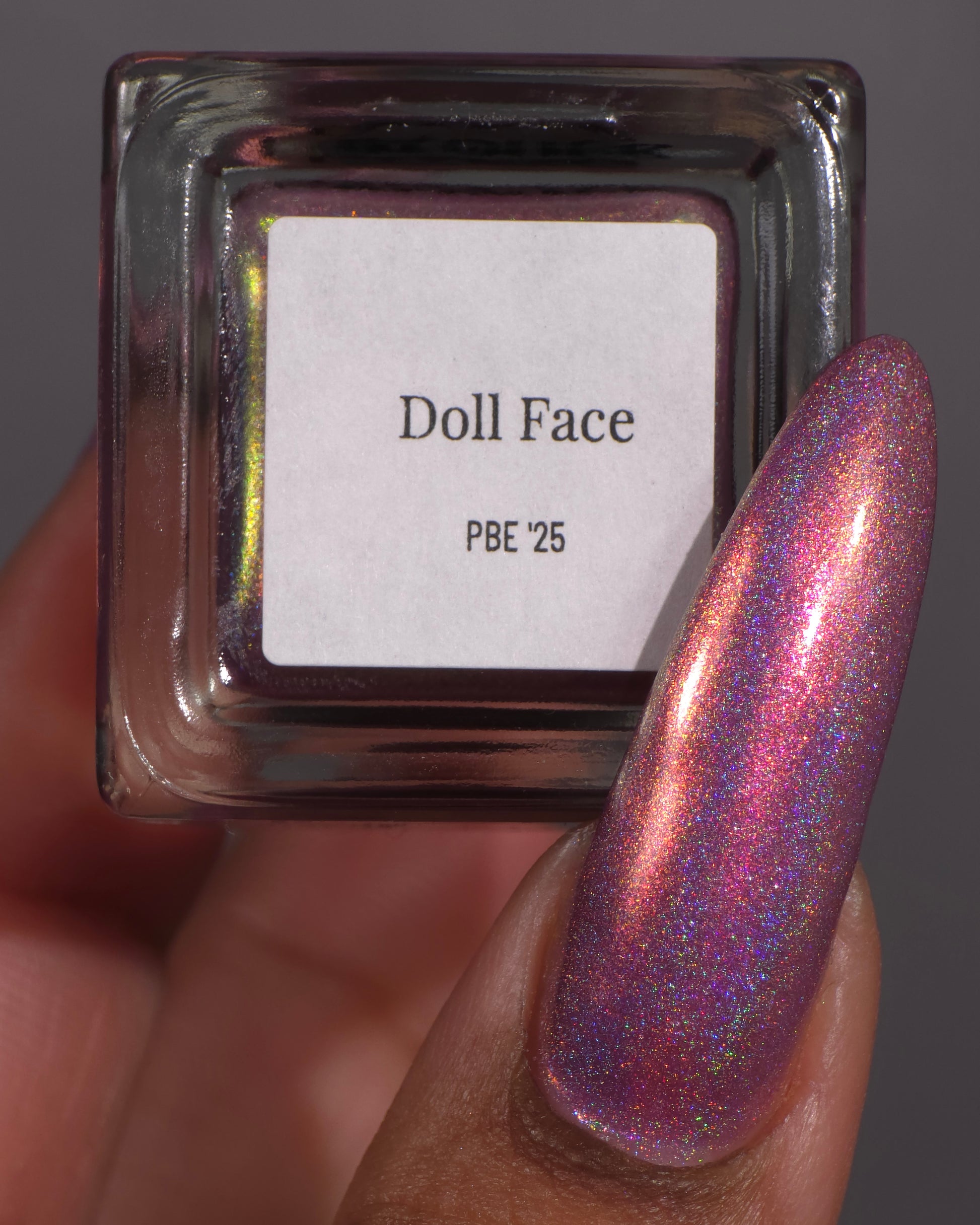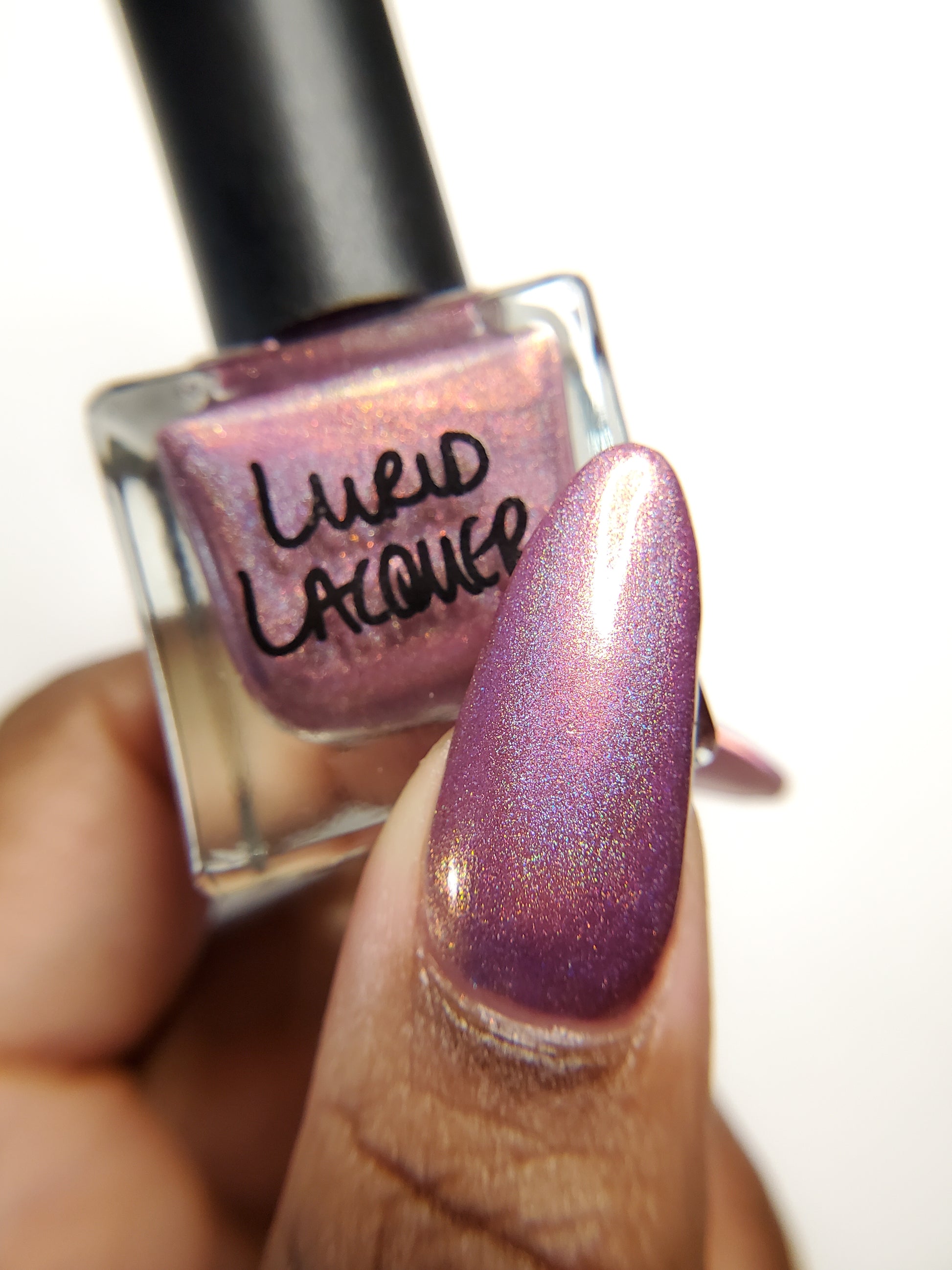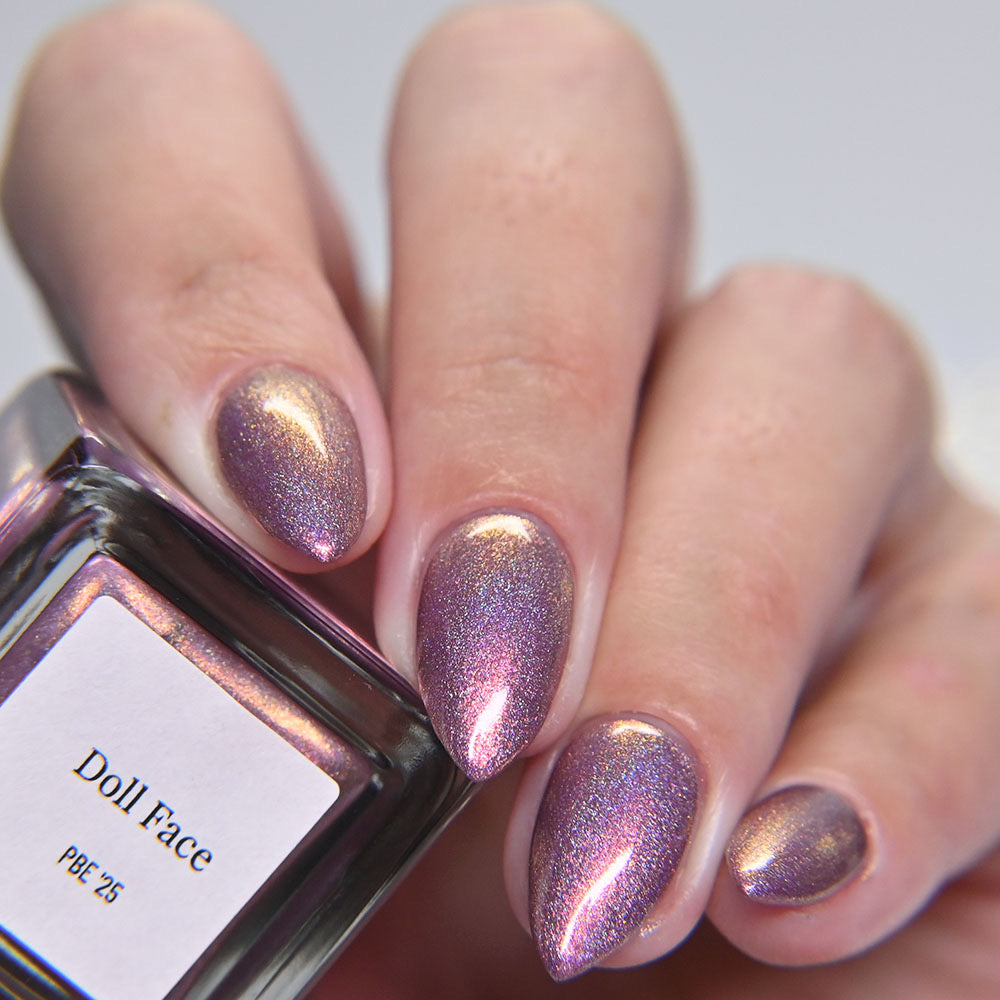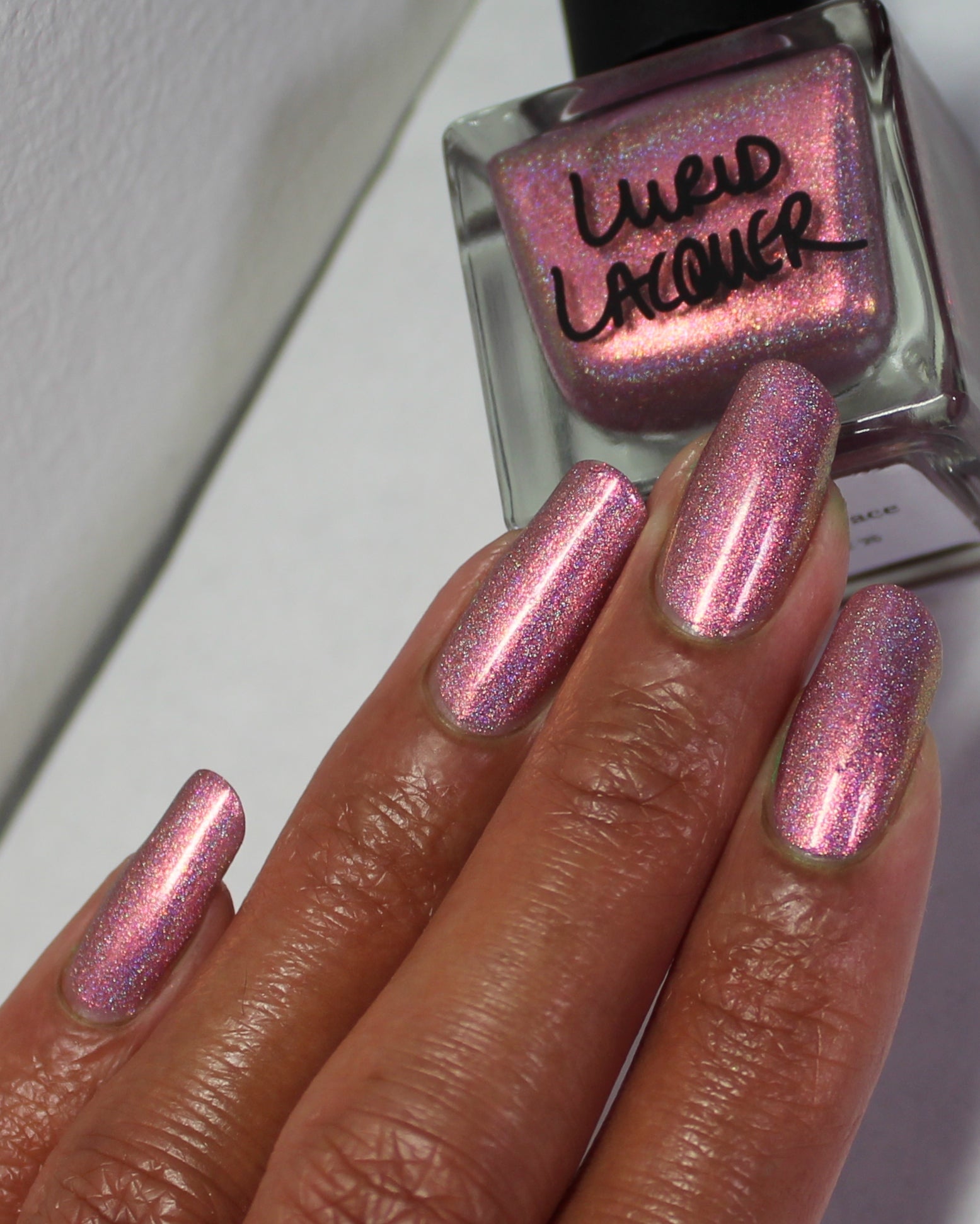 A pink base with holographic pigment and aurora shimmer that shifts from orange to gold