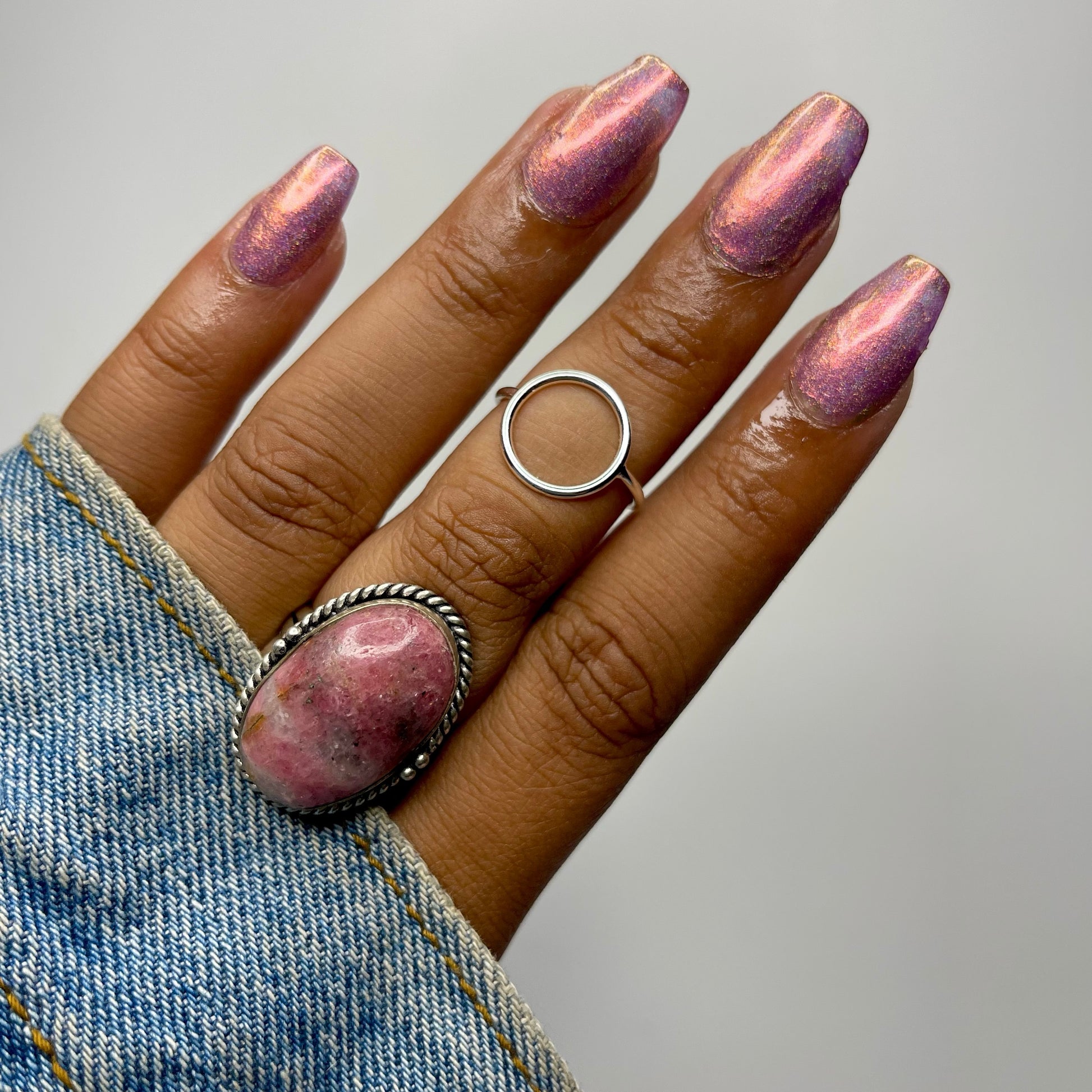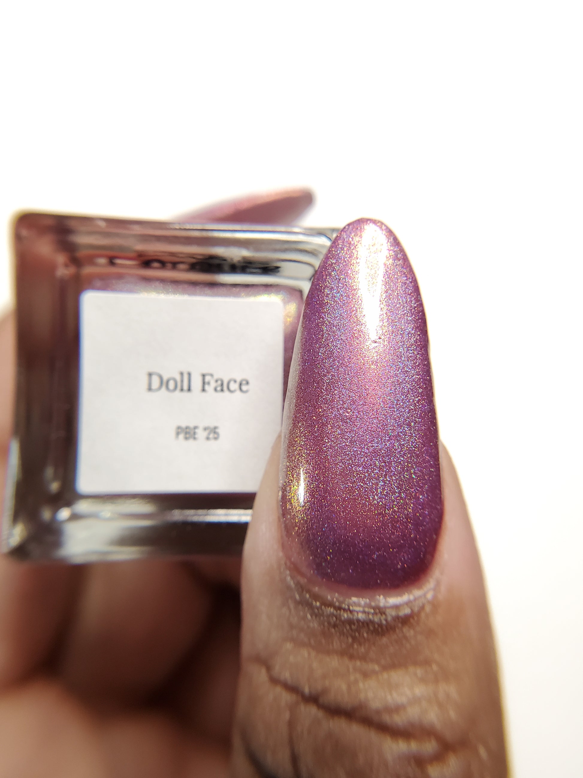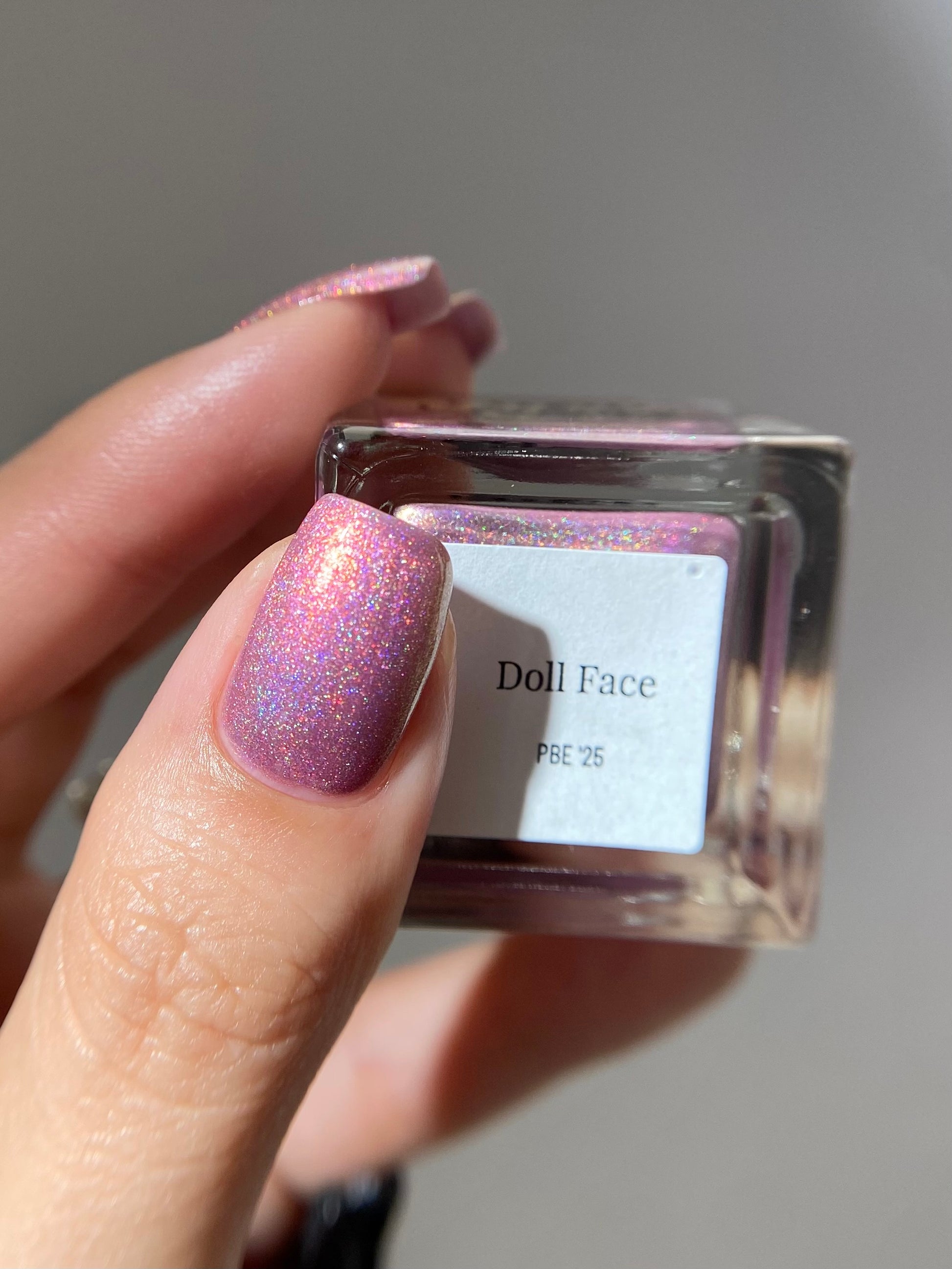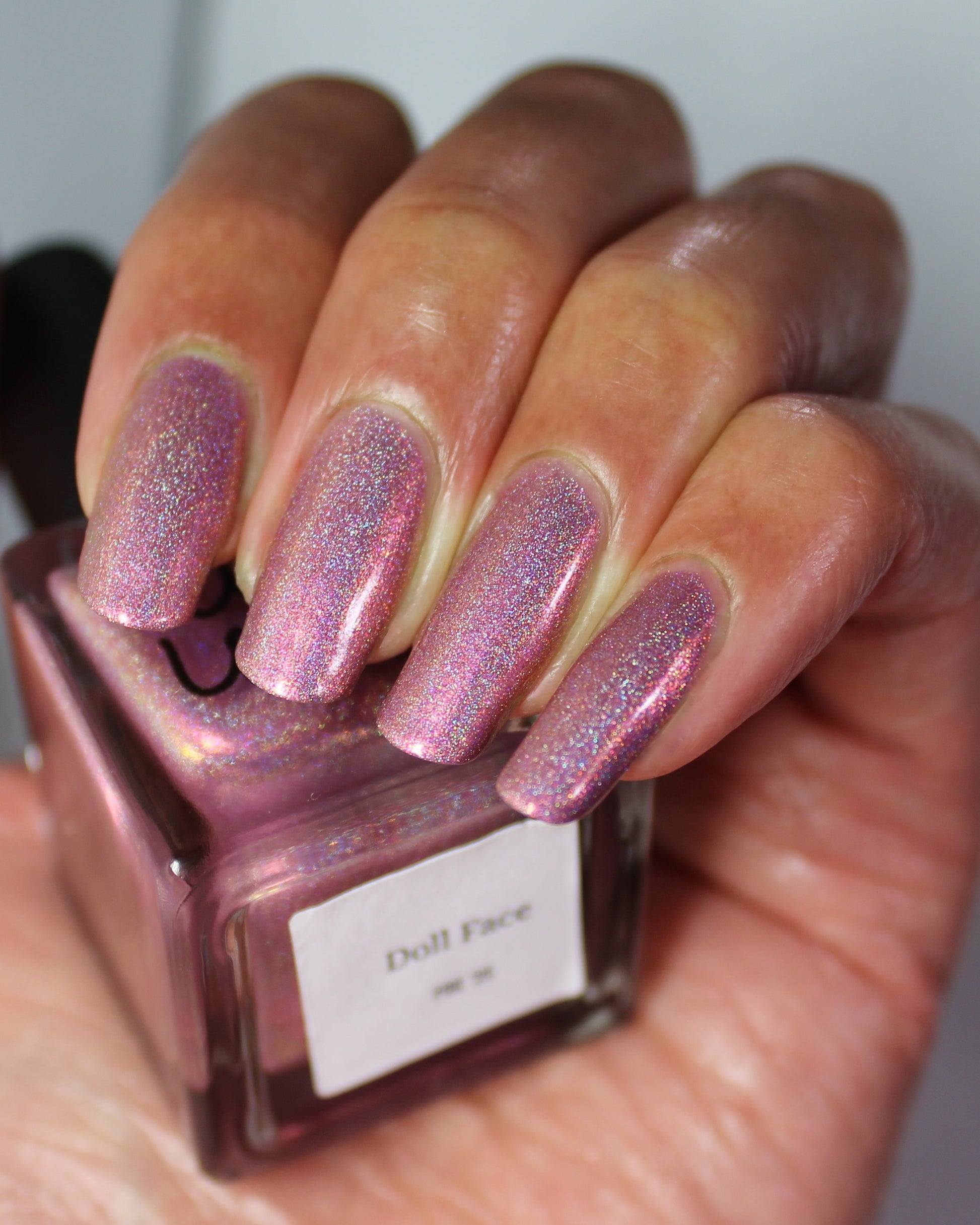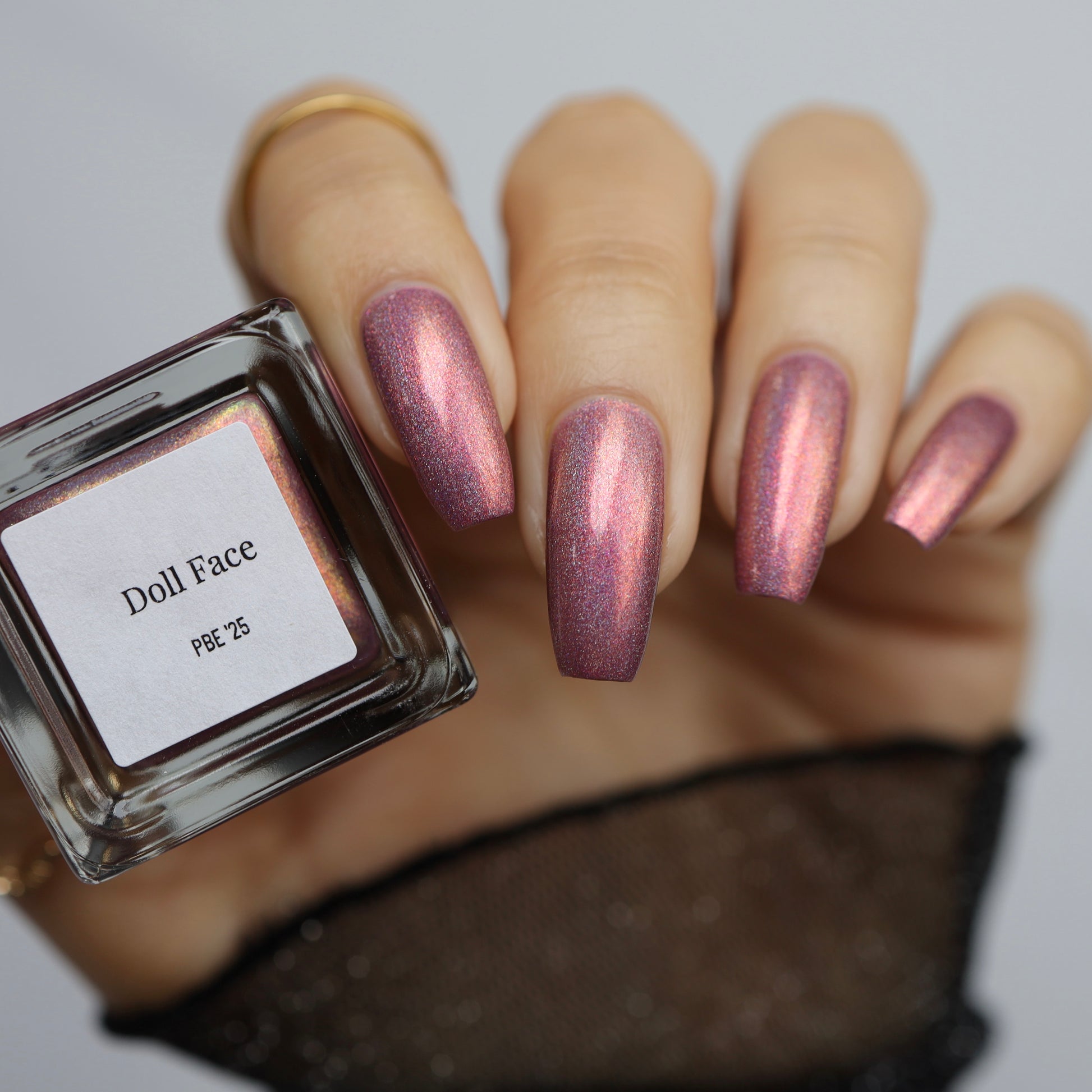 A pink base with holographic pigment and aurora shimmer that shifts from orange to gold