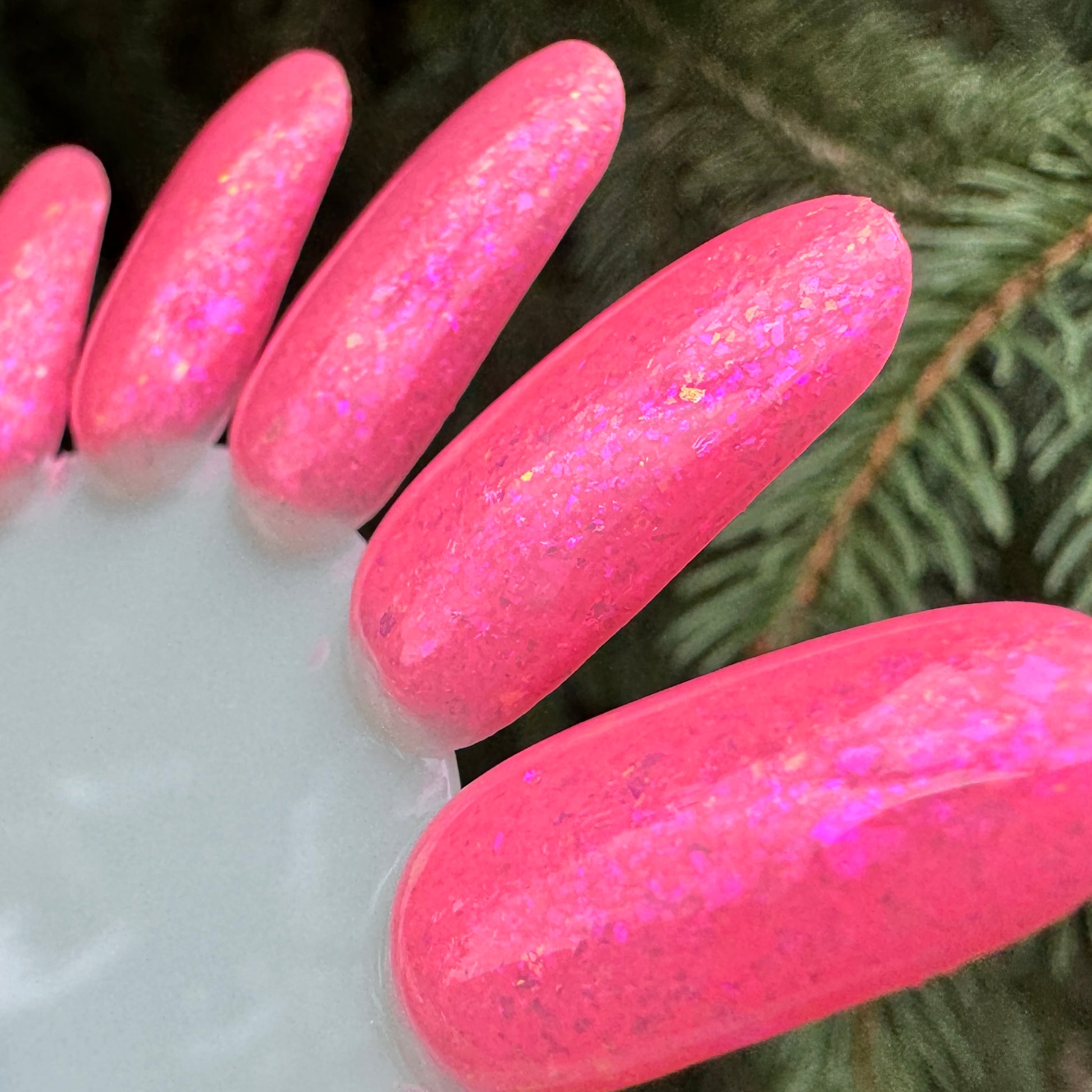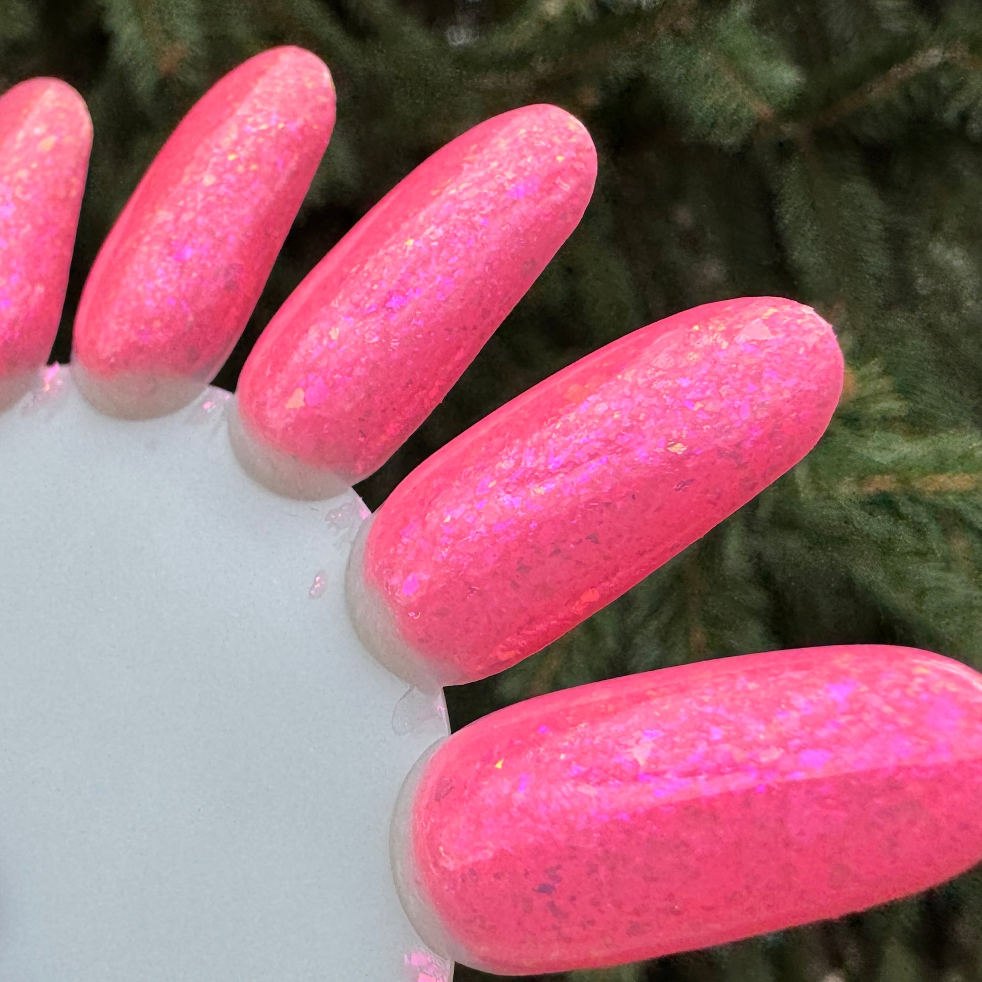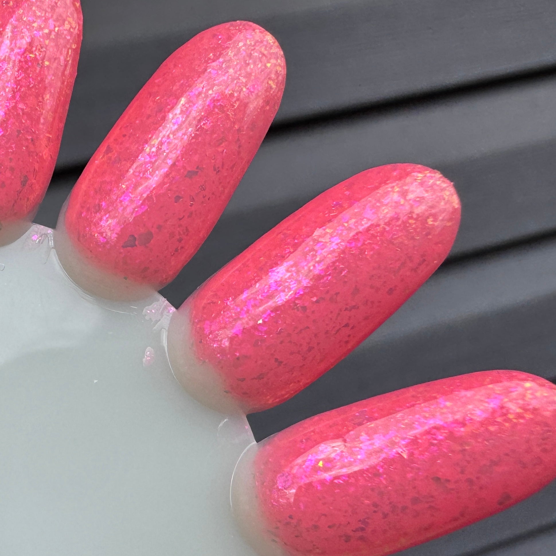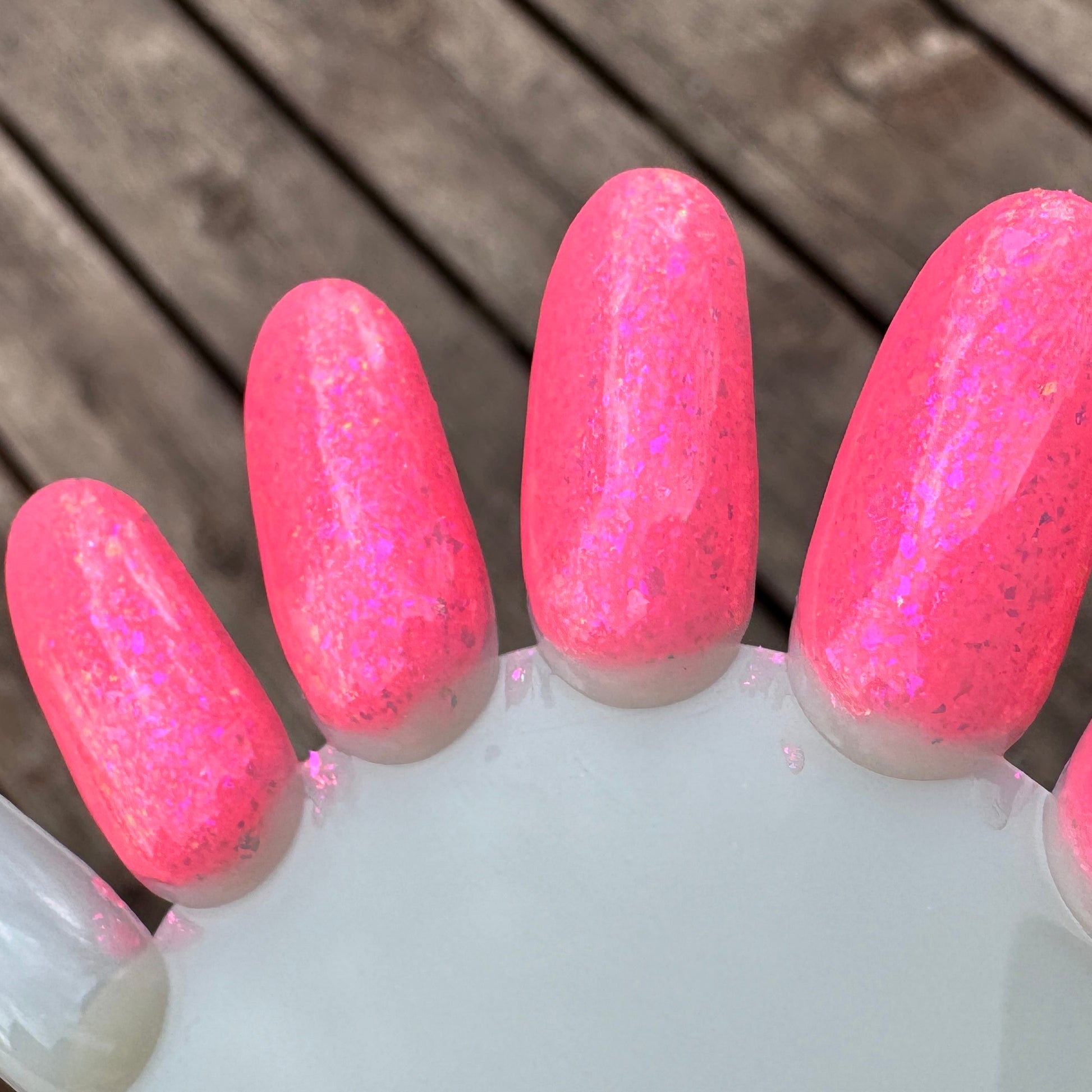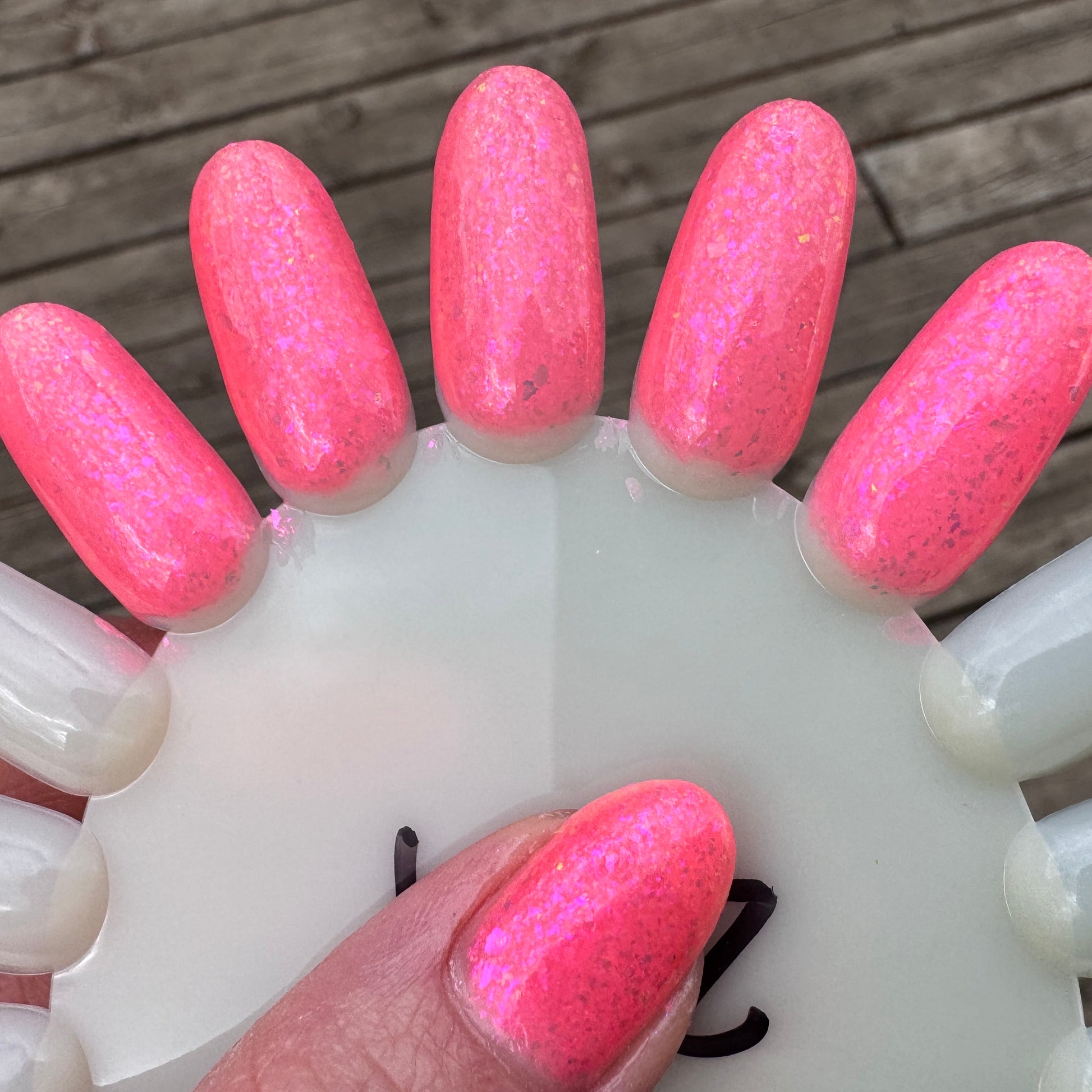 The swatch wheel photos show 3 coats with a glossy top coat, photographed in outdoor lighting with an iPhone 15. Neons can be challenging to photograph. I have done my best to accurately capture the neon base color, but what looks accurate on my screen may not look accurate on yours.