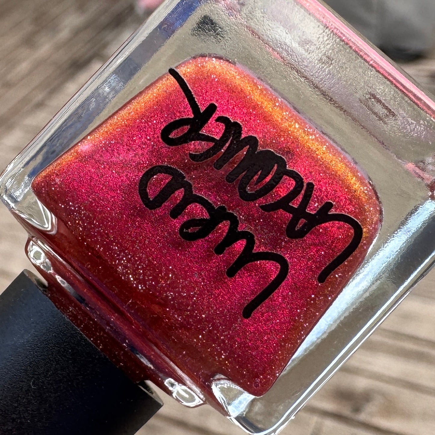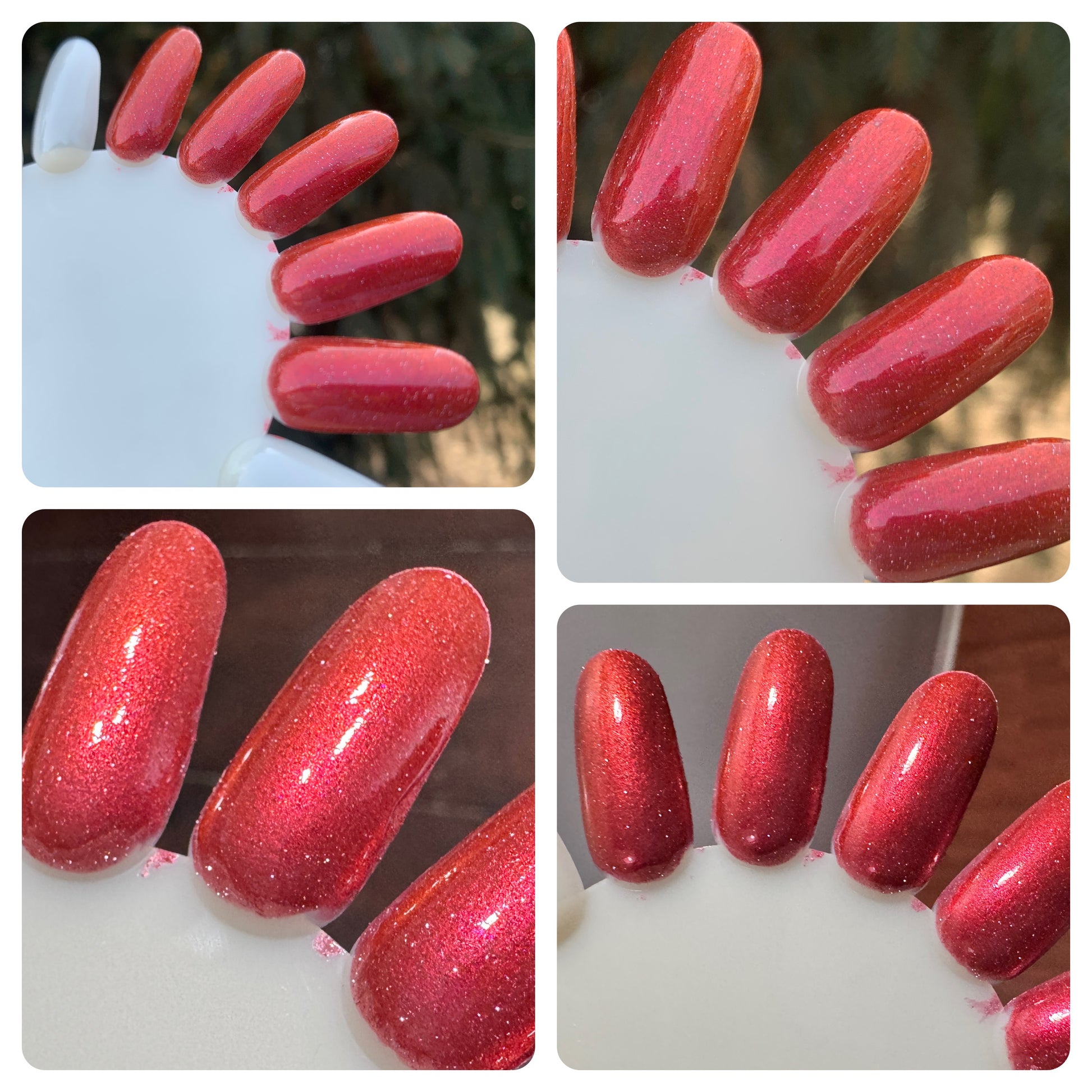 Faded Flannel features a cool-toned brick red jelly base with warm red-to-orange aurora shimmer and a mix of bronze and silver light reflective glitter.