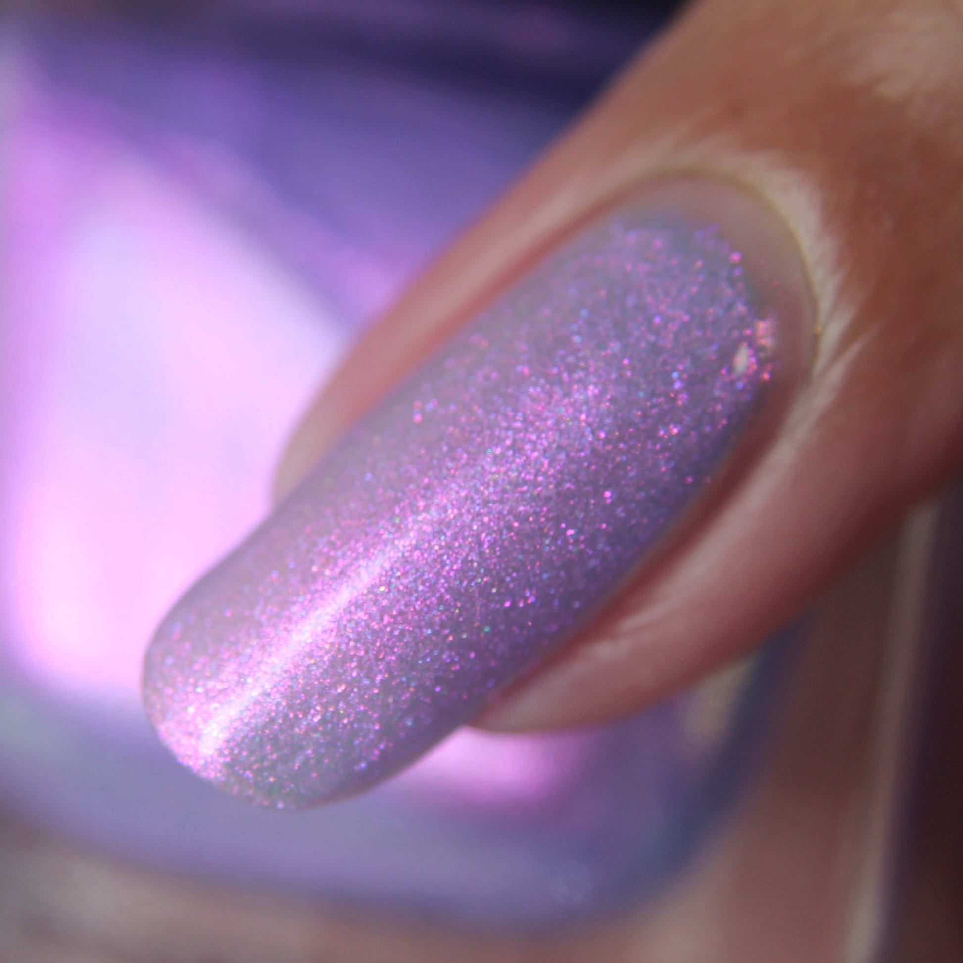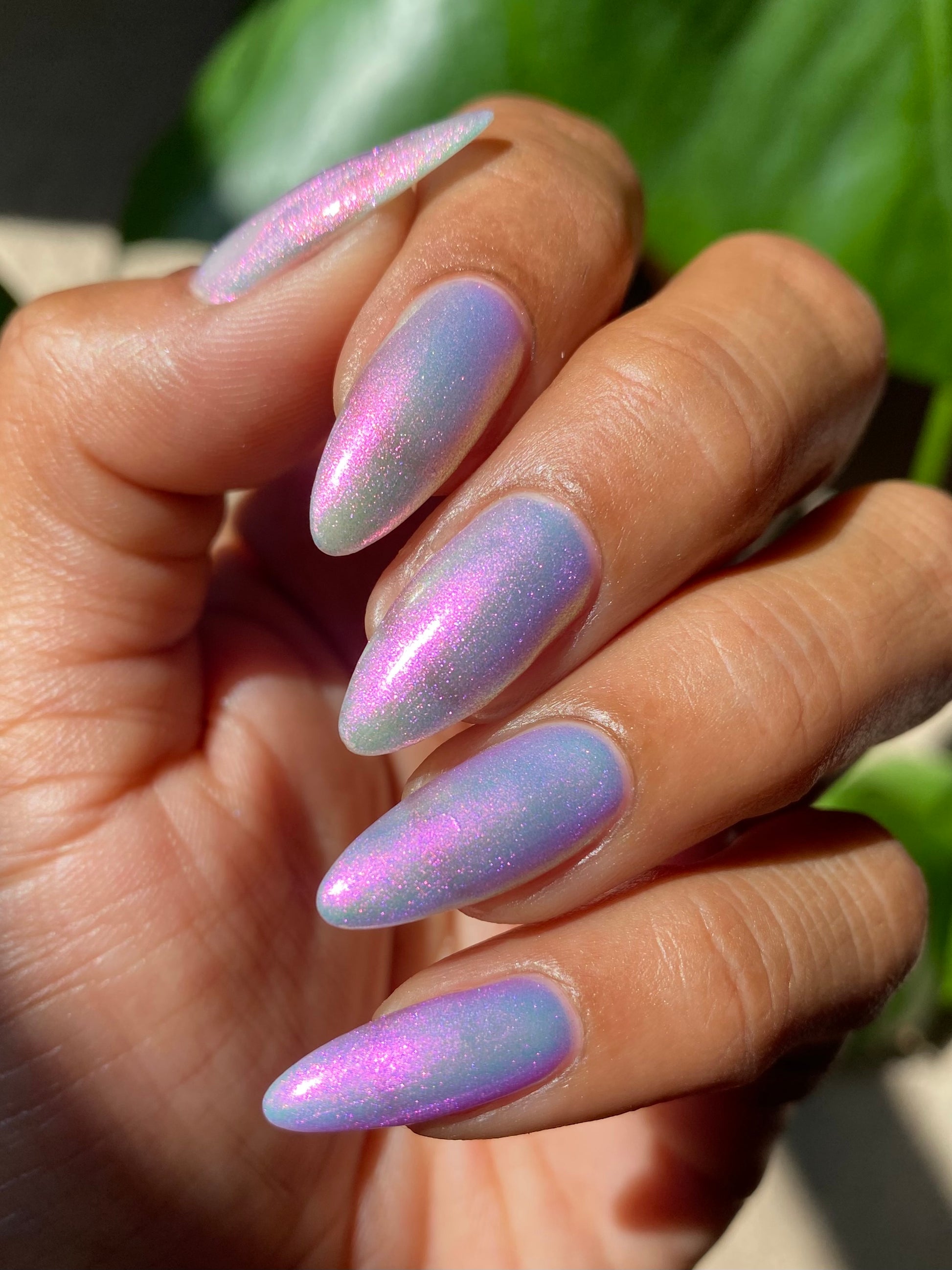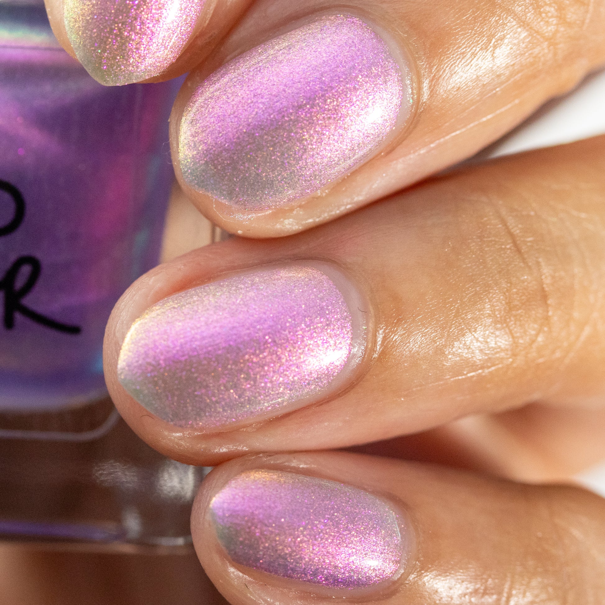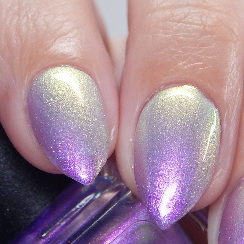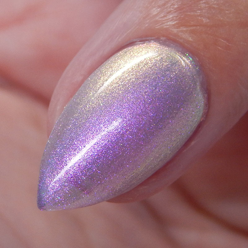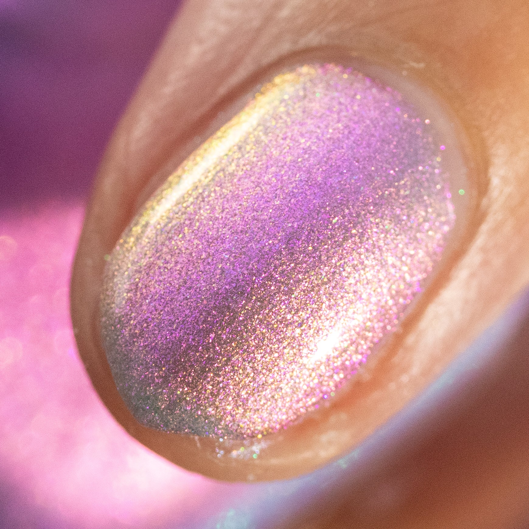 A sheer violet jelly base packed with super shifty aurora pigment that shifts from pink to orange to gold