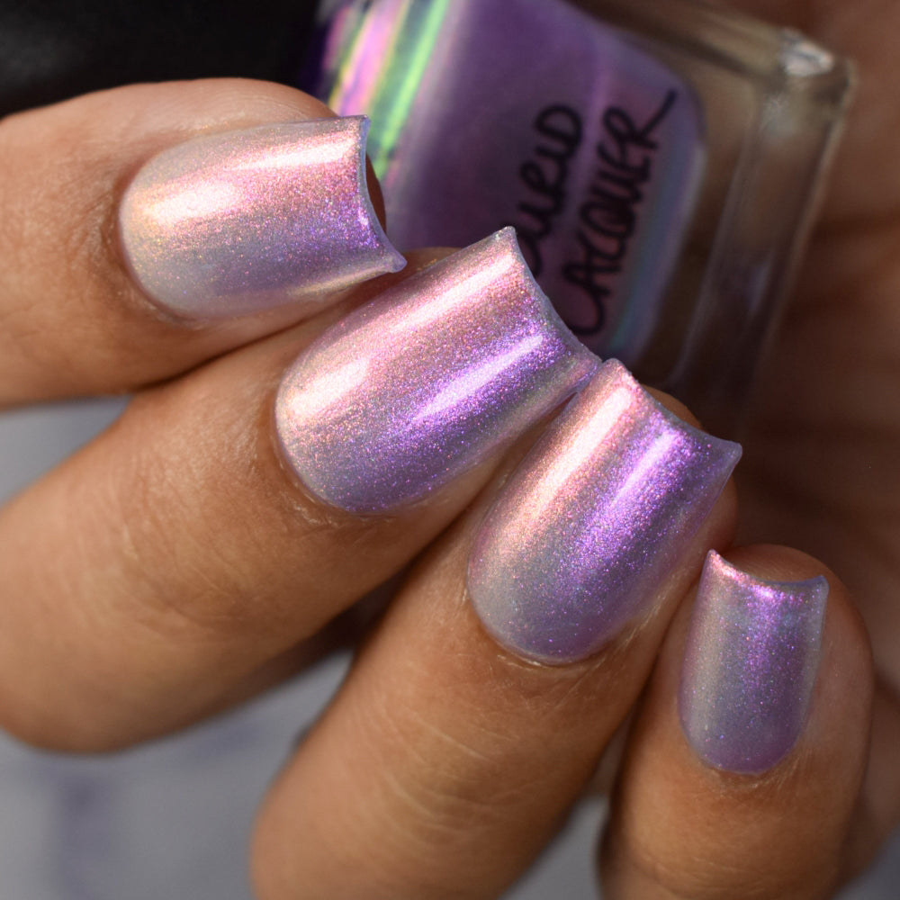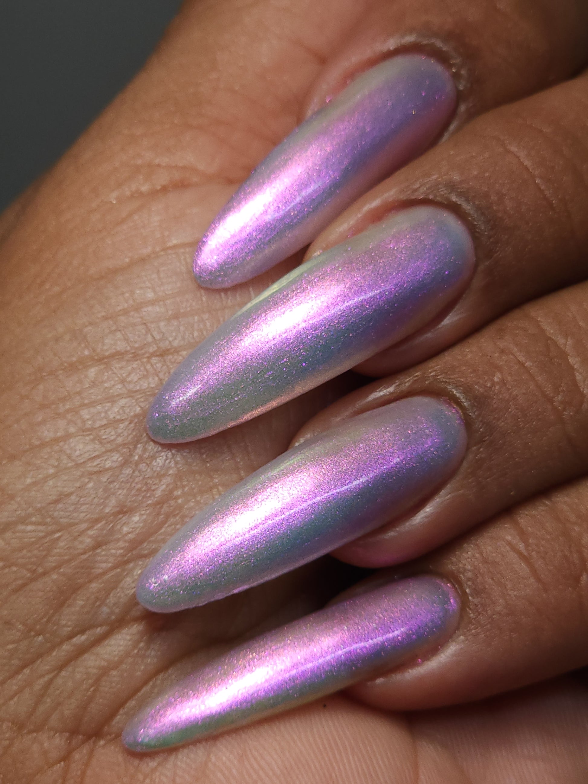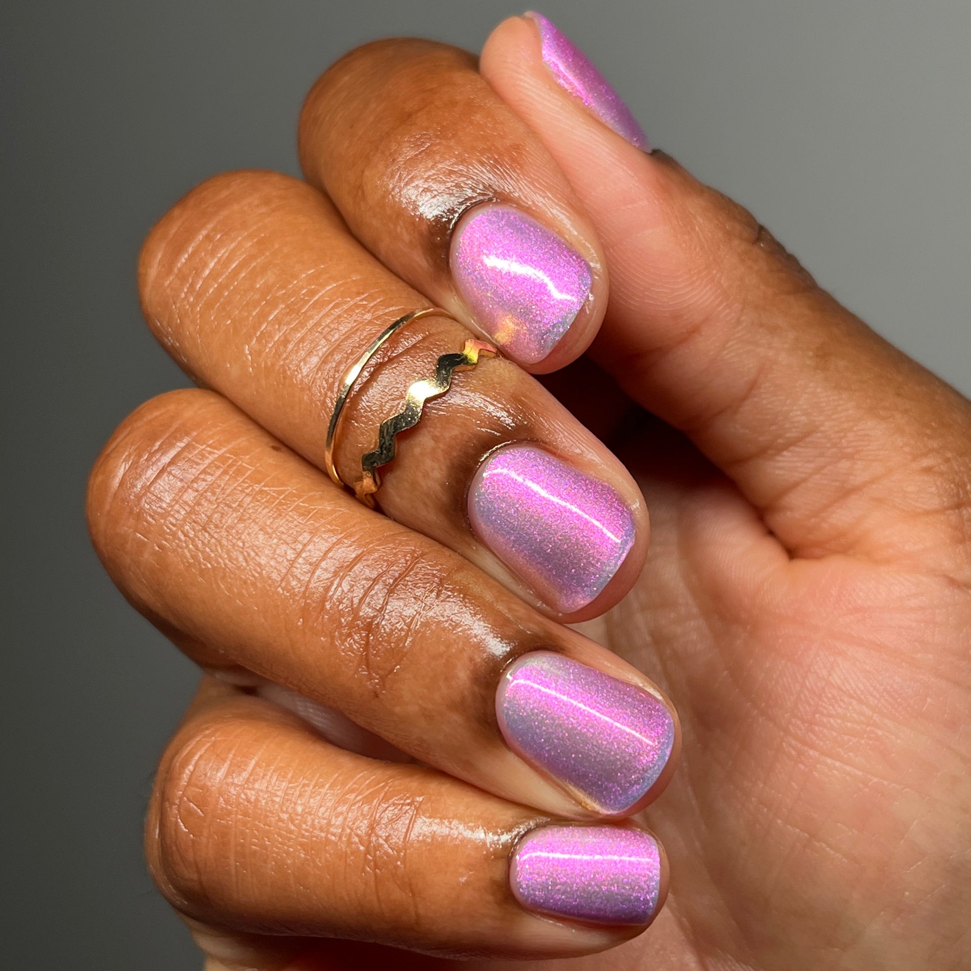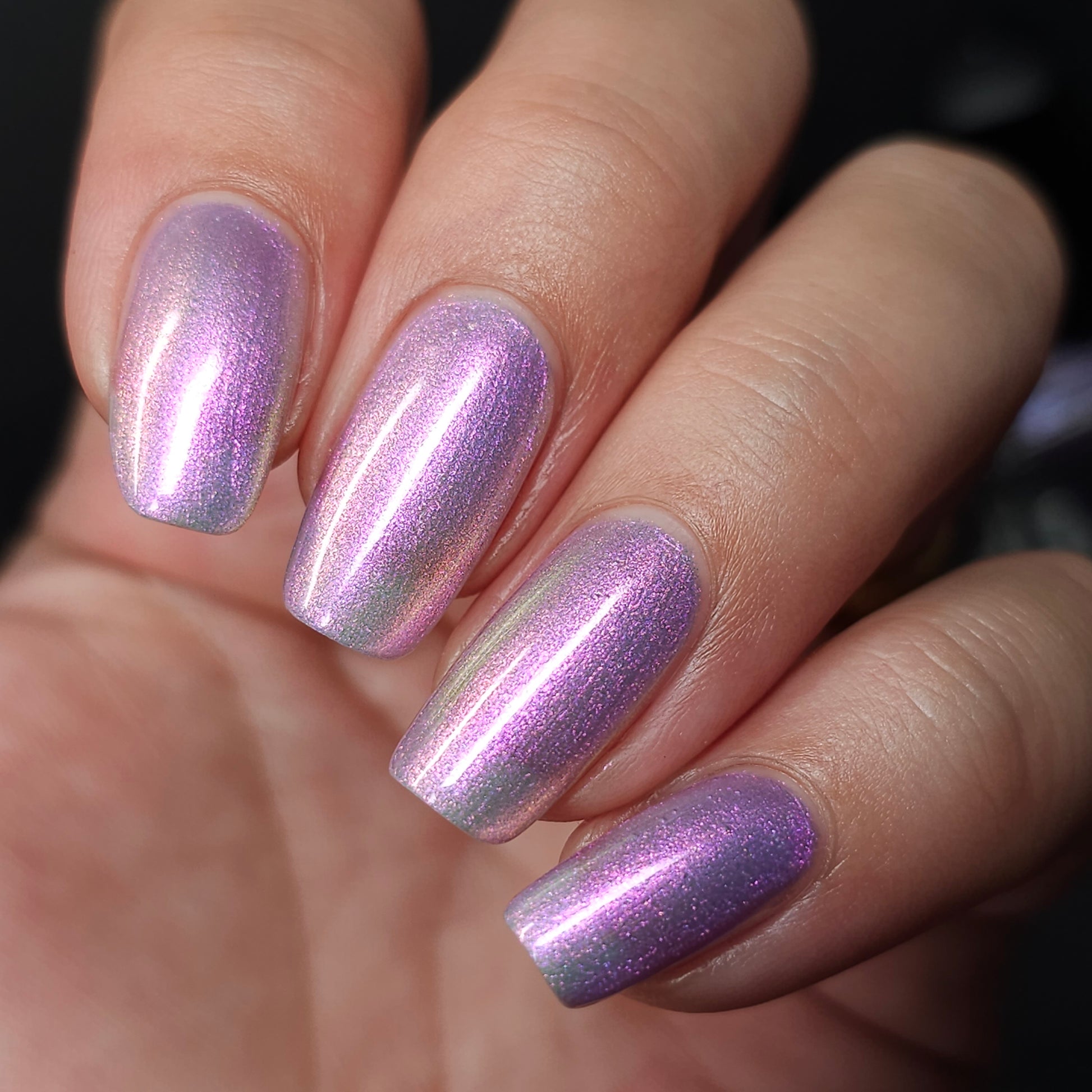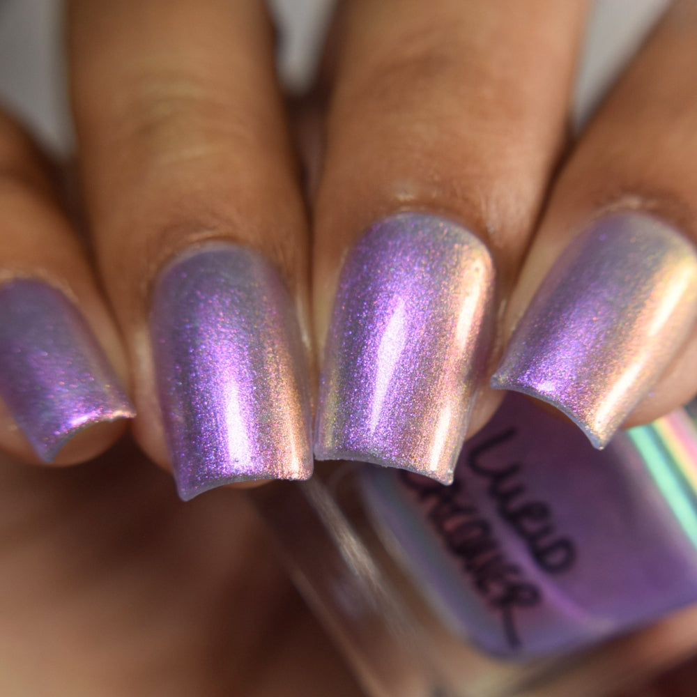 A sheer violet jelly base packed with super shifty aurora pigment that shifts from pink to orange to gold