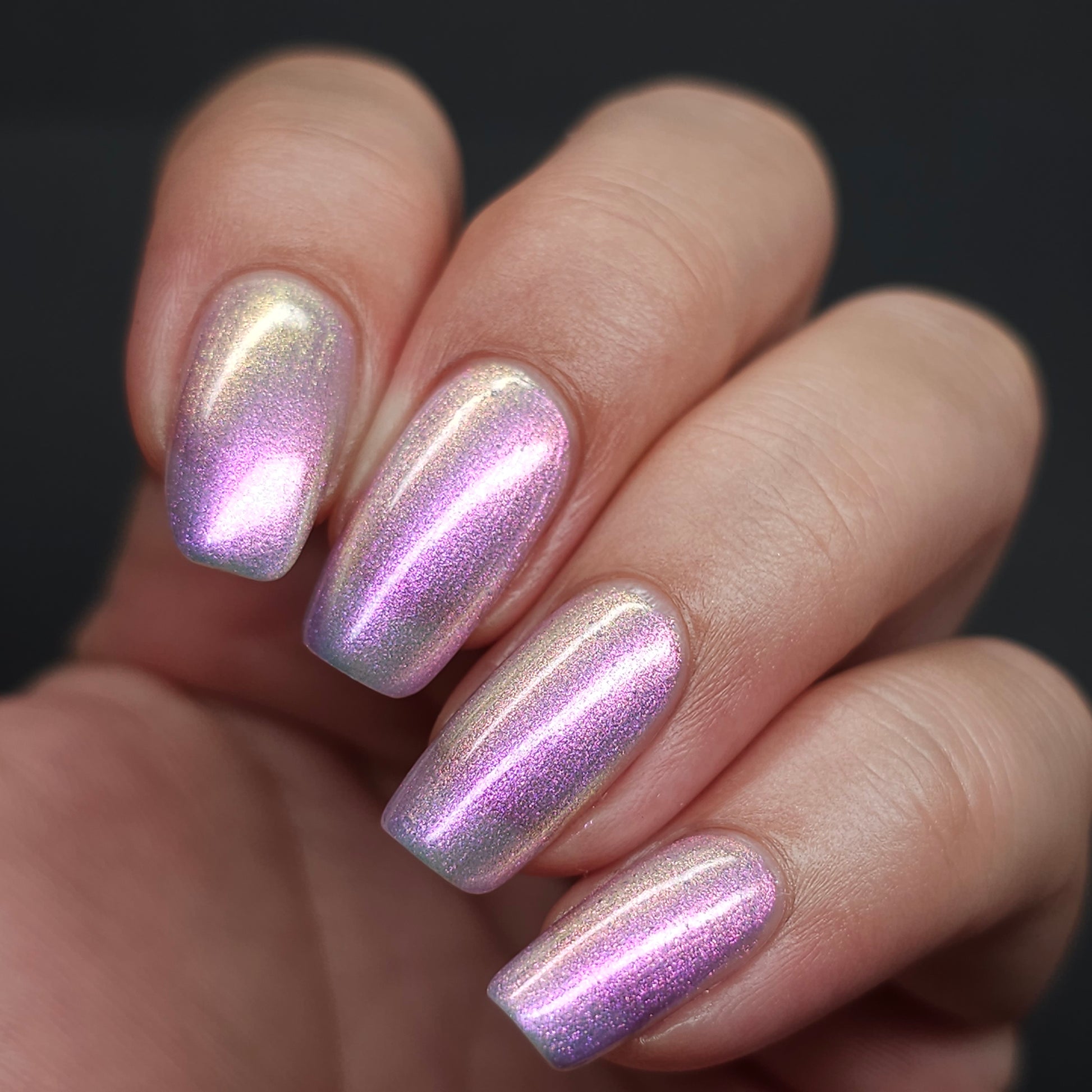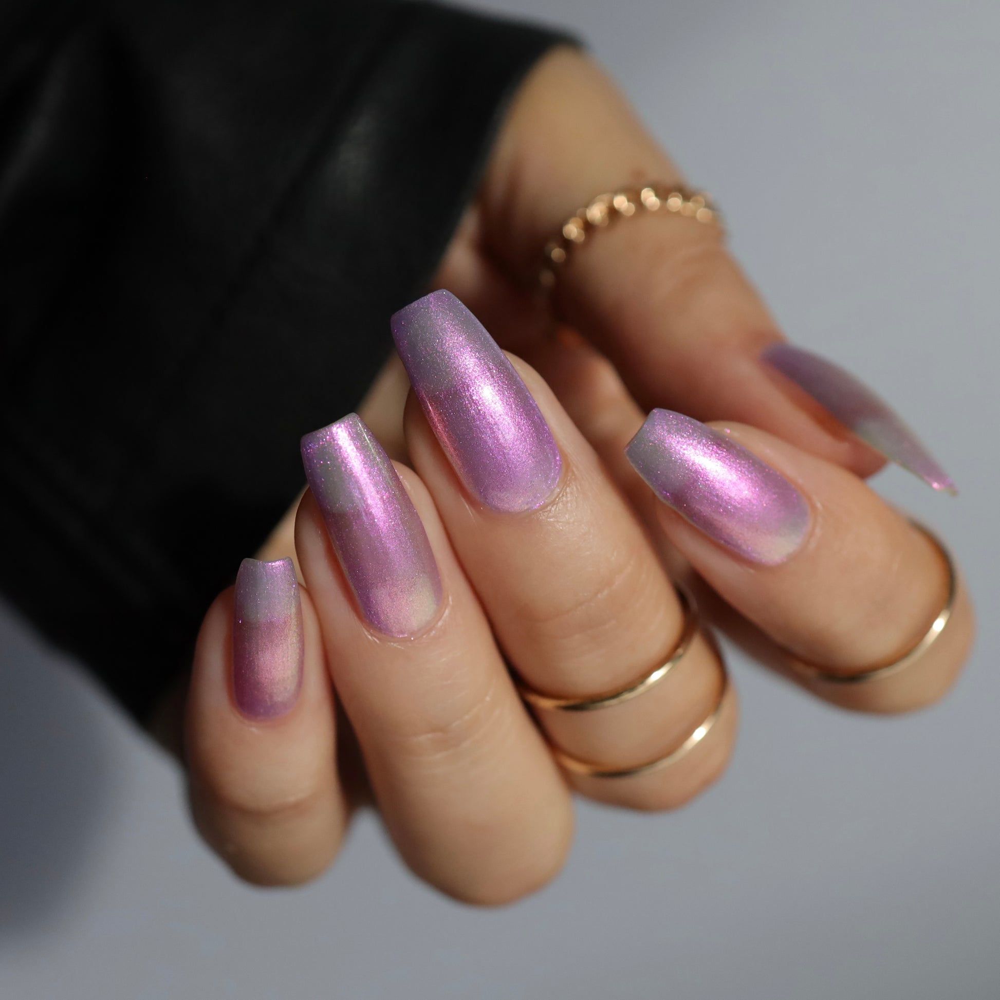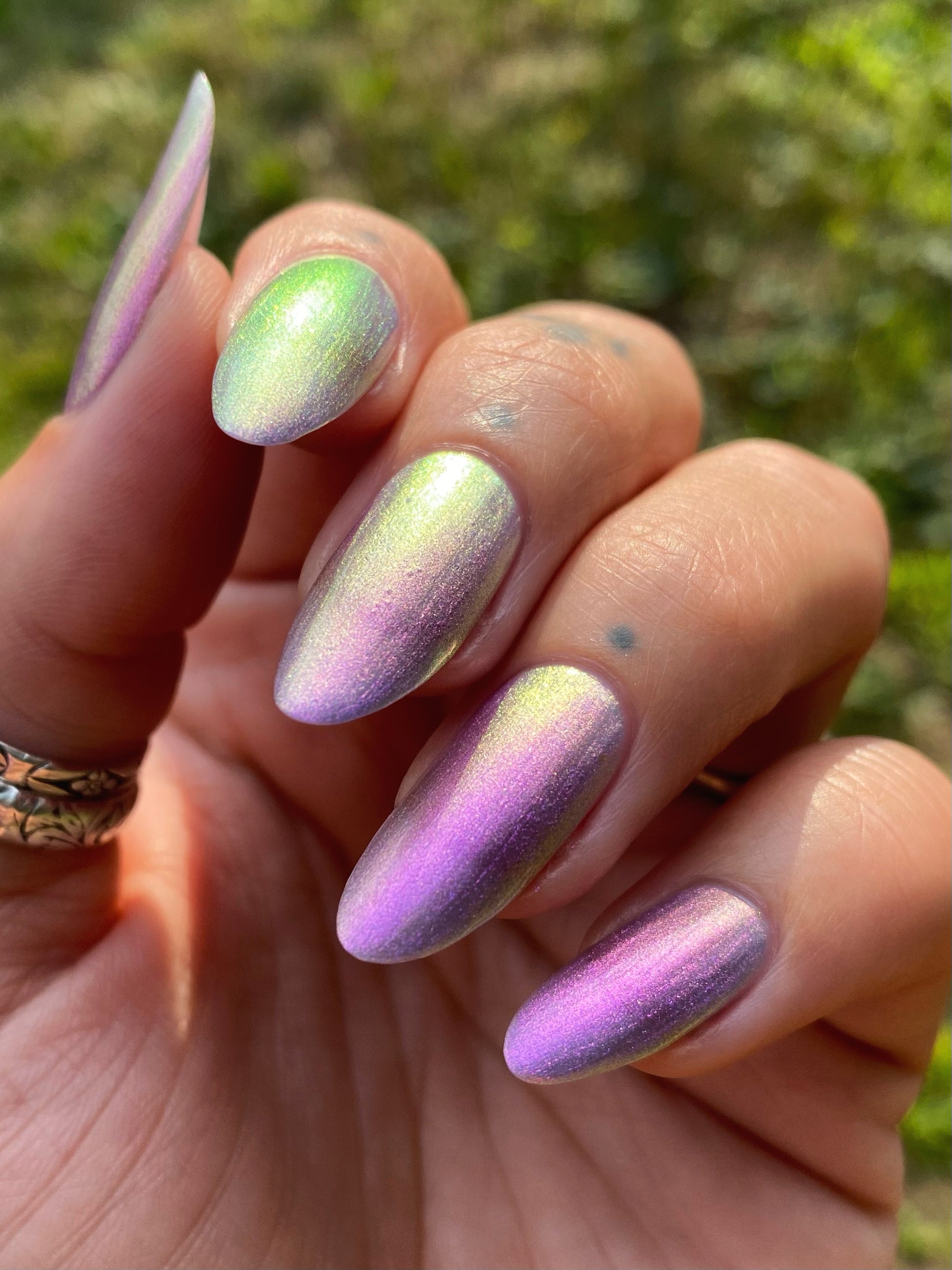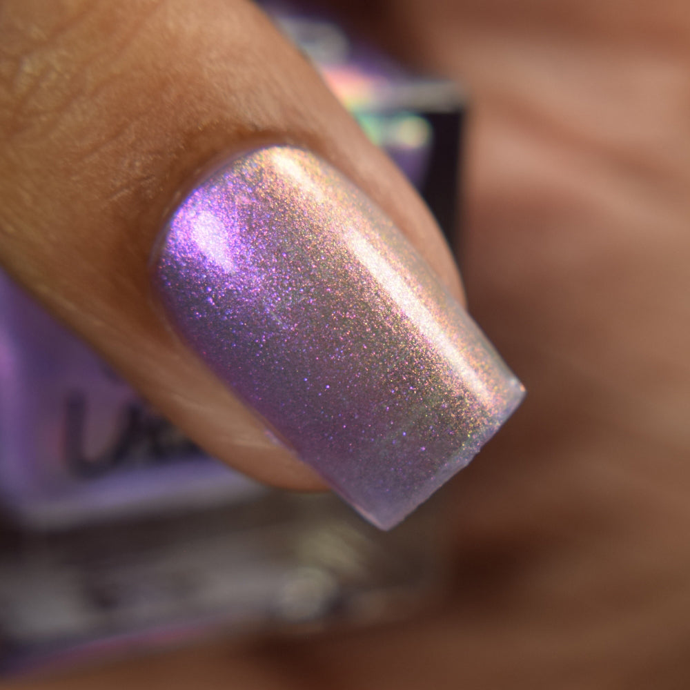 A sheer violet jelly base packed with super shifty aurora pigment that shifts from pink to orange to gold