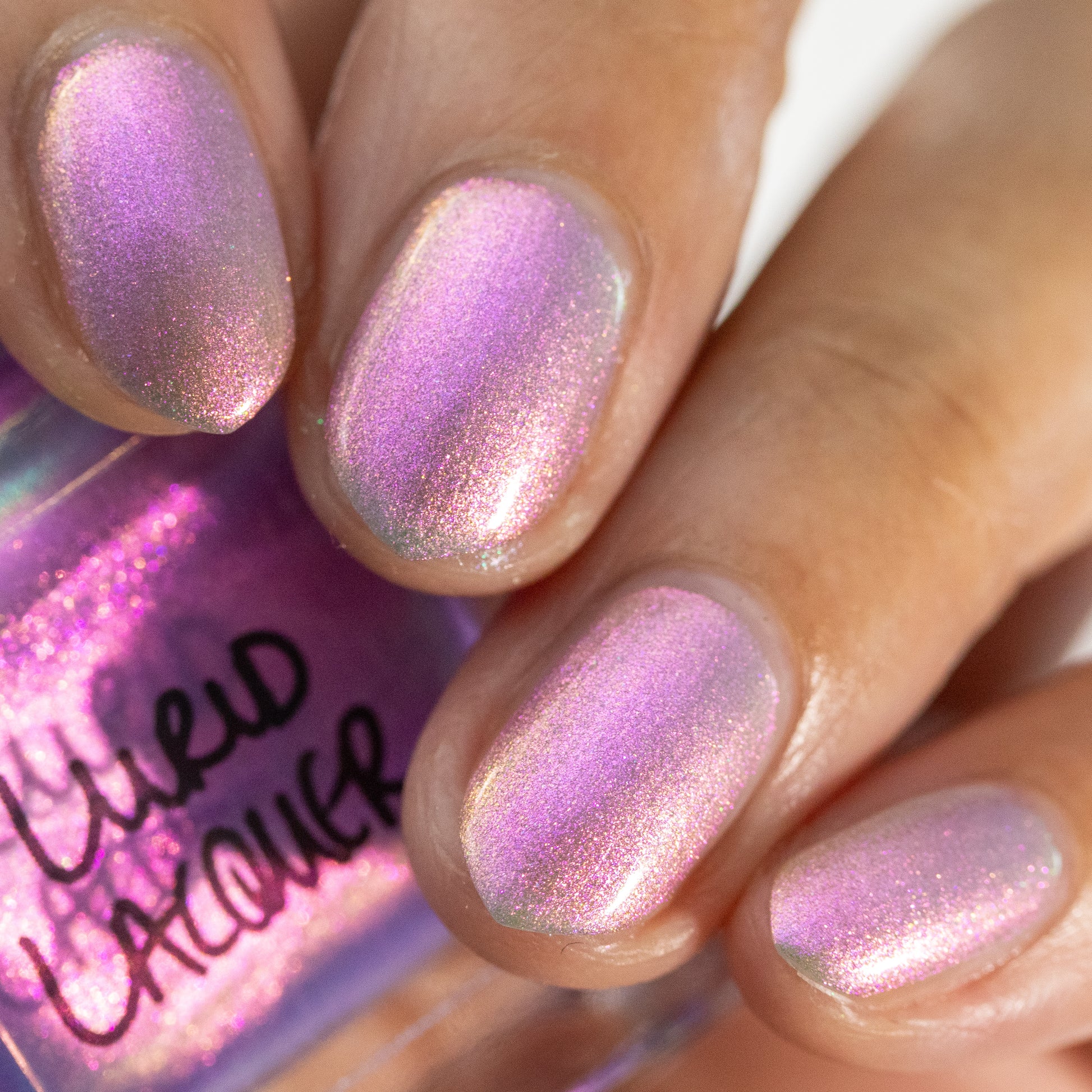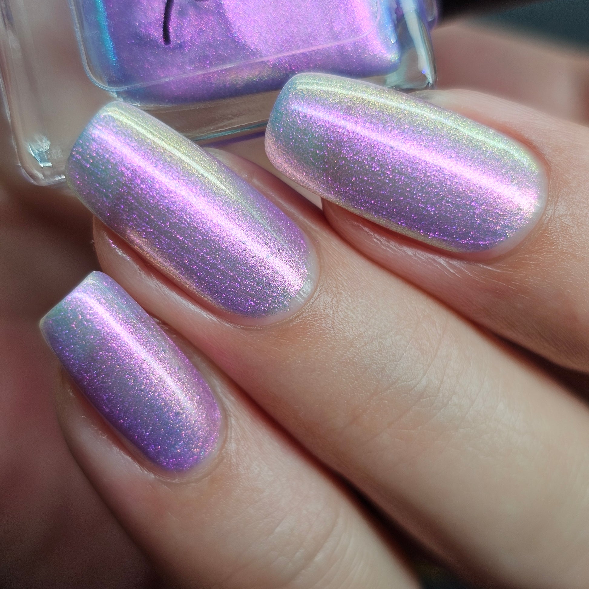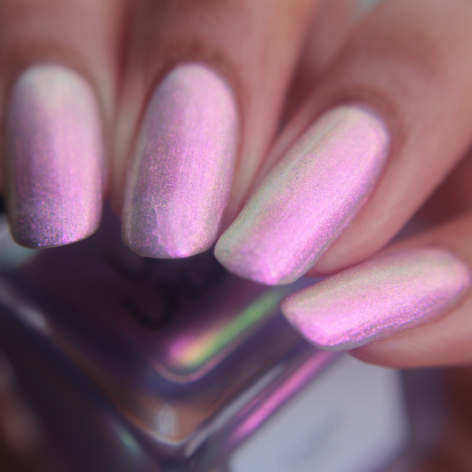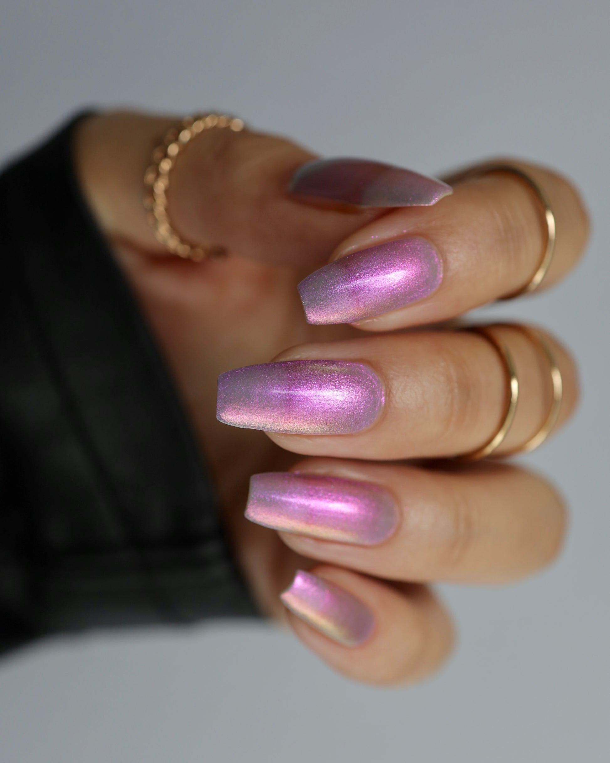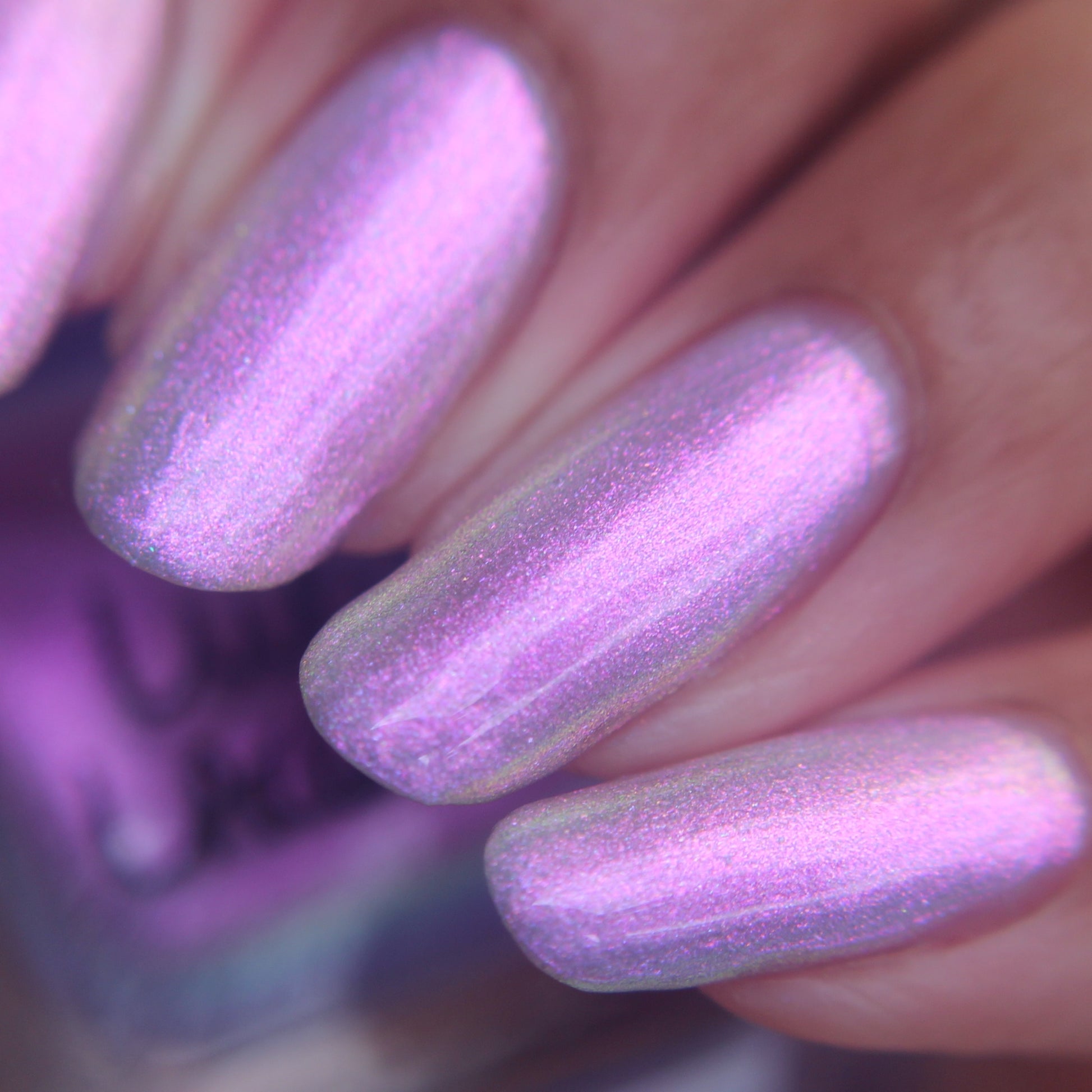 A sheer violet jelly base packed with super shifty aurora pigment that shifts from pink to orange to gold