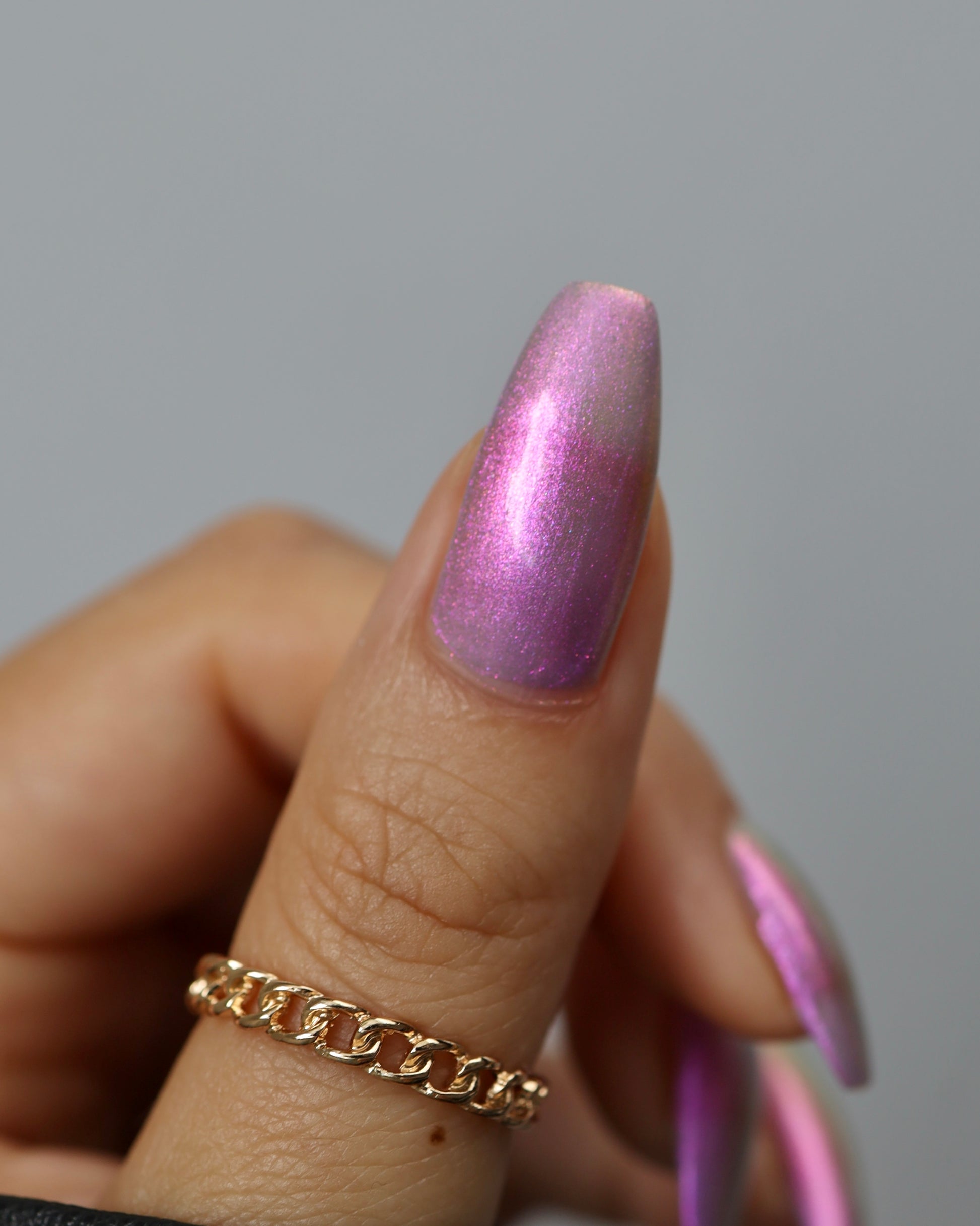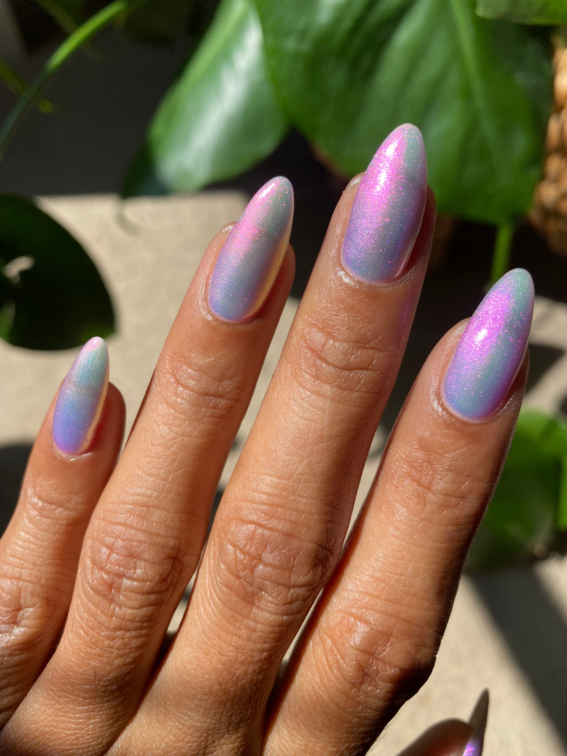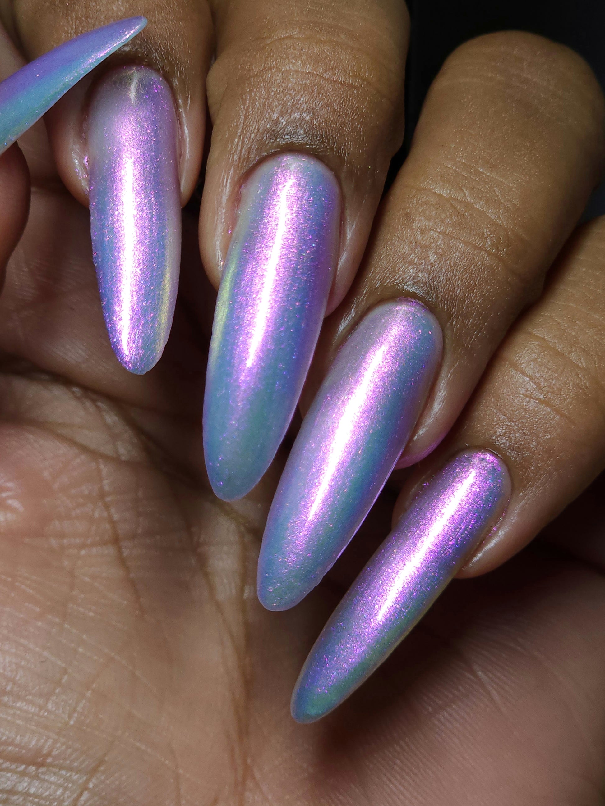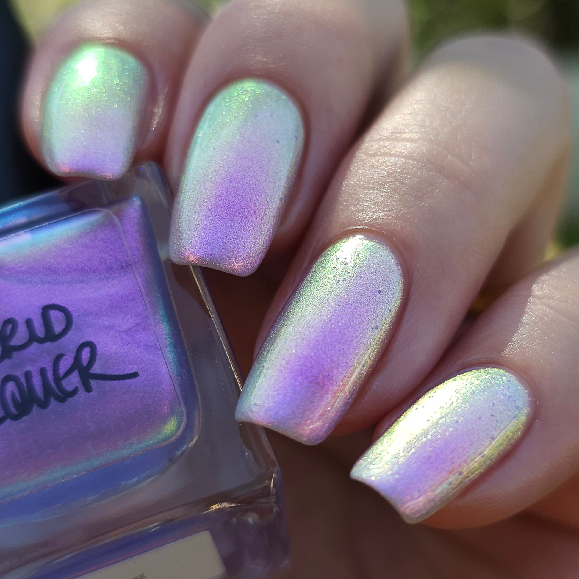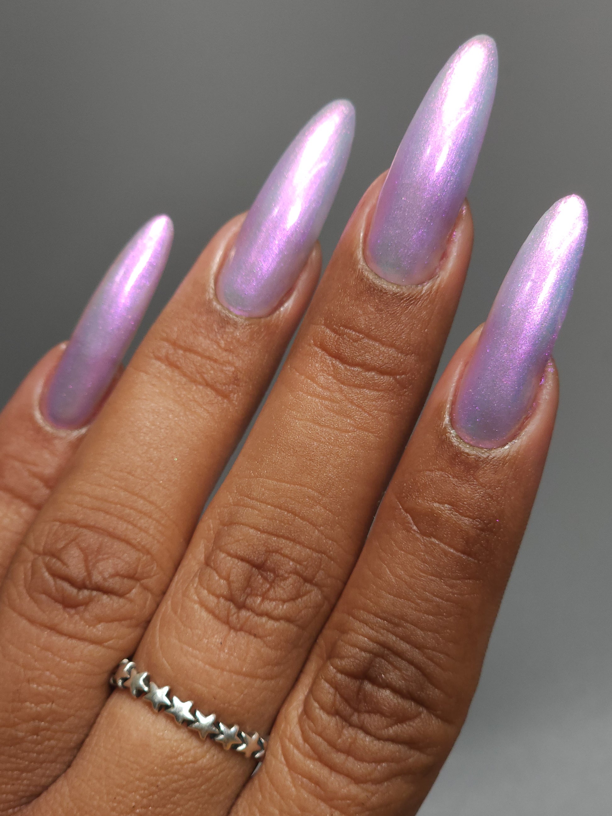 A sheer violet jelly base packed with super shifty aurora pigment that shifts from pink to orange to gold