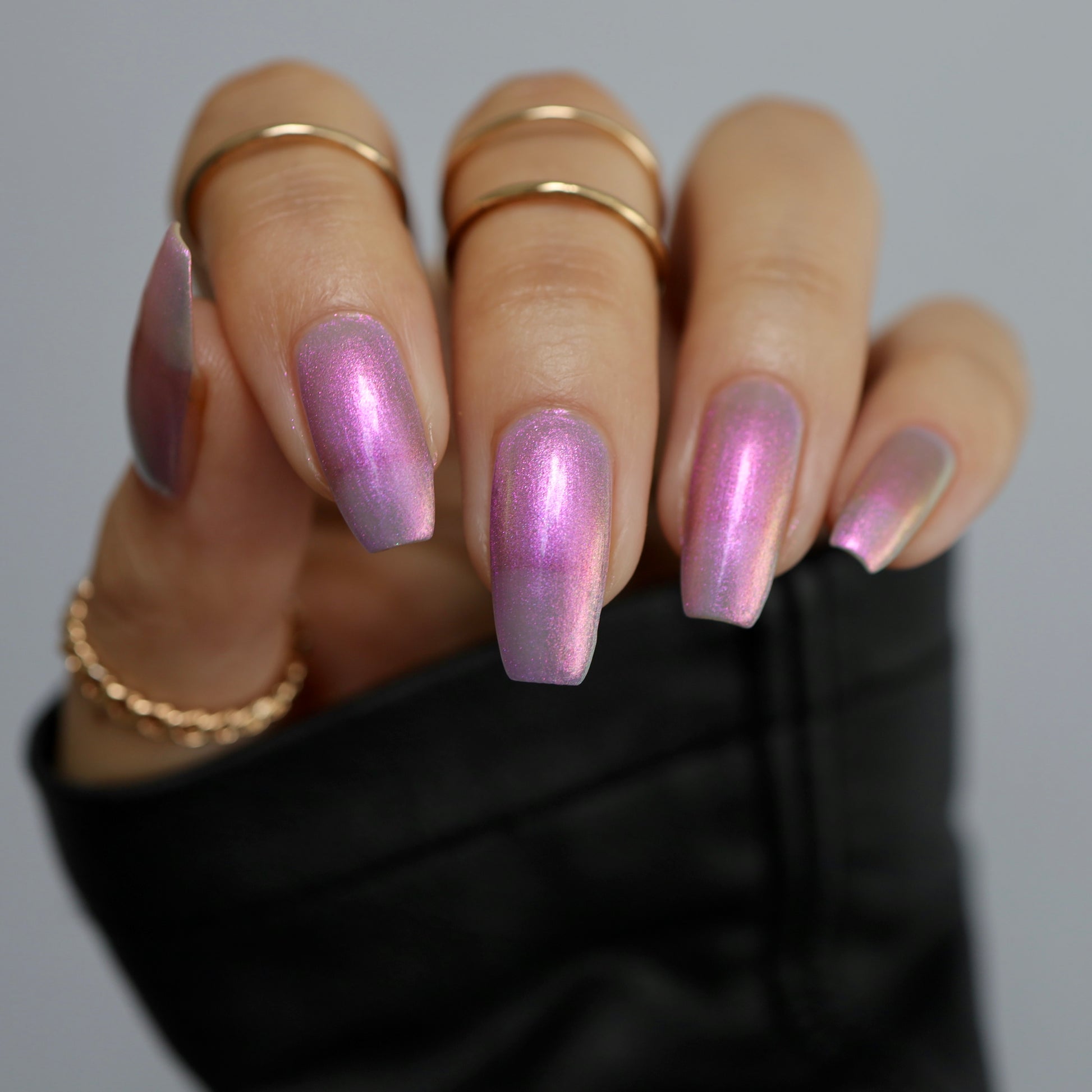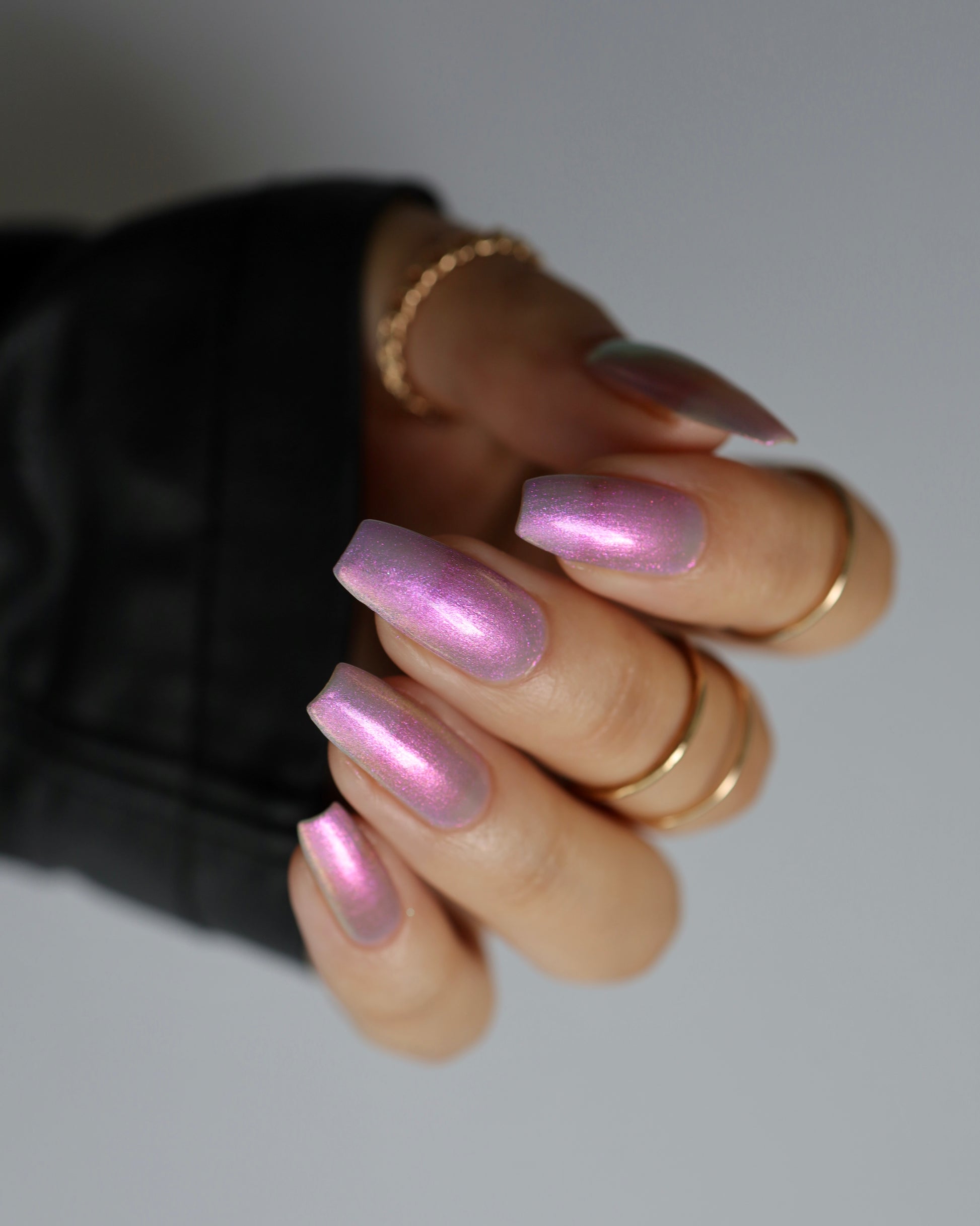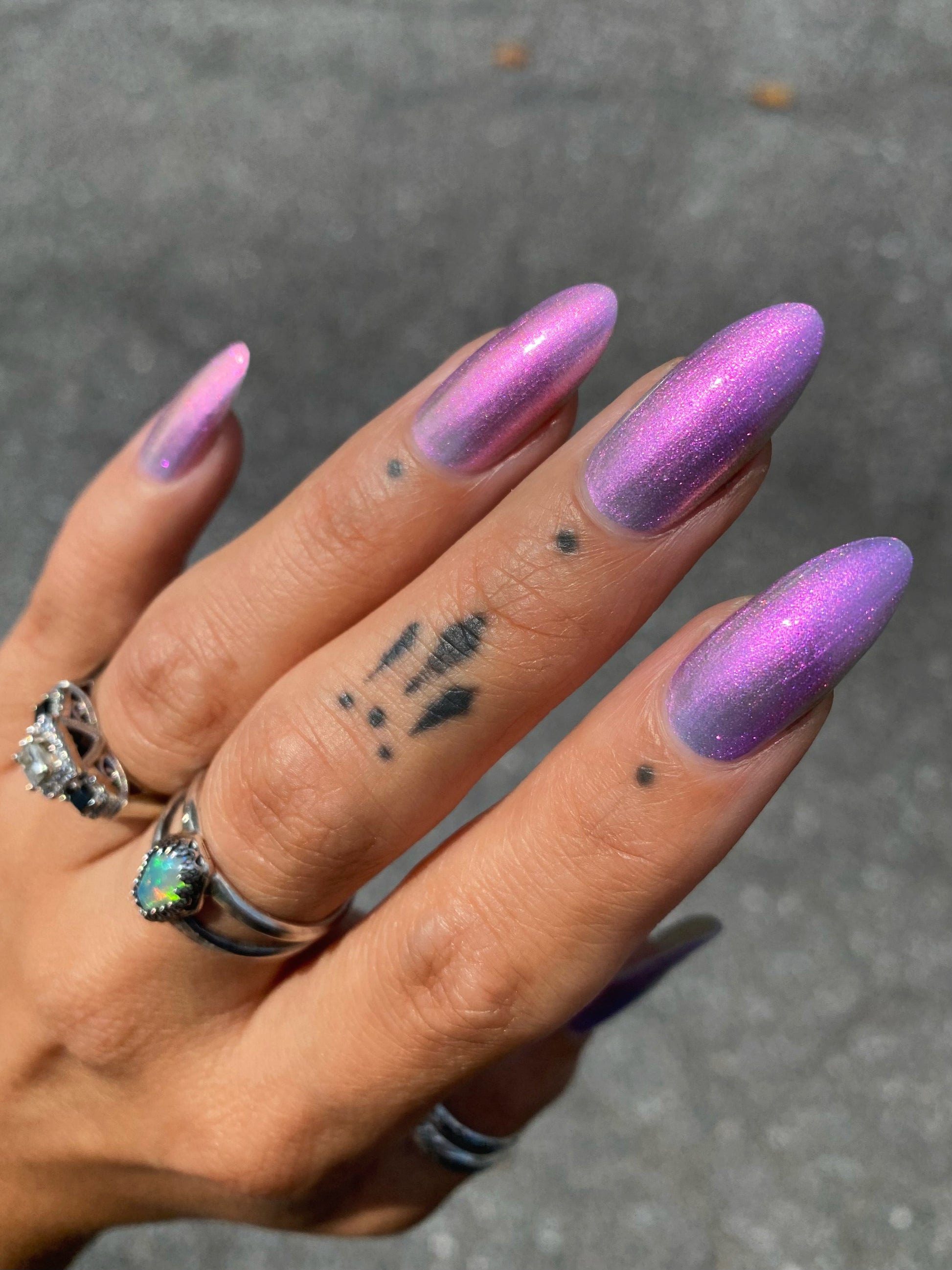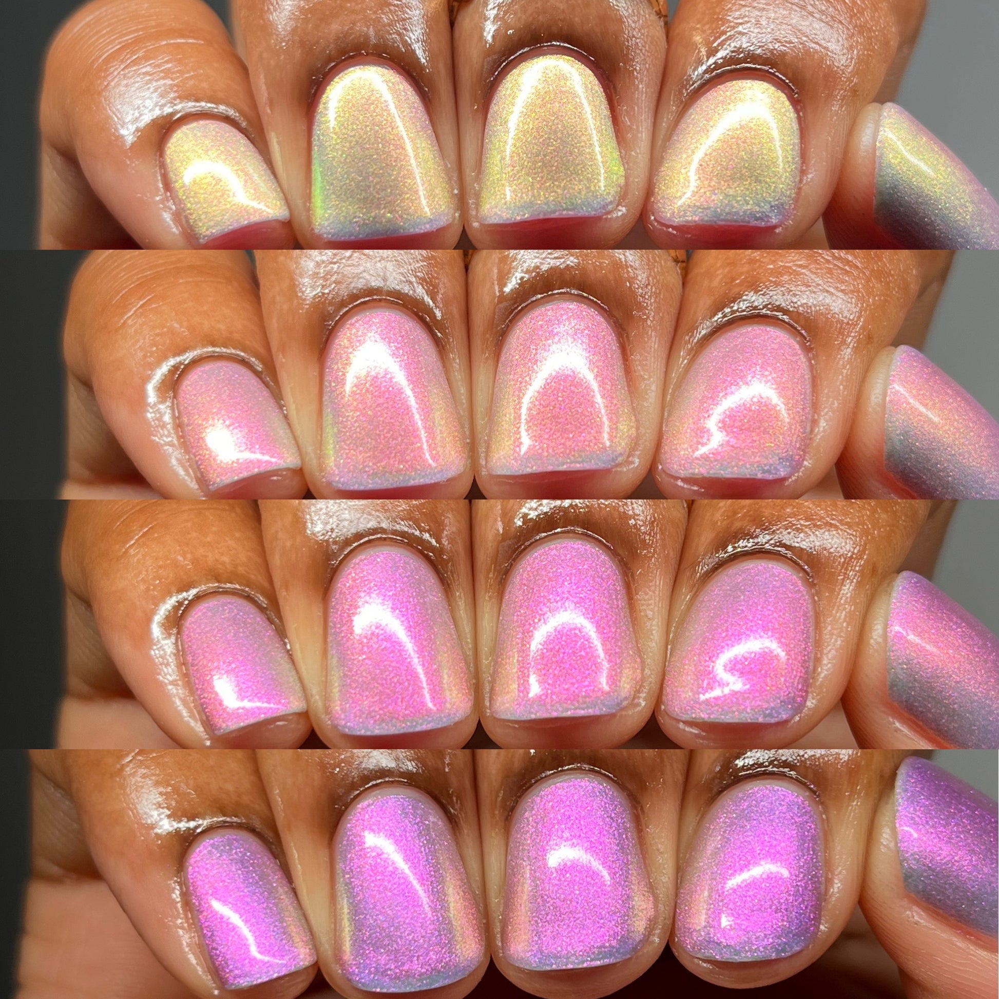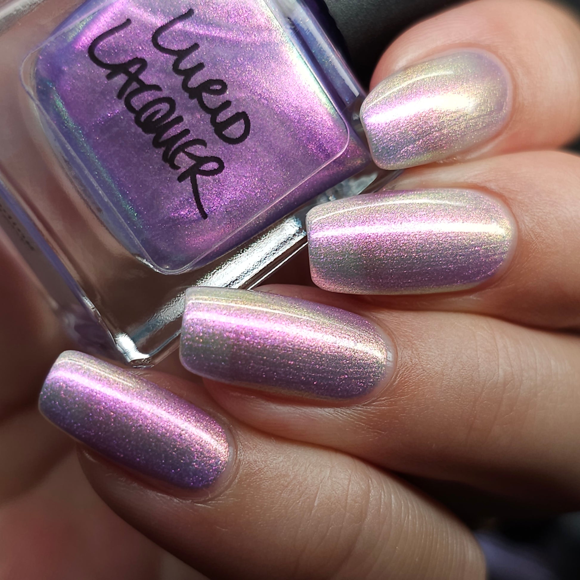 A sheer violet jelly base packed with super shifty aurora pigment that shifts from pink to orange to gold