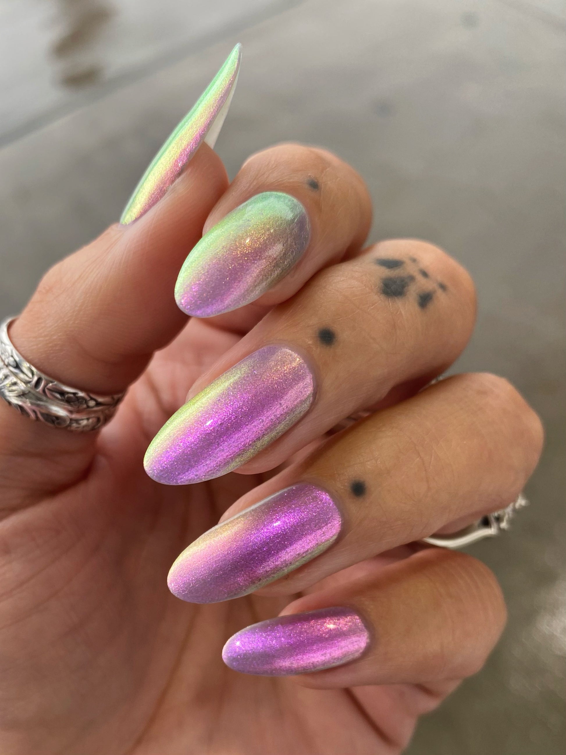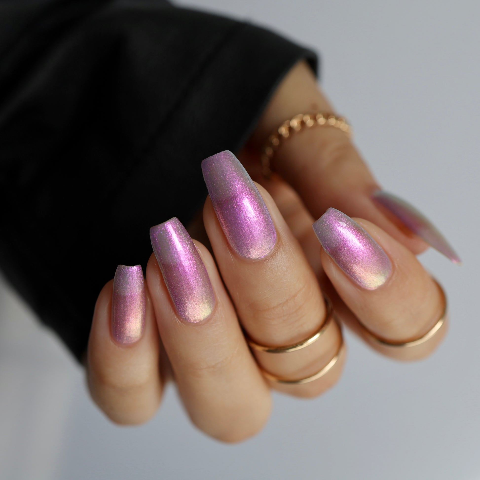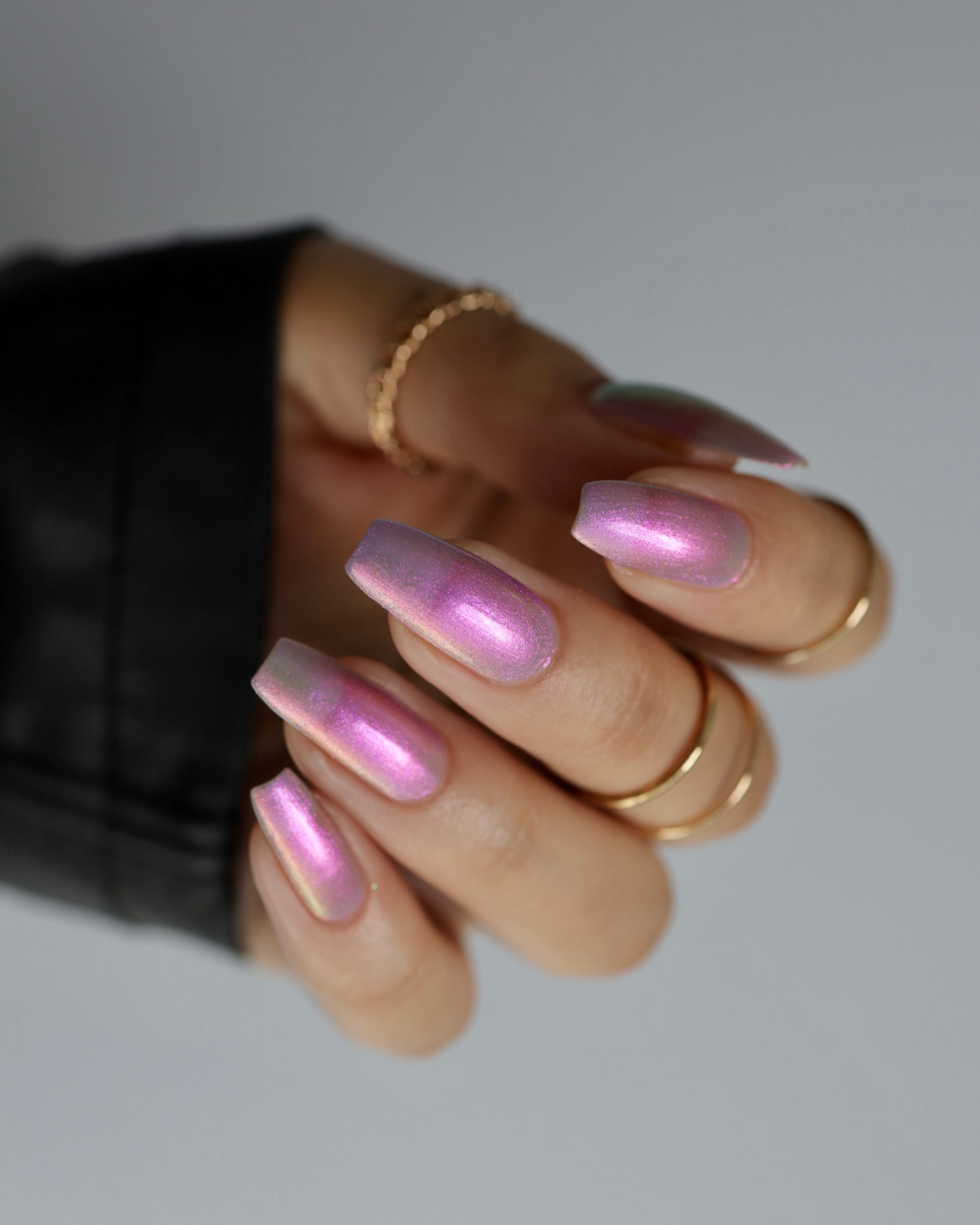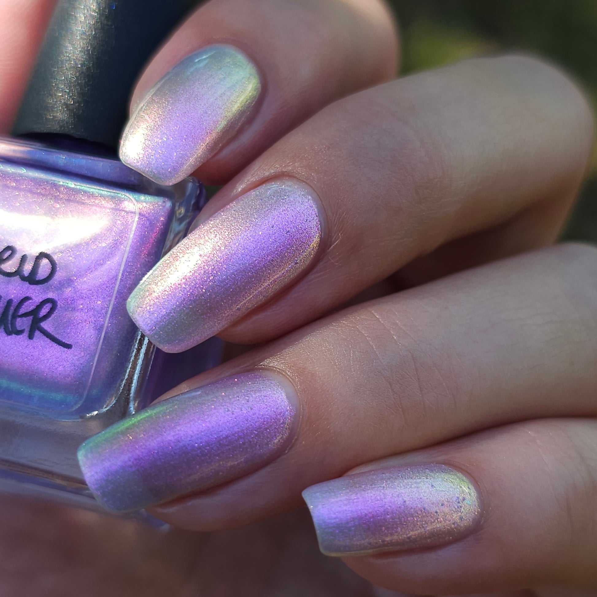 A sheer violet jelly base packed with super shifty aurora pigment that shifts from pink to orange to gold