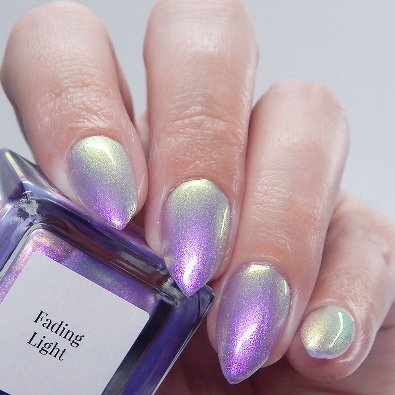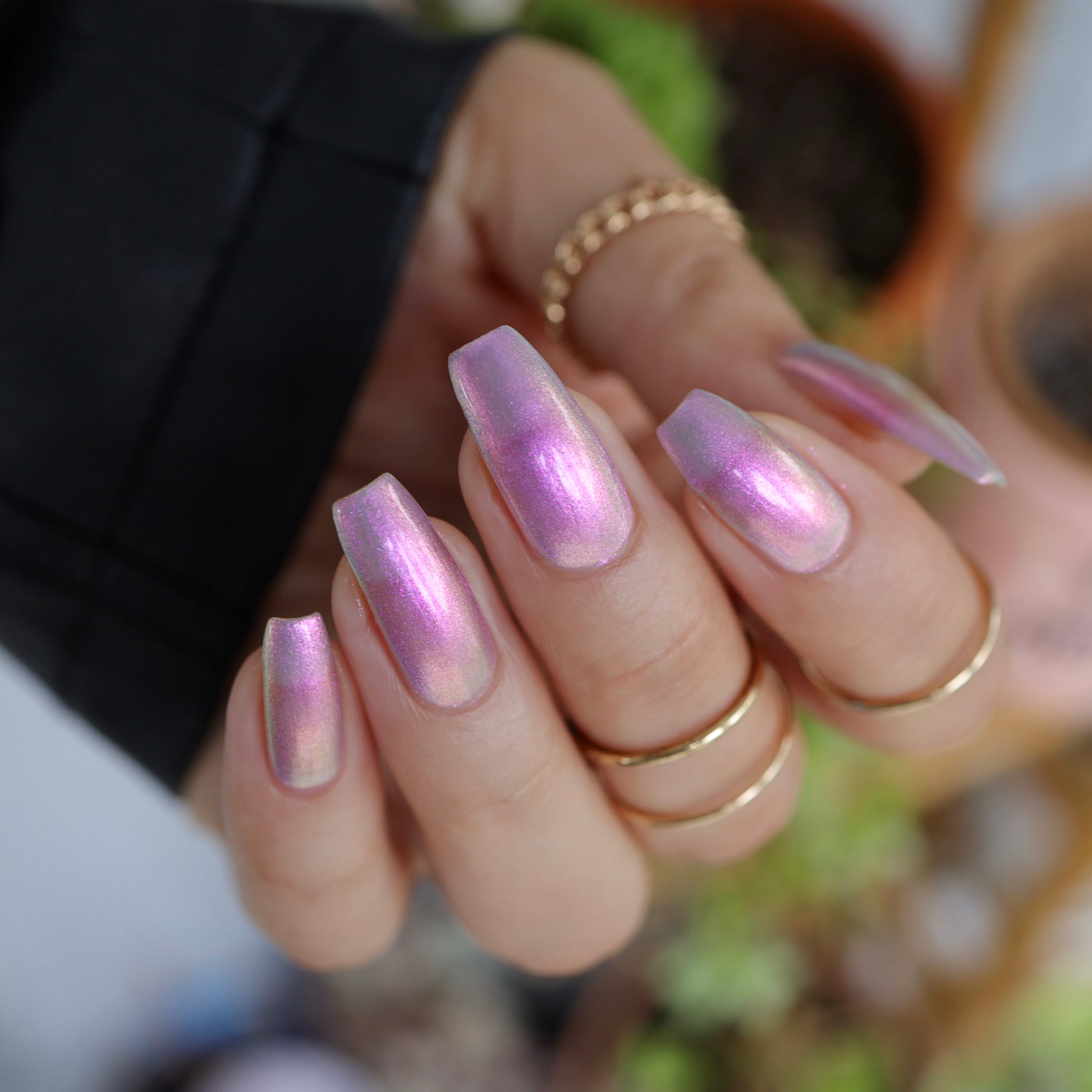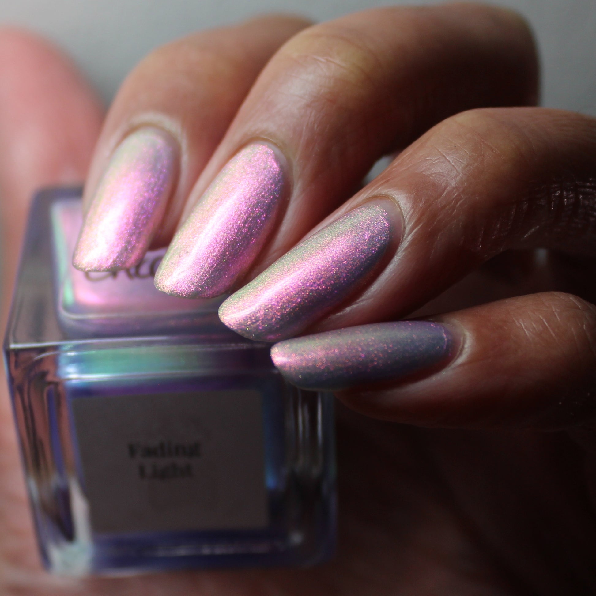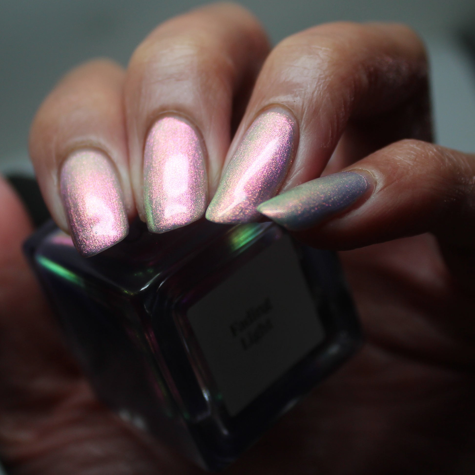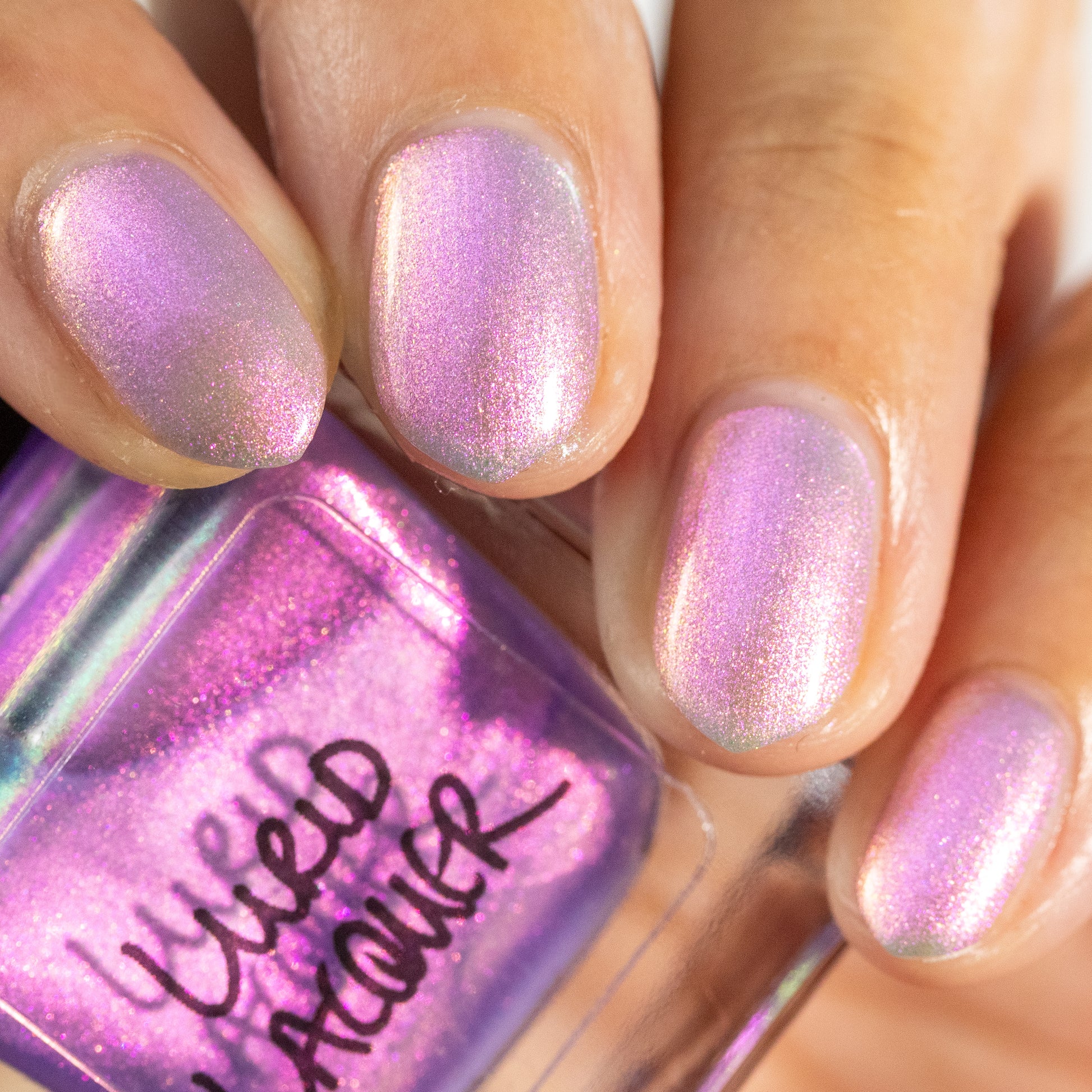 A sheer violet jelly base packed with super shifty aurora pigment that shifts from pink to orange to gold