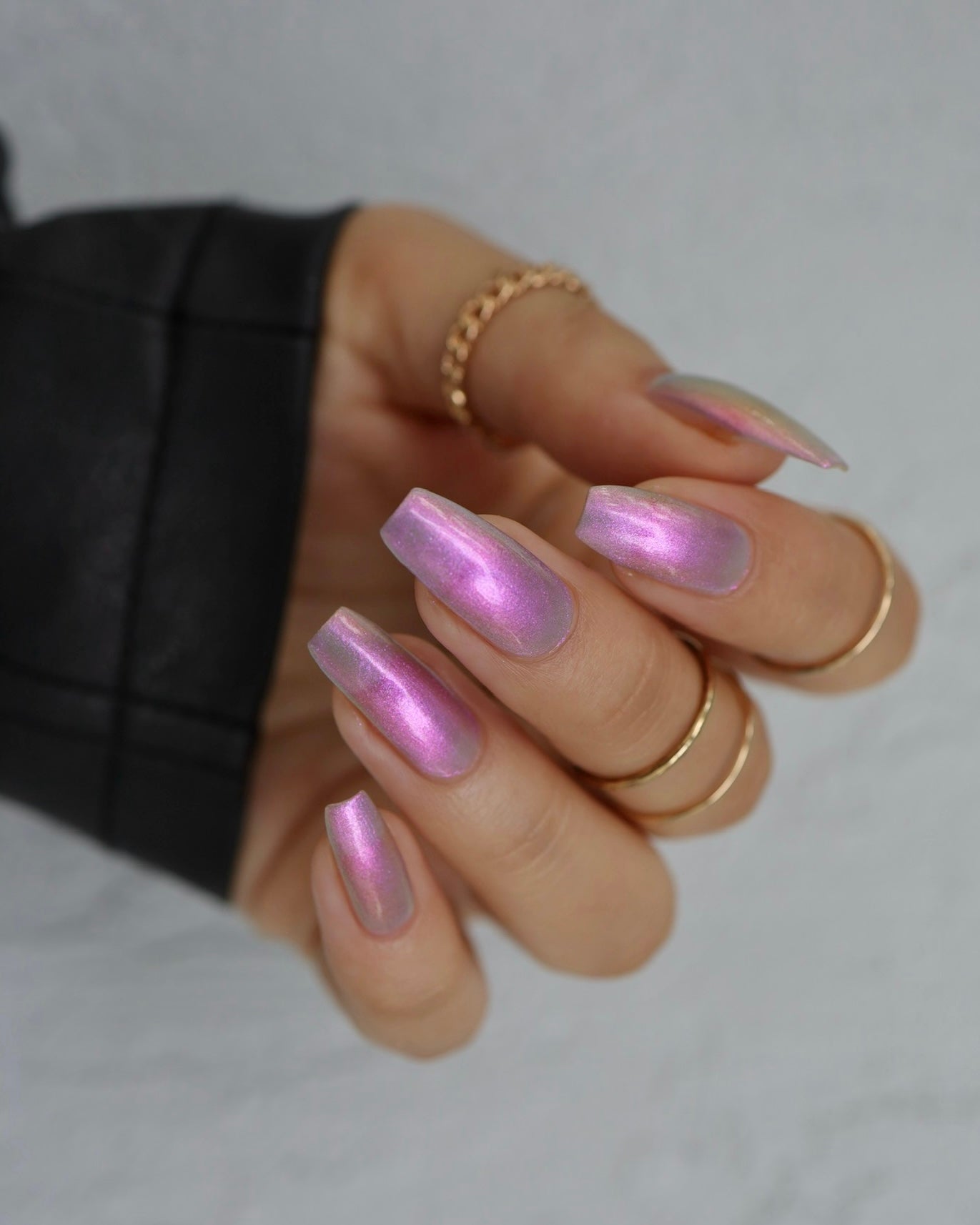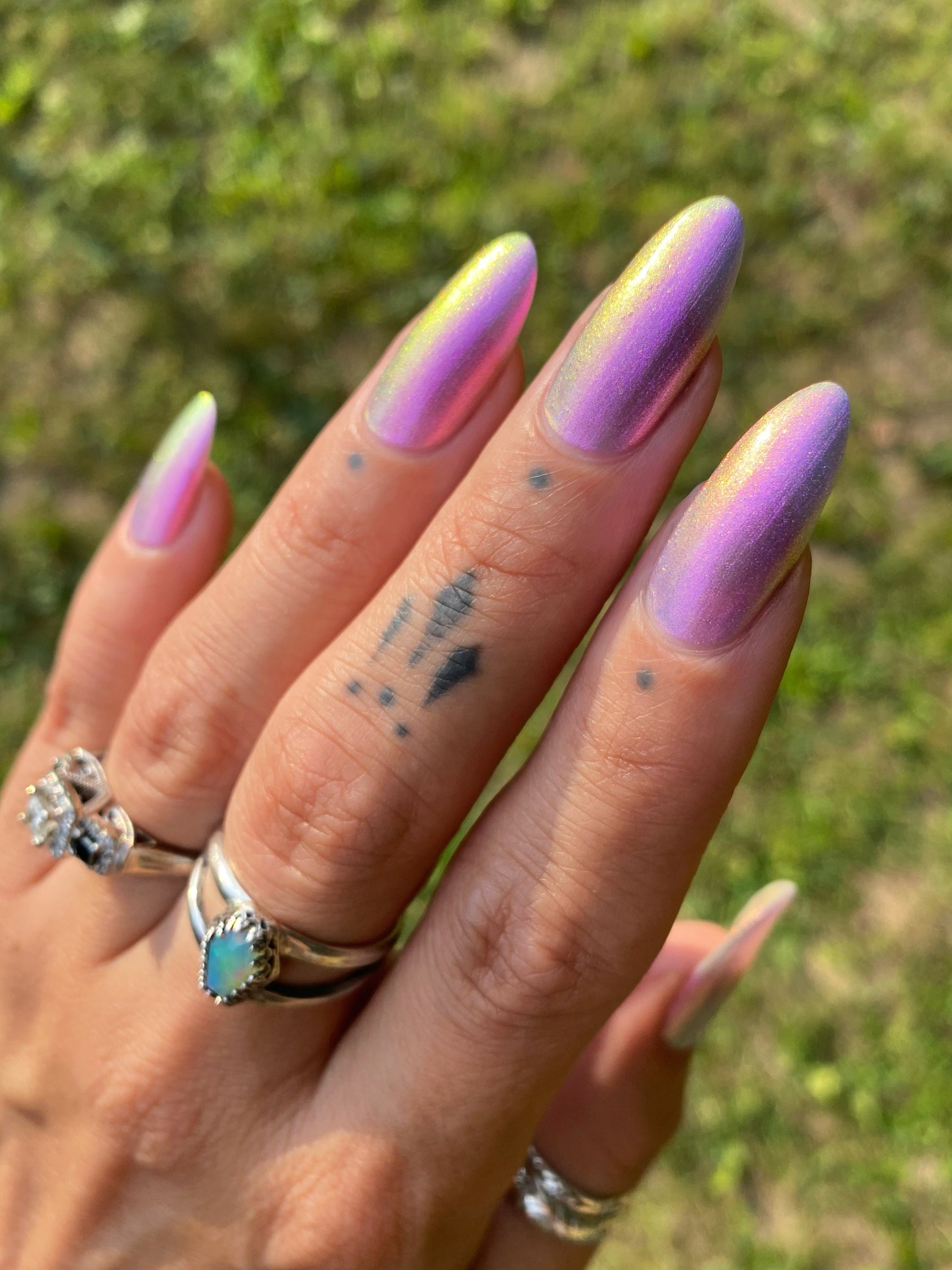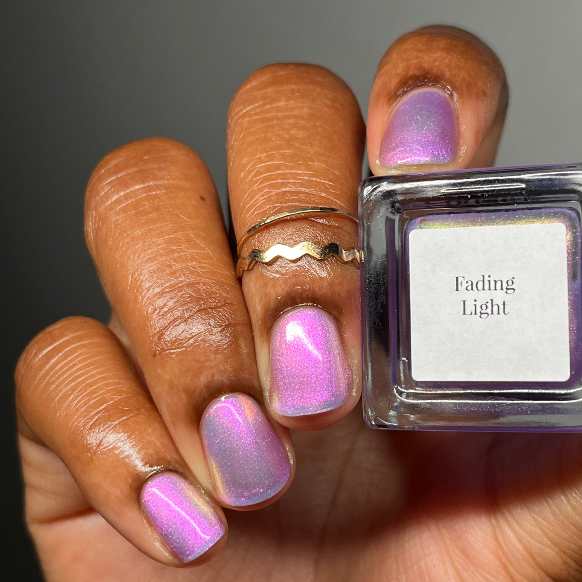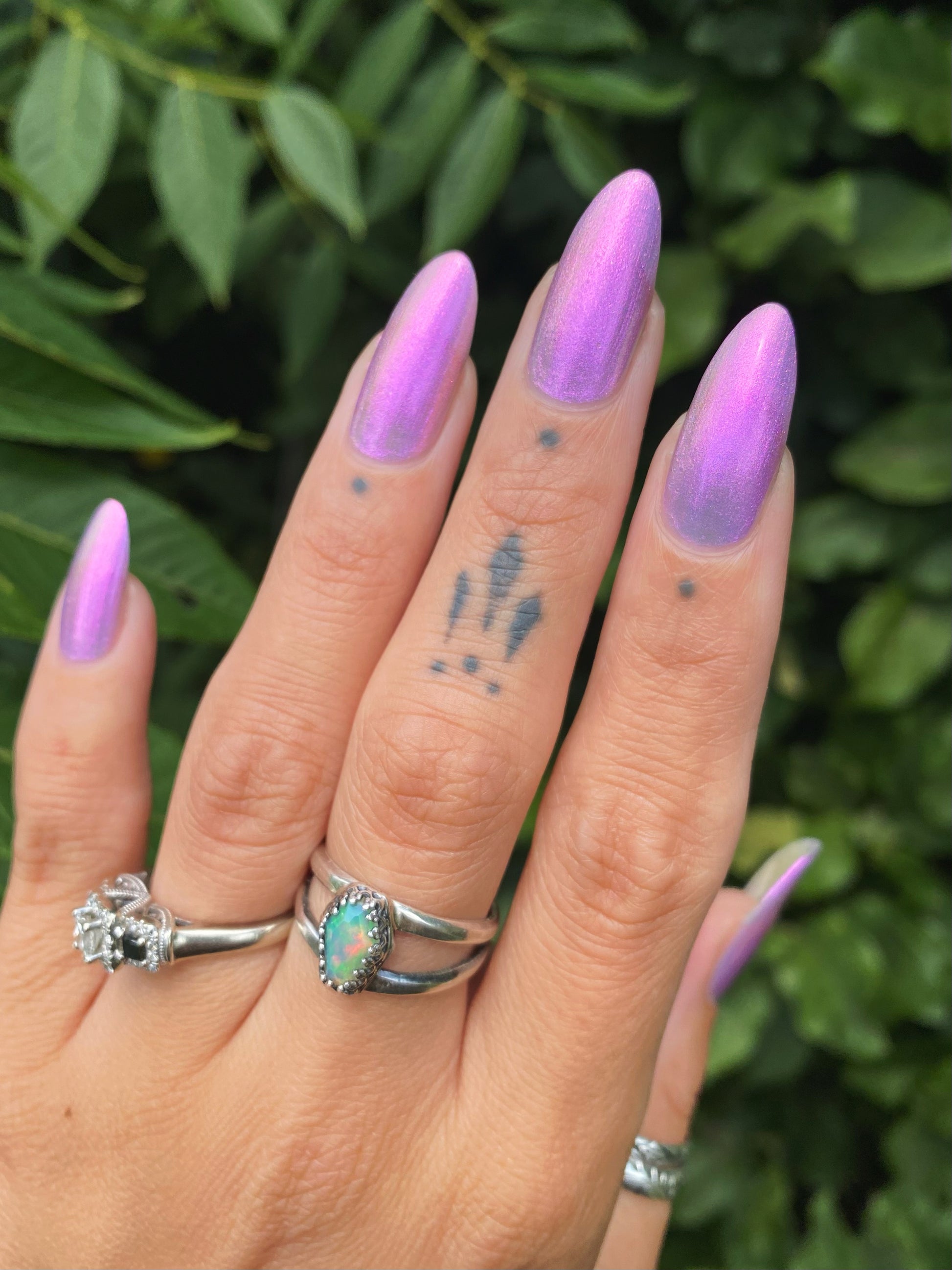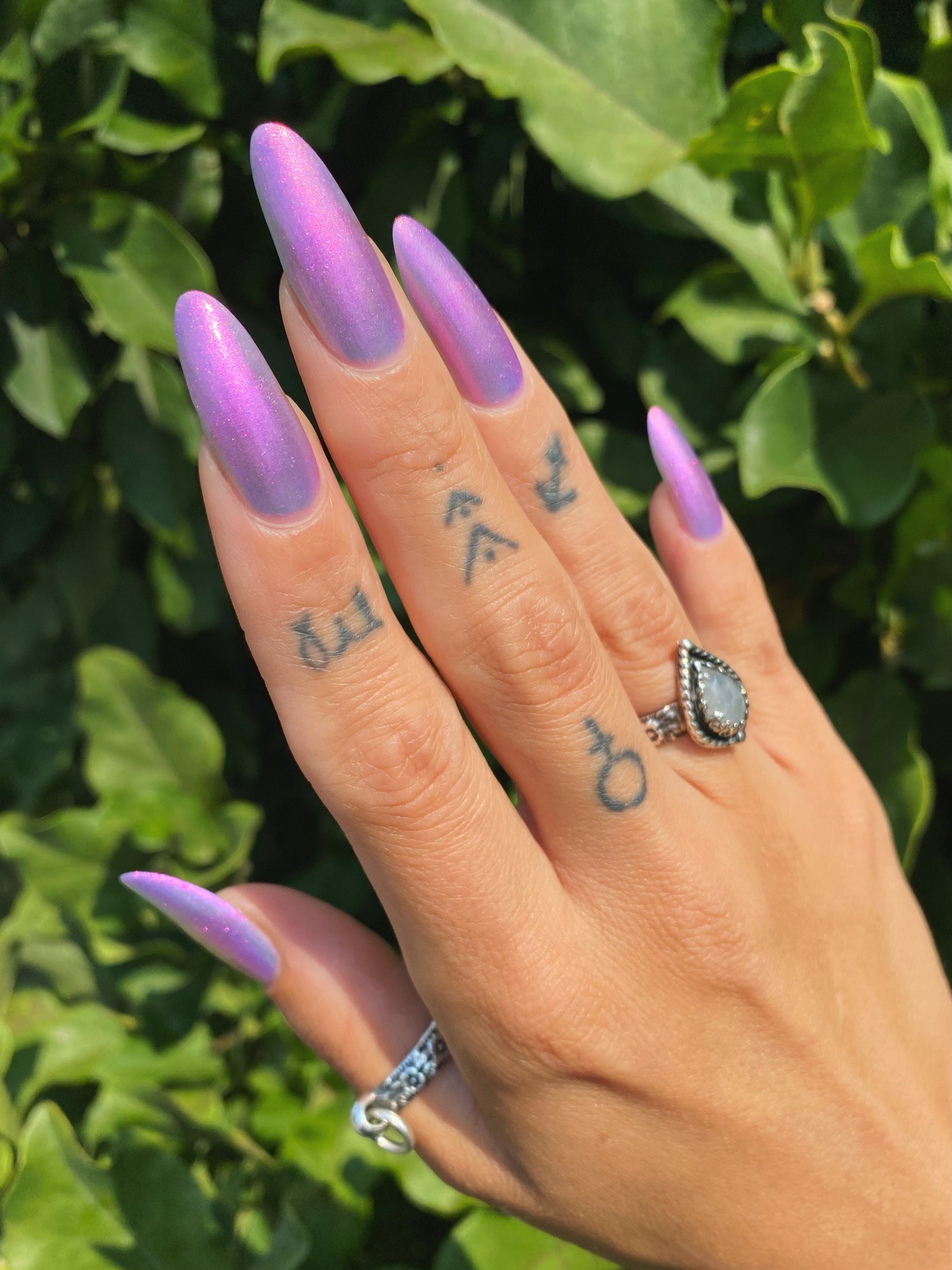 A sheer violet jelly base packed with super shifty aurora pigment that shifts from pink to orange to gold