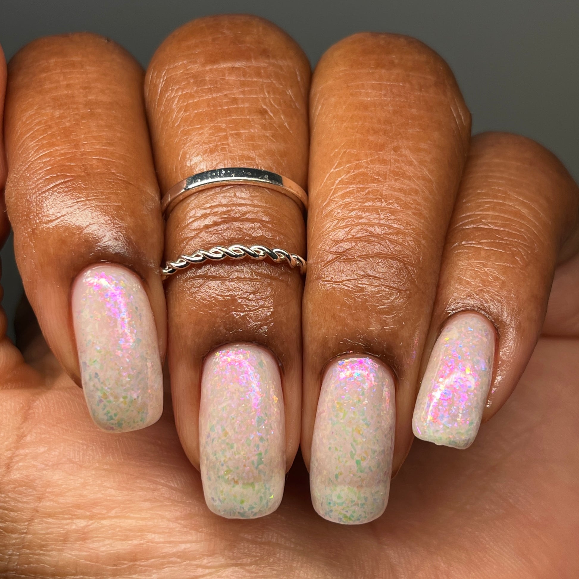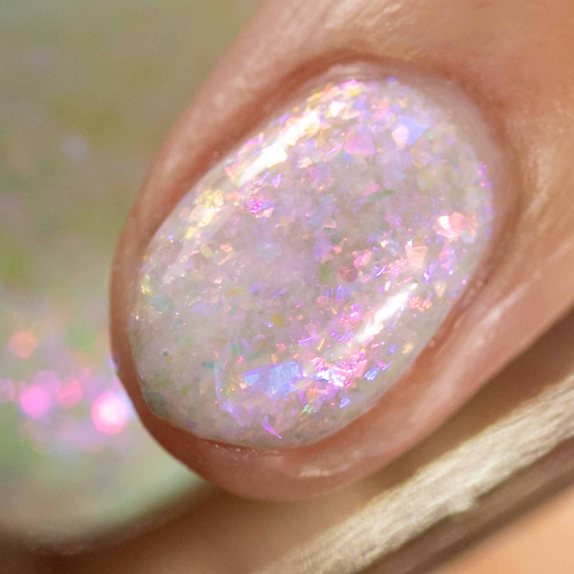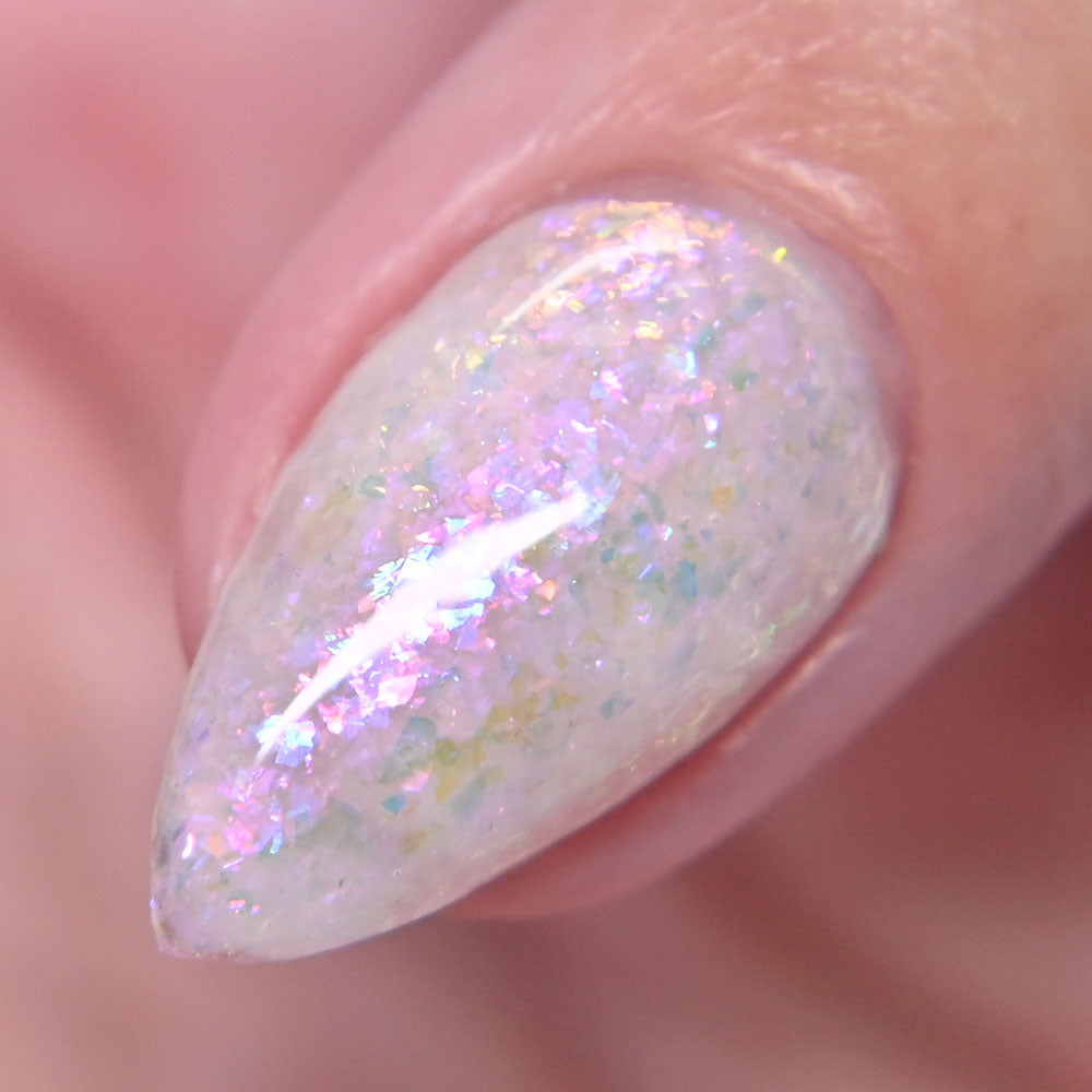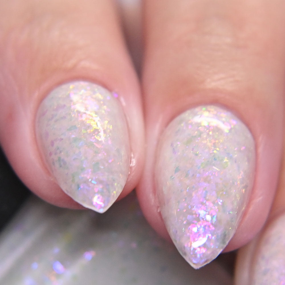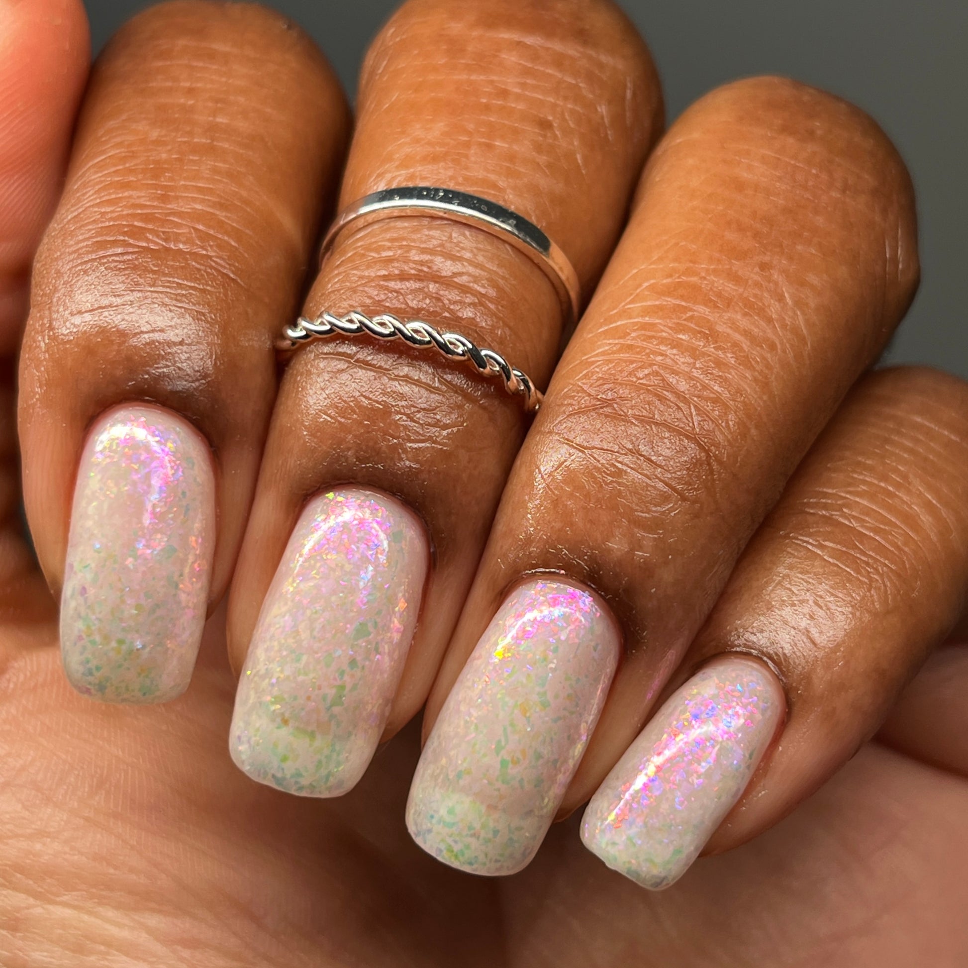 A semi-sheer white crelly base packed with a mixture of iridescent flakies in shades of blue, purple, pink, and orange, with hints of gold and green at extremes.