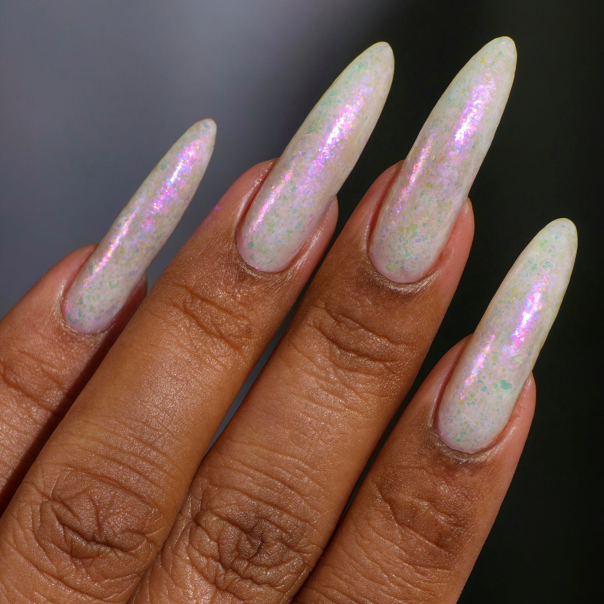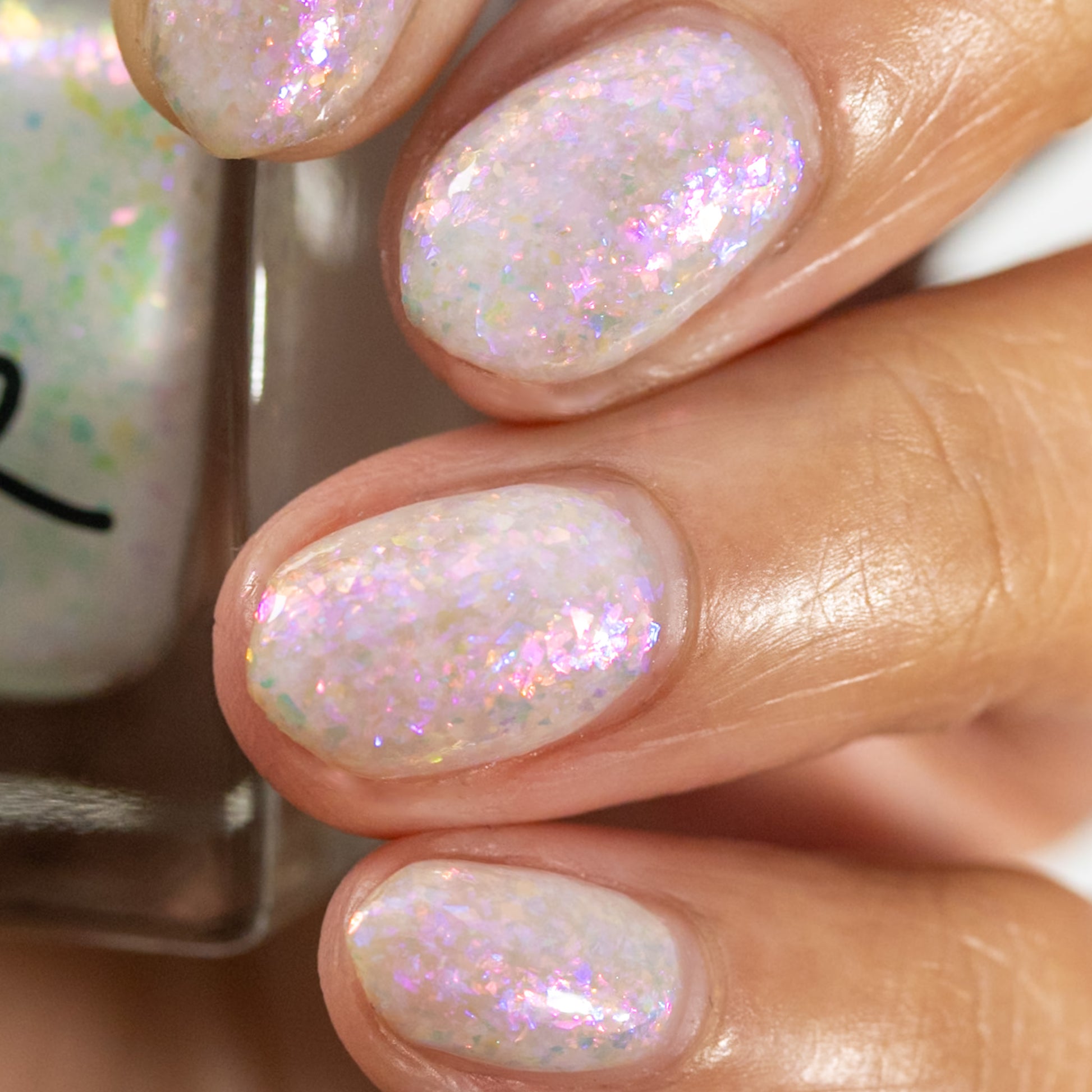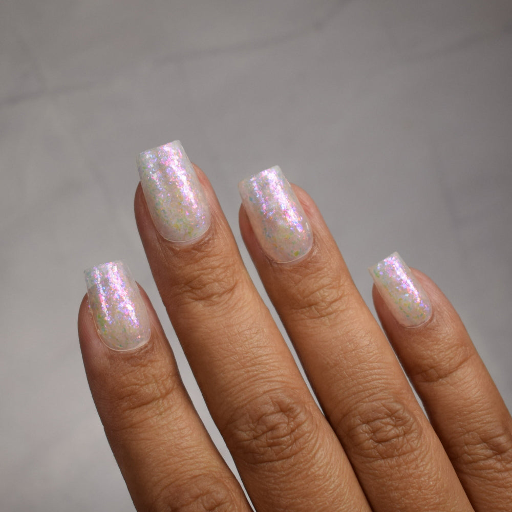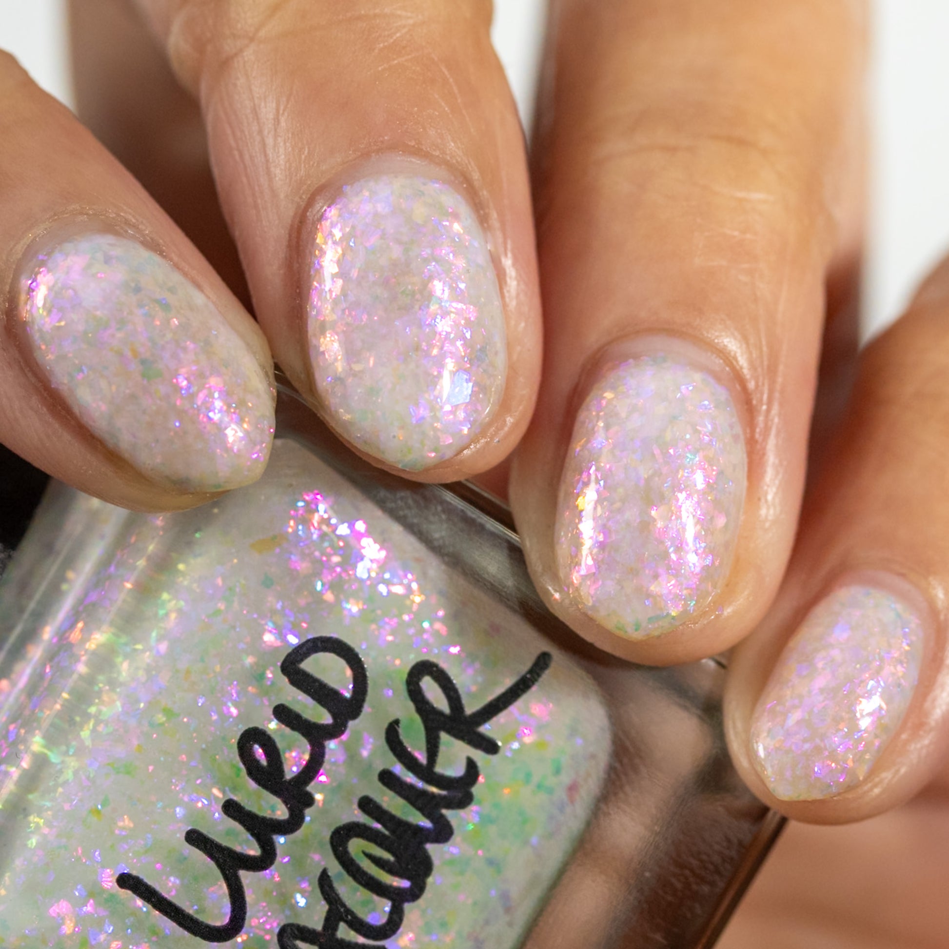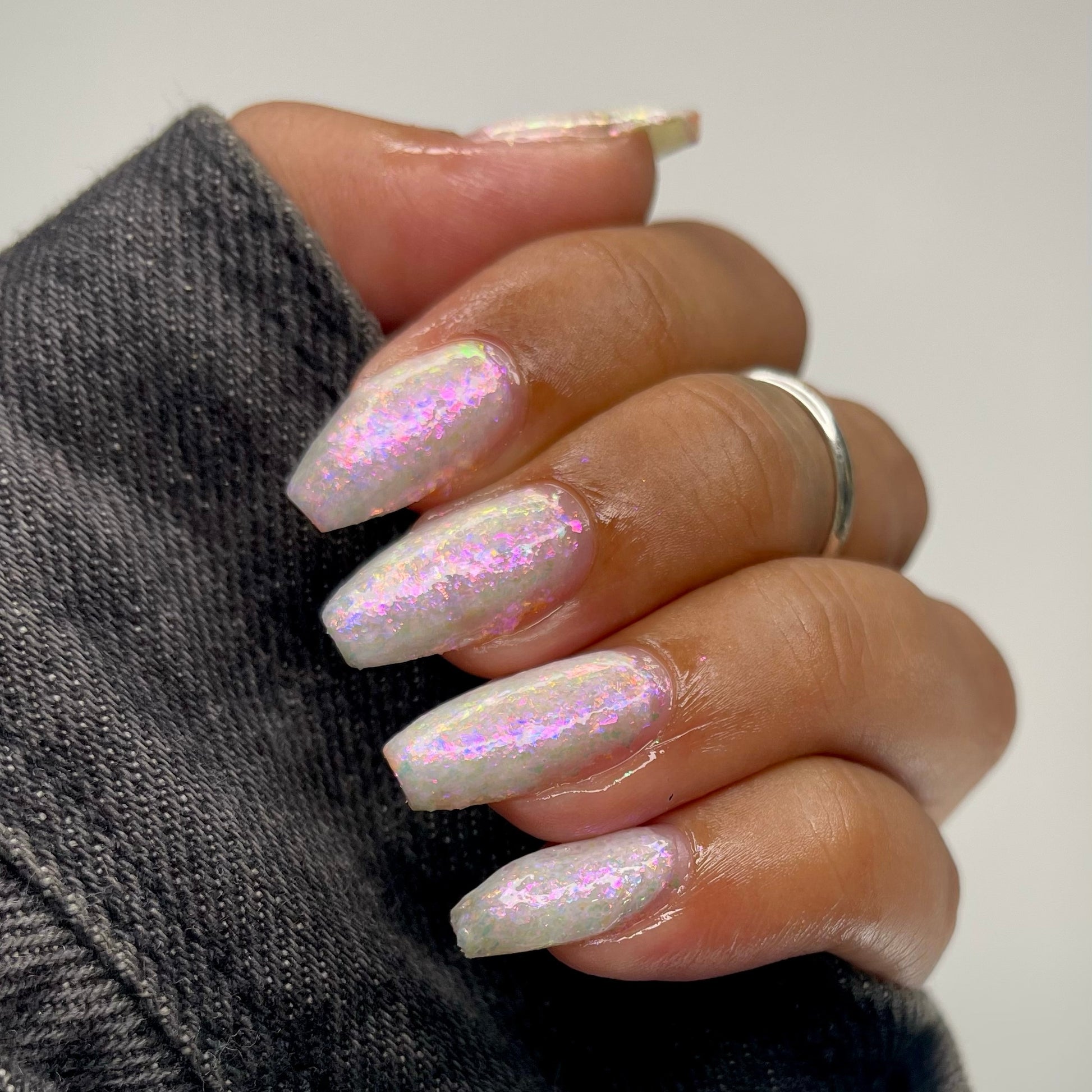 A semi-sheer white crelly base packed with a mixture of iridescent flakies in shades of blue, purple, pink, and orange, with hints of gold and green at extremes.