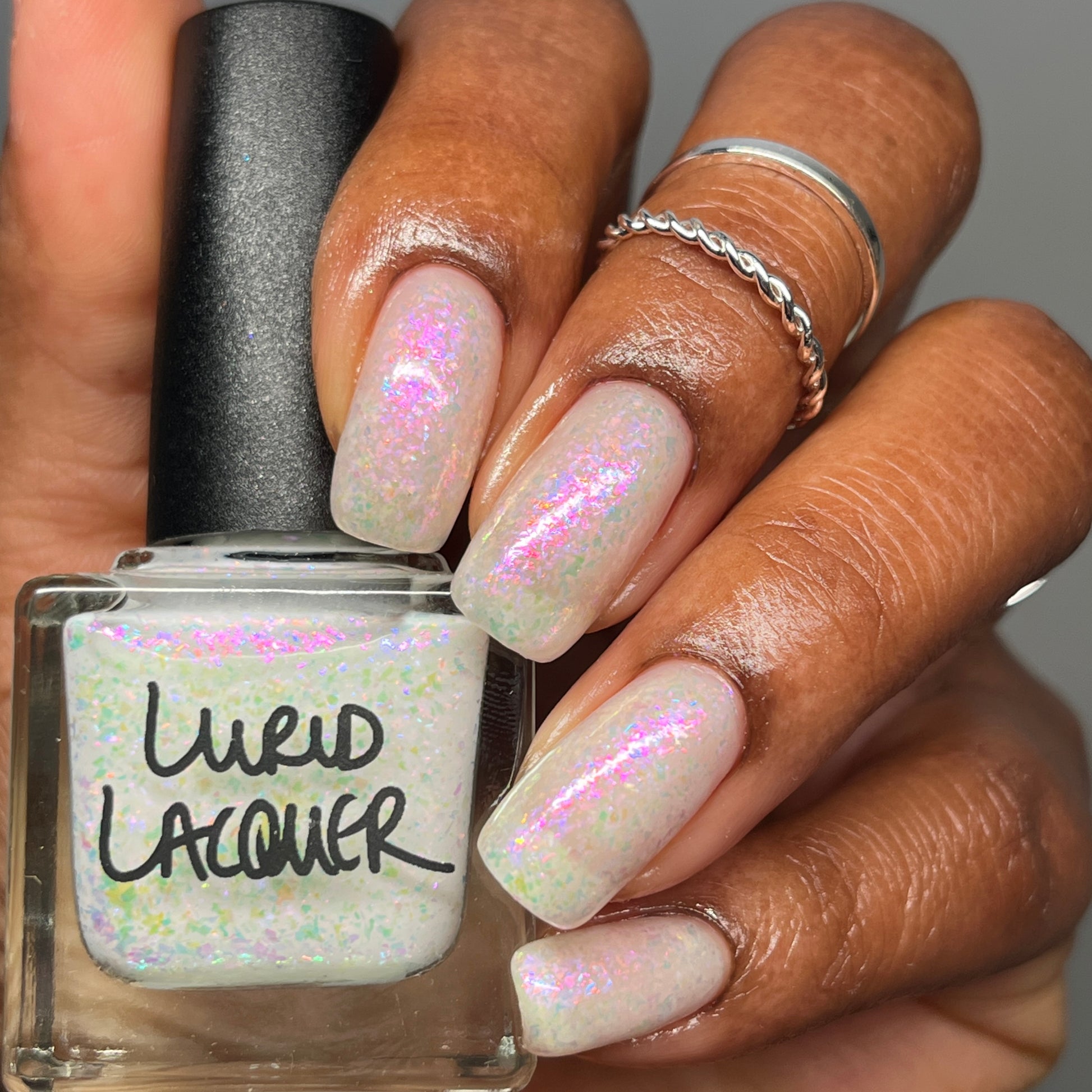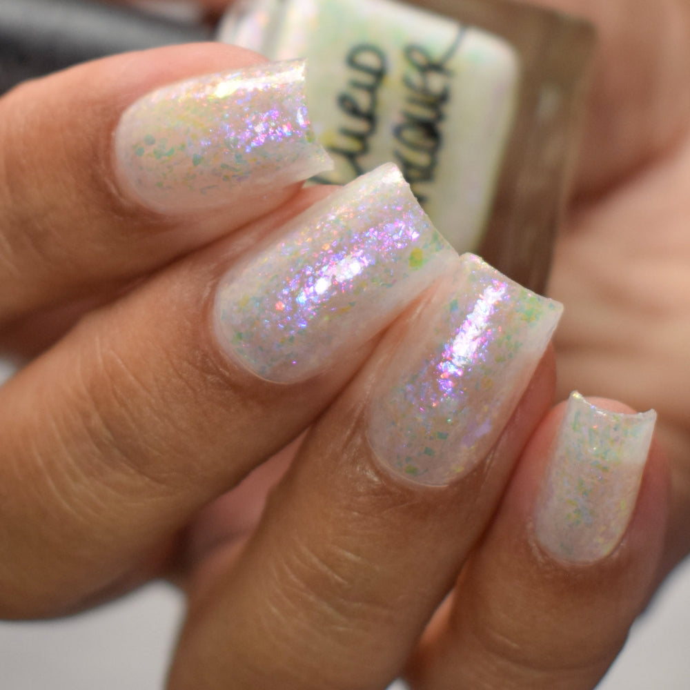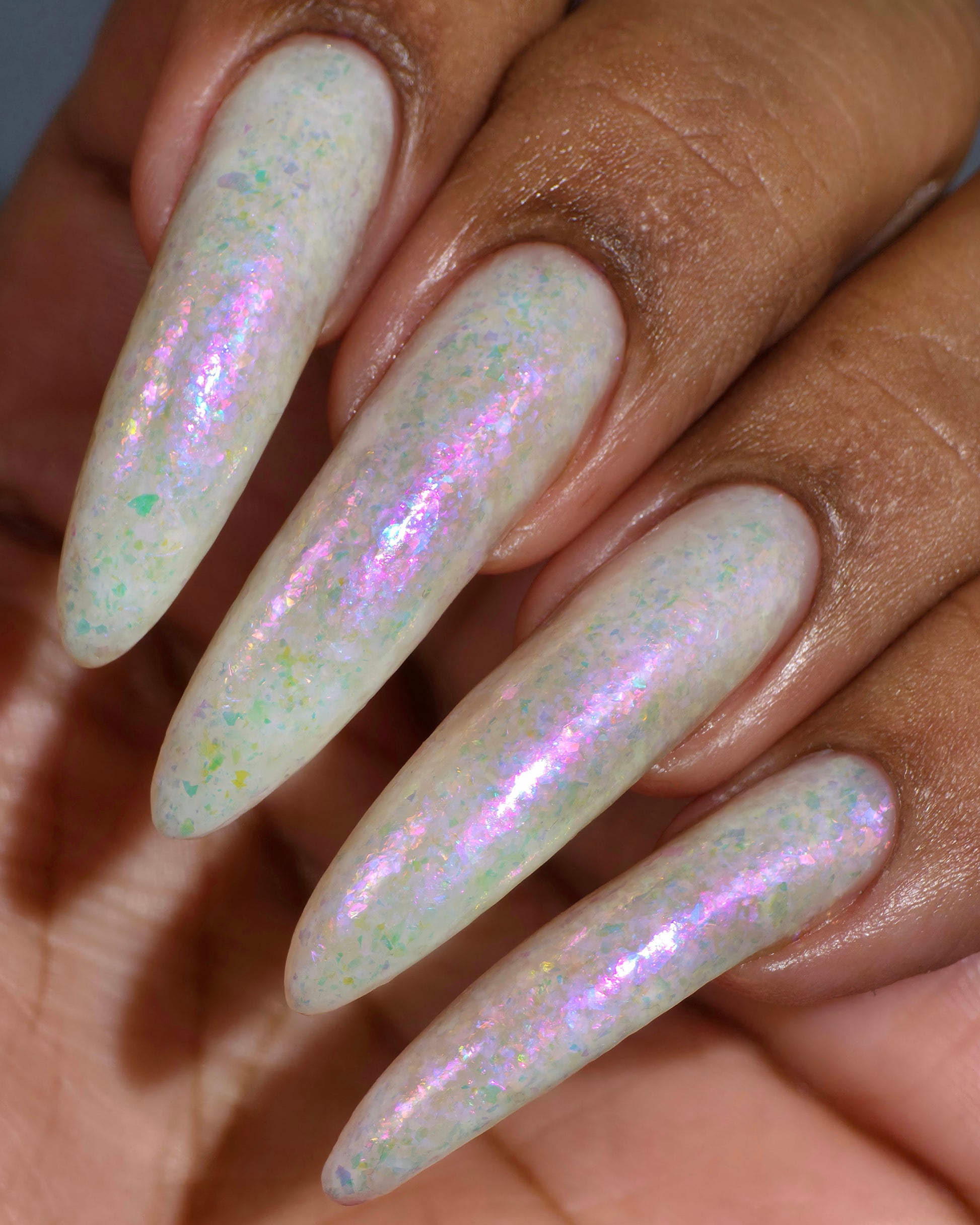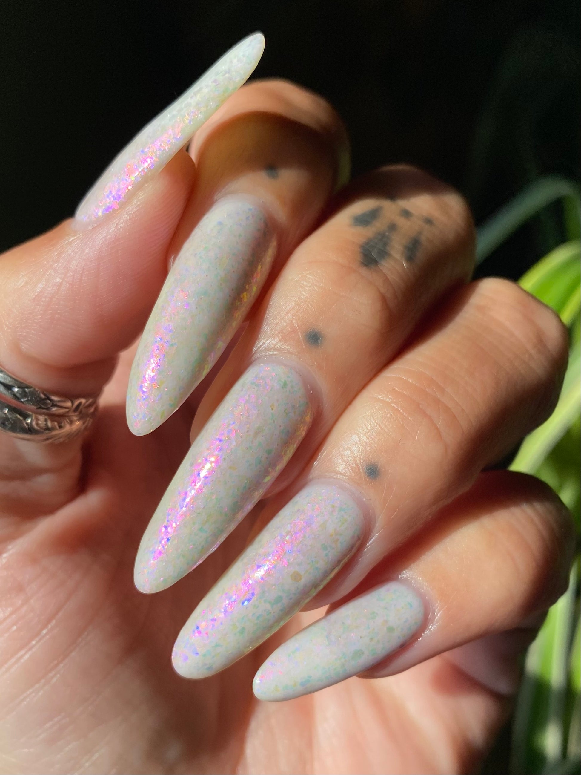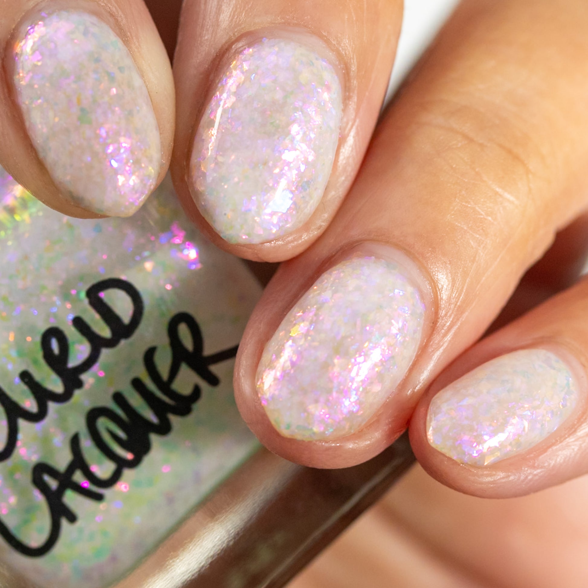 A semi-sheer white crelly base packed with a mixture of iridescent flakies in shades of blue, purple, pink, and orange, with hints of gold and green at extremes.