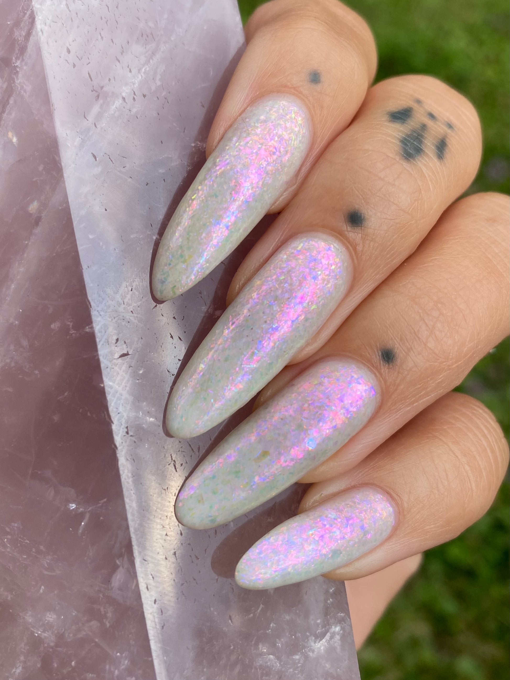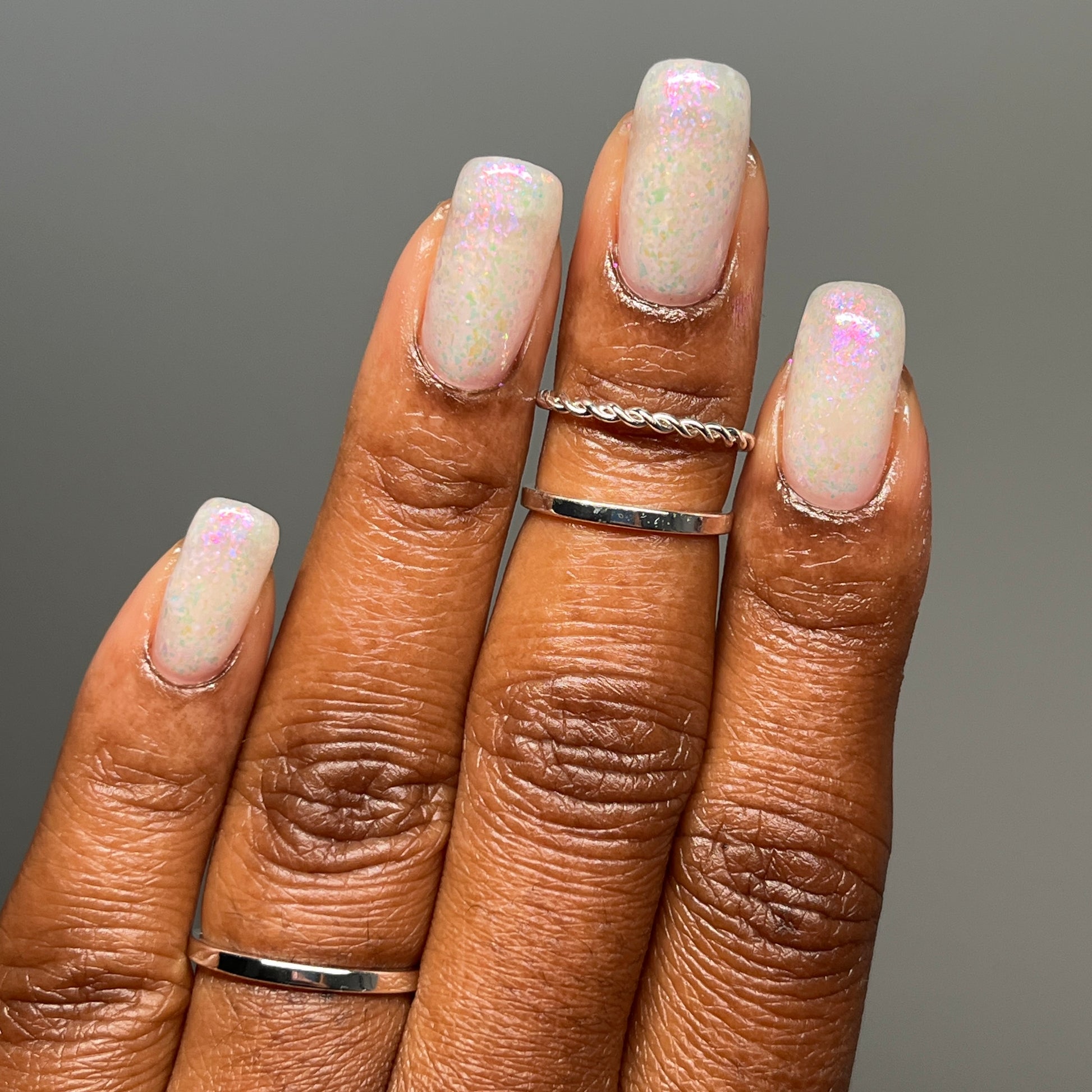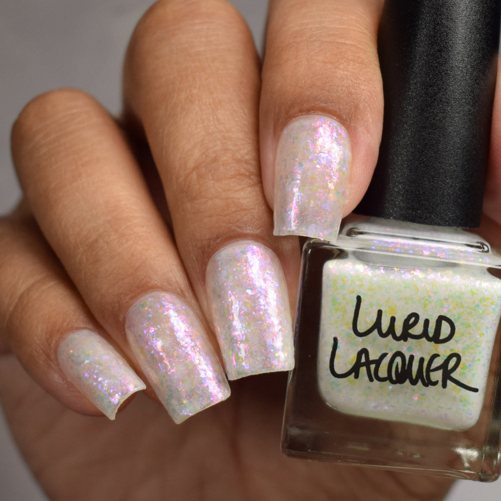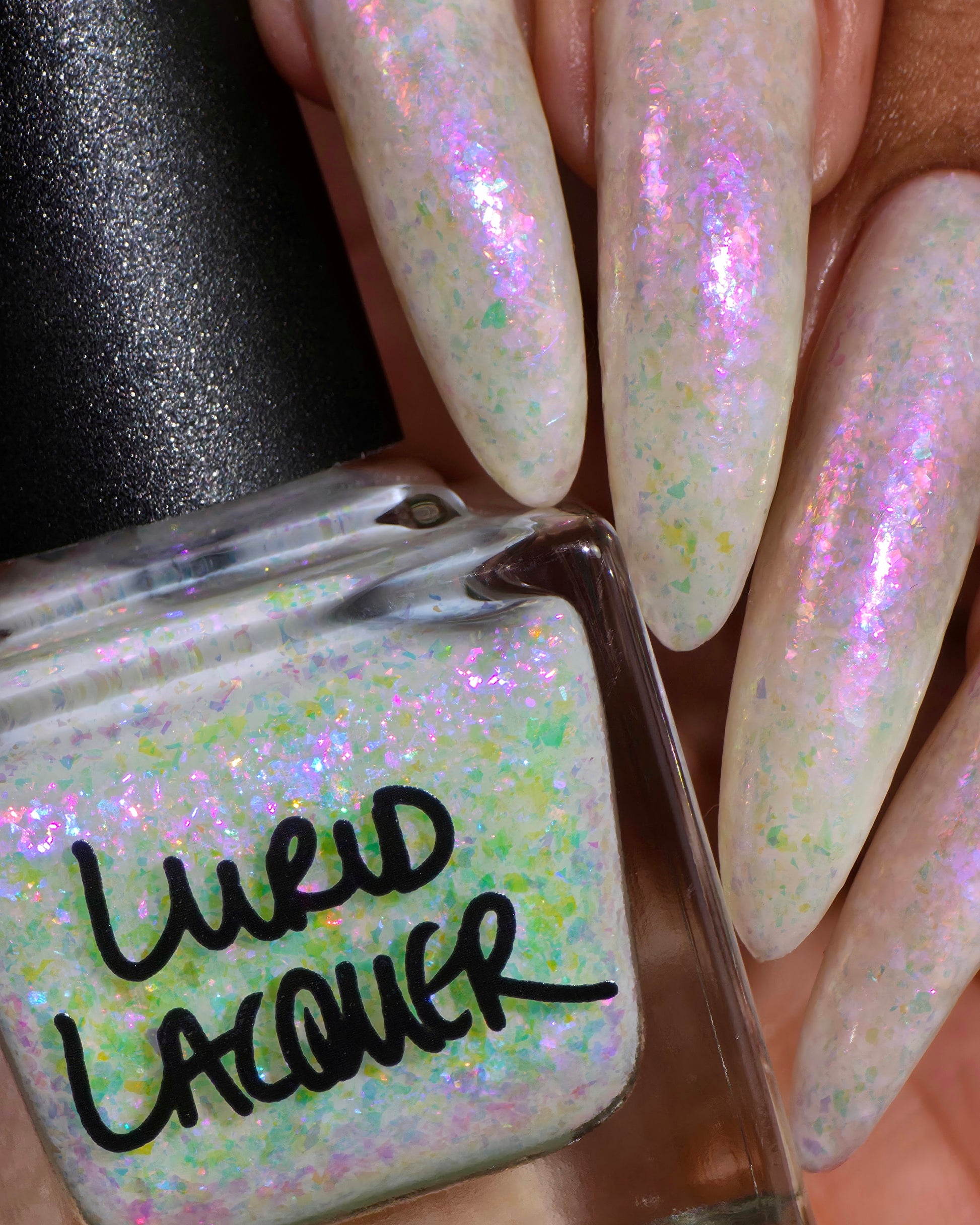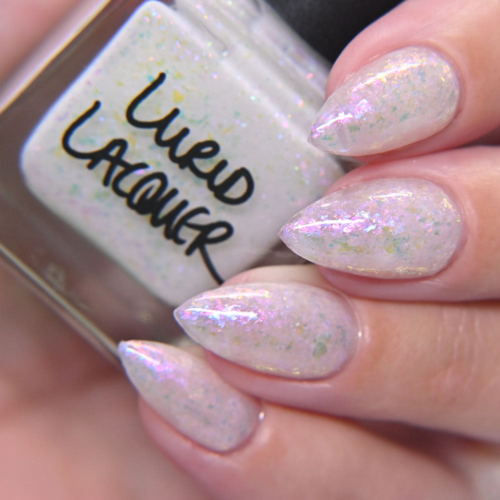 A semi-sheer white crelly base packed with a mixture of iridescent flakies in shades of blue, purple, pink, and orange, with hints of gold and green at extremes.