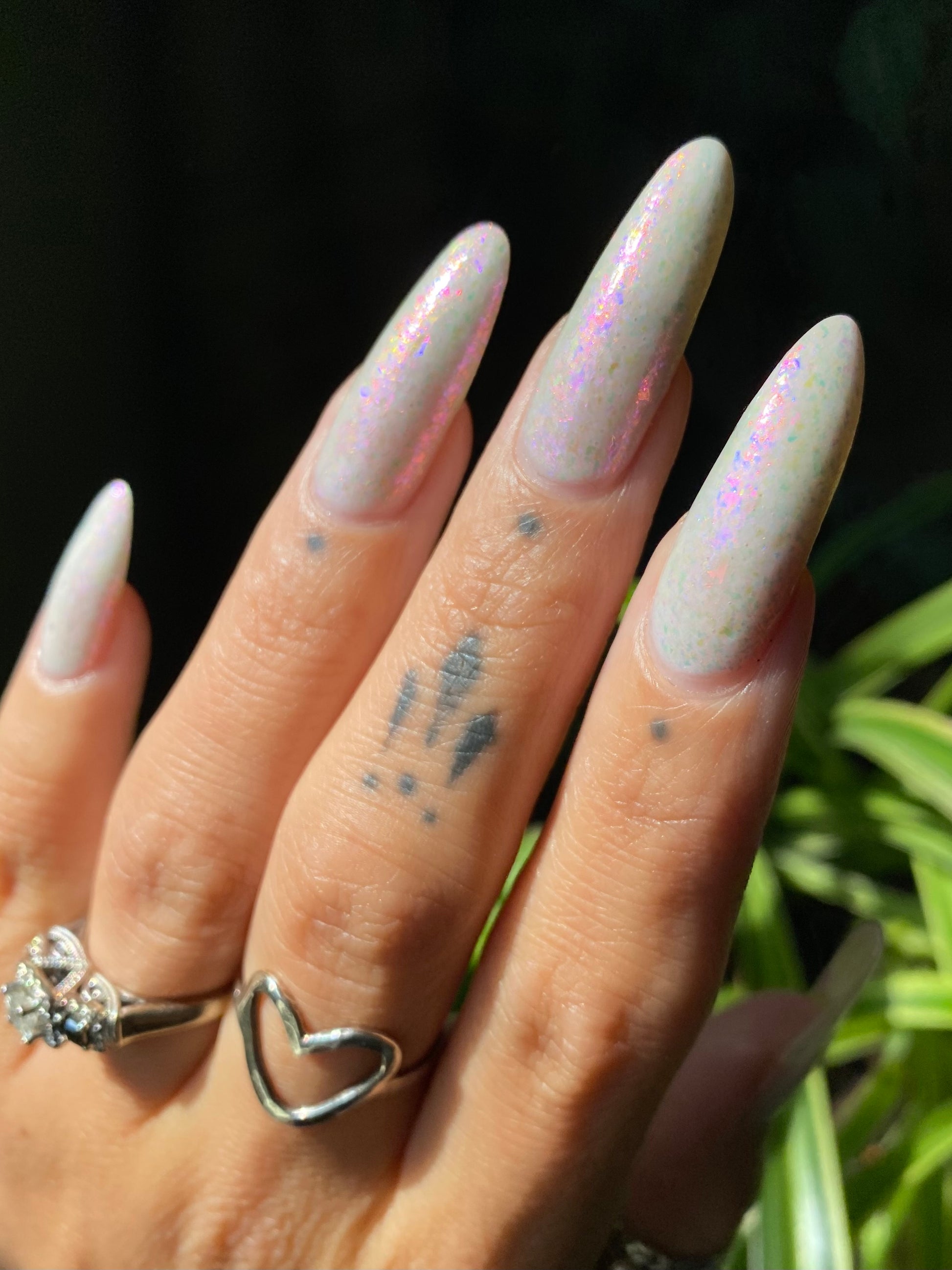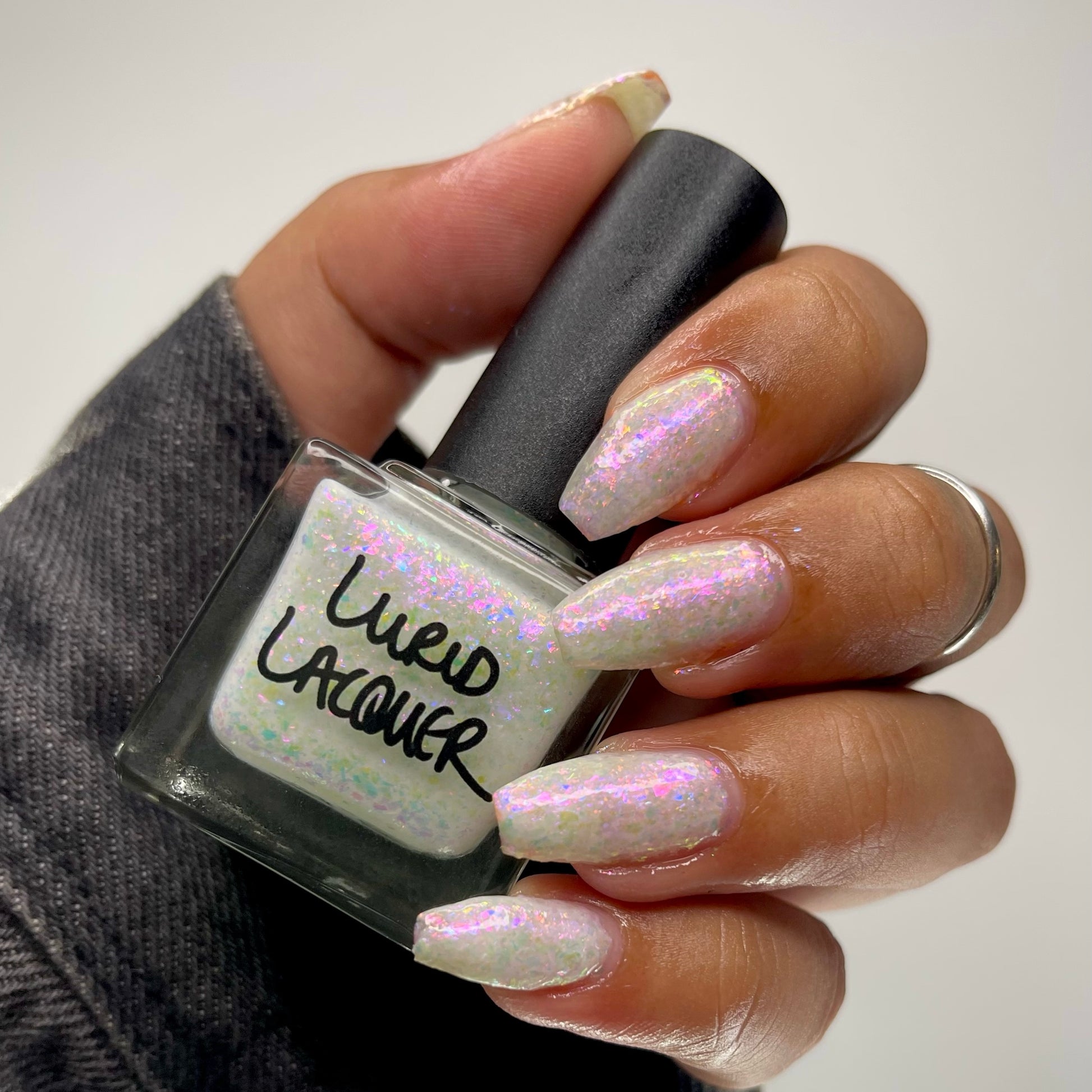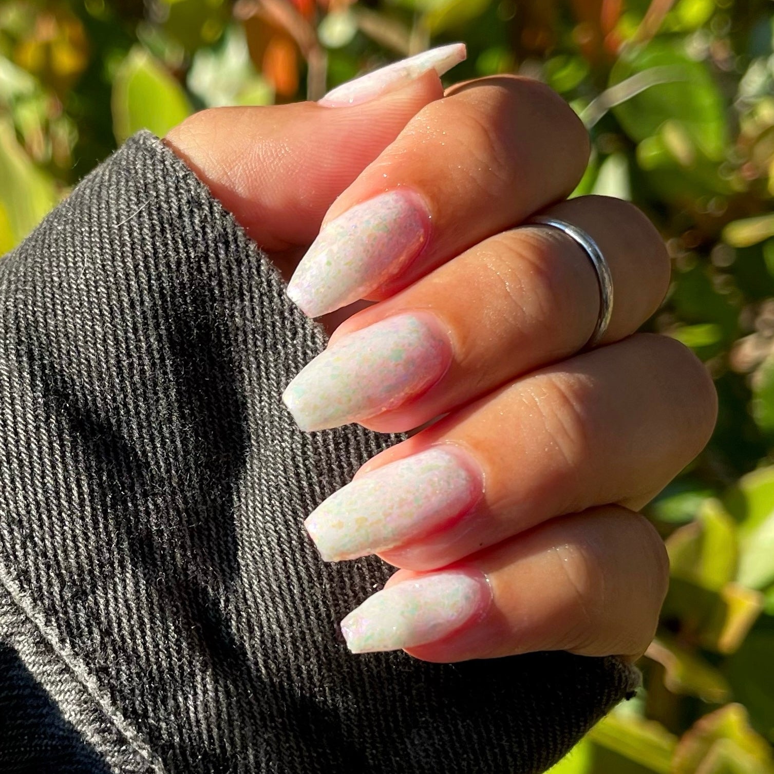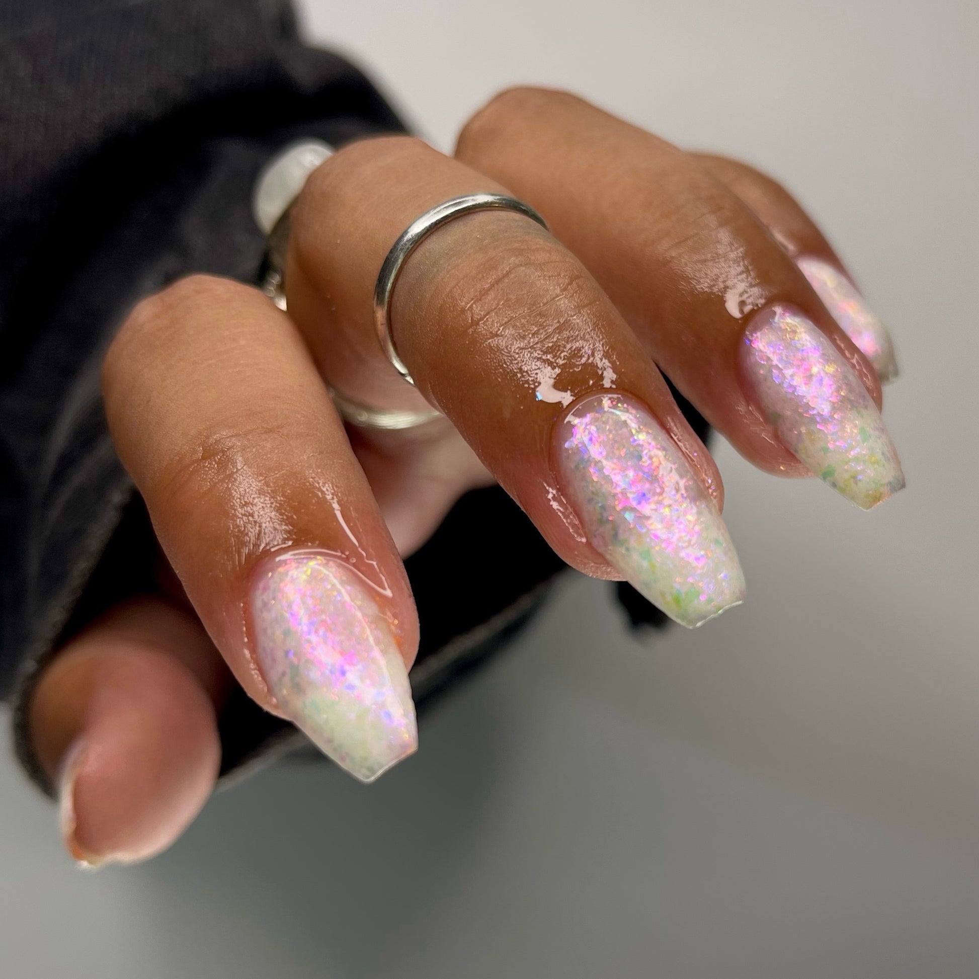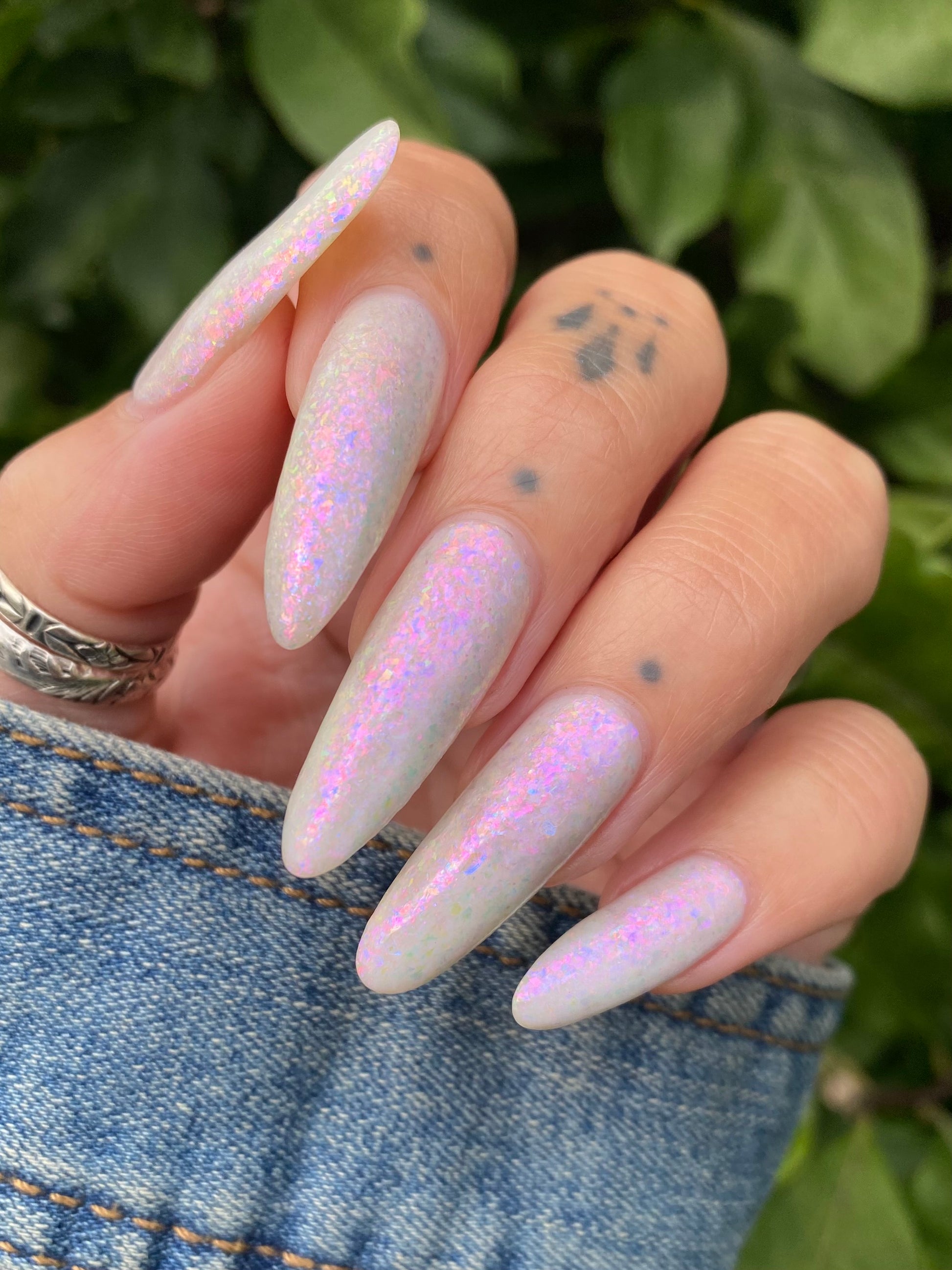 A semi-sheer white crelly base packed with a mixture of iridescent flakies in shades of blue, purple, pink, and orange, with hints of gold and green at extremes.