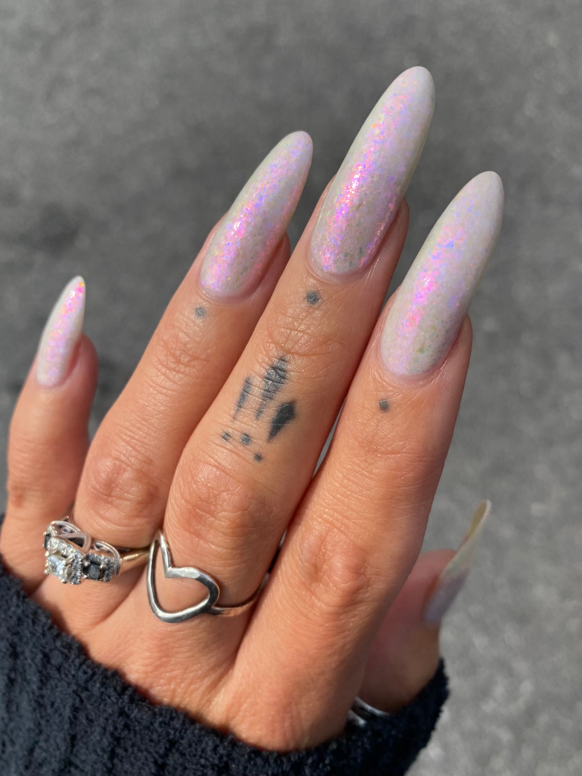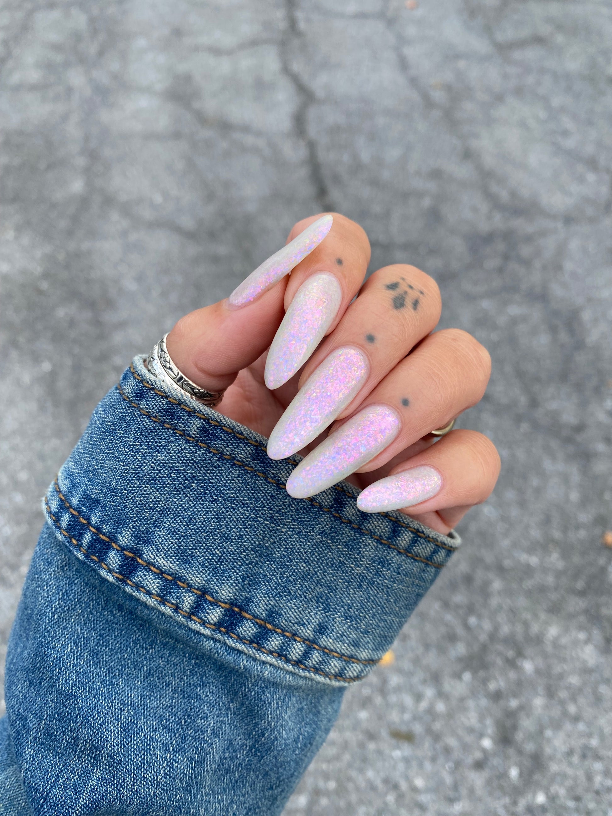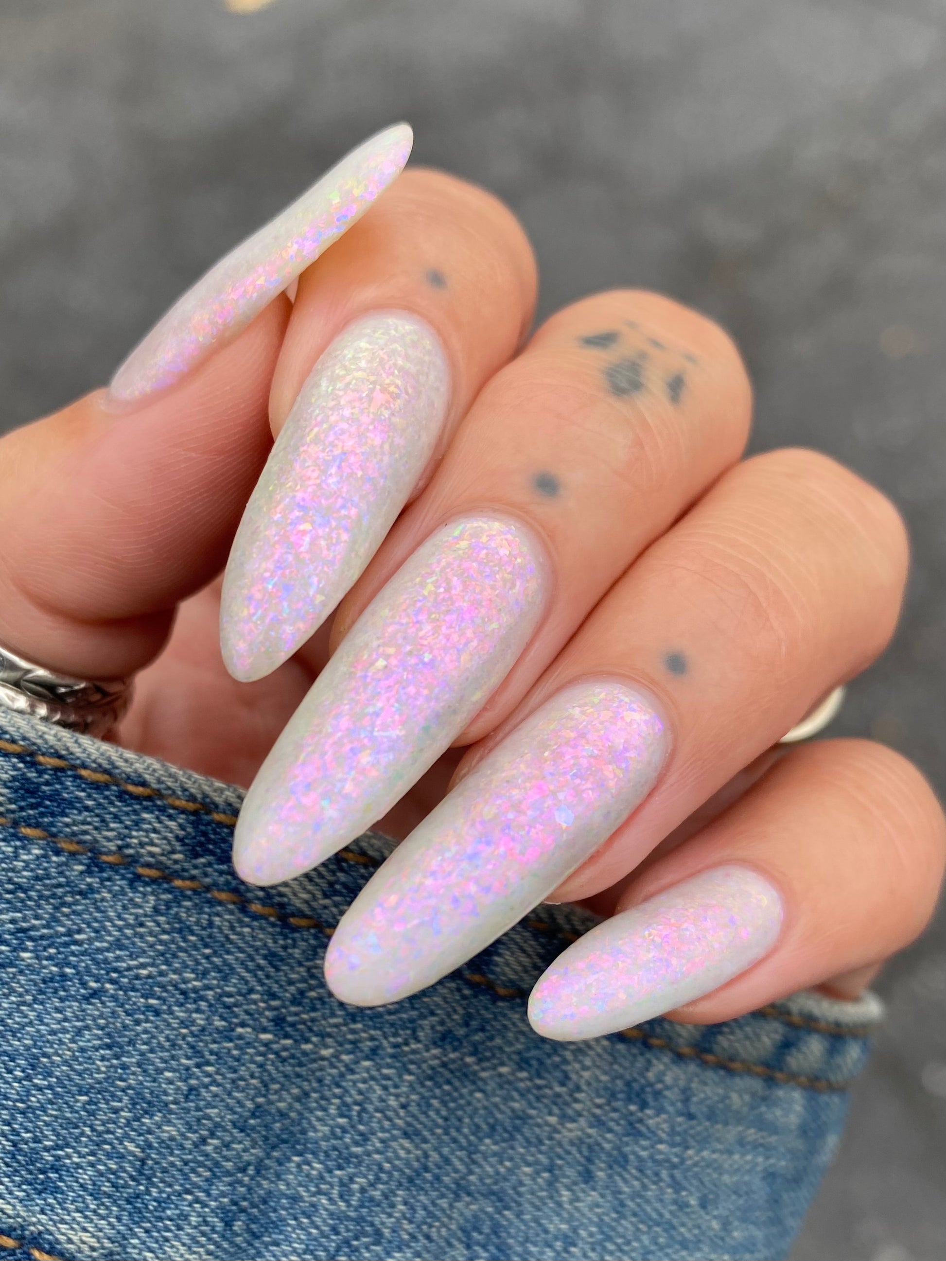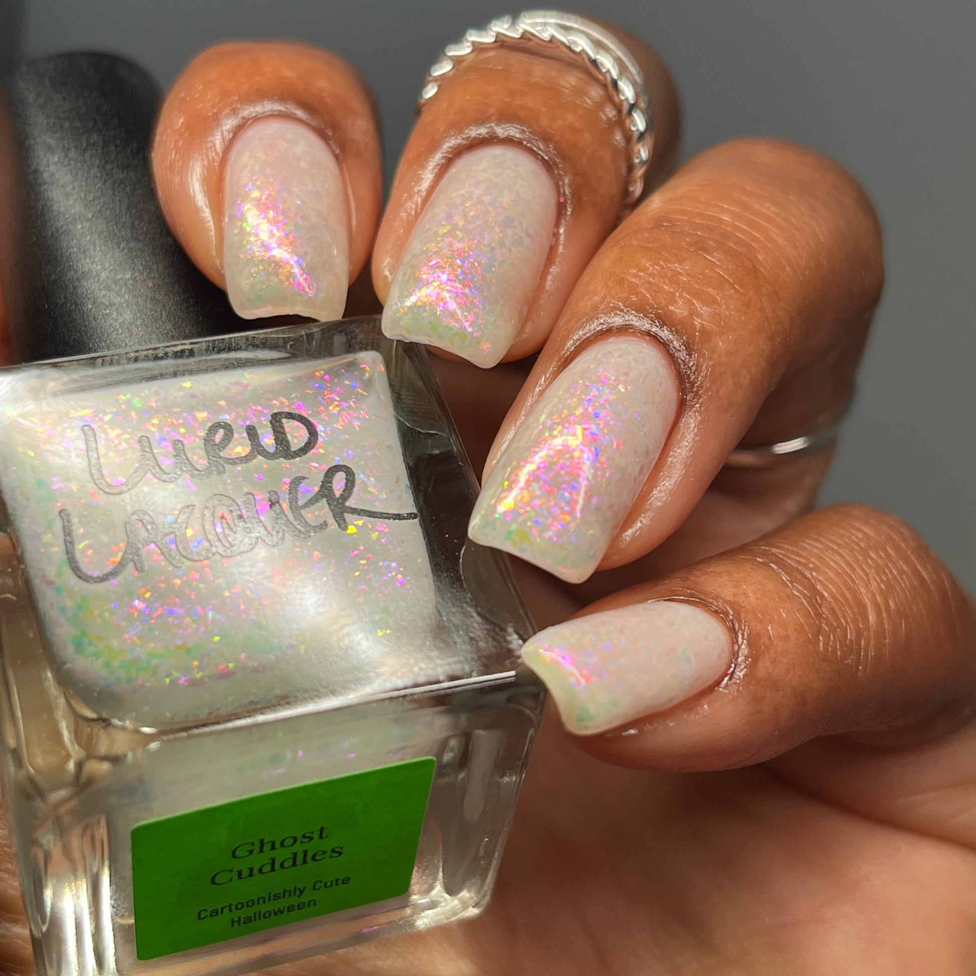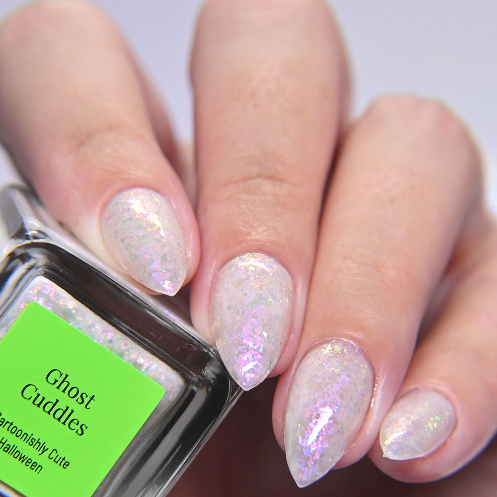 A semi-sheer white crelly base packed with a mixture of iridescent flakies in shades of blue, purple, pink, and orange, with hints of gold and green at extremes.