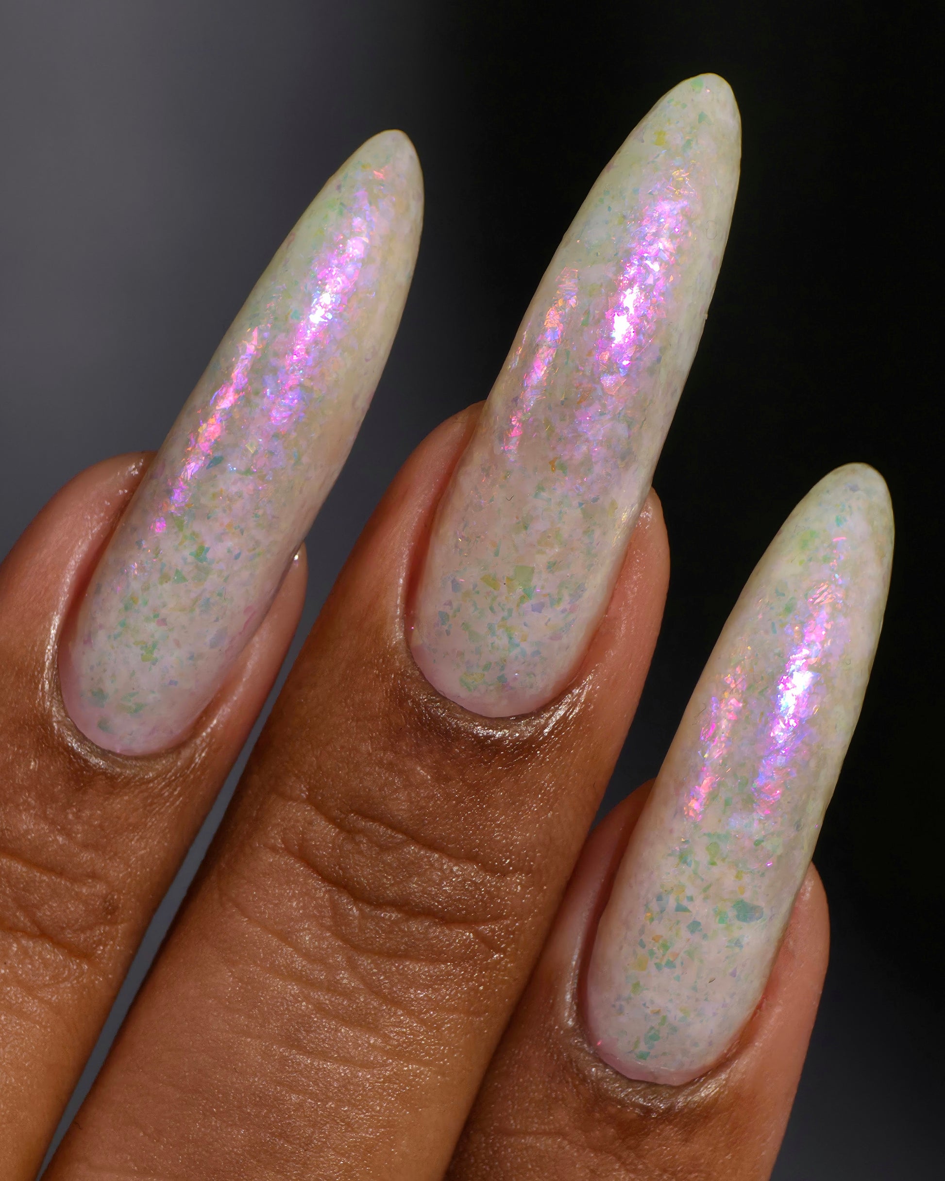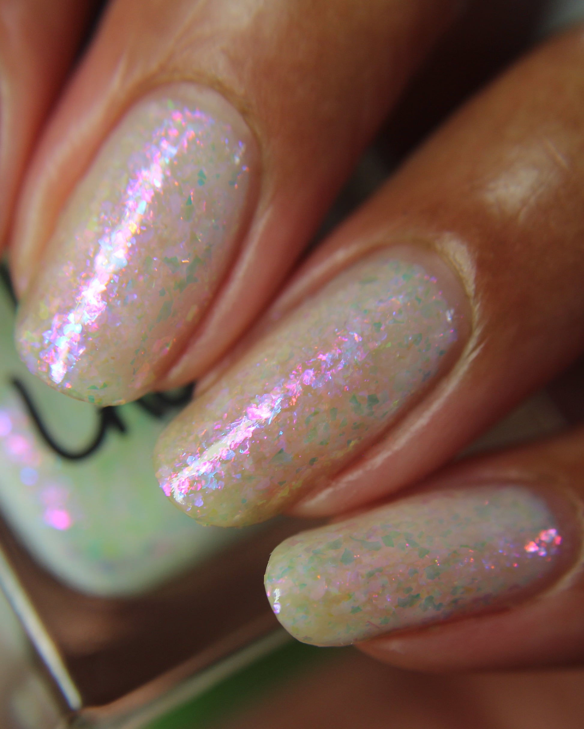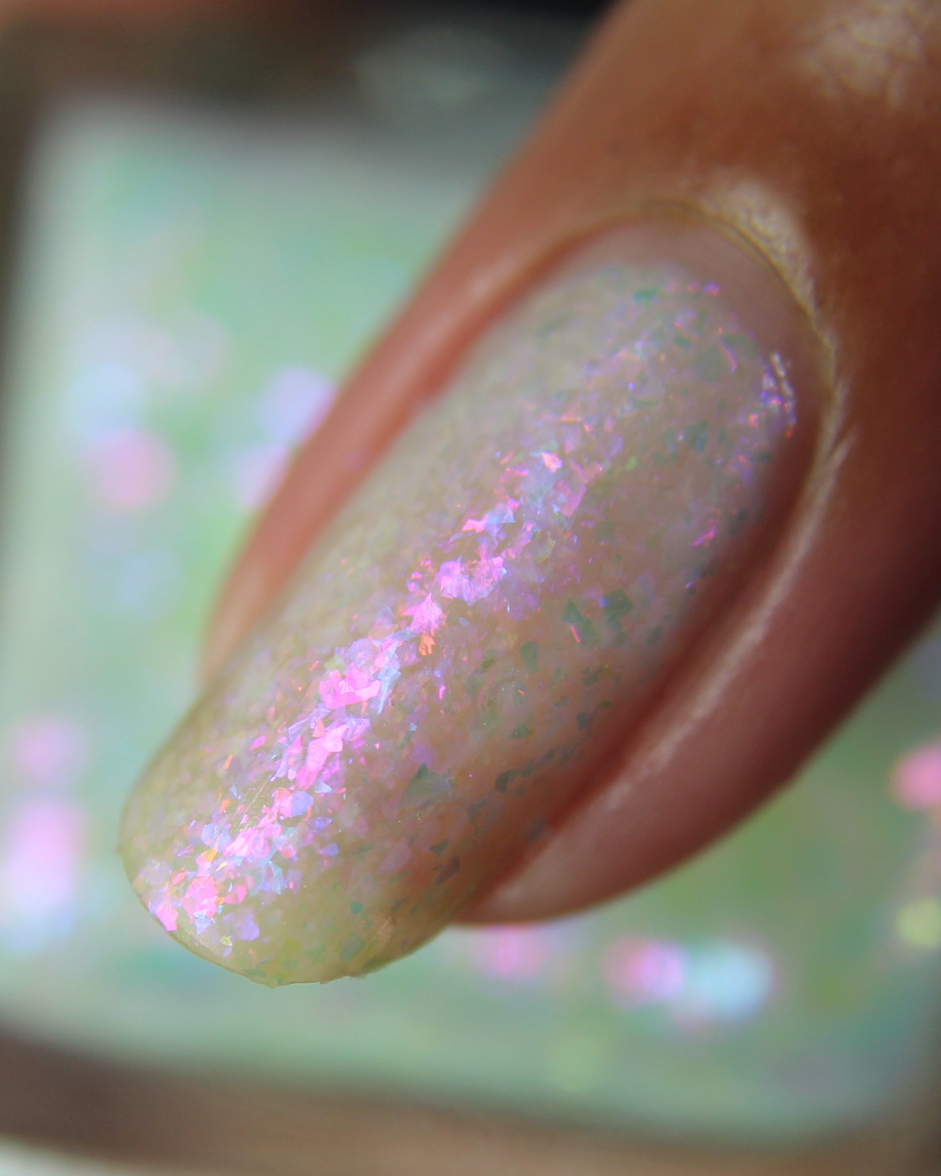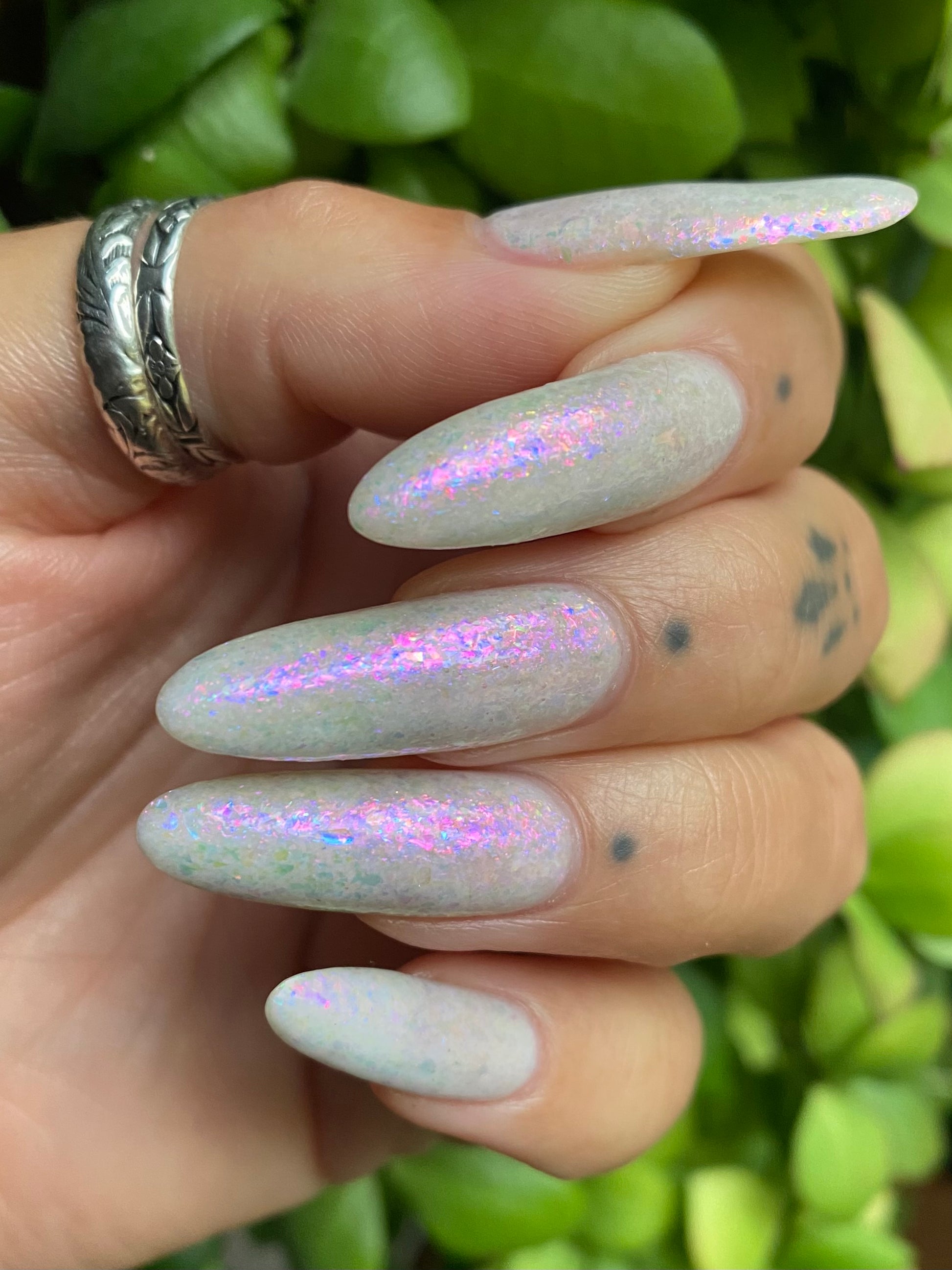 Please note: the iridescent flakies in this polish give it a textured finish. For the smoothest finish, after applying the polish, I recommend adding one coat of a glitter smoother/glitter grabber, and one coat of top coat.