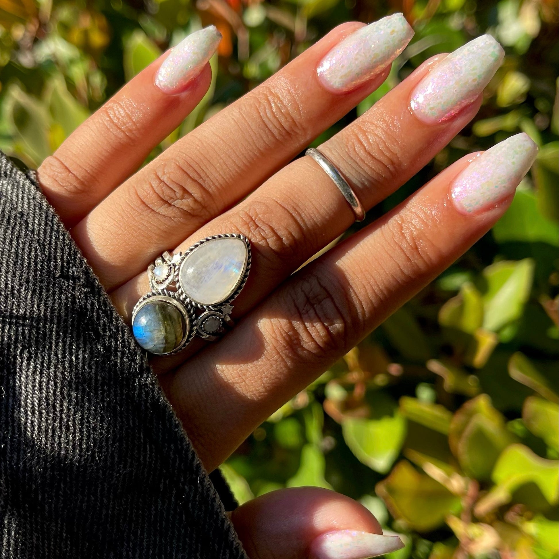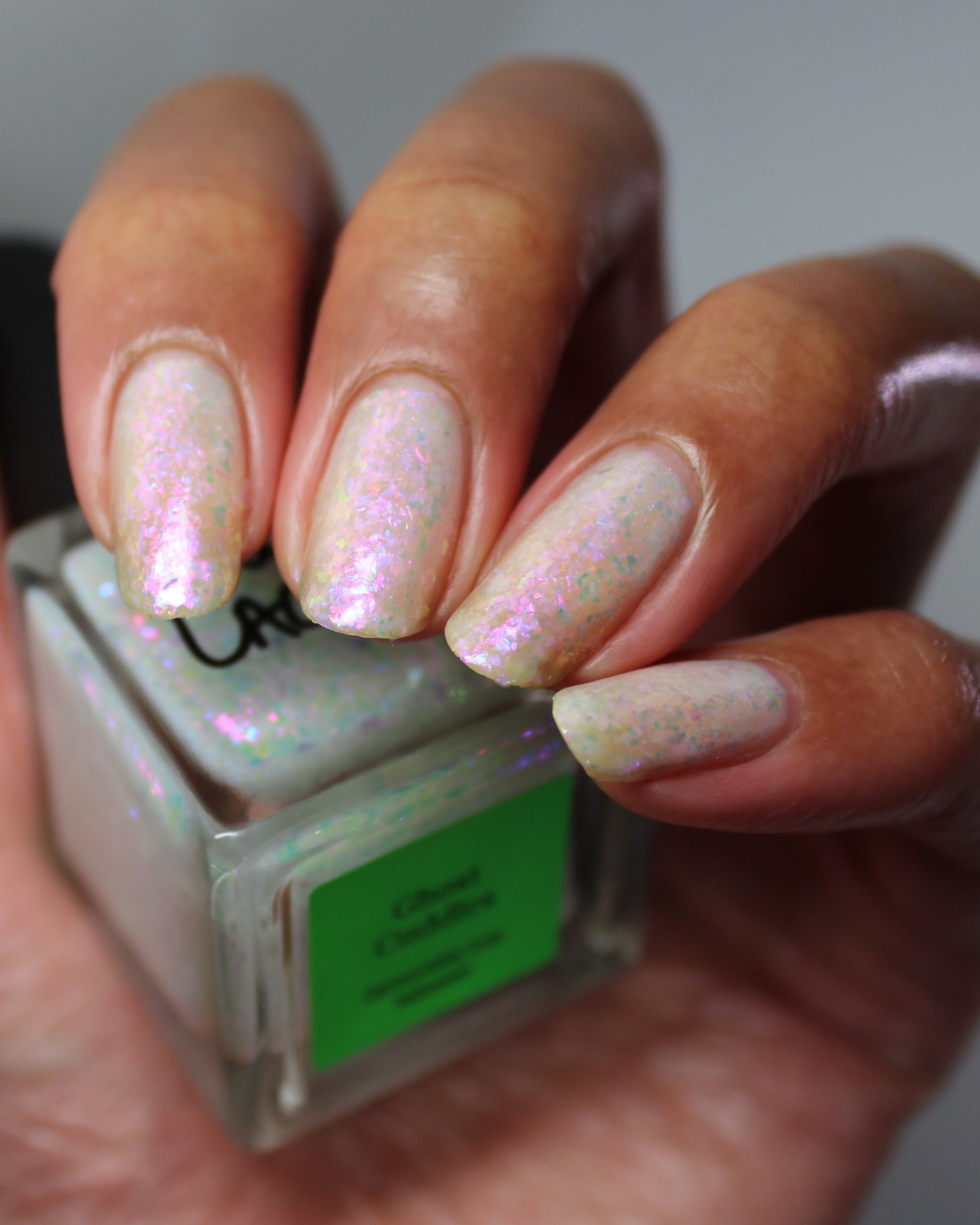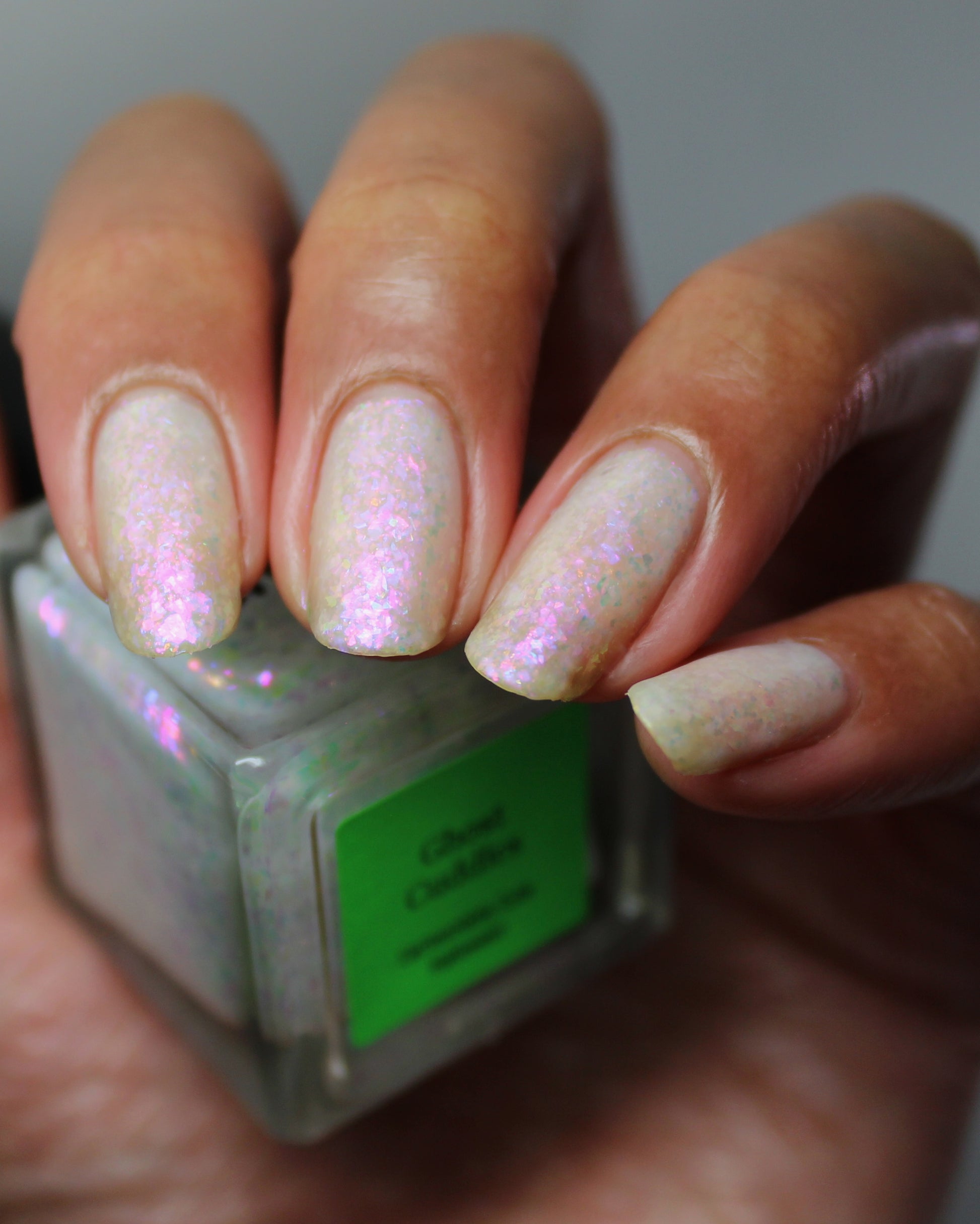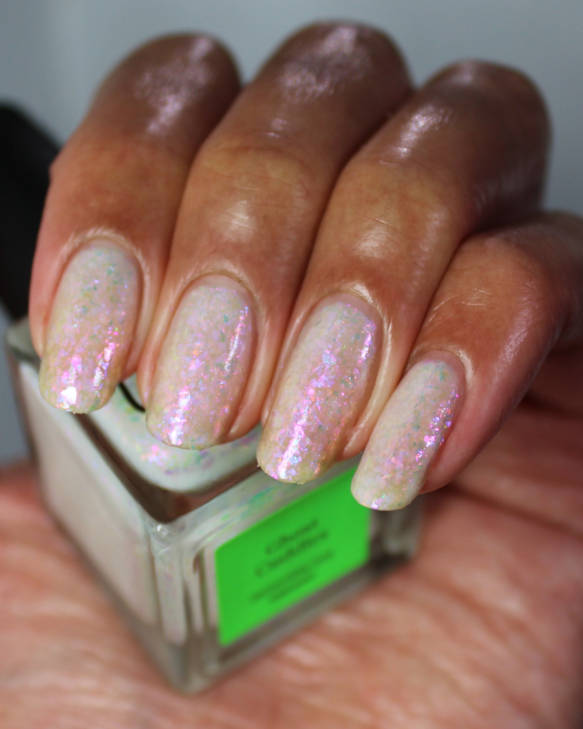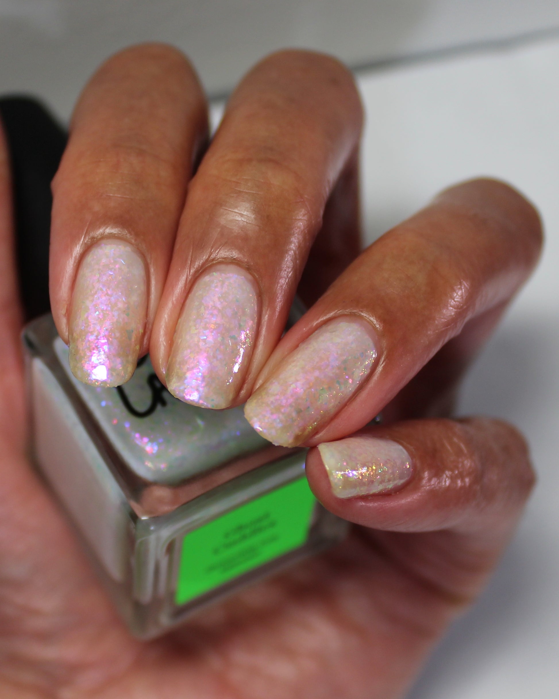 Please note: the iridescent flakies in this polish give it a textured finish. For the smoothest finish, after applying the polish, I recommend adding one coat of a glitter smoother/glitter grabber, and one coat of top coat.