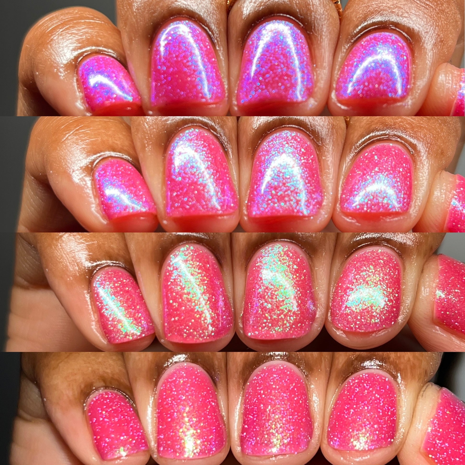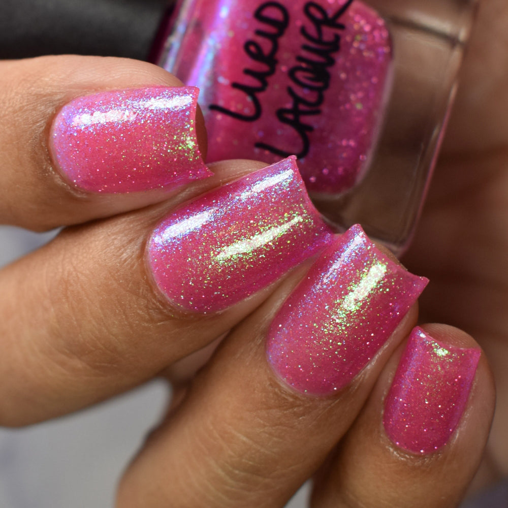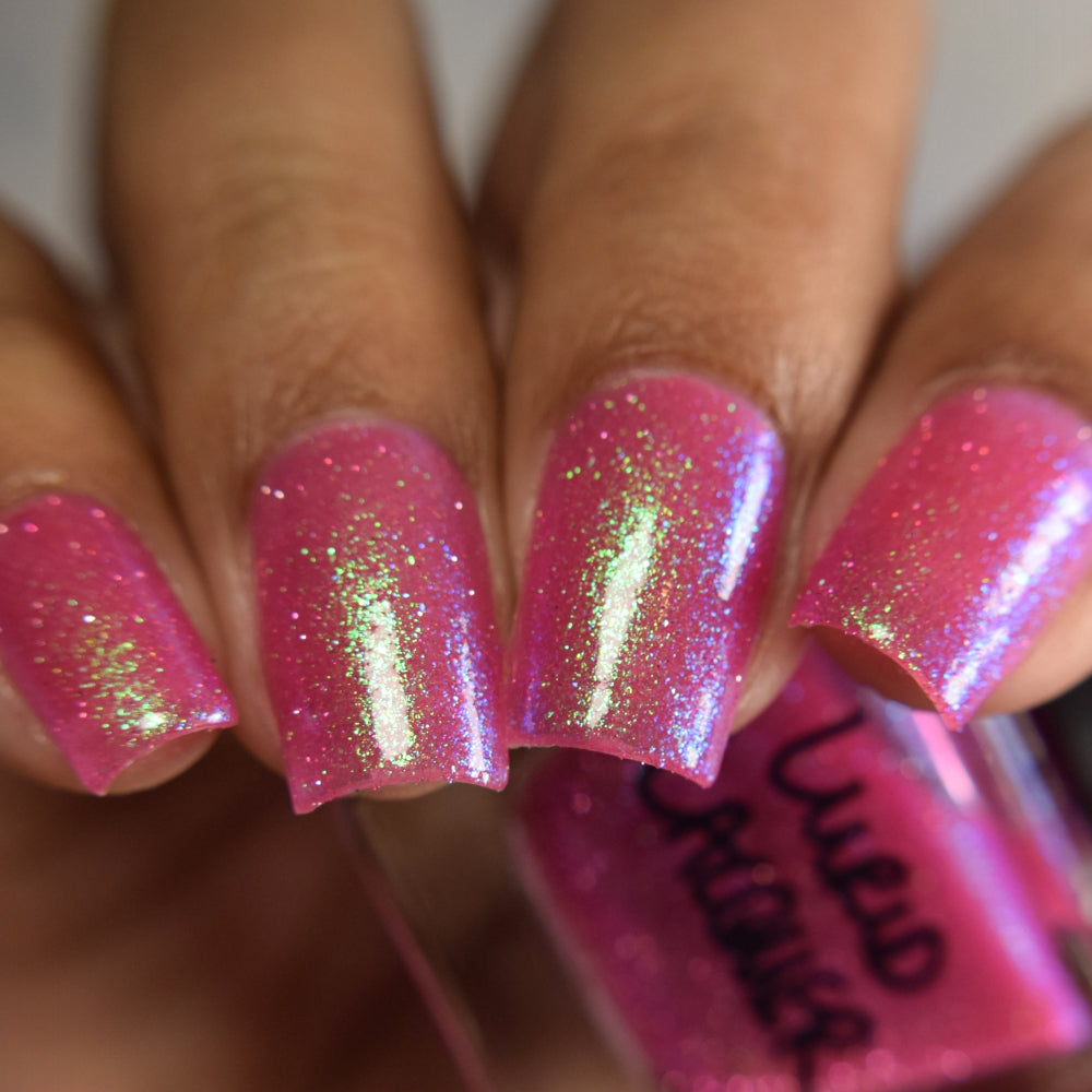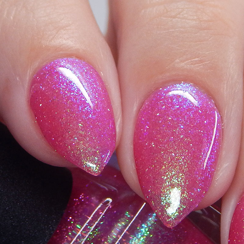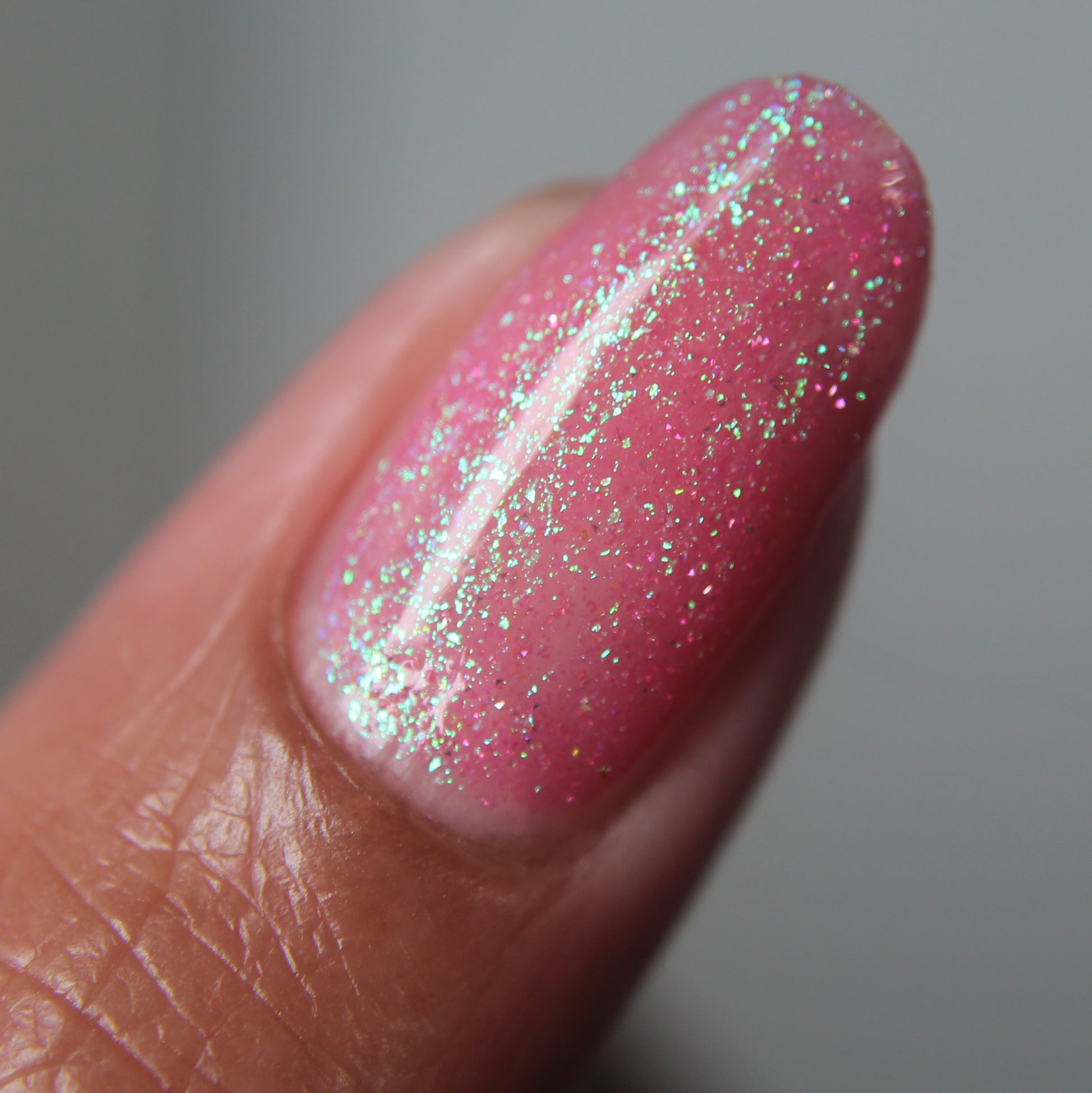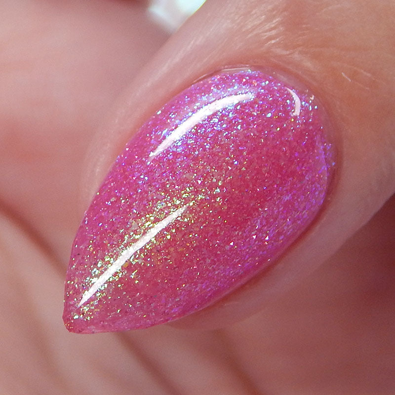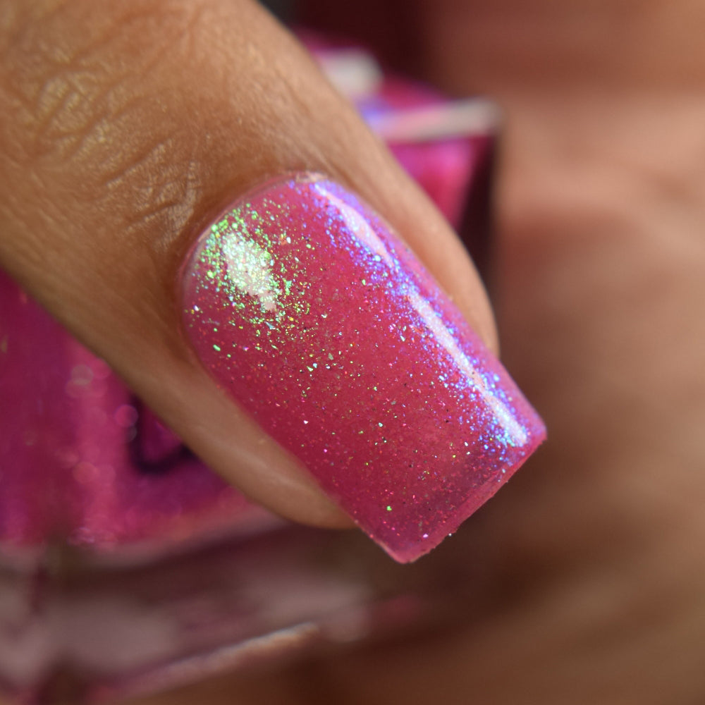 A semi-sheer pink crelly base with aurora microflake shimmer that shifts from green to blue to purple and a sprinkling of pink light reflective glitter.