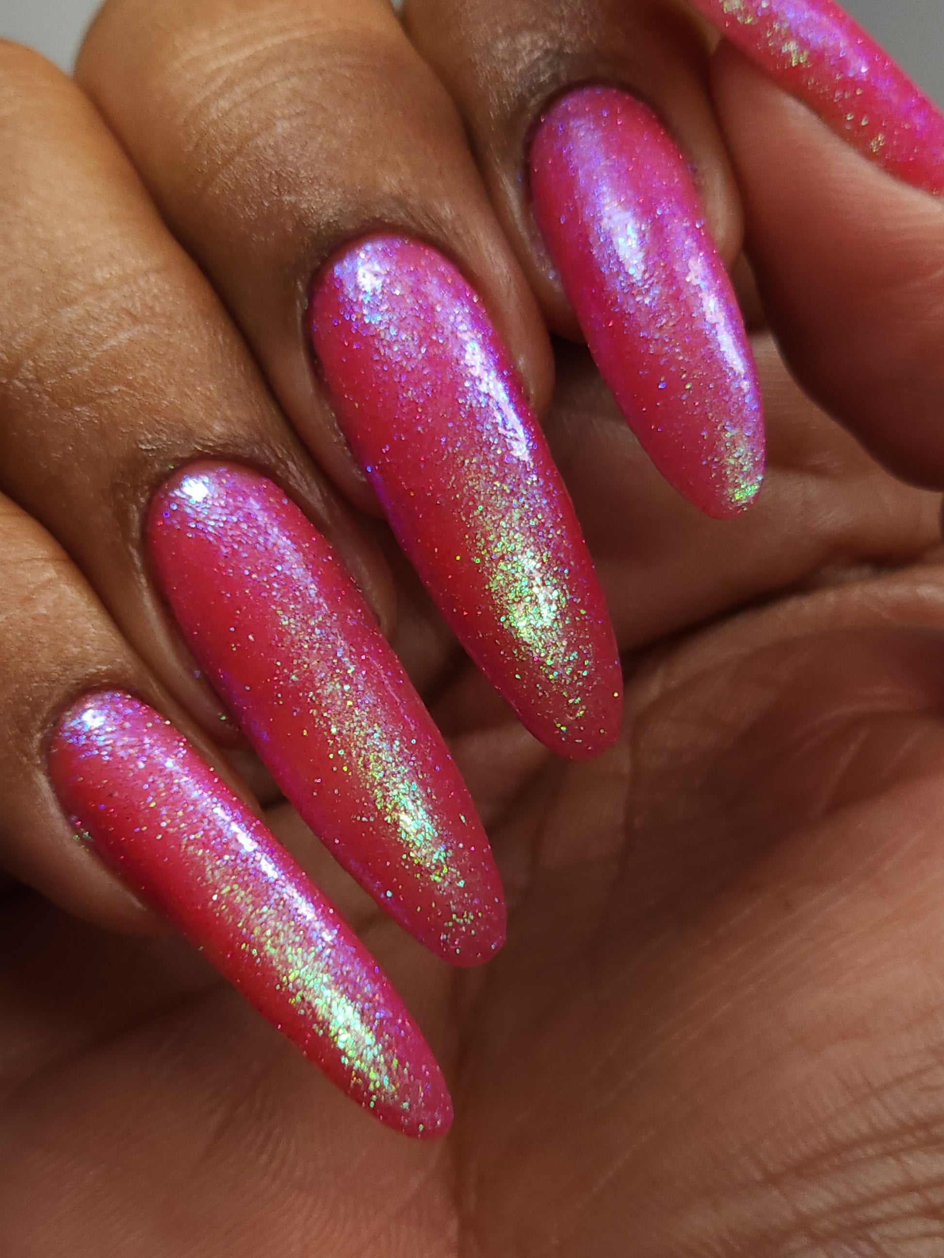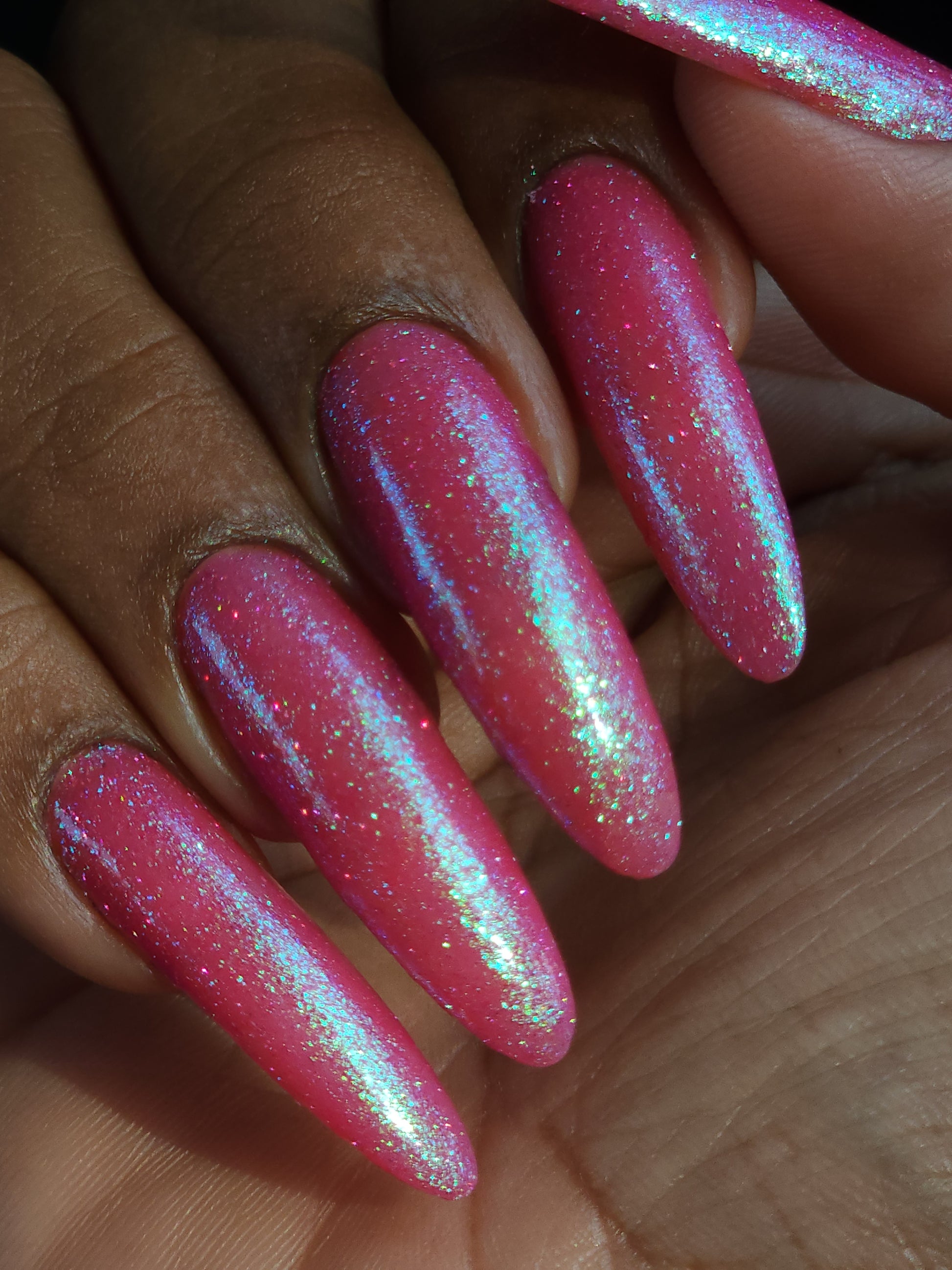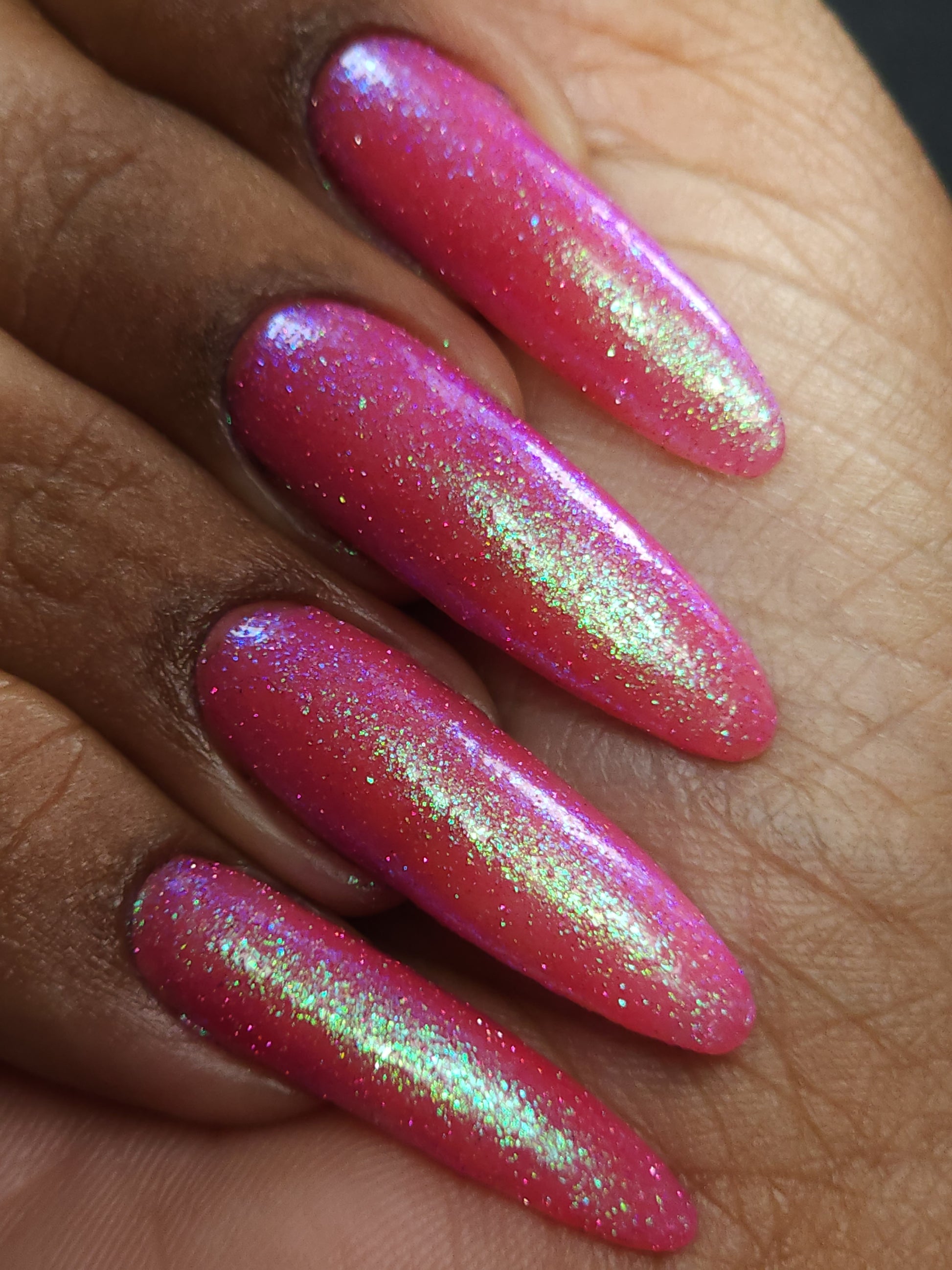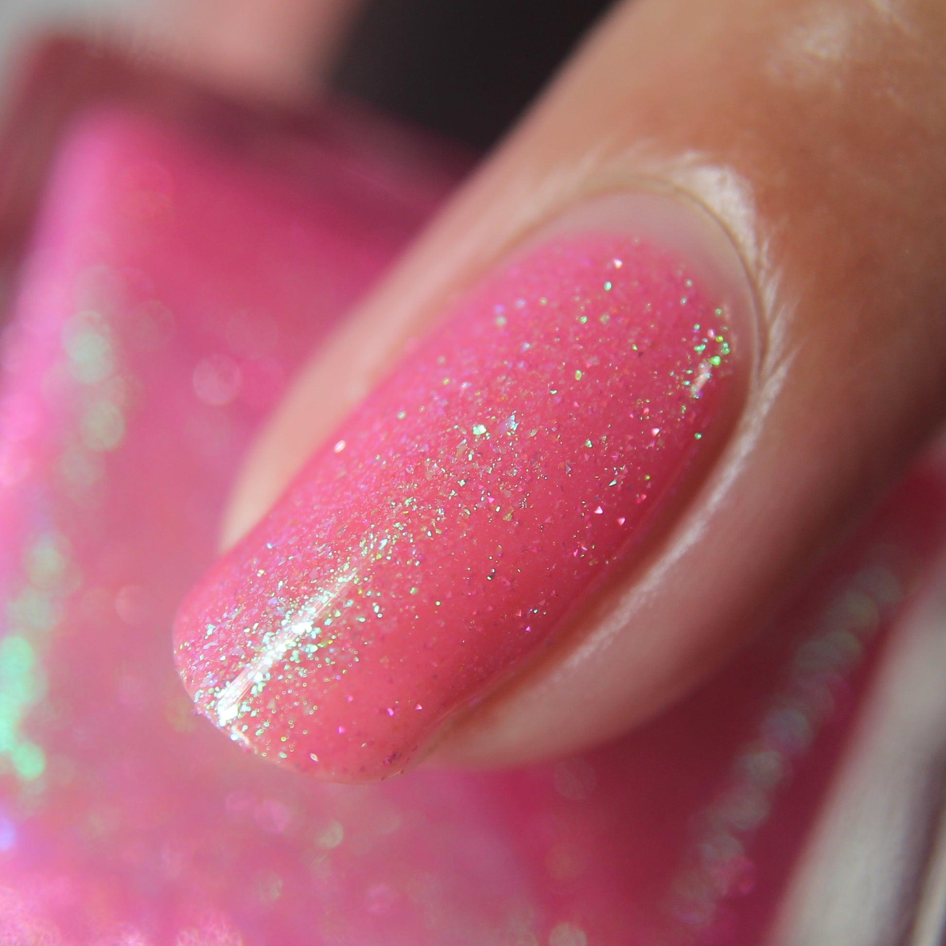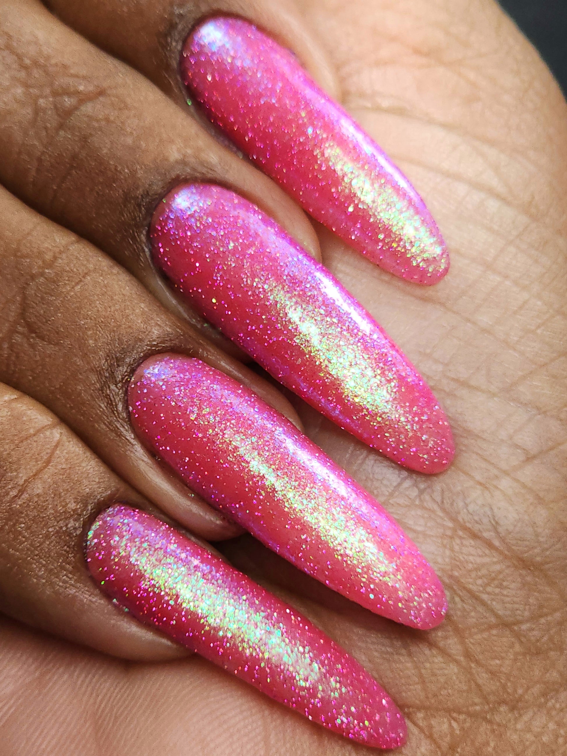 A semi-sheer pink crelly base with aurora microflake shimmer that shifts from green to blue to purple and a sprinkling of pink light reflective glitter.