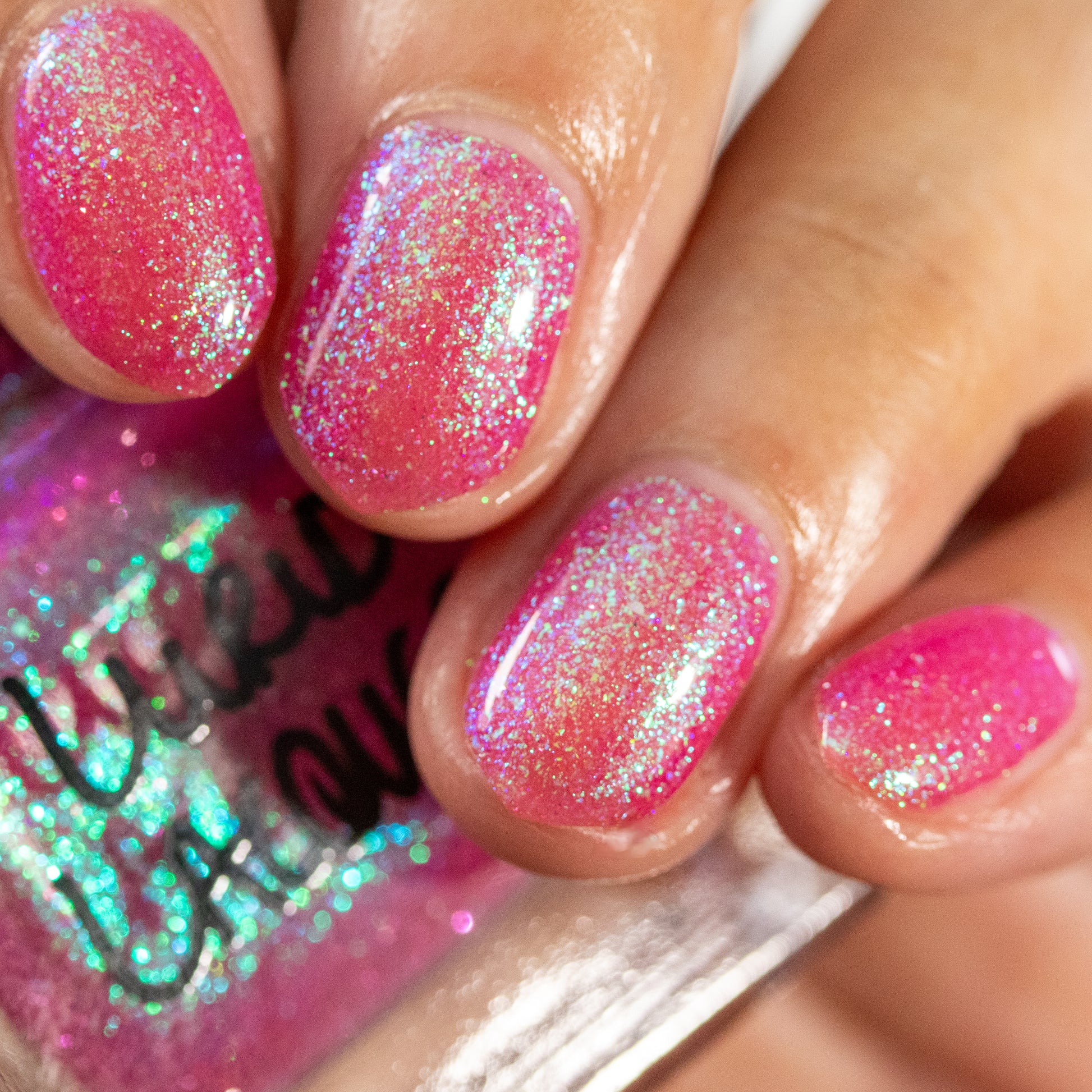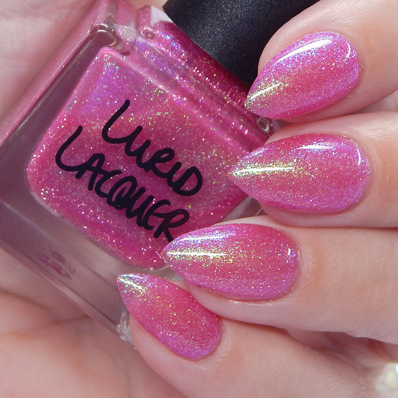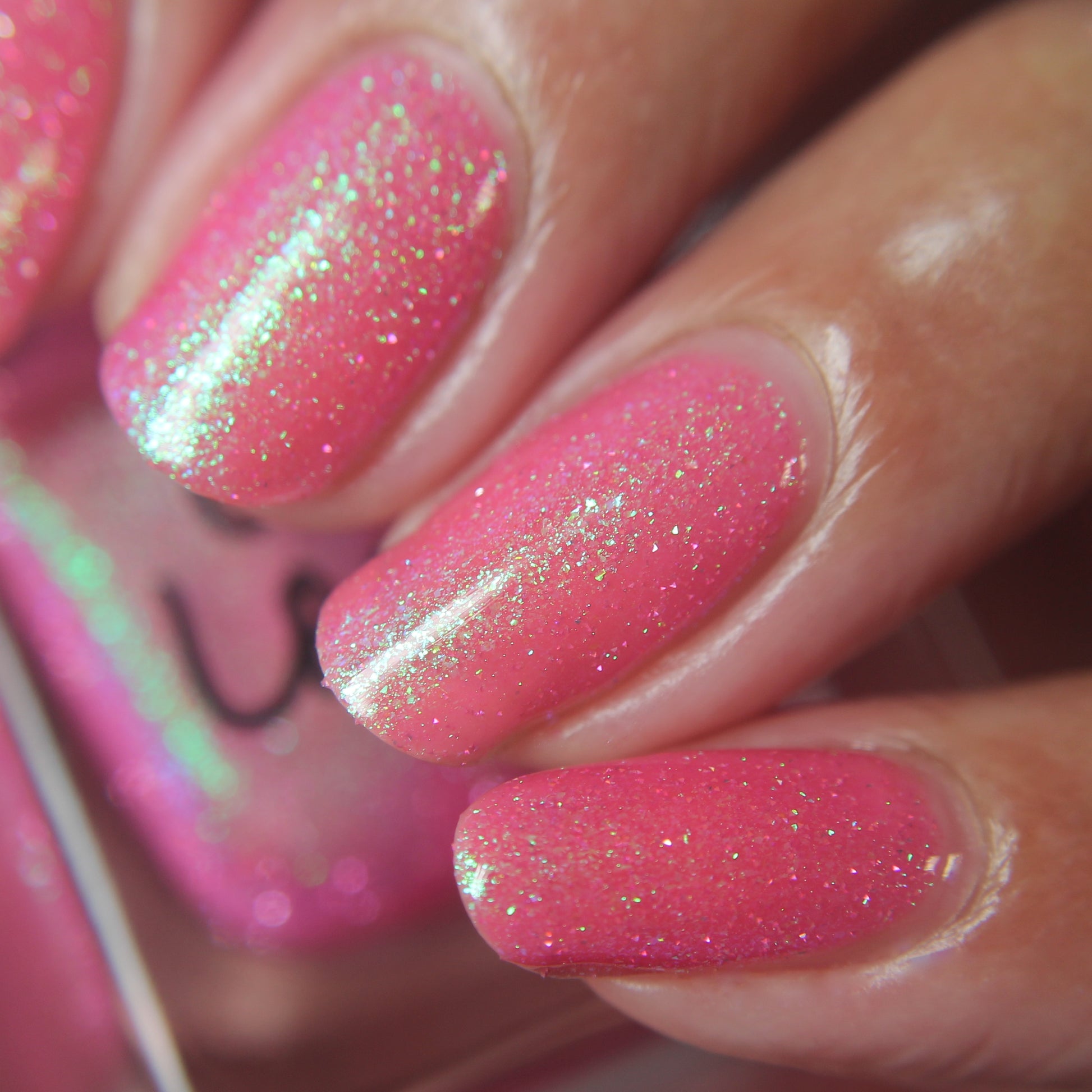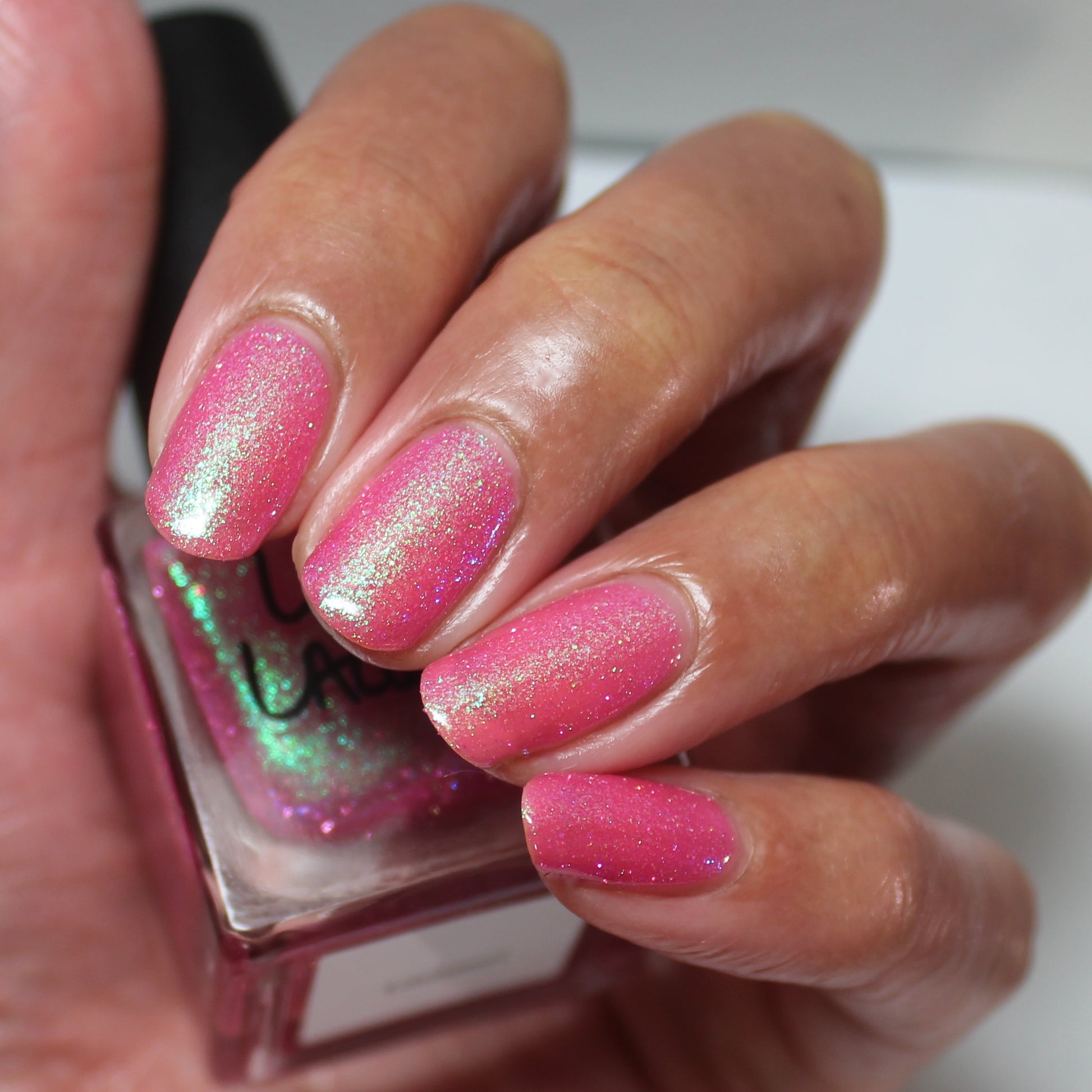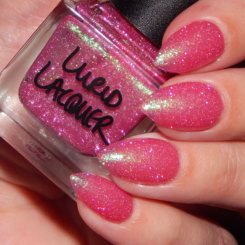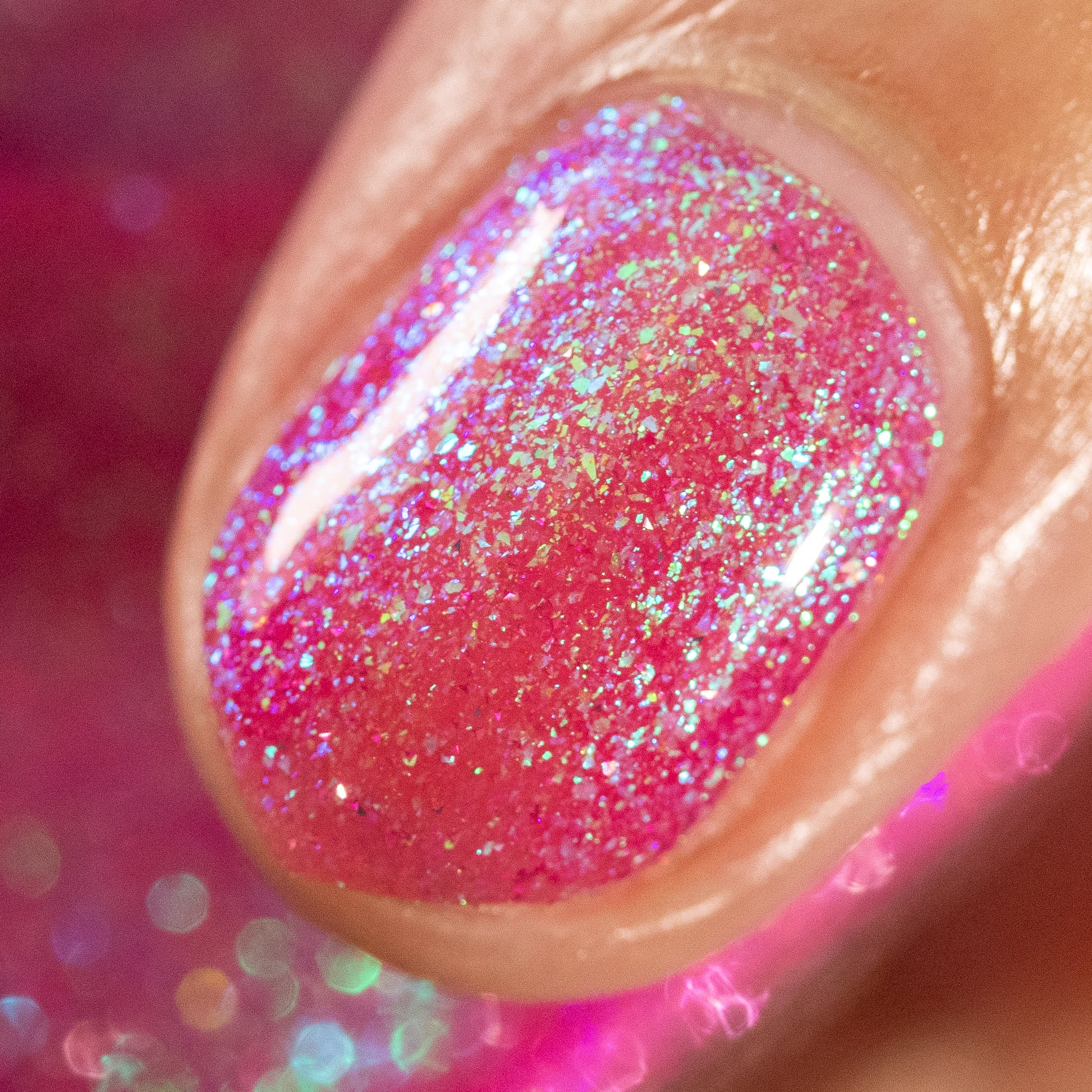 A semi-sheer pink crelly base with aurora microflake shimmer that shifts from green to blue to purple and a sprinkling of pink light reflective glitter.