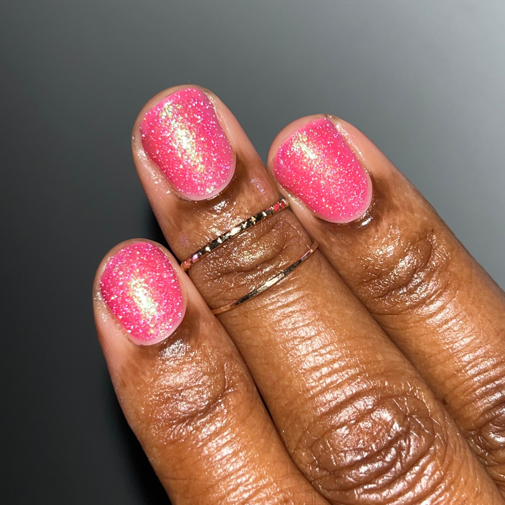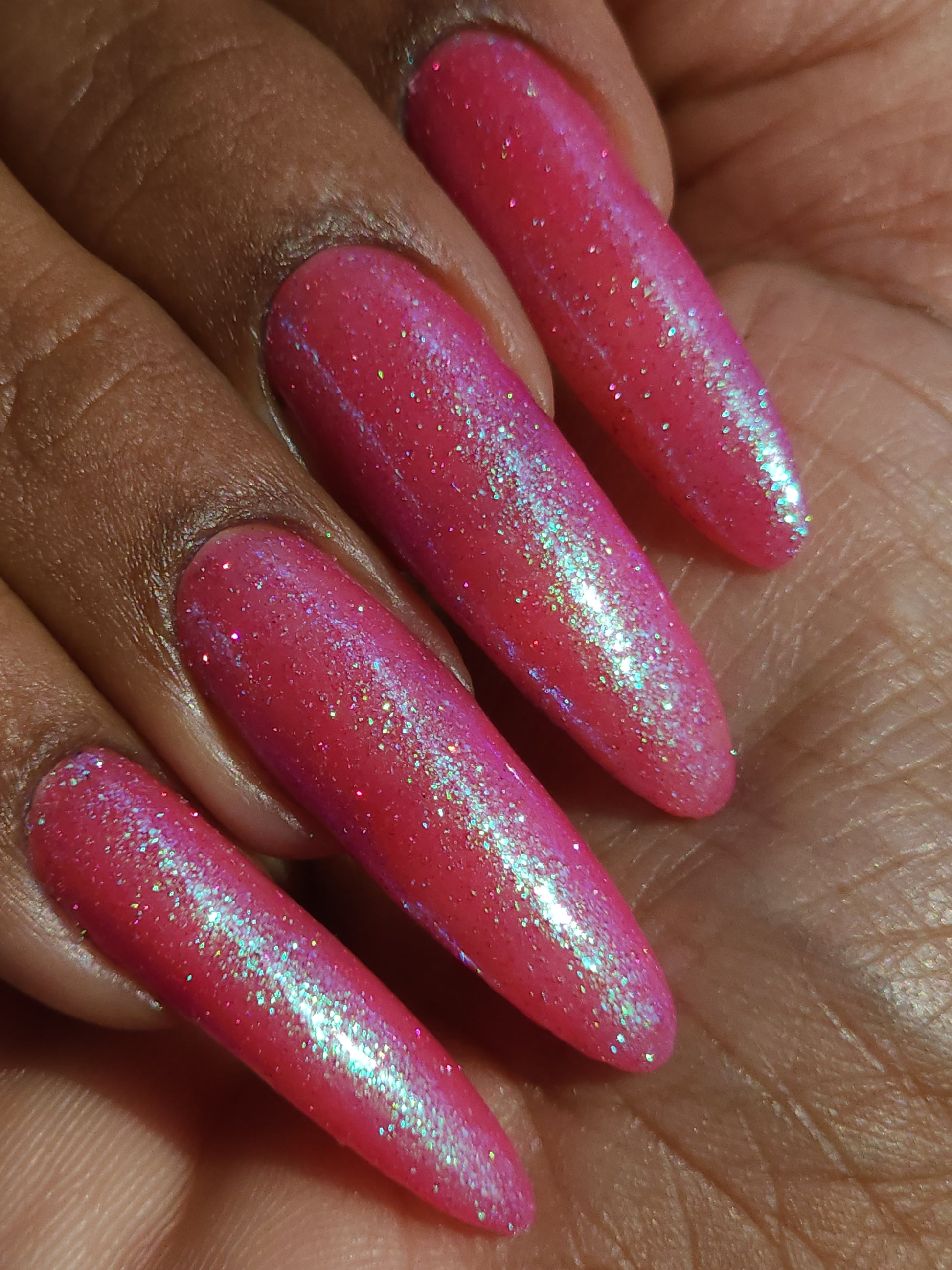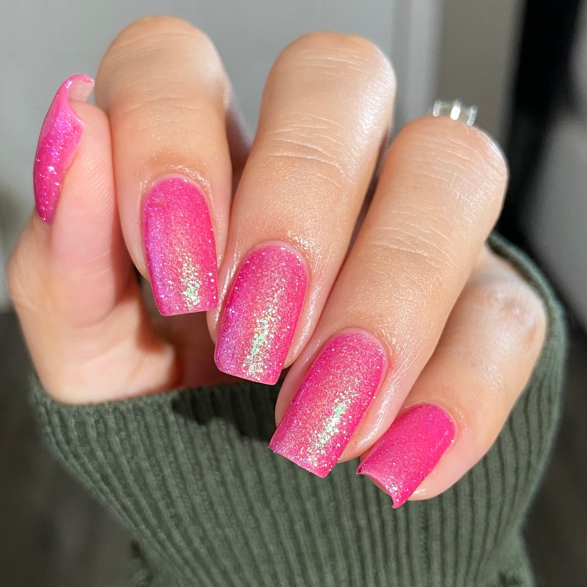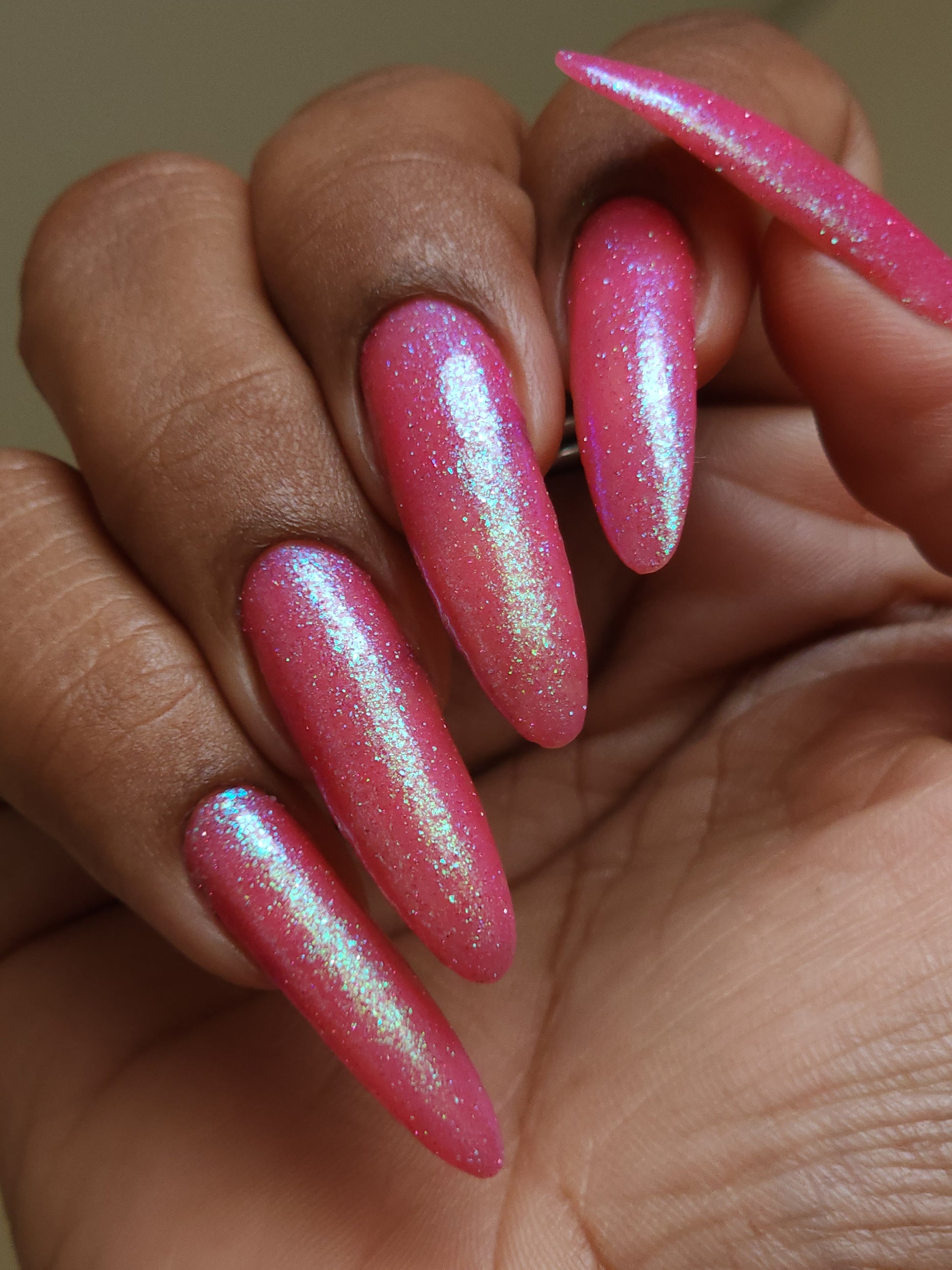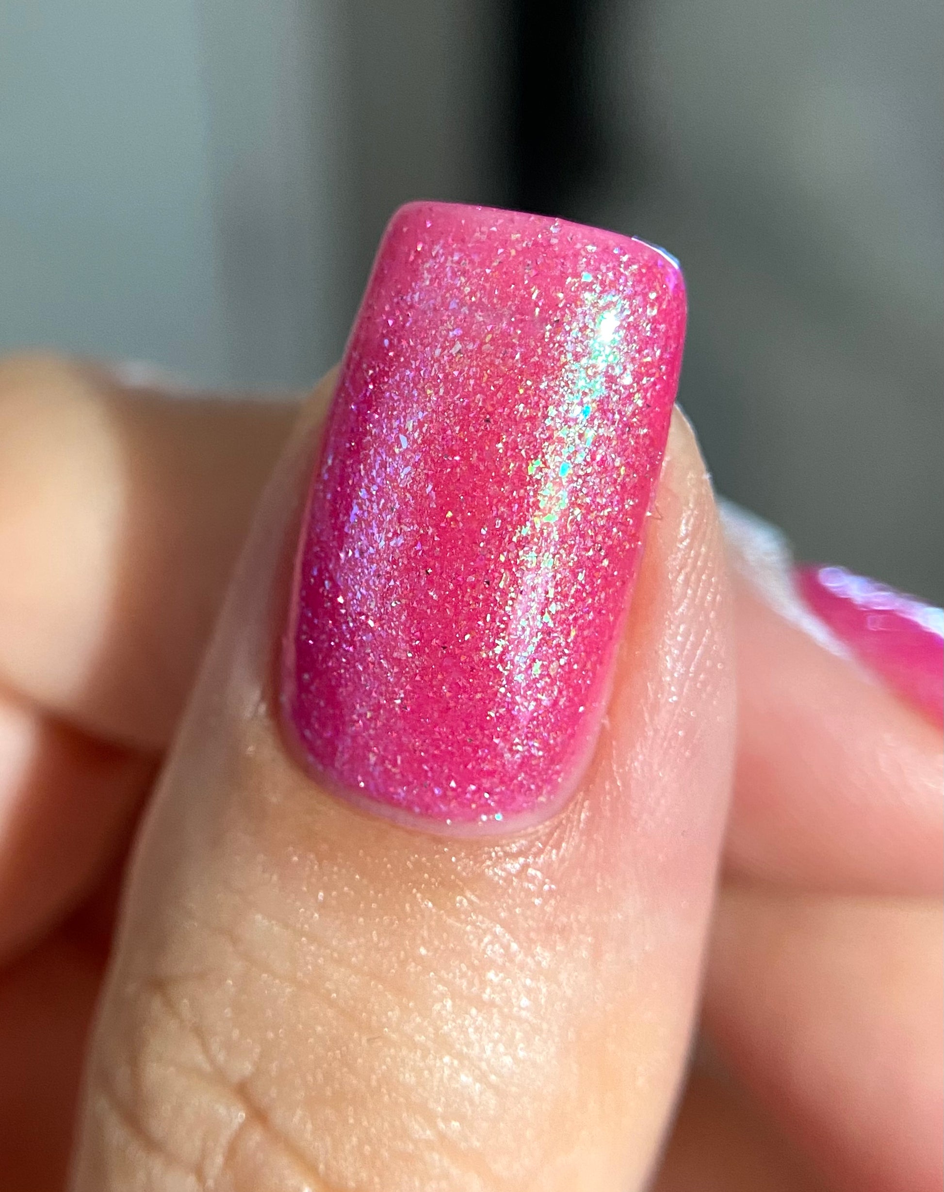A semi-sheer pink crelly base with aurora microflake shimmer that shifts from green to blue to purple and a sprinkling of pink light reflective glitter.