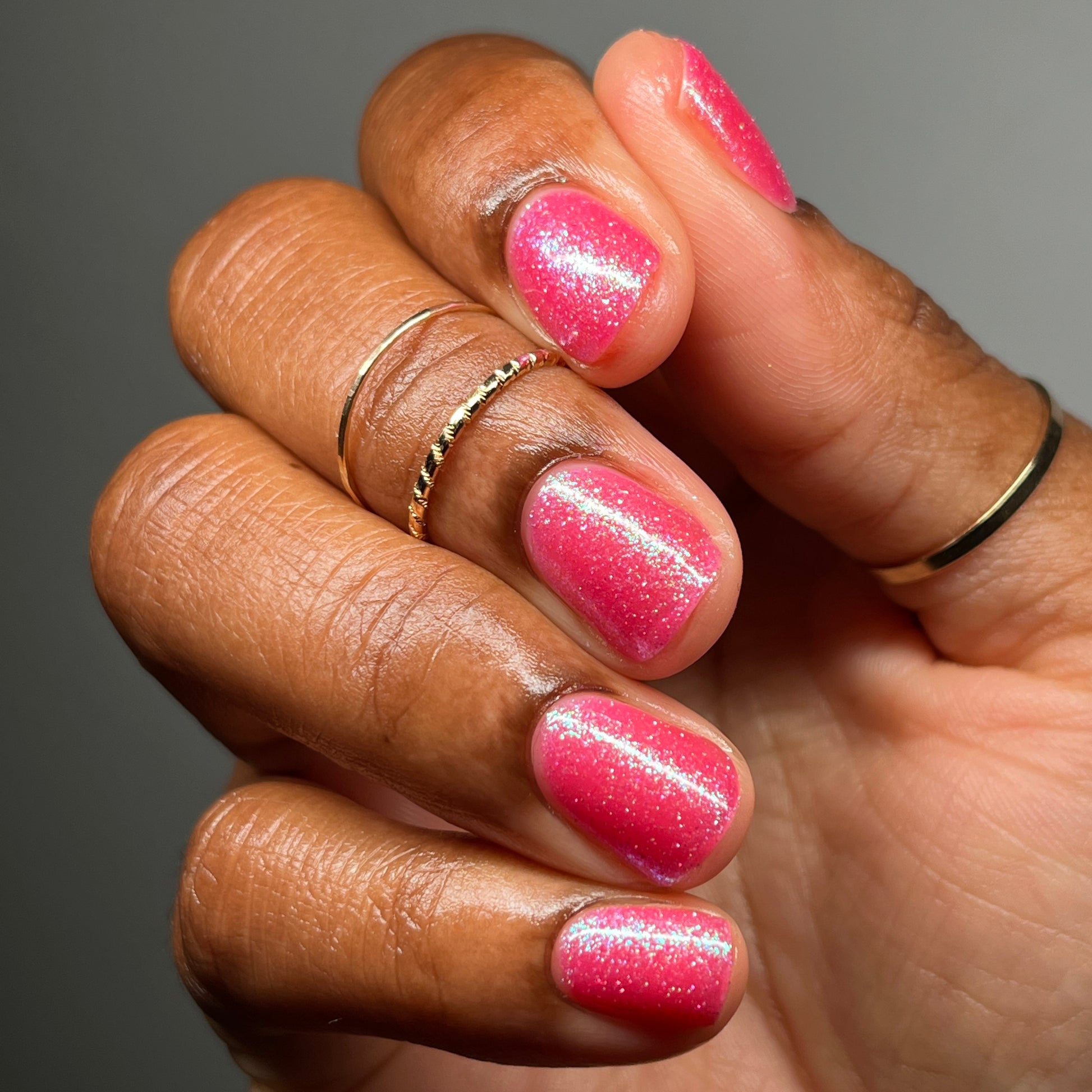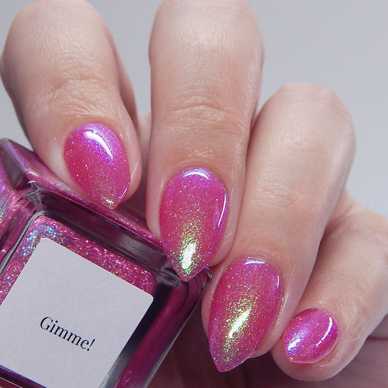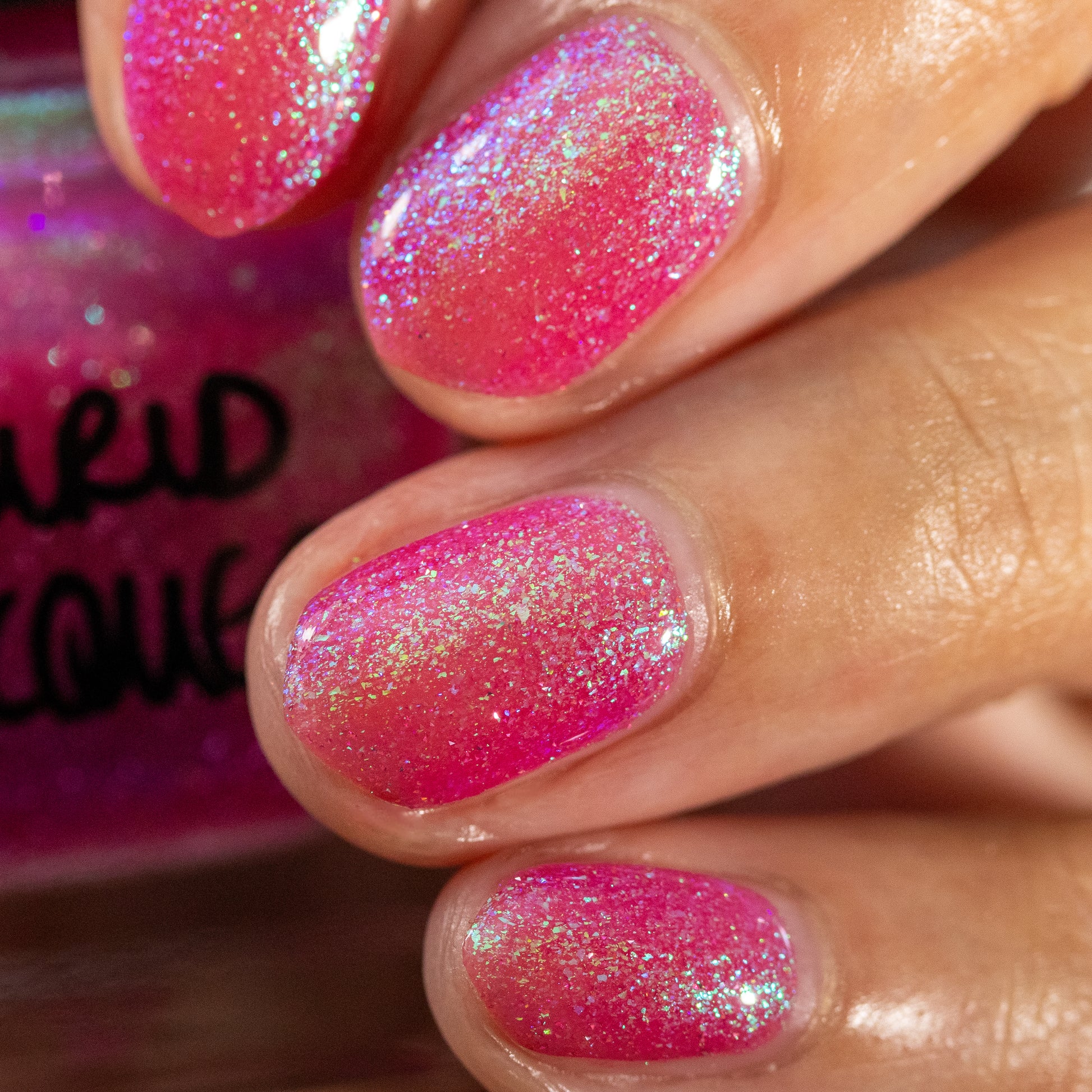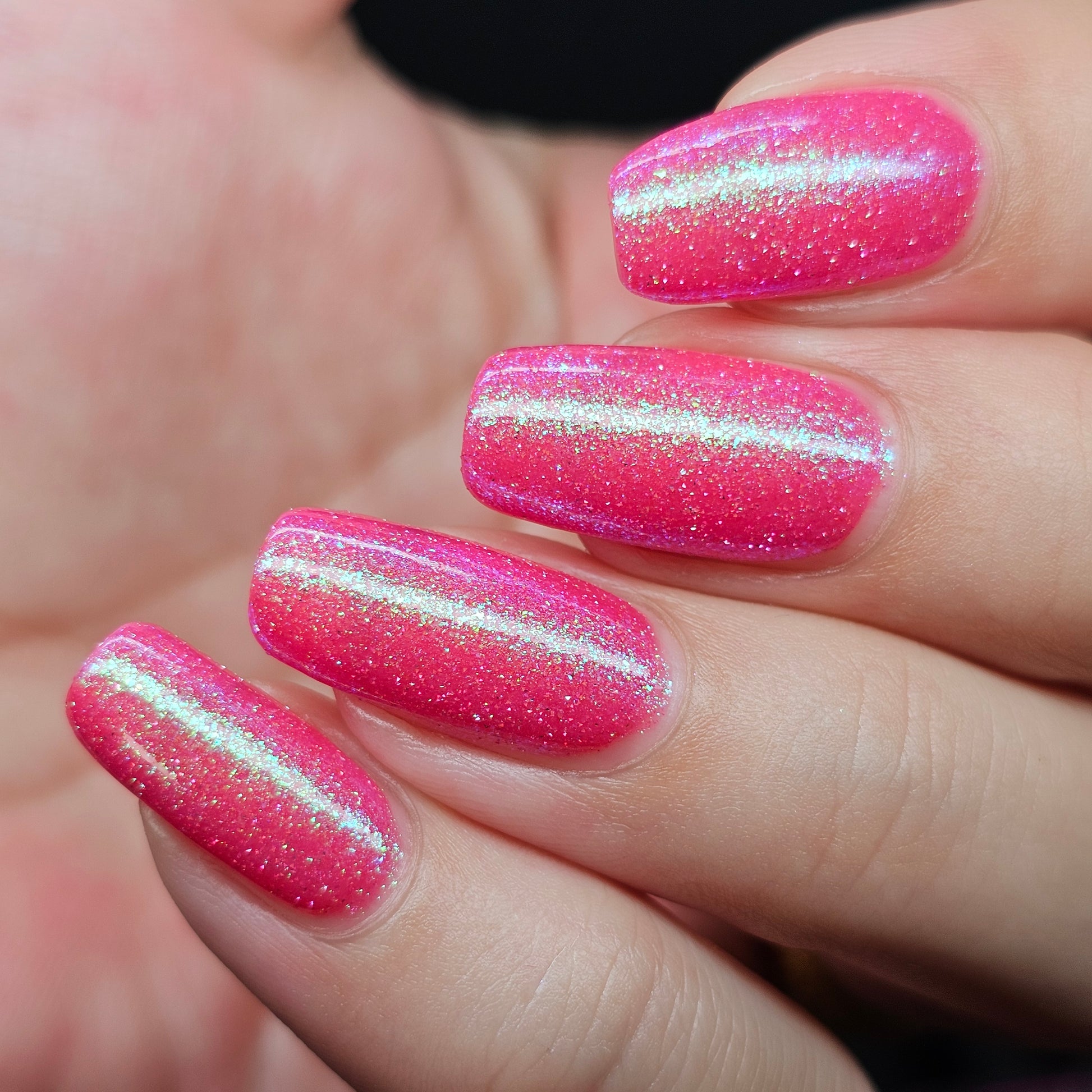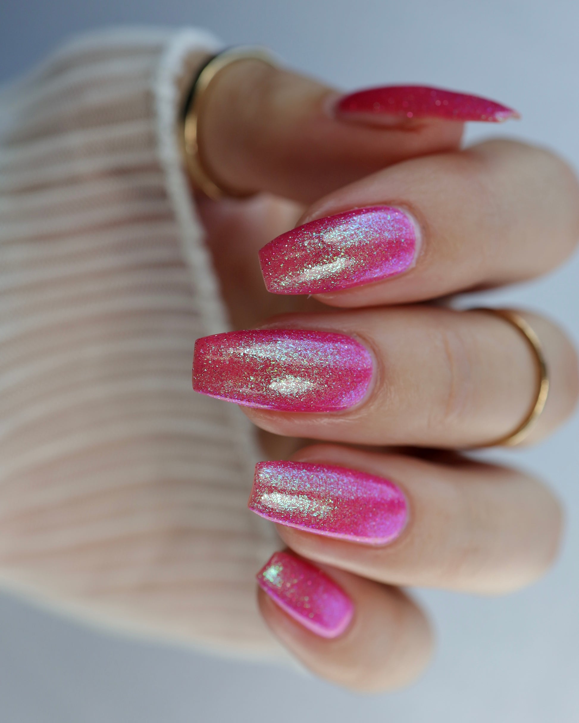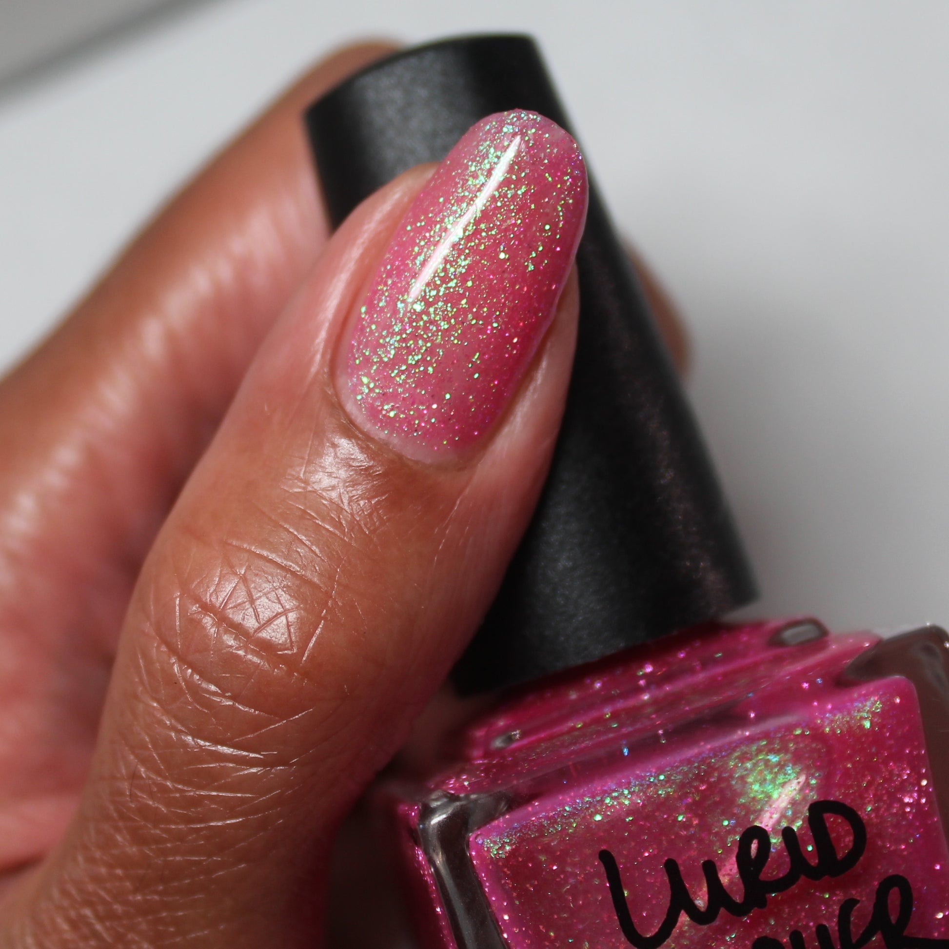 A semi-sheer pink crelly base with aurora microflake shimmer that shifts from green to blue to purple and a sprinkling of pink light reflective glitter.