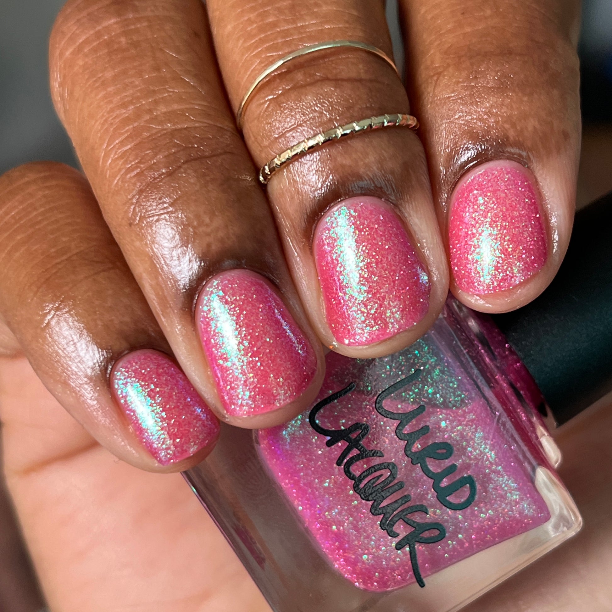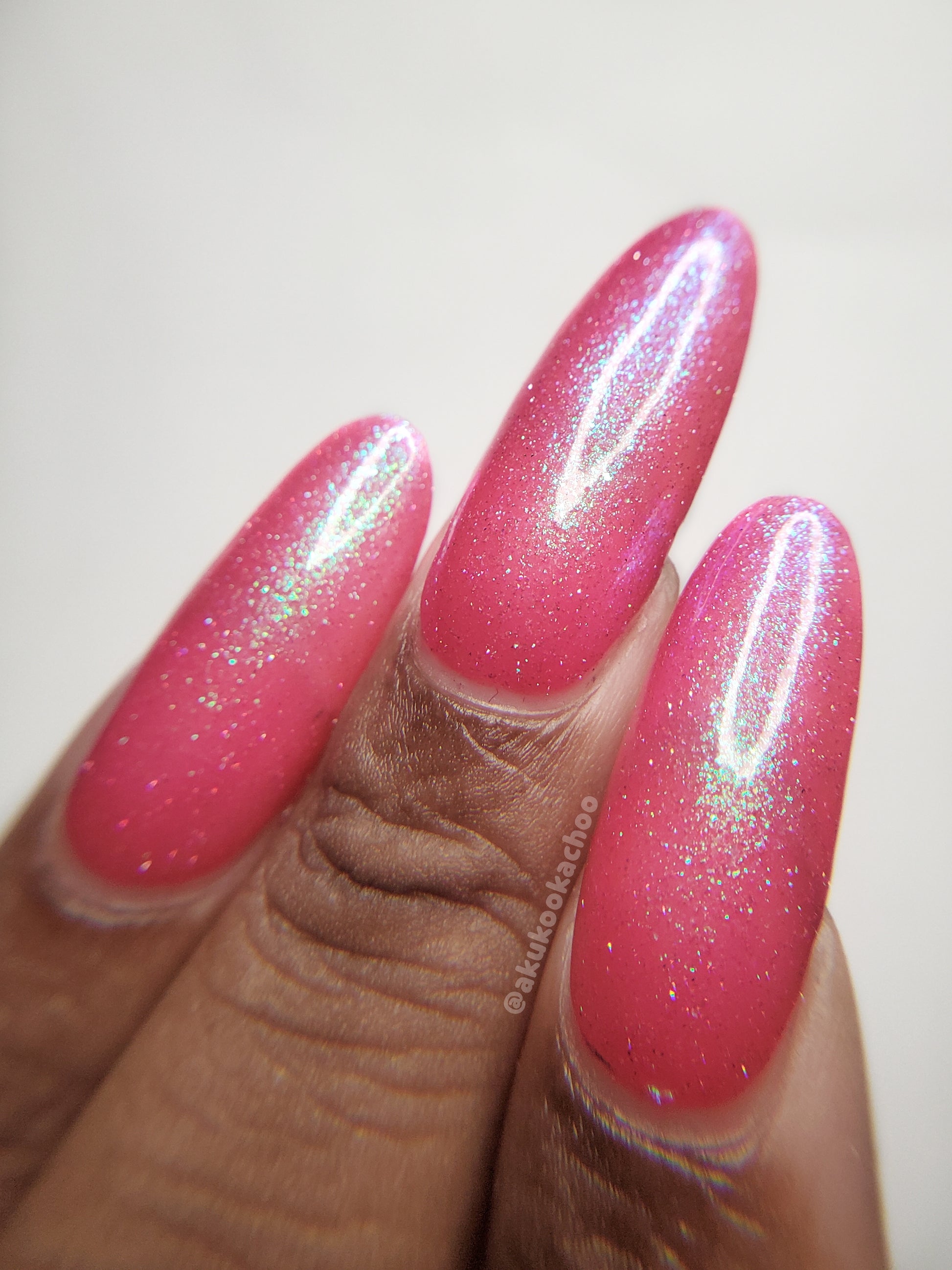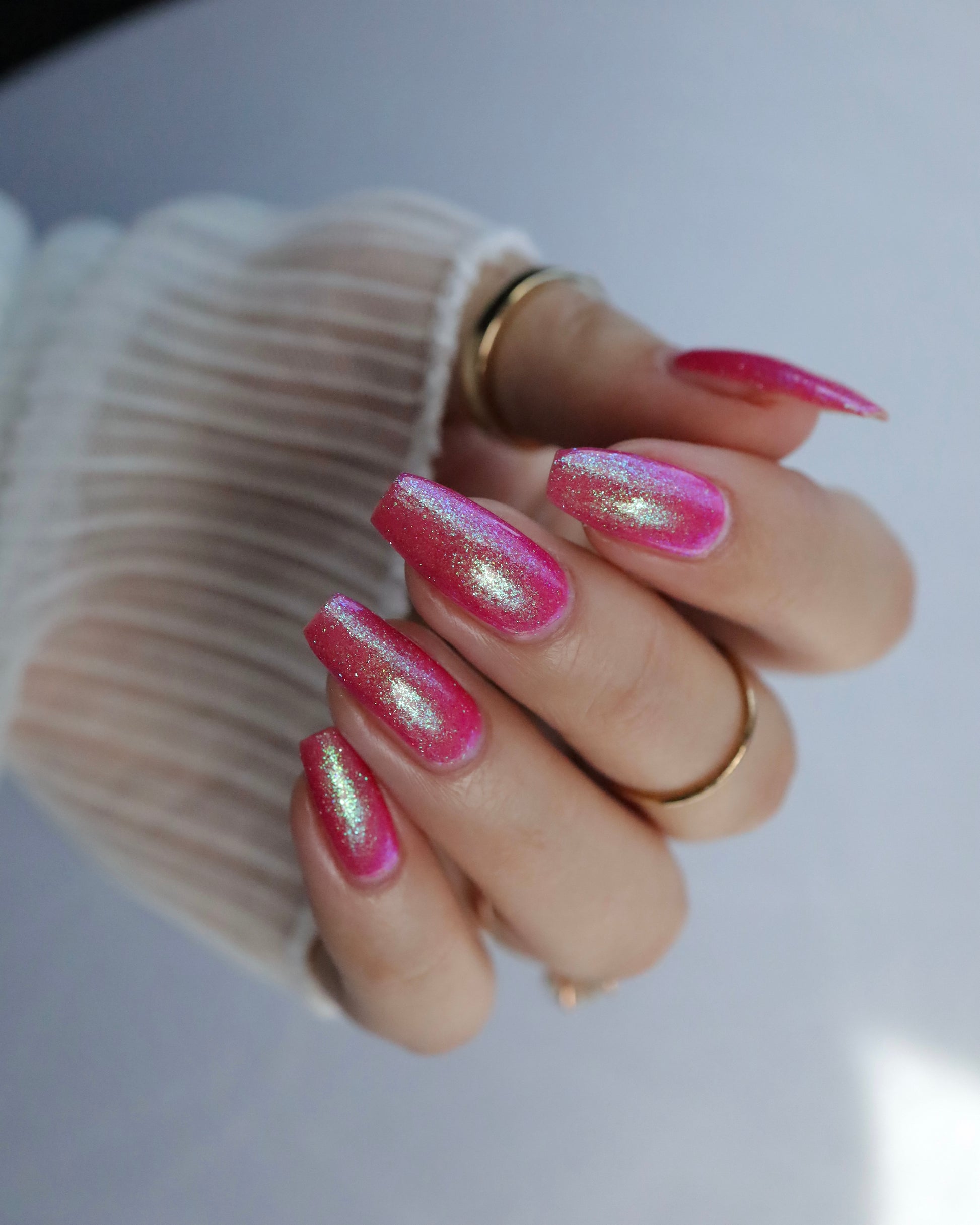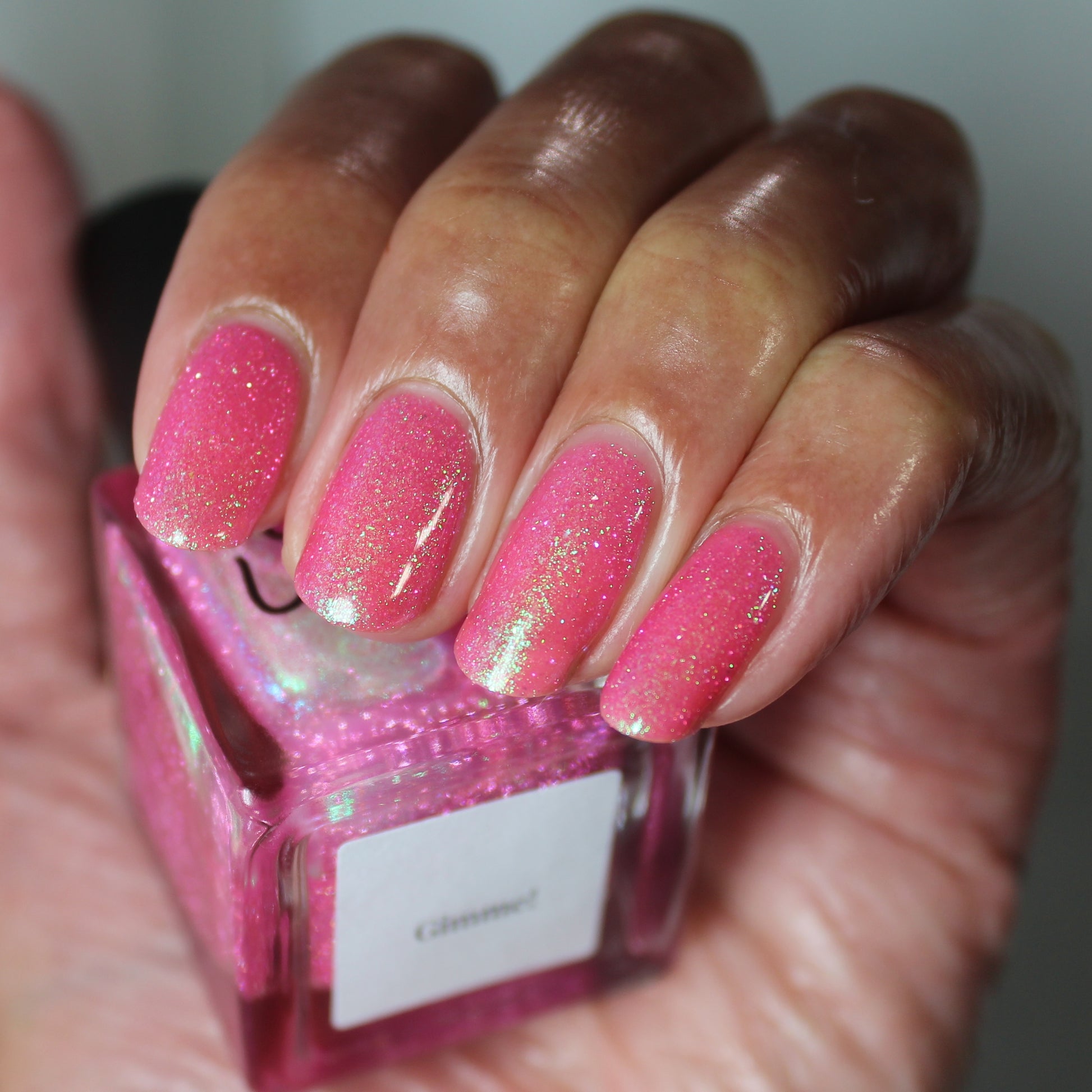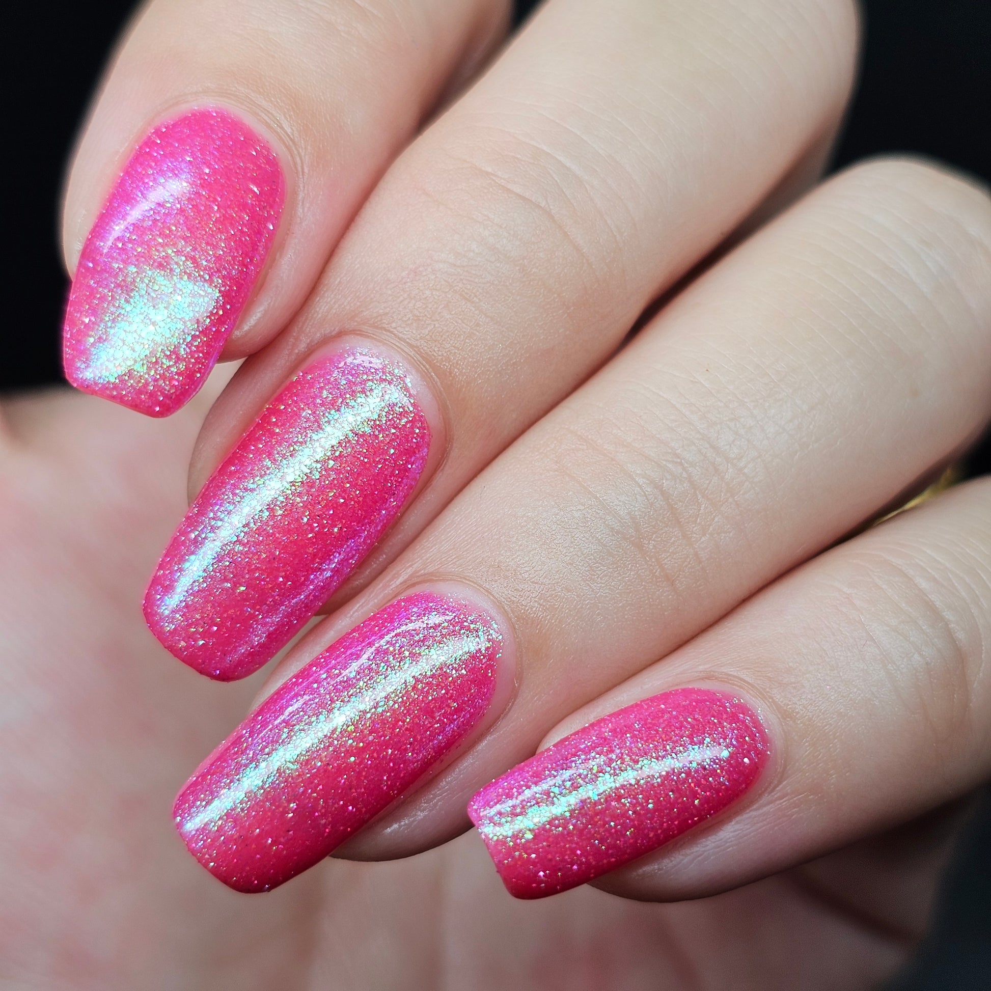 A semi-sheer pink crelly base with aurora microflake shimmer that shifts from green to blue to purple and a sprinkling of pink light reflective glitter.
