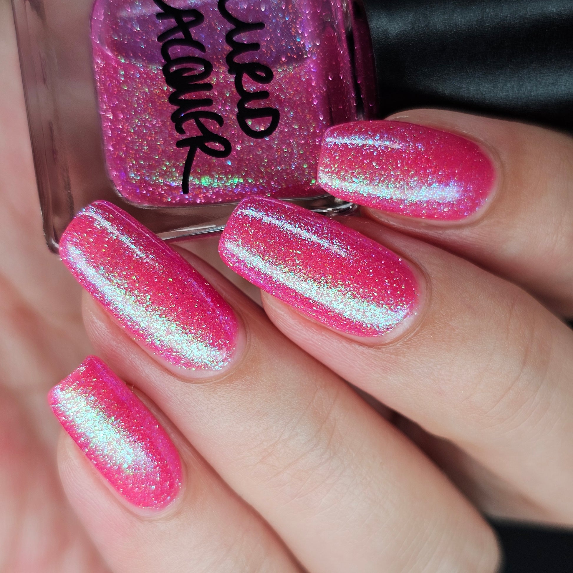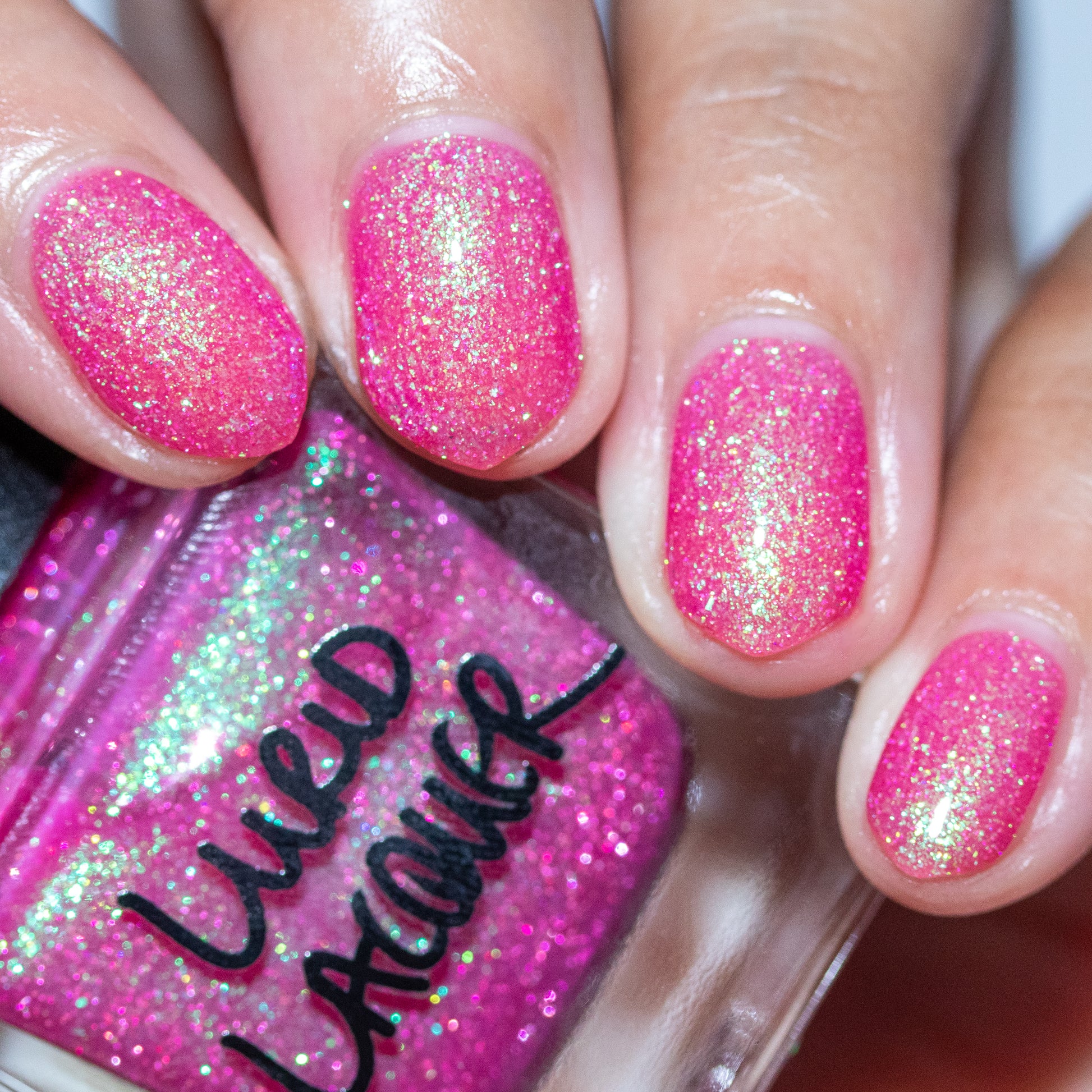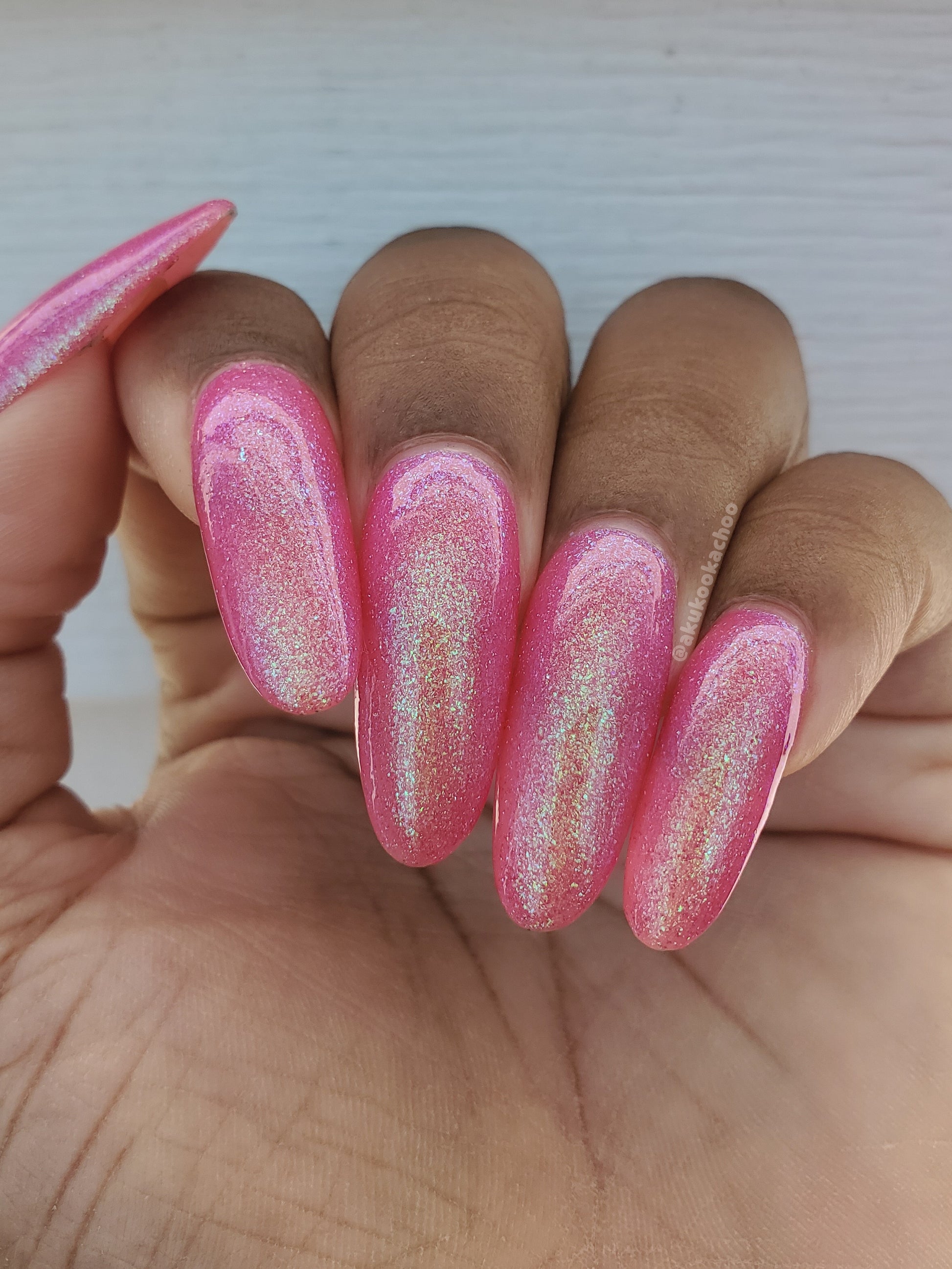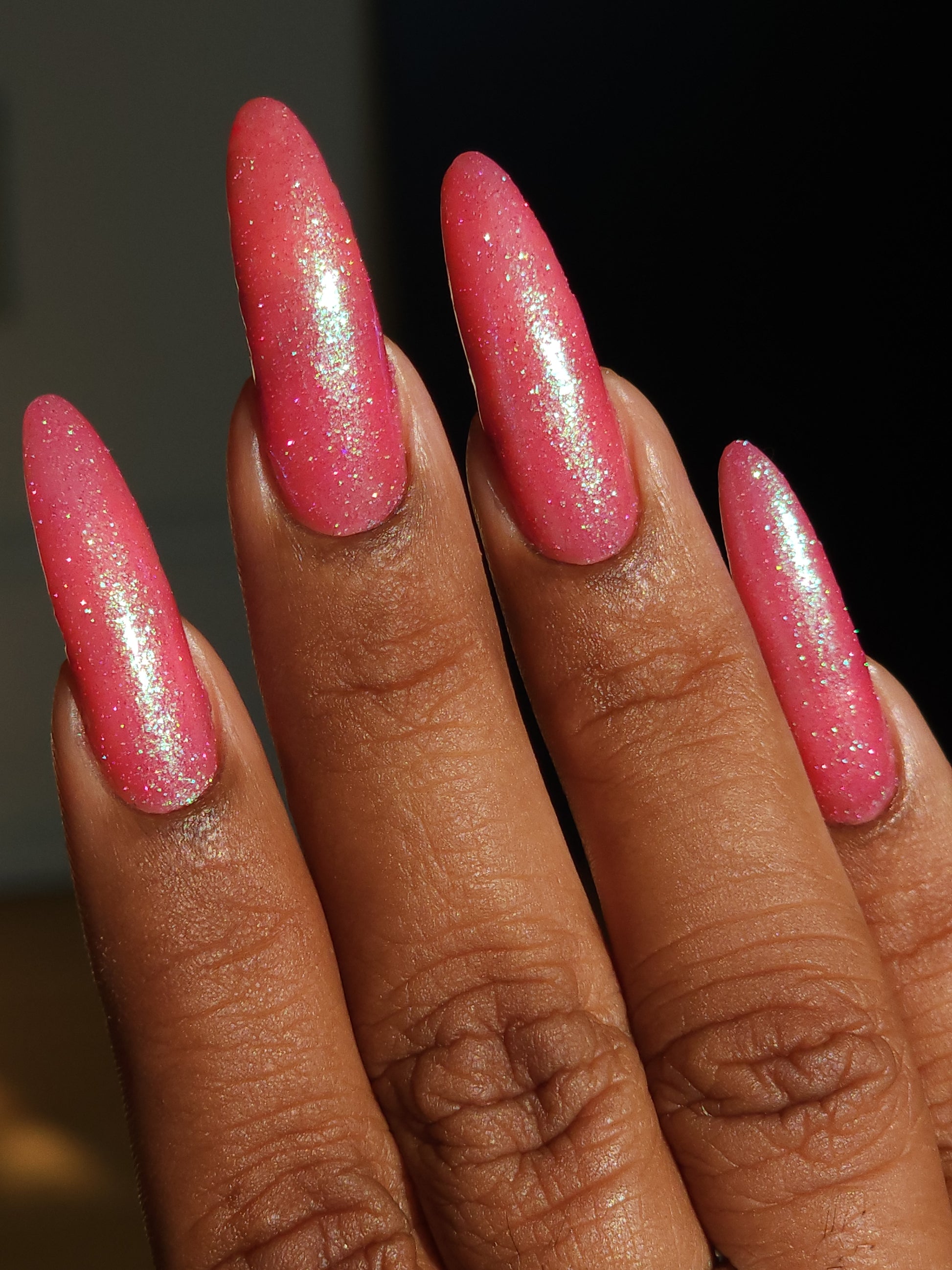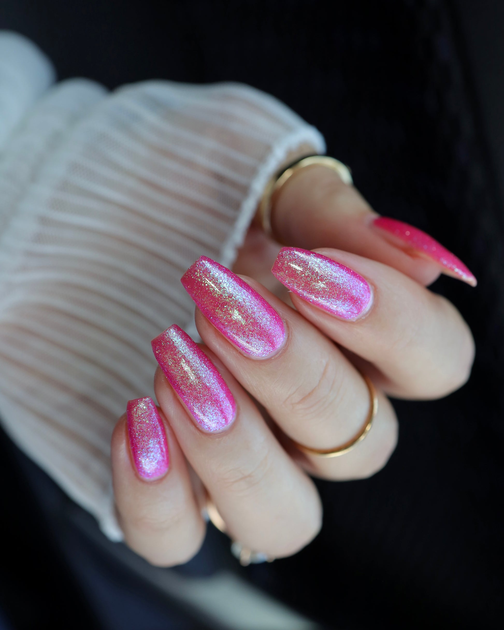 A semi-sheer pink crelly base with aurora microflake shimmer that shifts from green to blue to purple and a sprinkling of pink light reflective glitter.