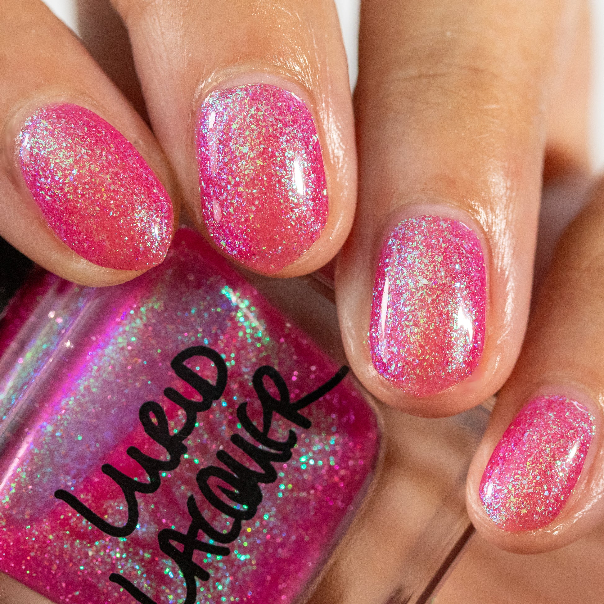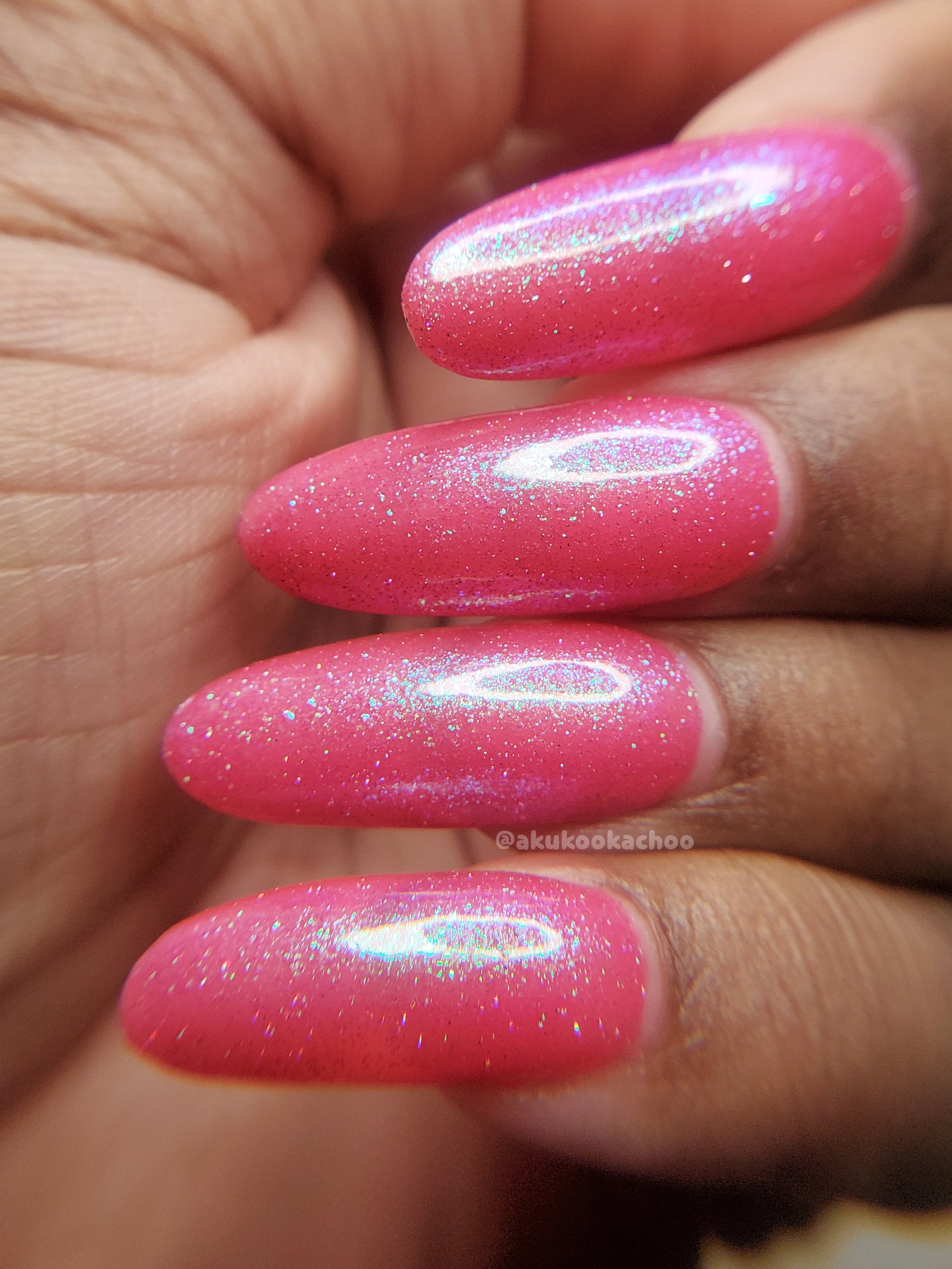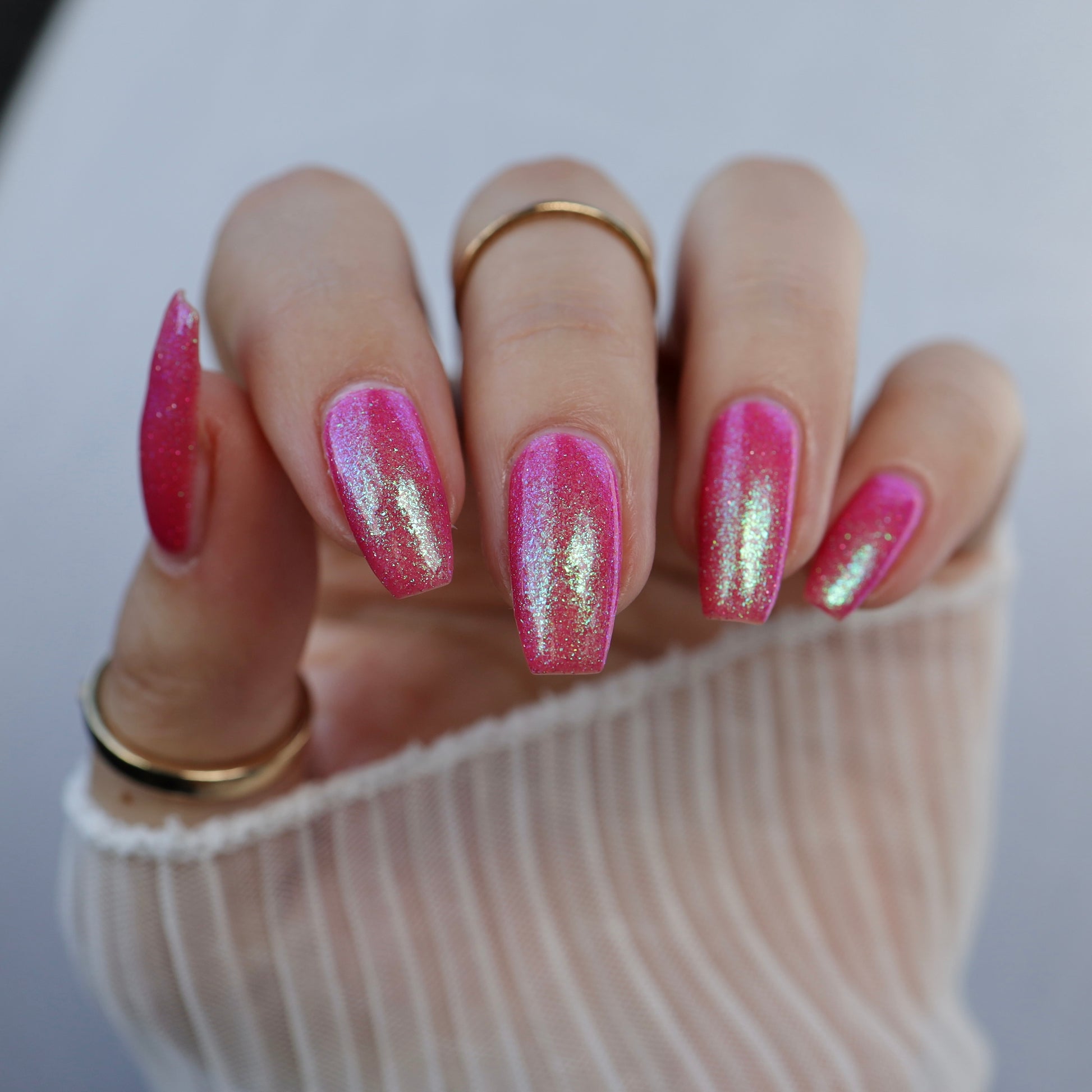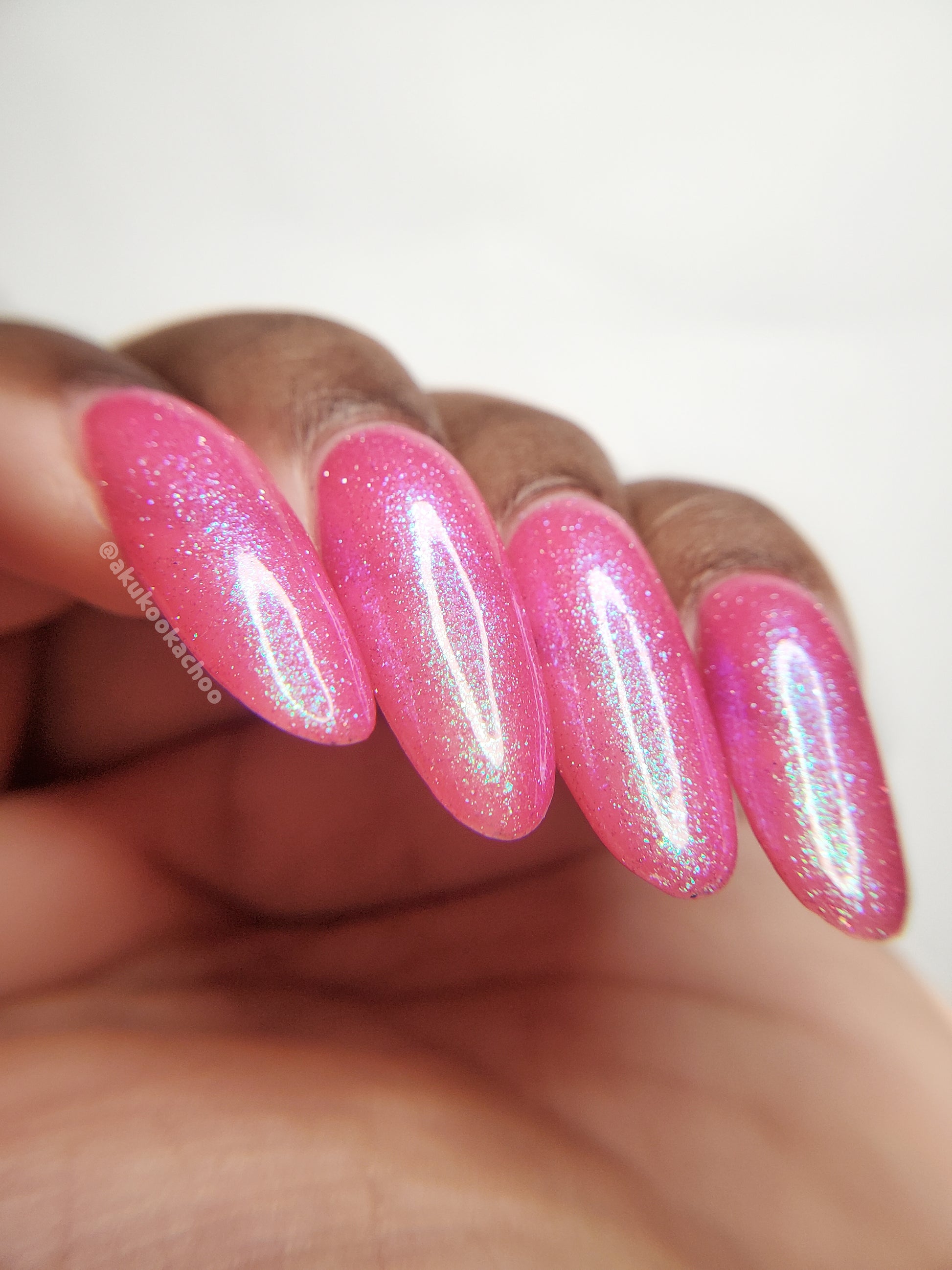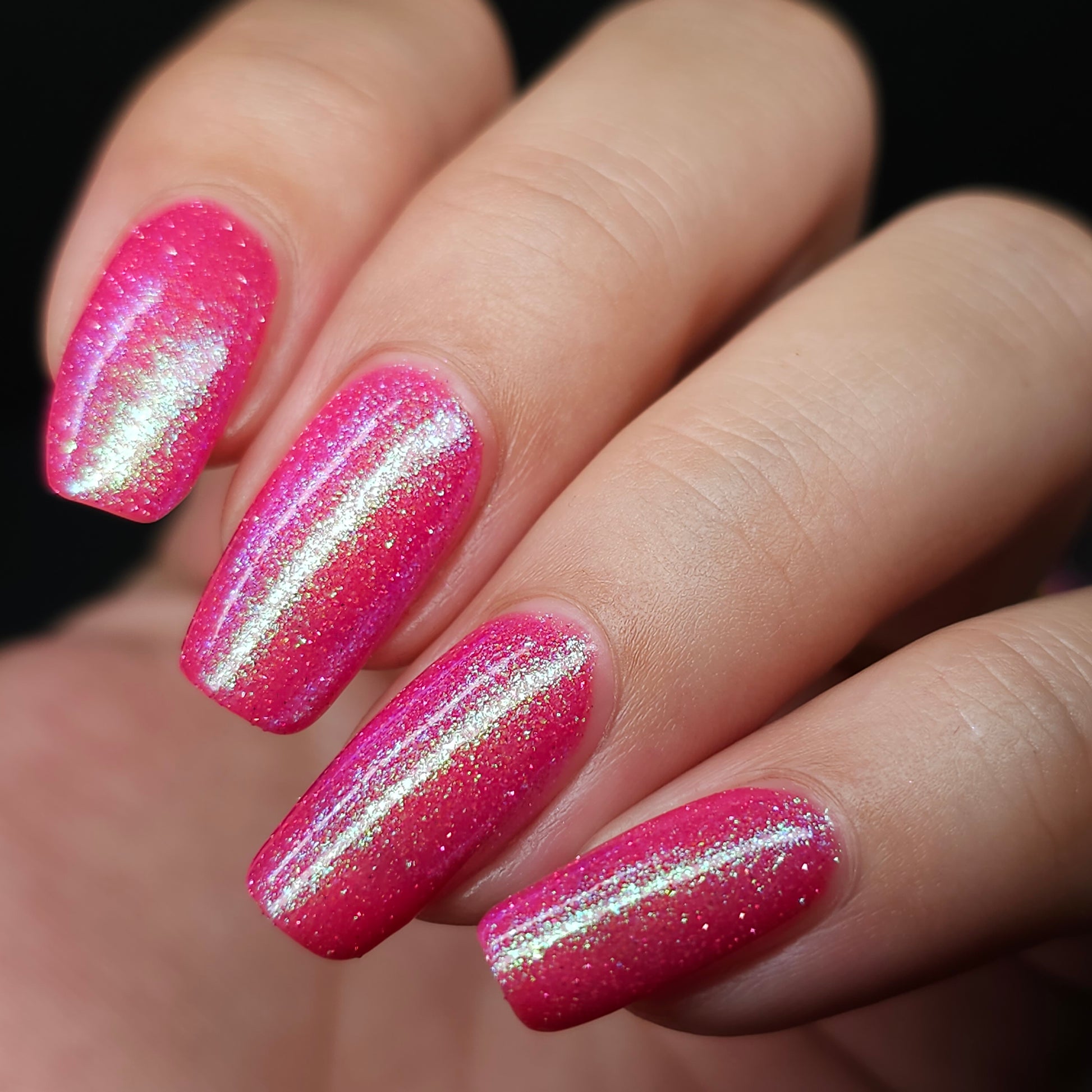 A semi-sheer pink crelly base with aurora microflake shimmer that shifts from green to blue to purple and a sprinkling of pink light reflective glitter.