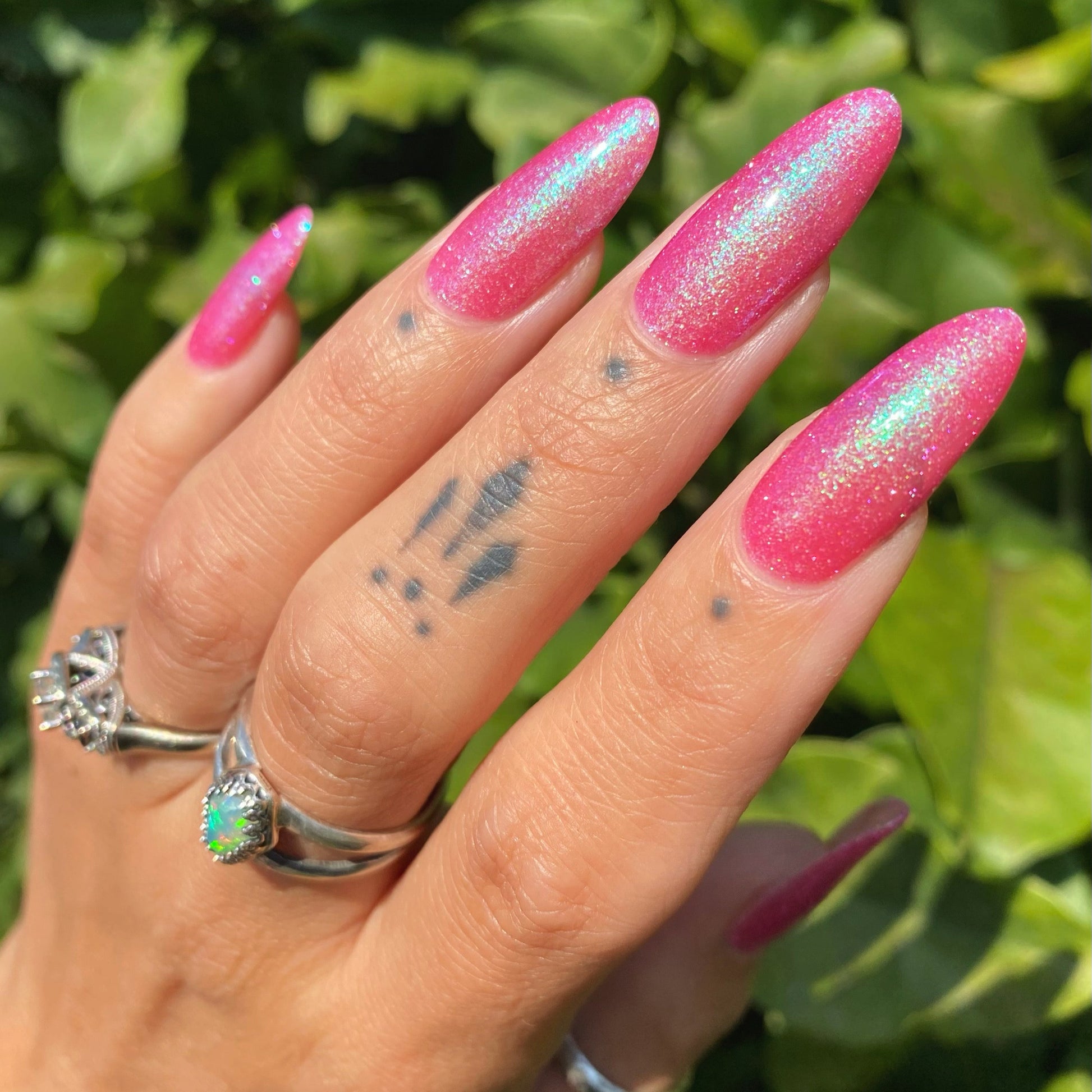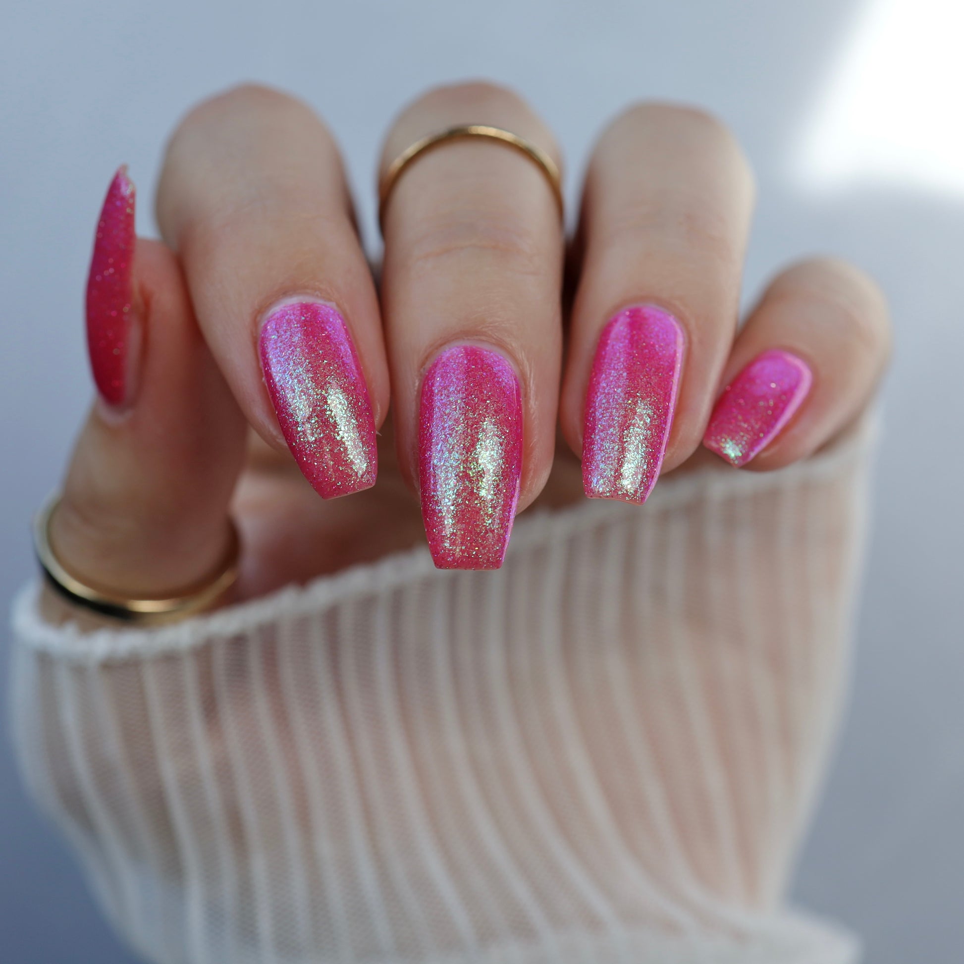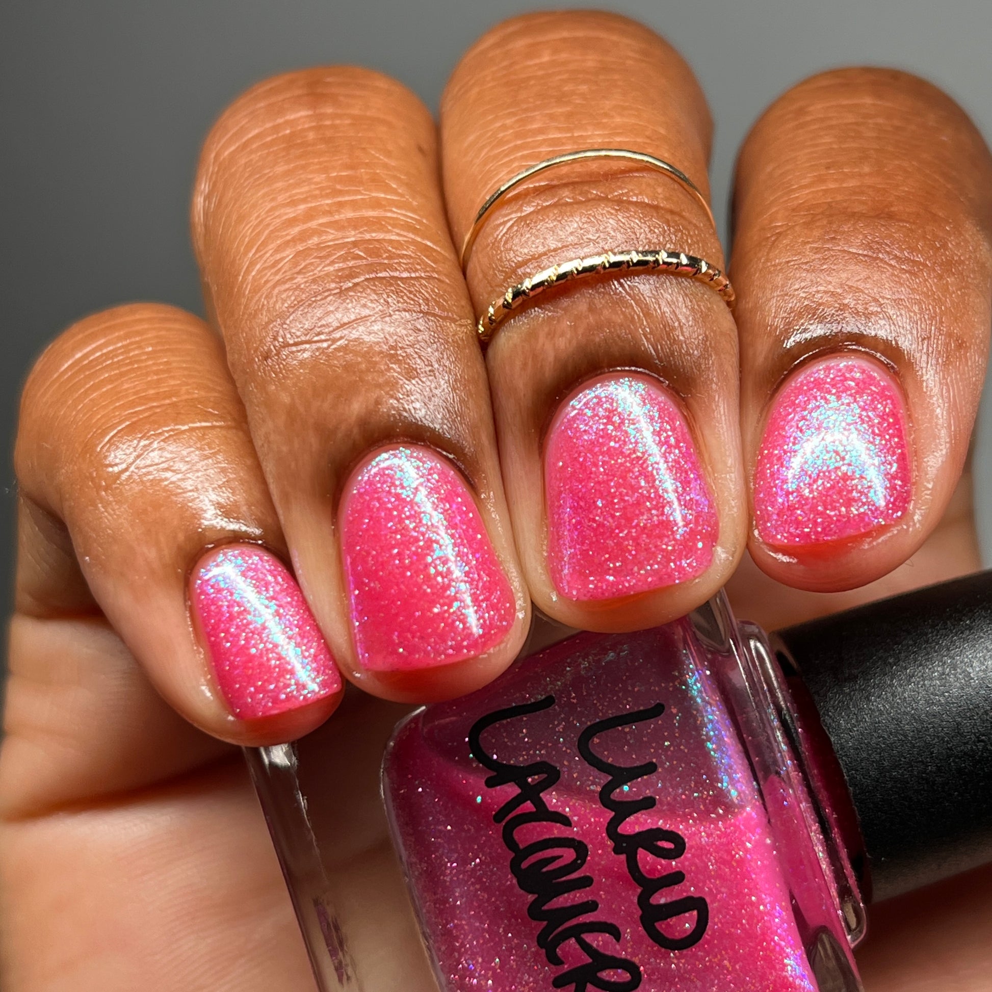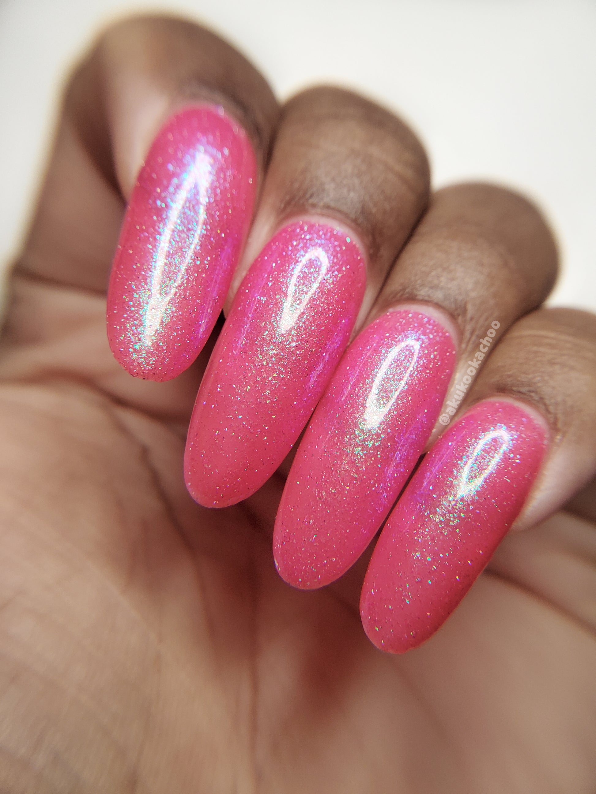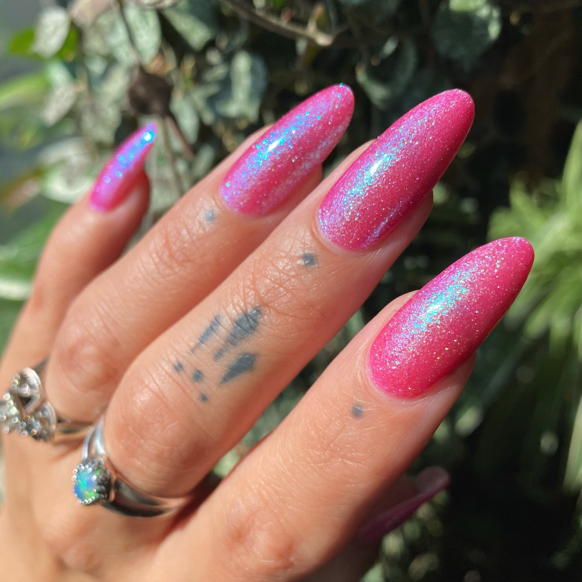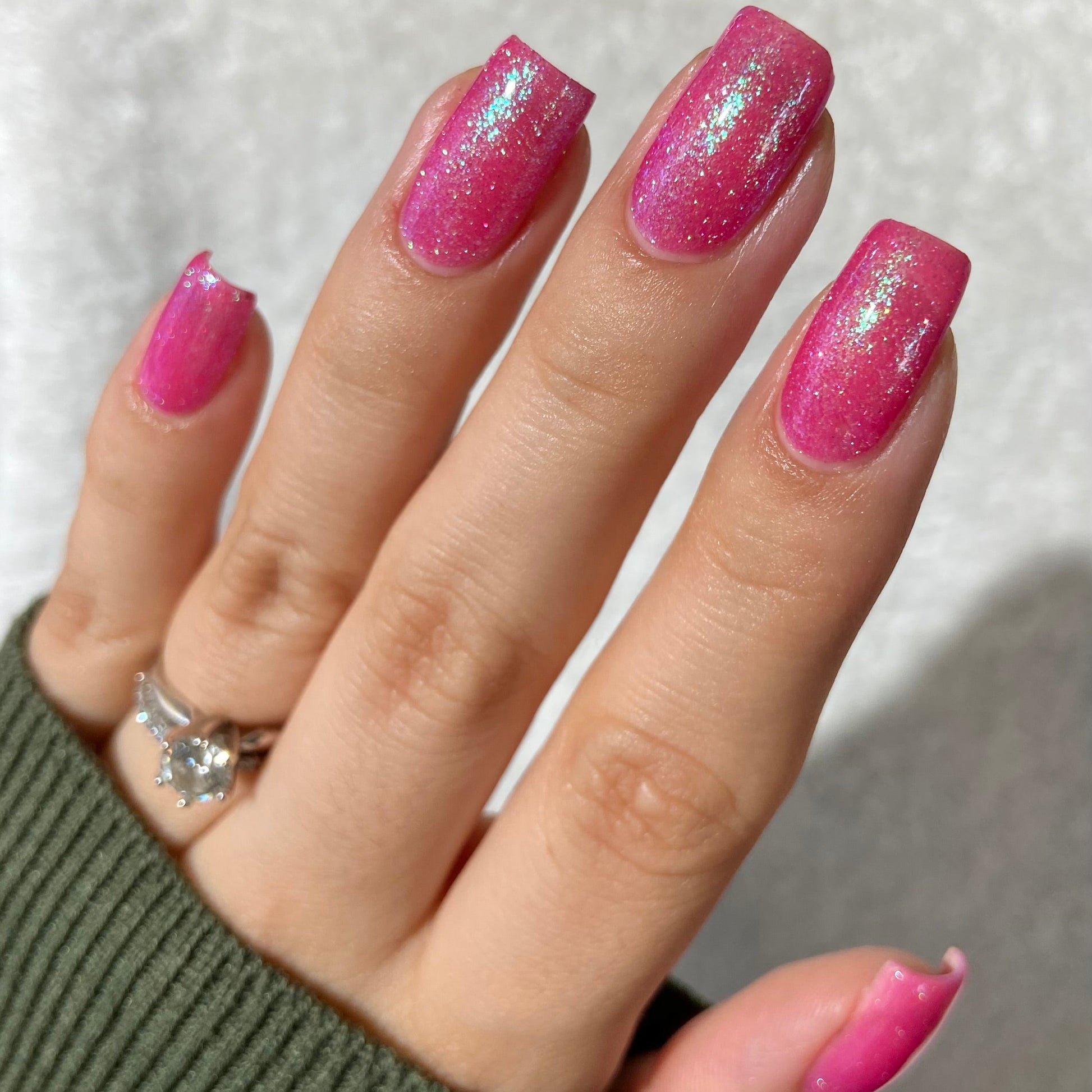 A semi-sheer pink crelly base with aurora microflake shimmer that shifts from green to blue to purple and a sprinkling of pink light reflective glitter.