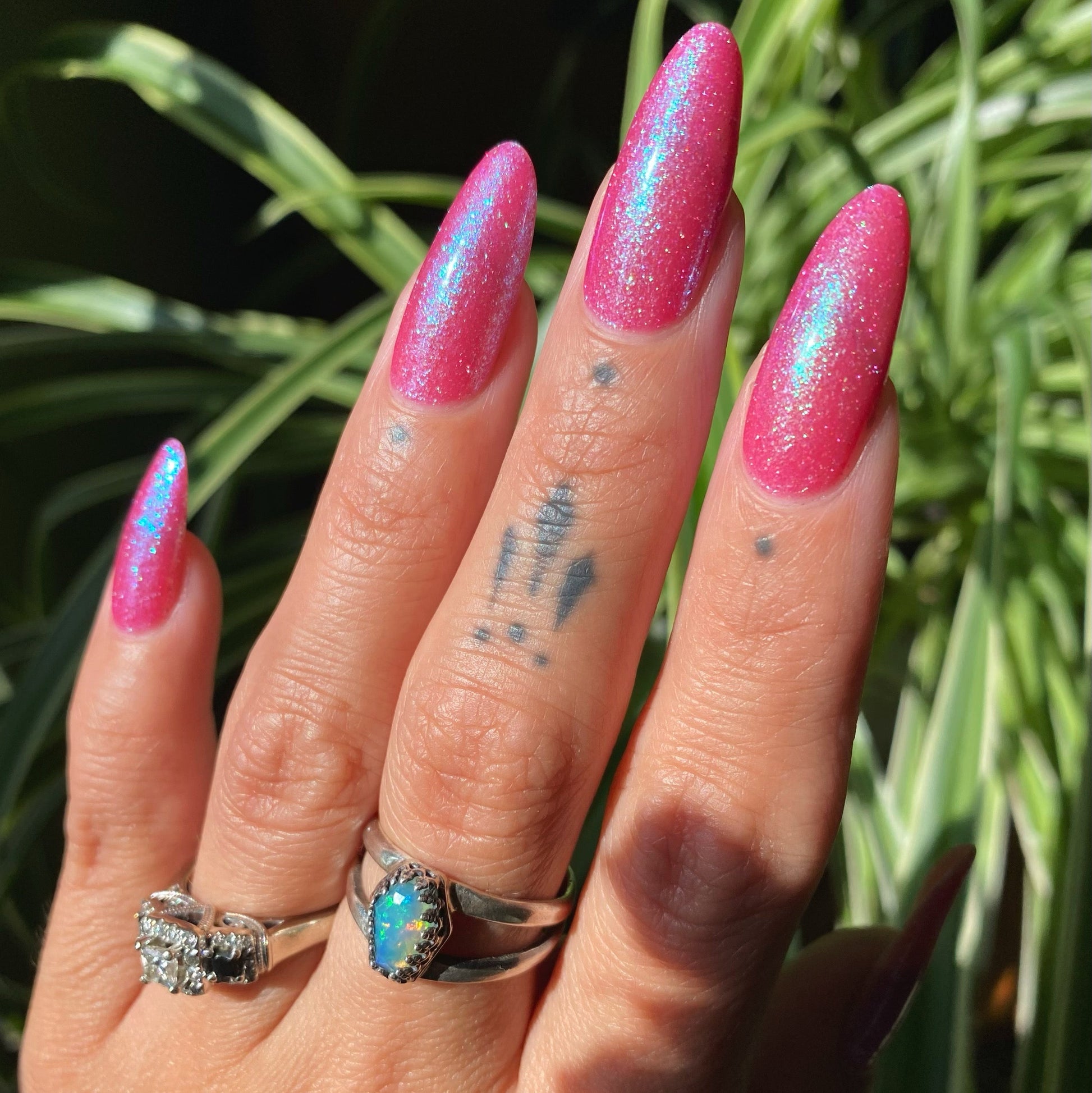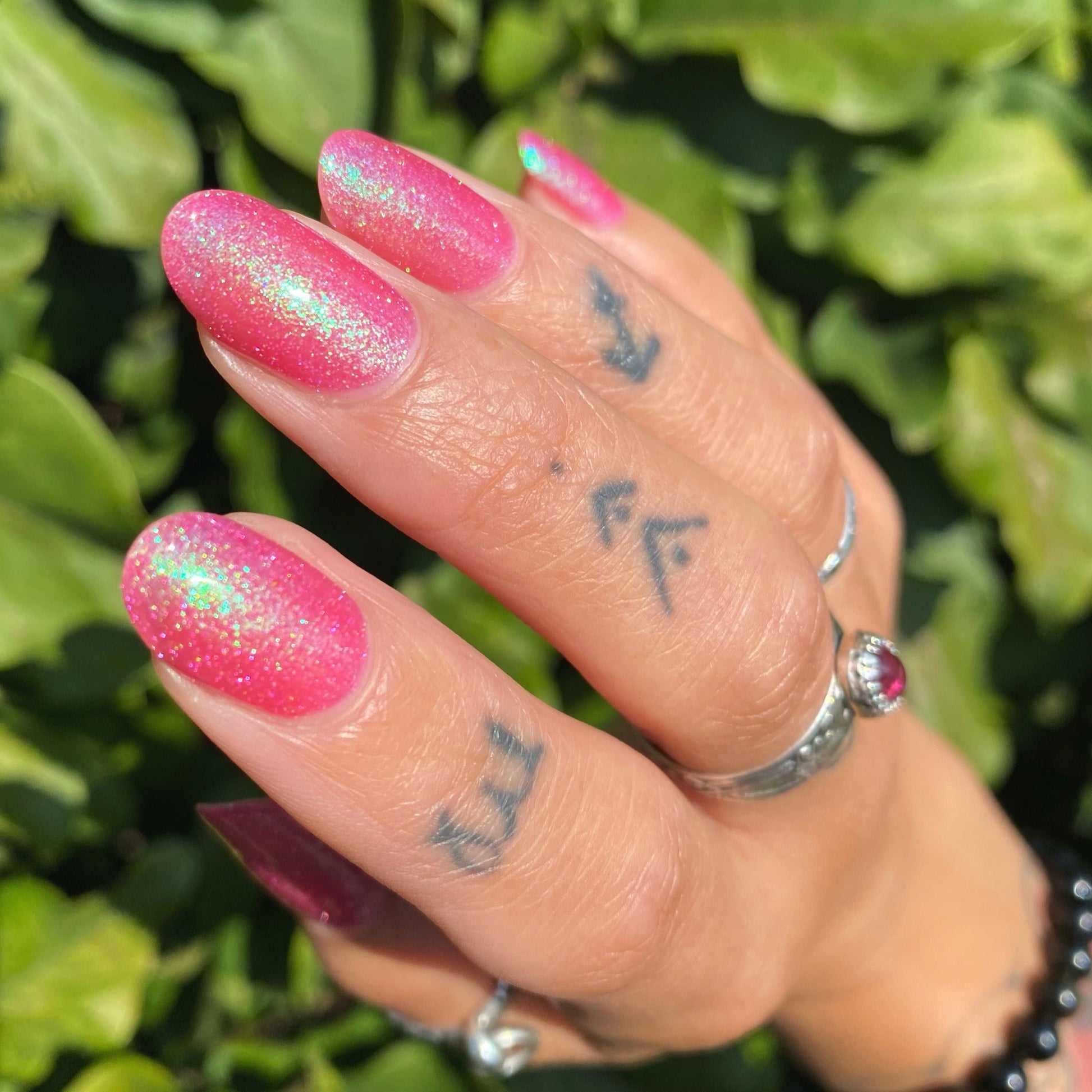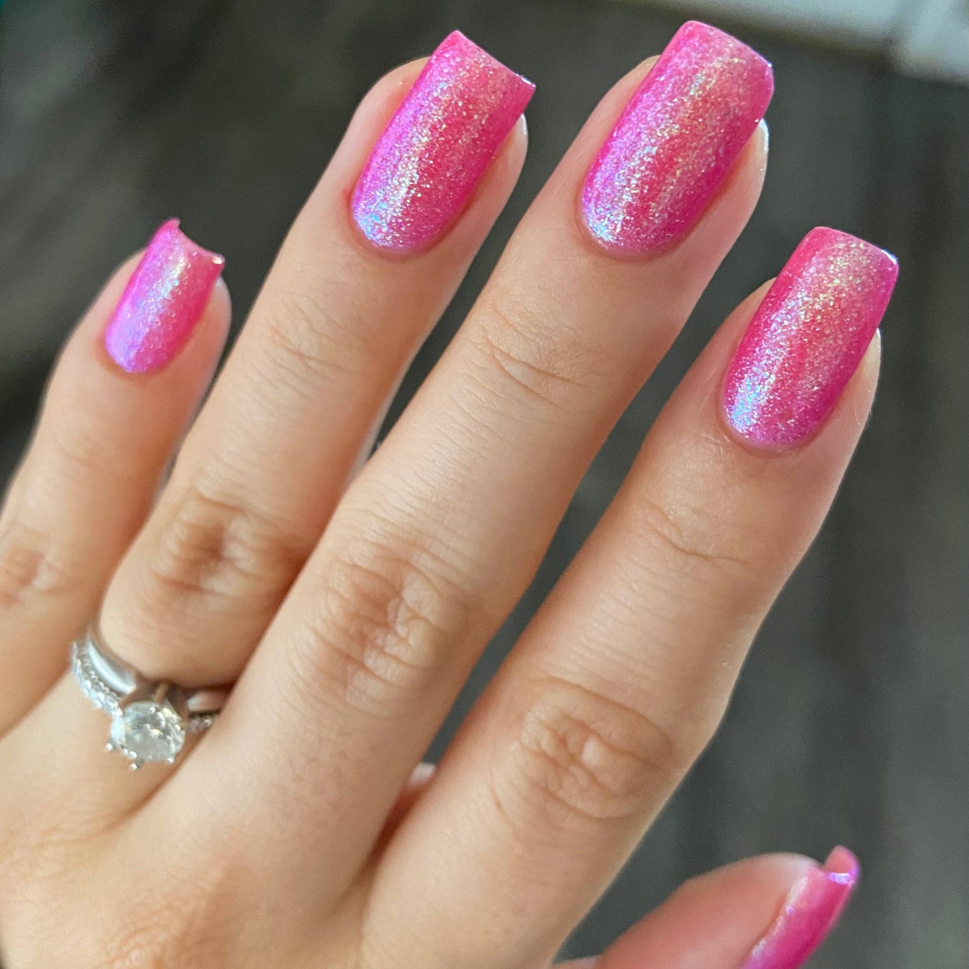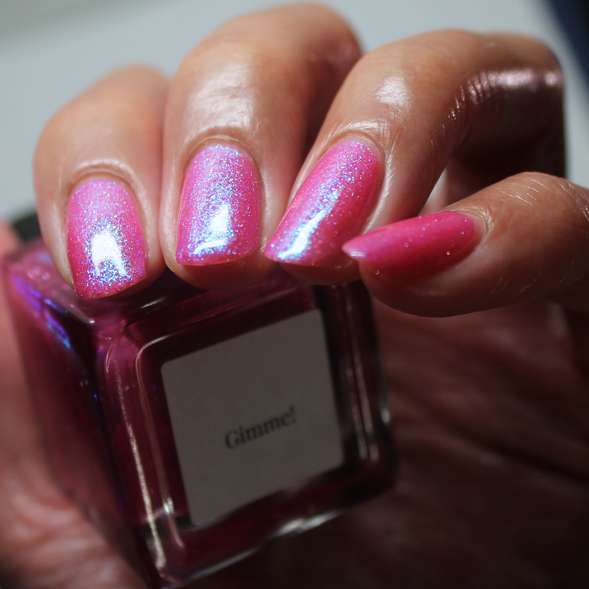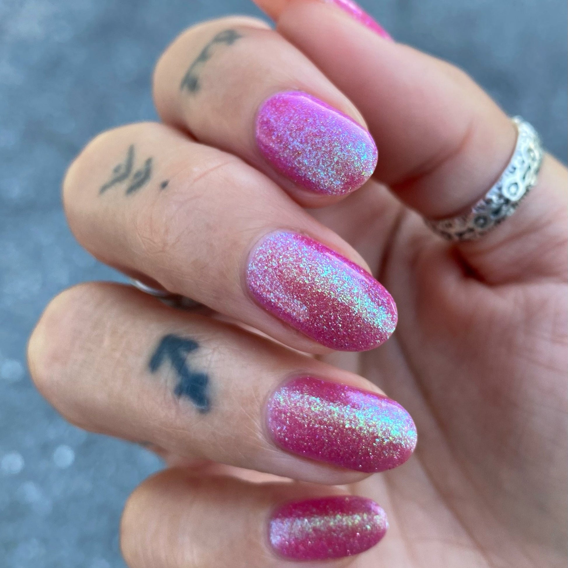 A semi-sheer pink crelly base with aurora microflake shimmer that shifts from green to blue to purple and a sprinkling of pink light reflective glitter.