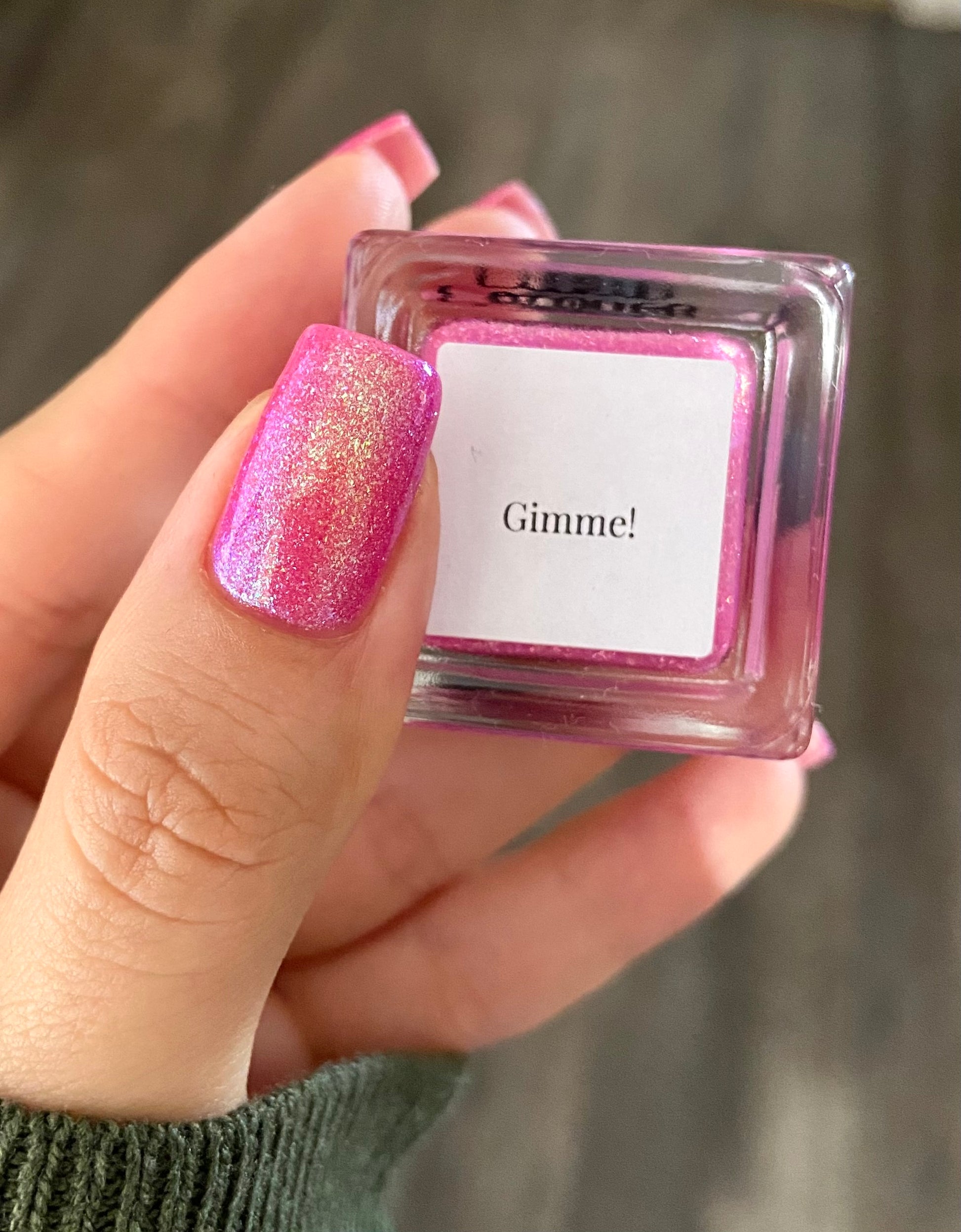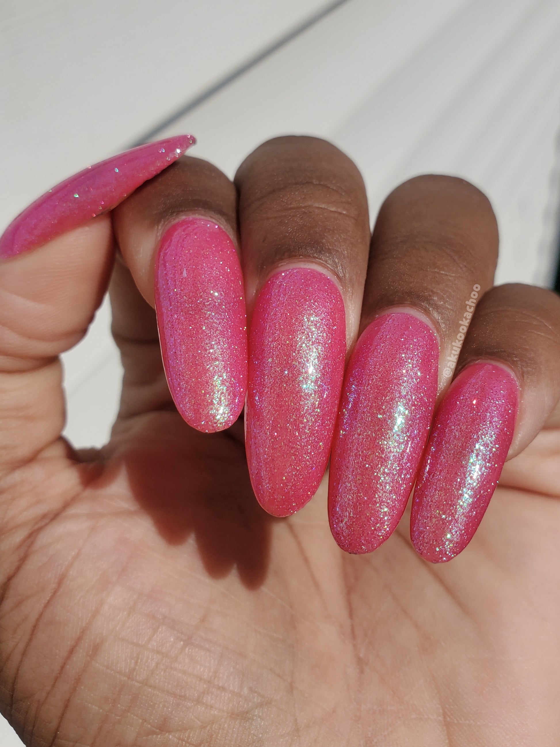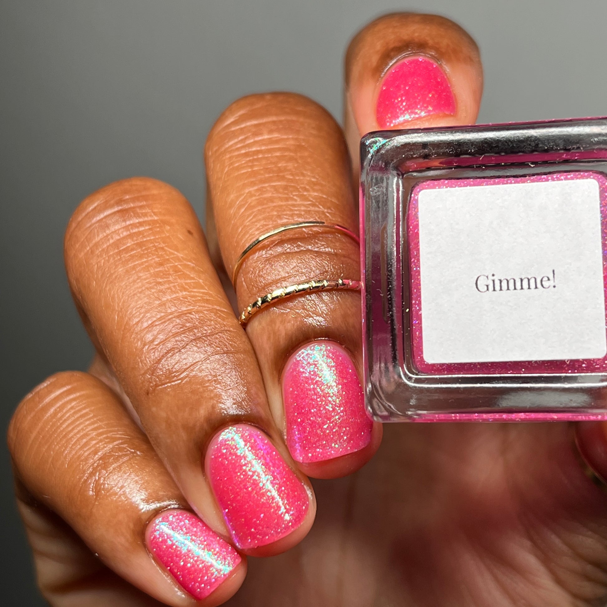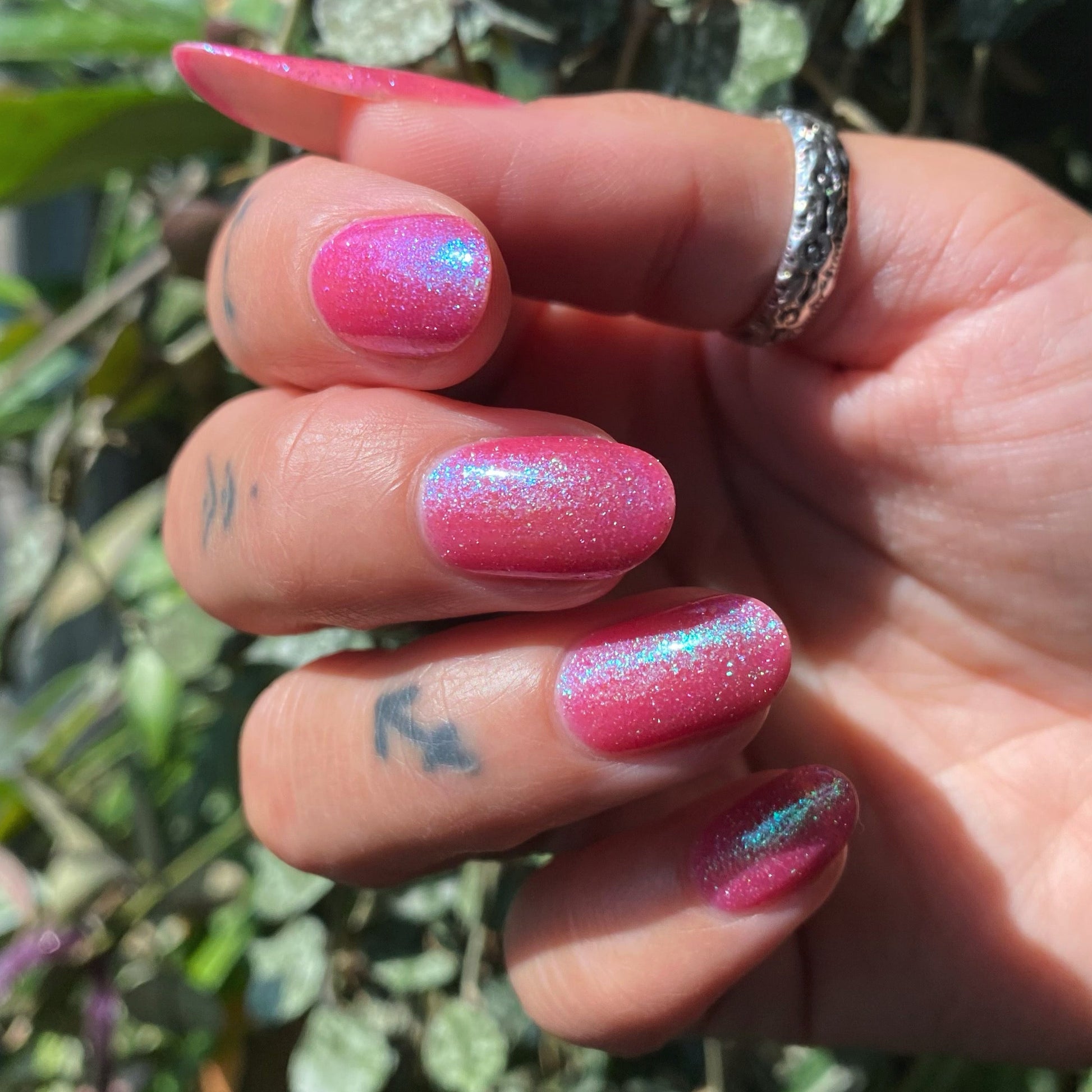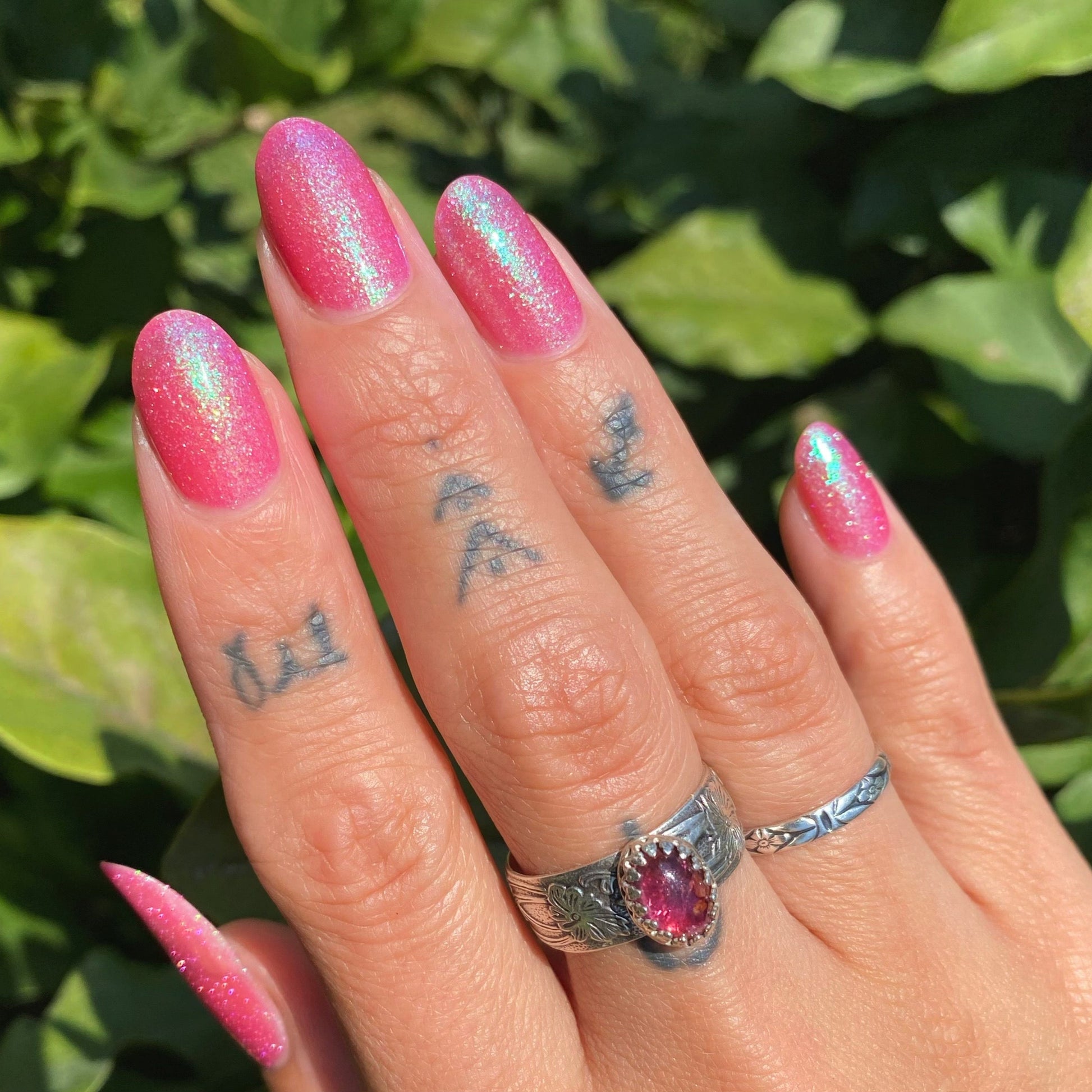 A semi-sheer pink crelly base with aurora microflake shimmer that shifts from green to blue to purple and a sprinkling of pink light reflective glitter.