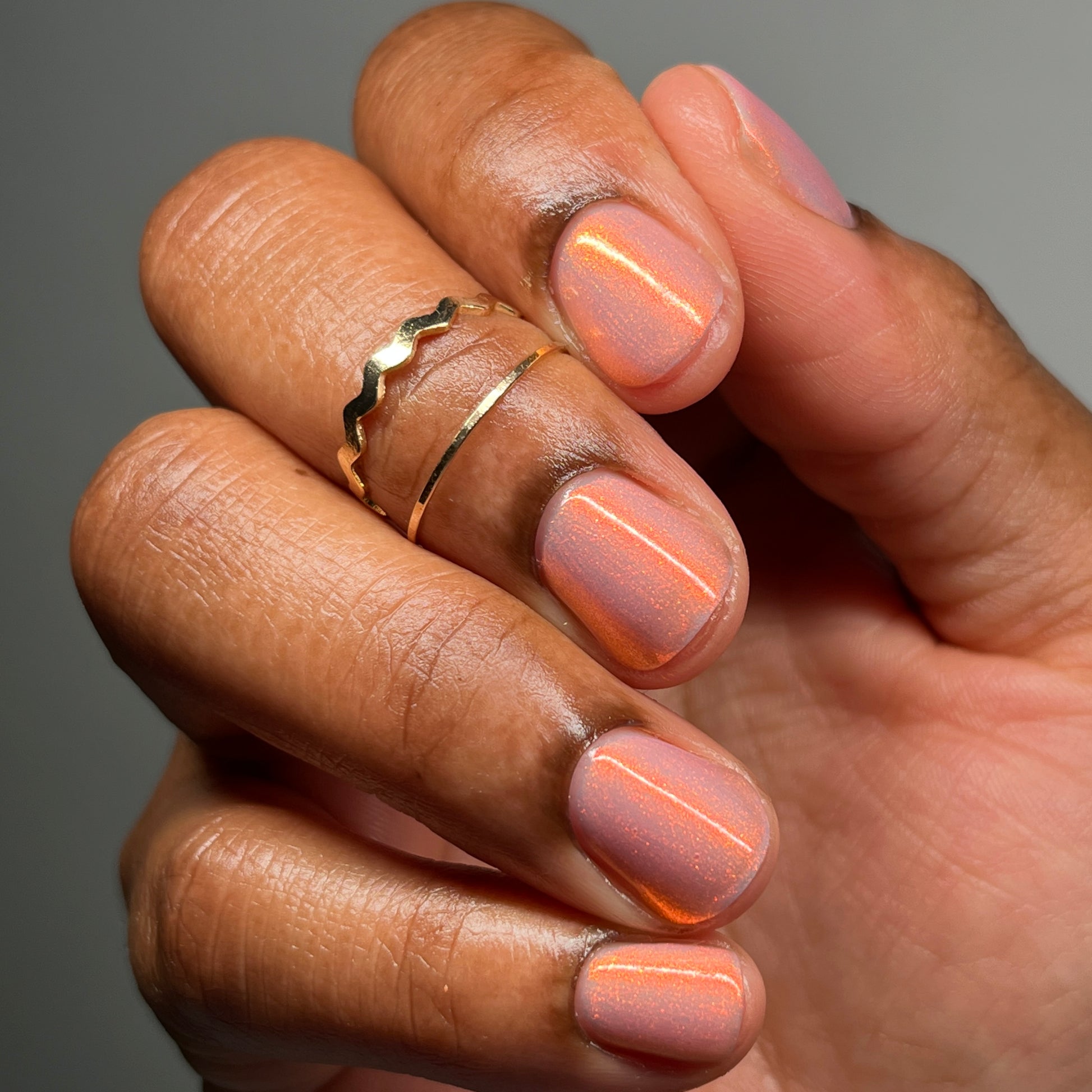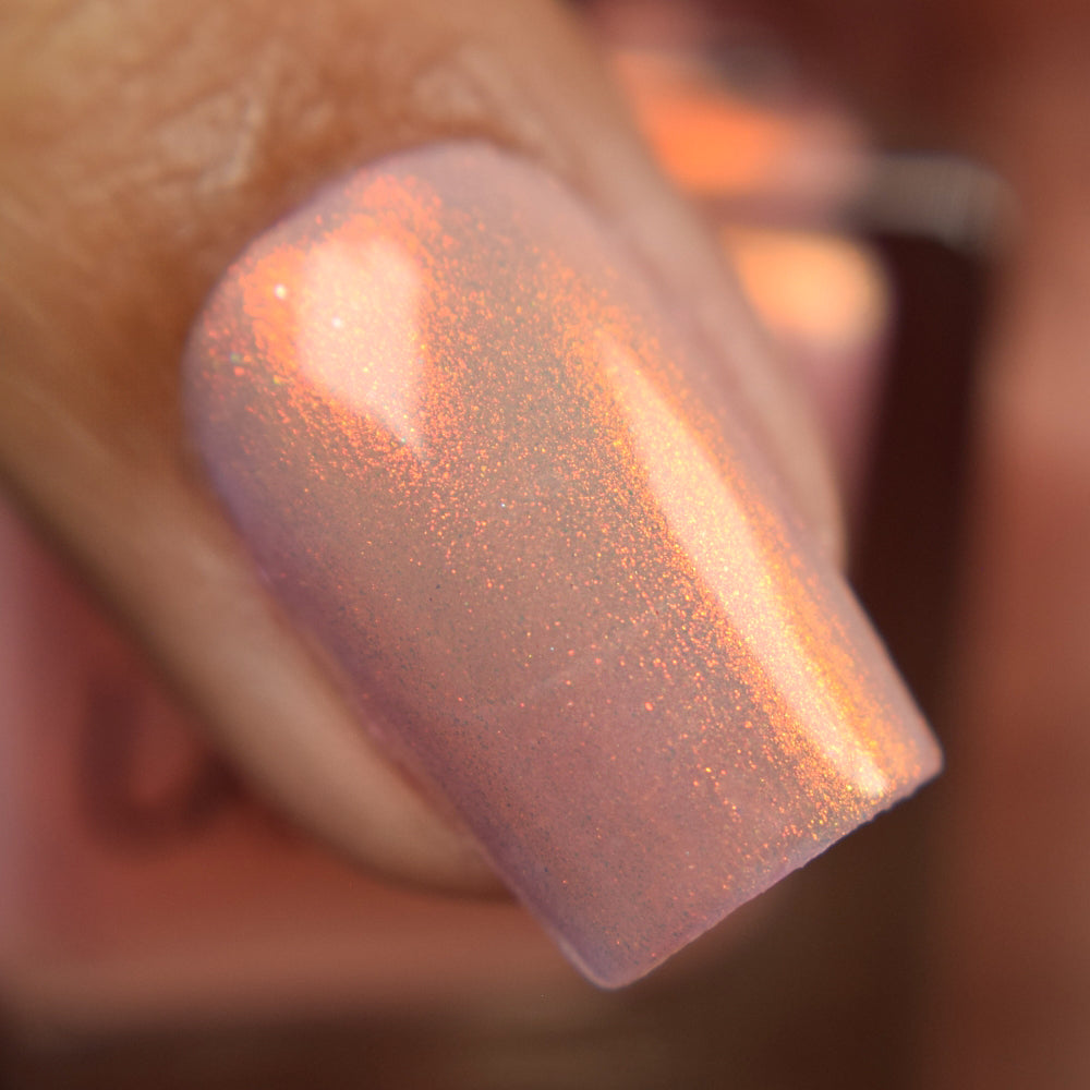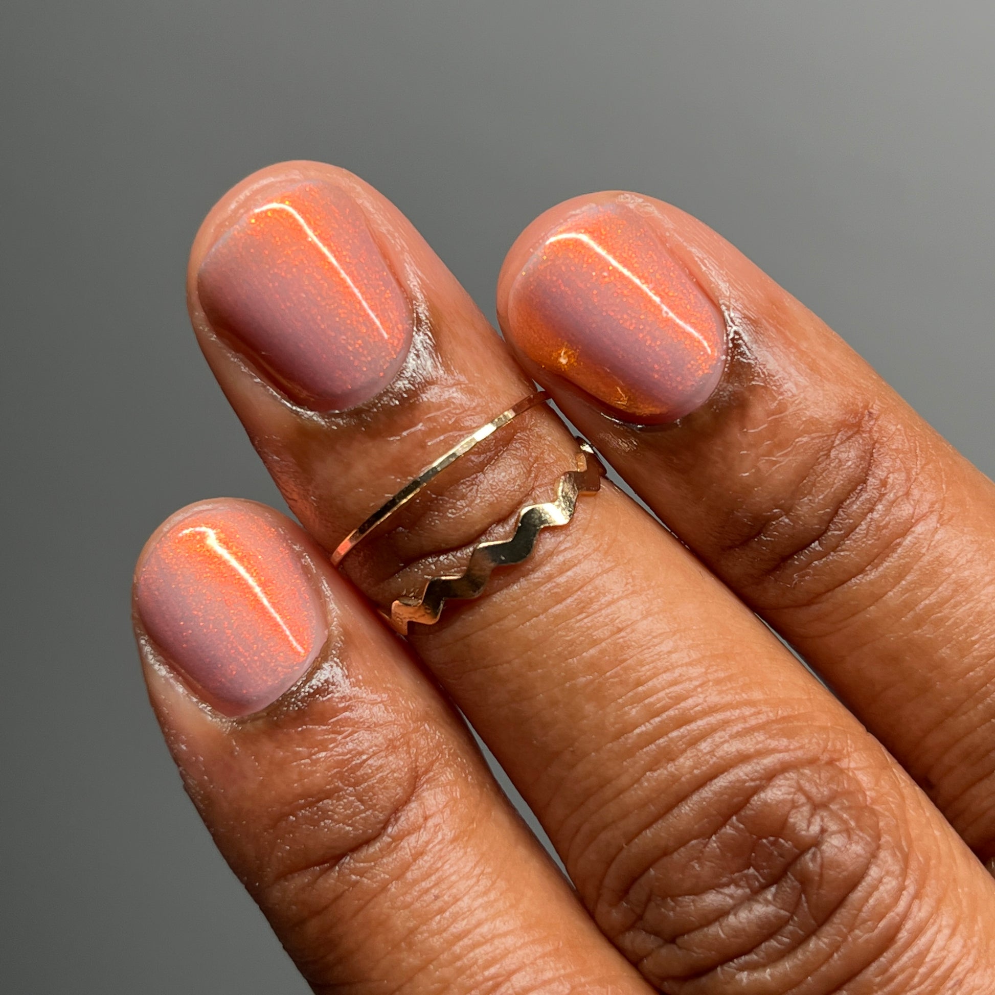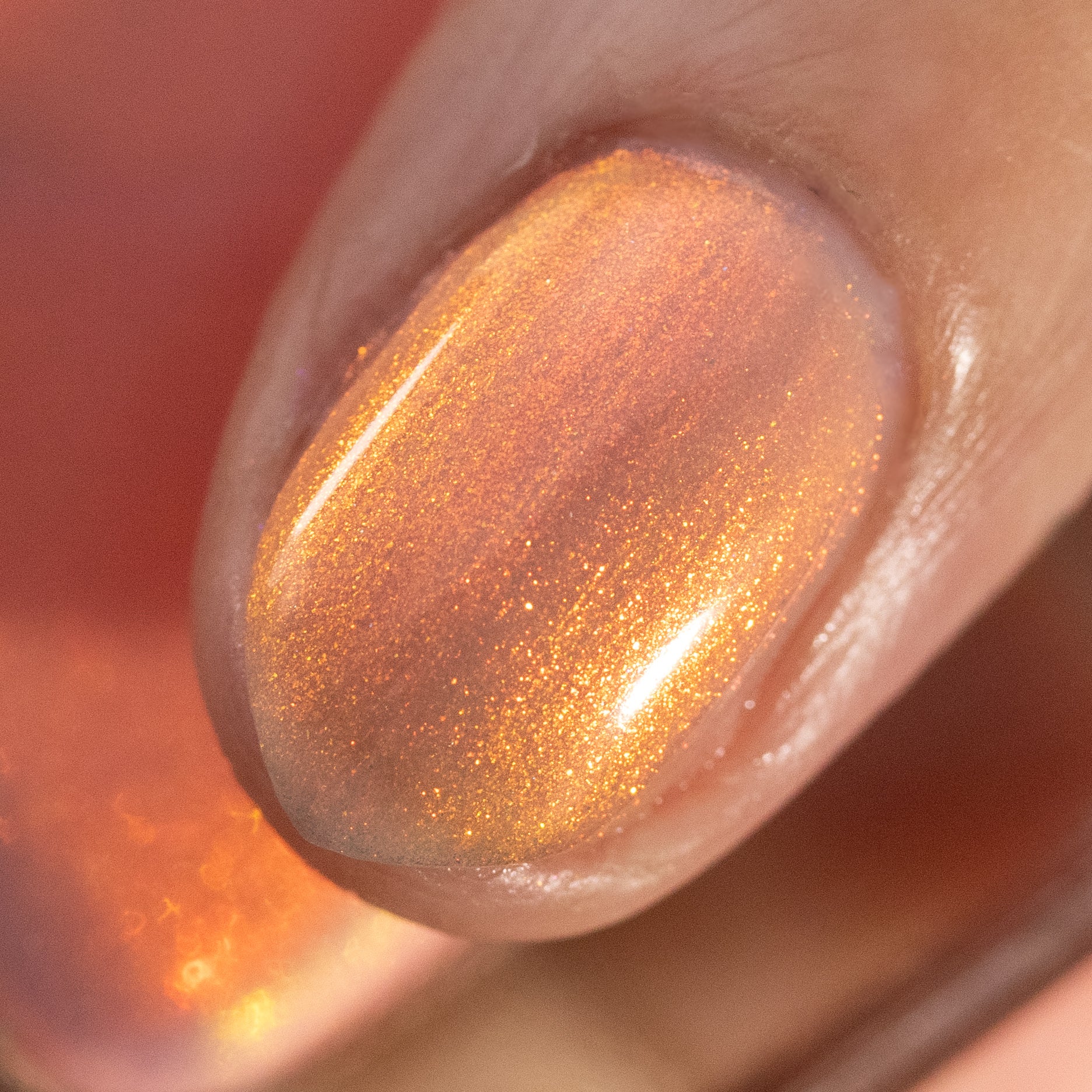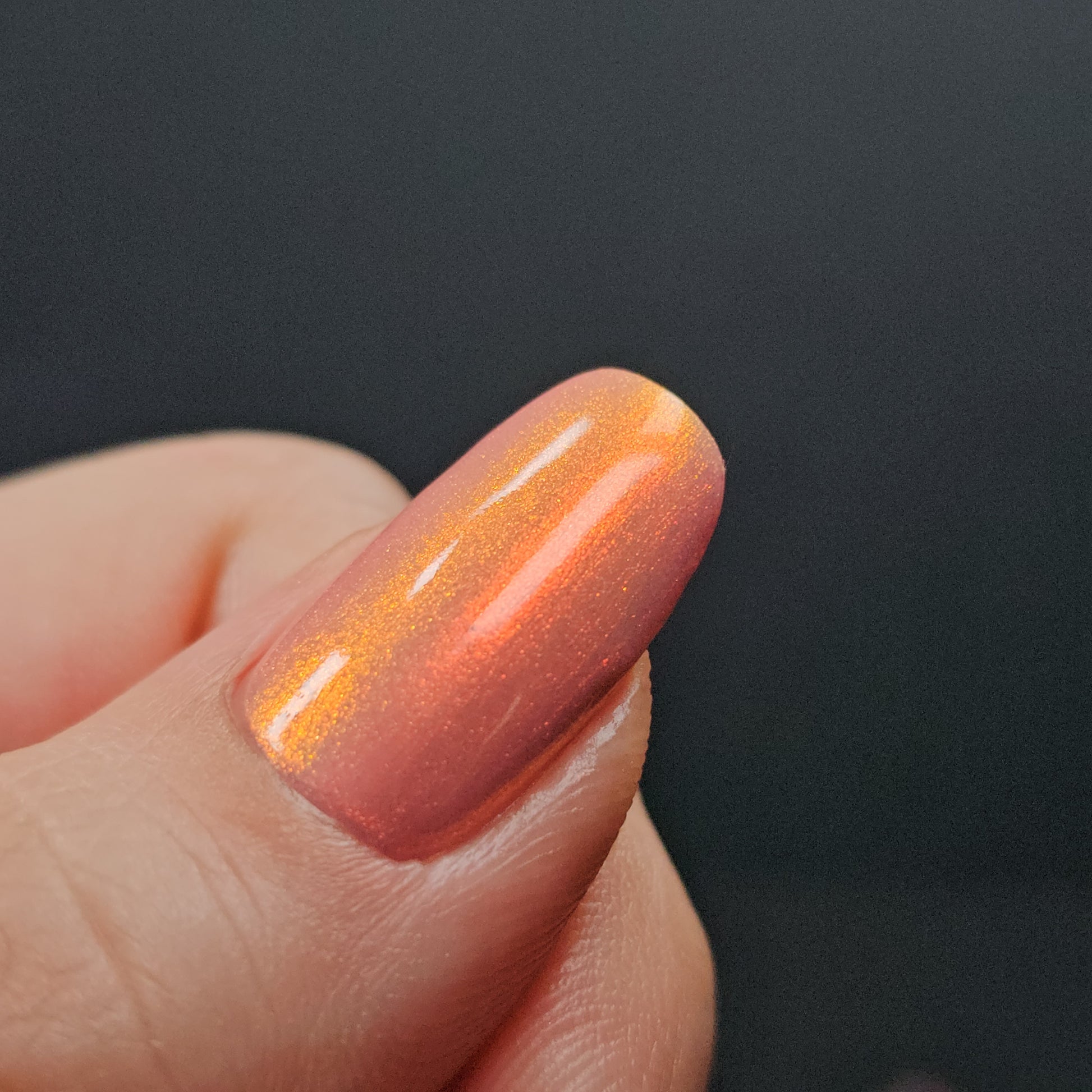A grapefruit pink crelly base with vibrant orange to gold shimmer