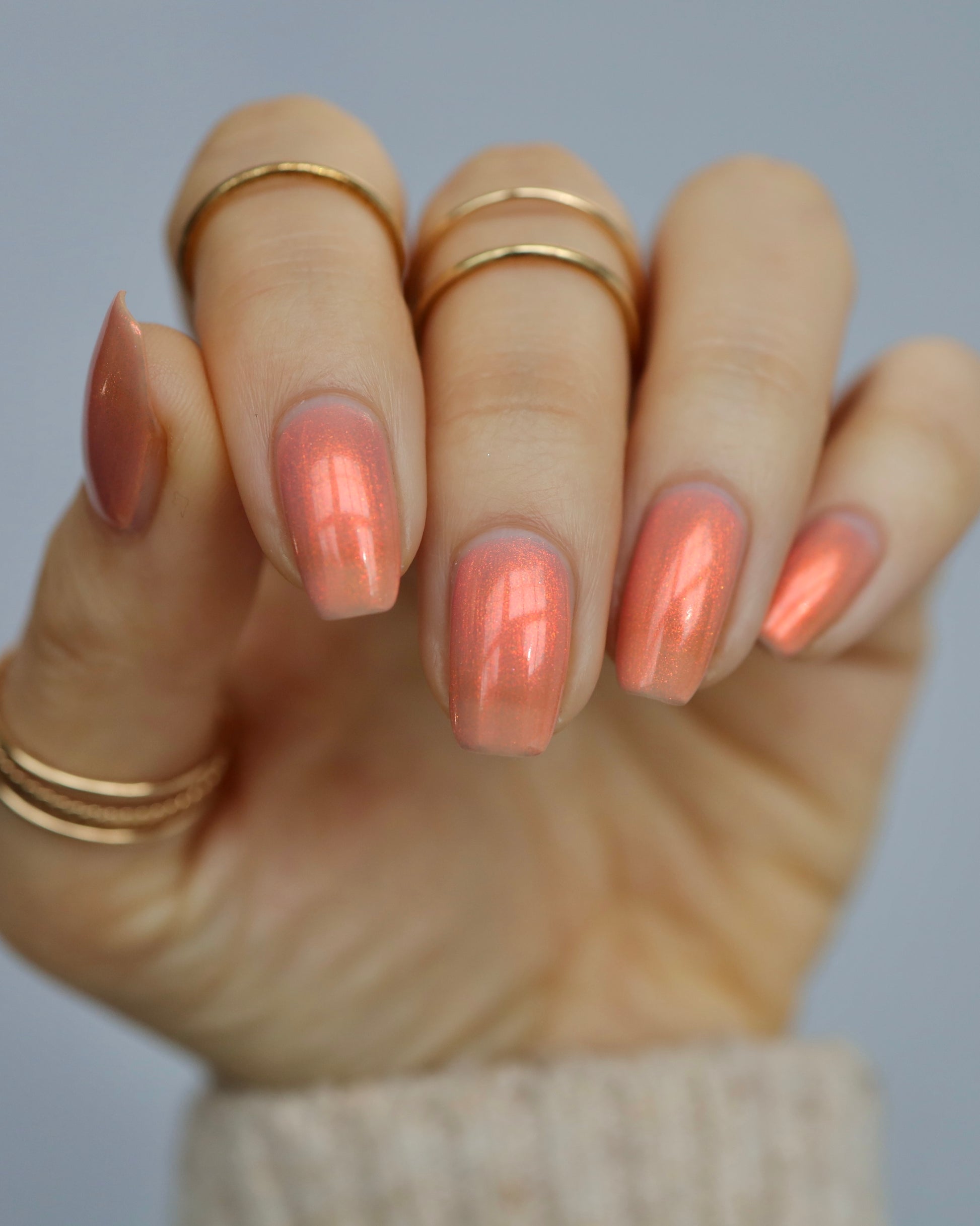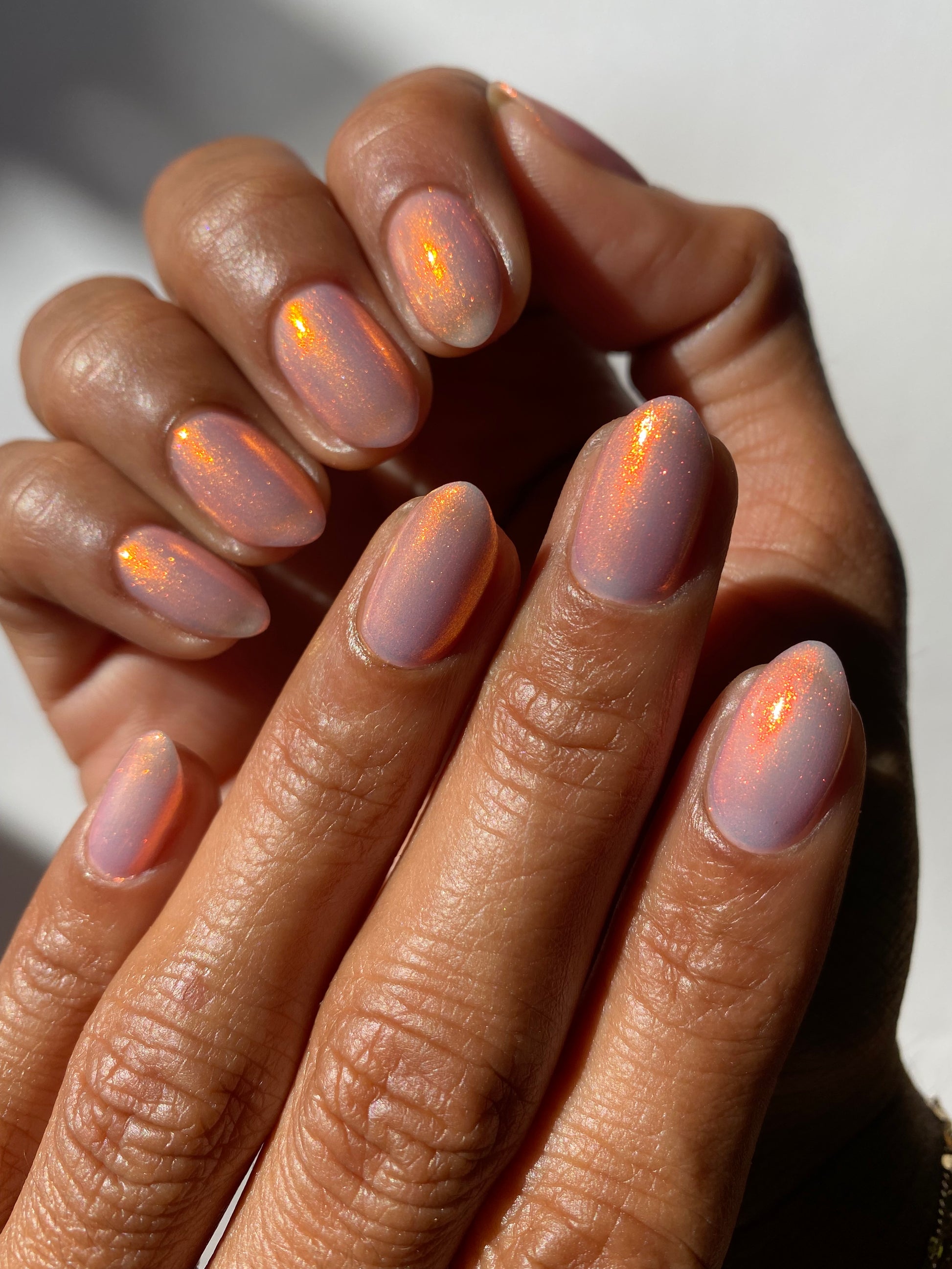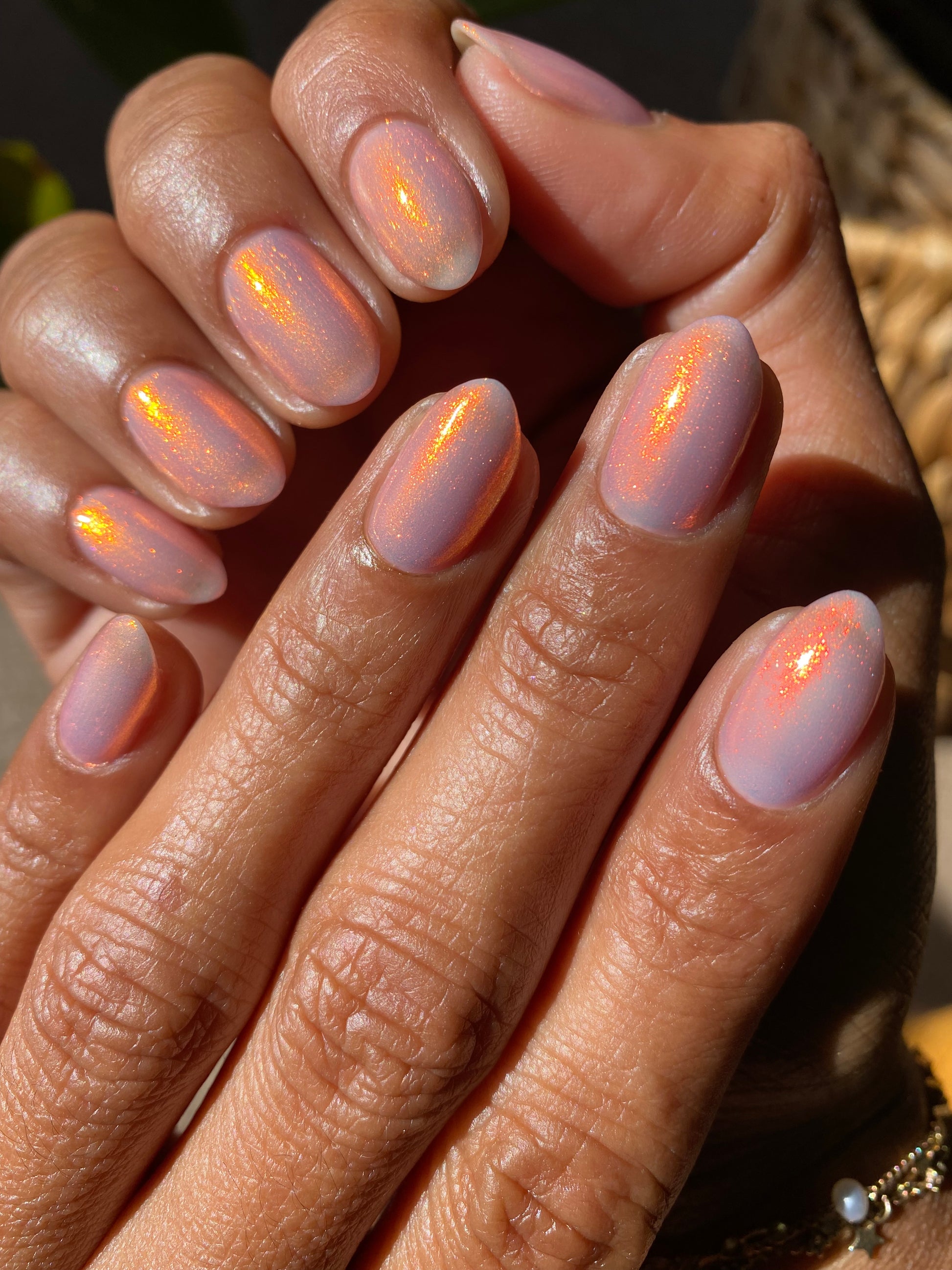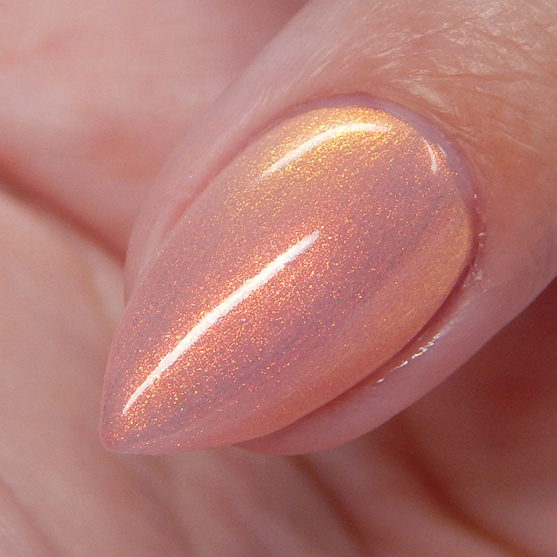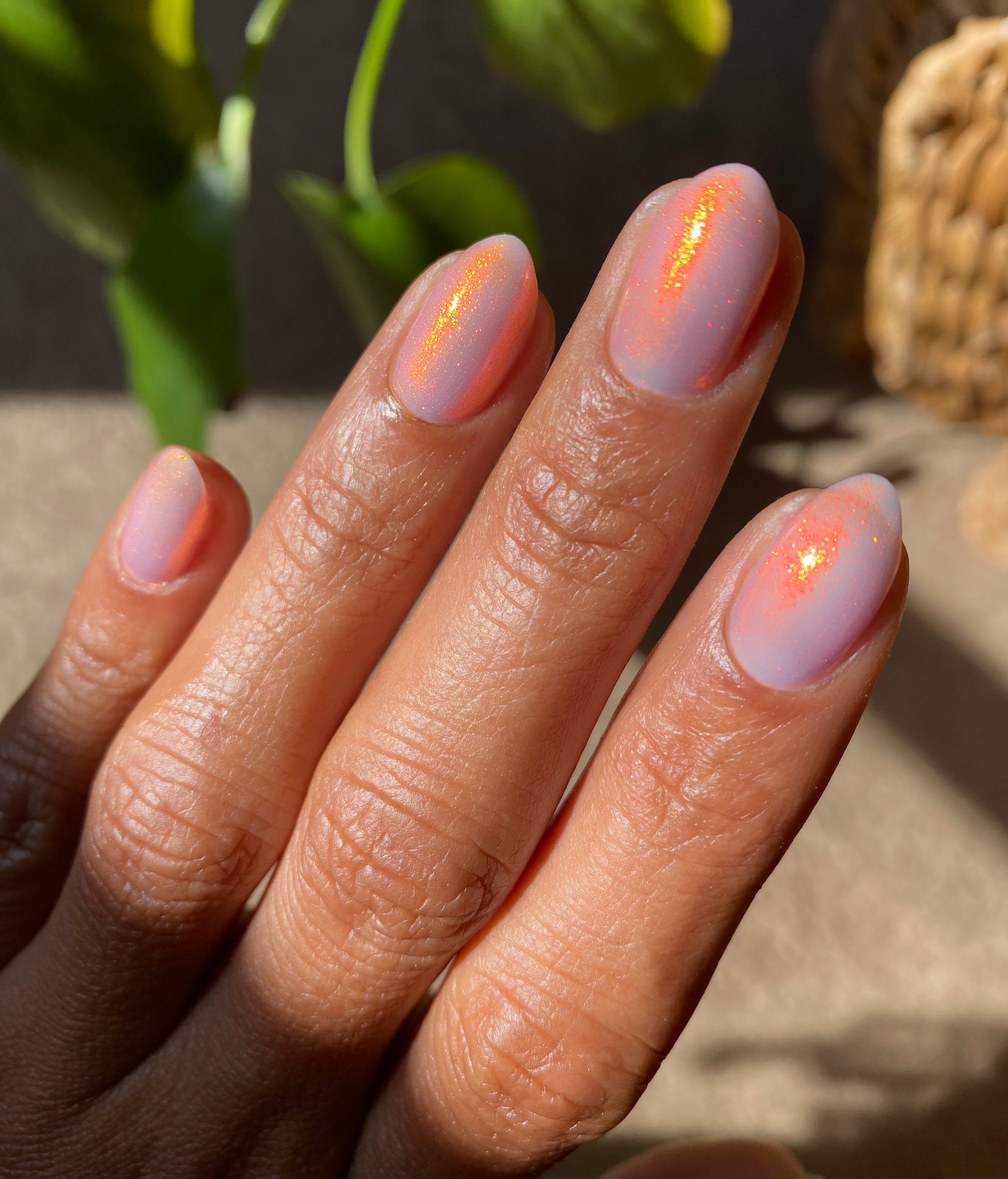 A grapefruit pink crelly base with vibrant orange to gold shimmer