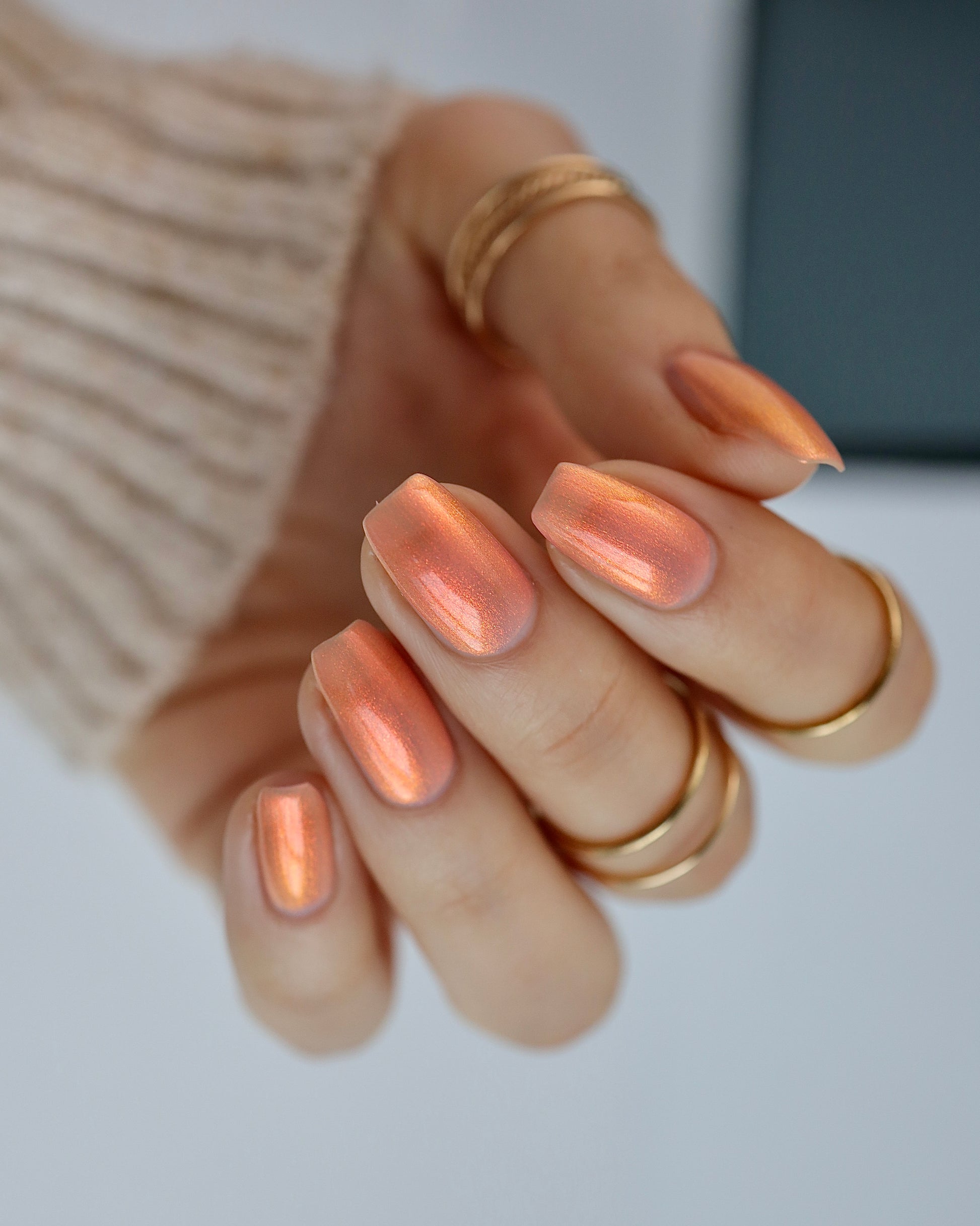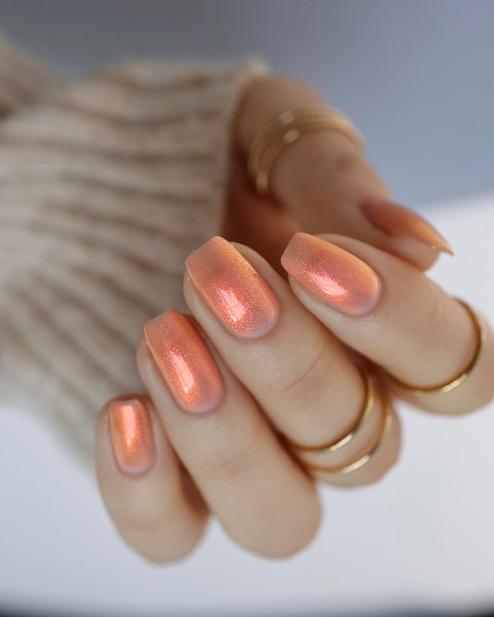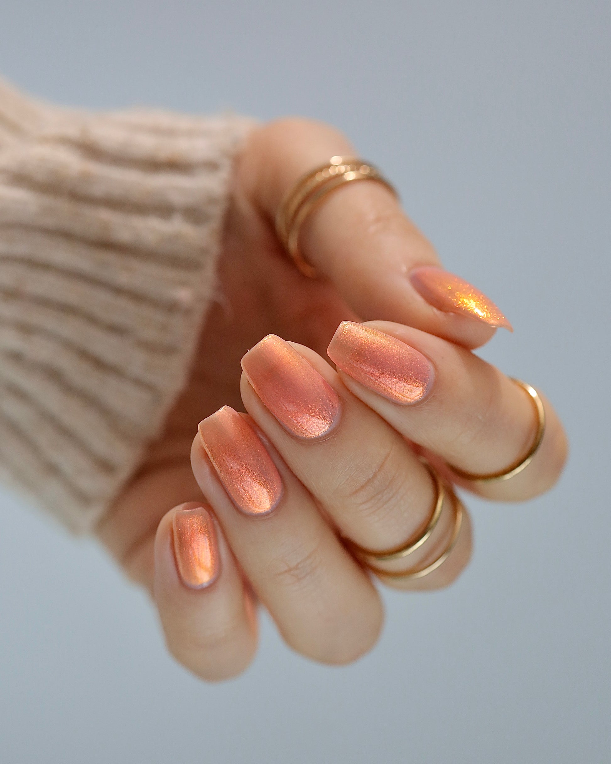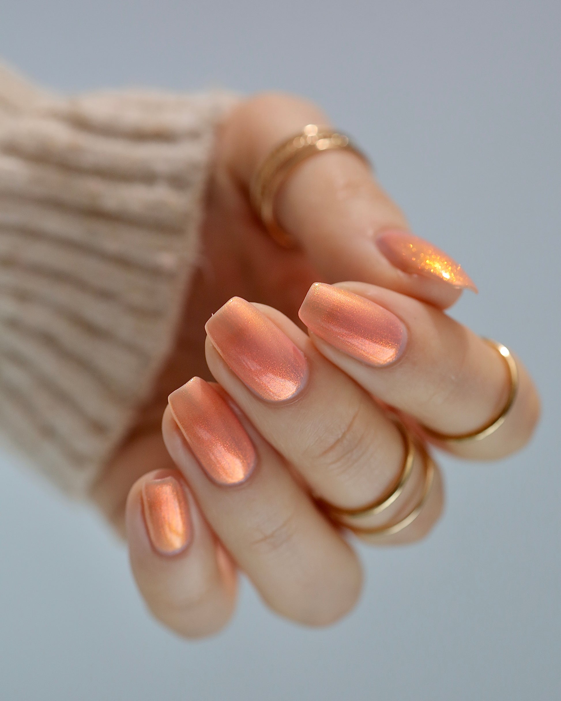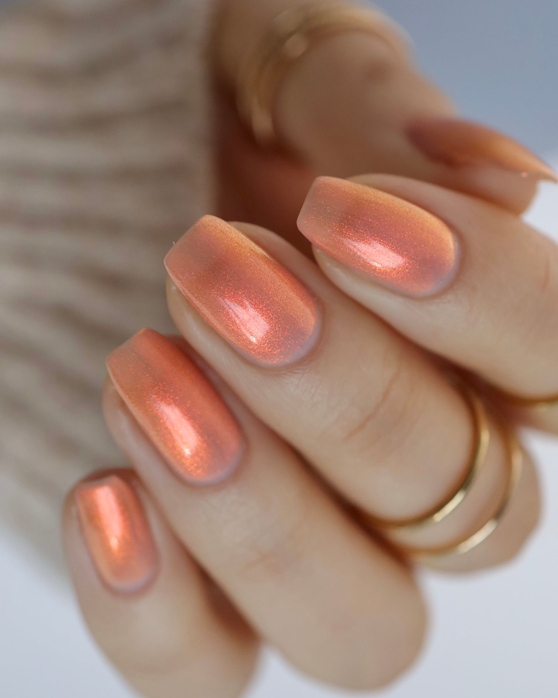 A grapefruit pink crelly base with vibrant orange to gold shimmer
