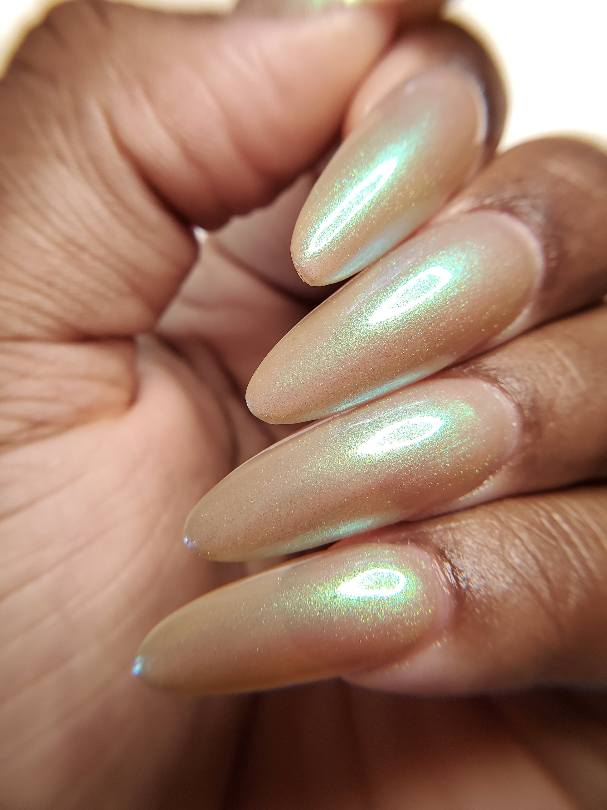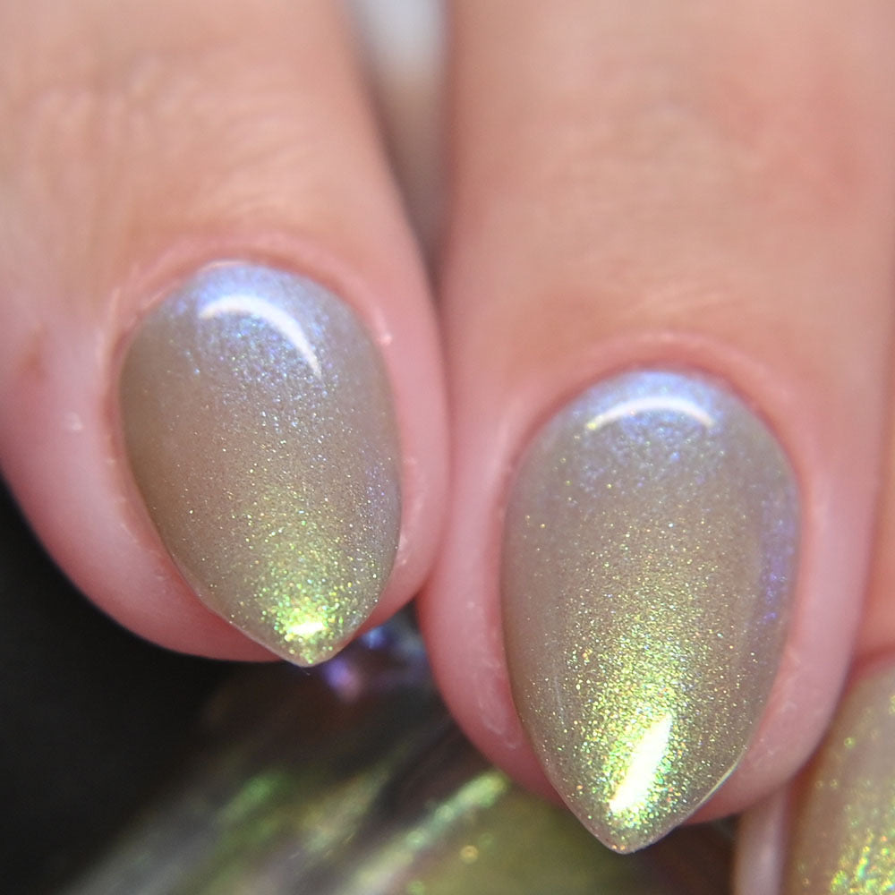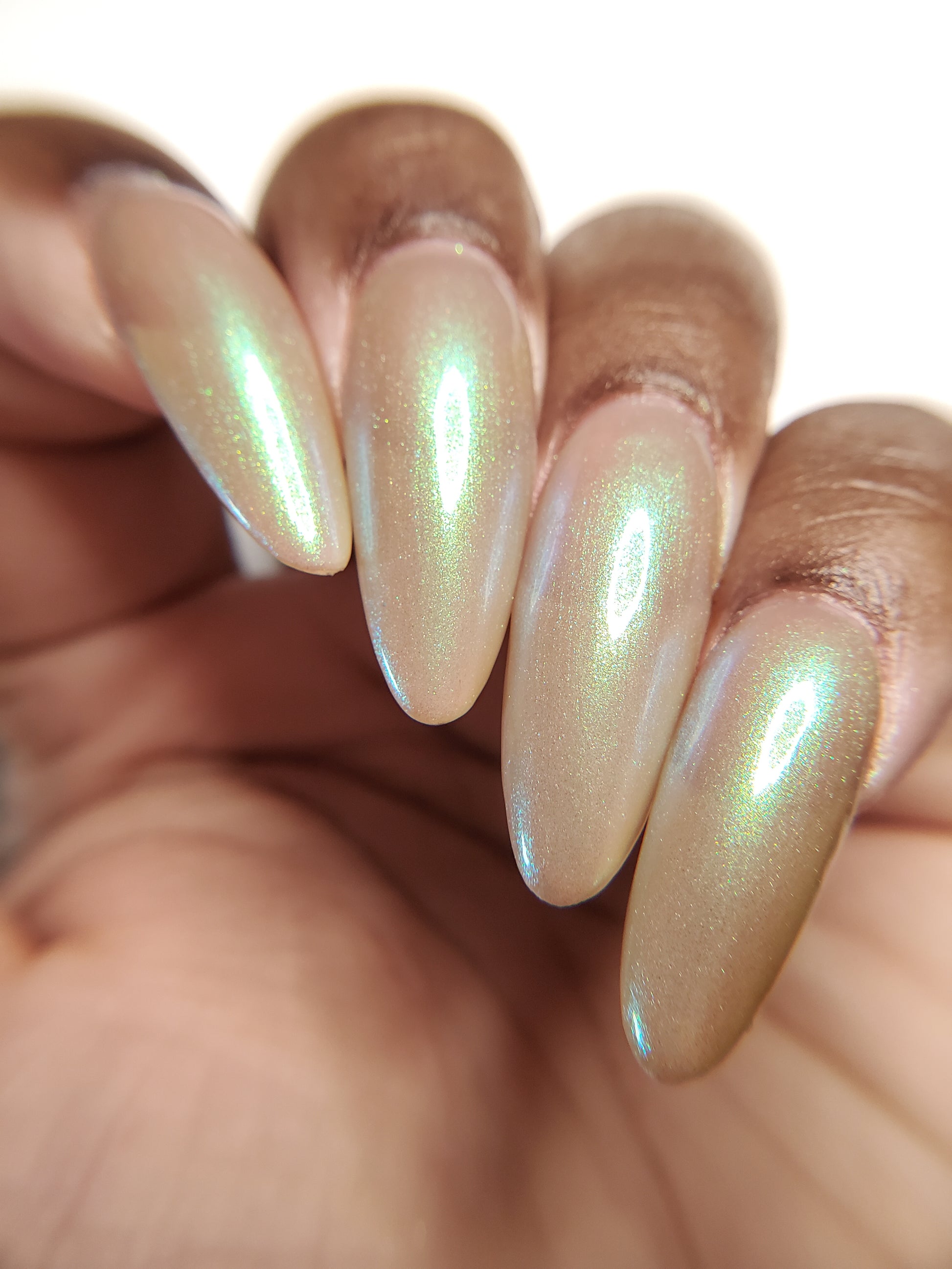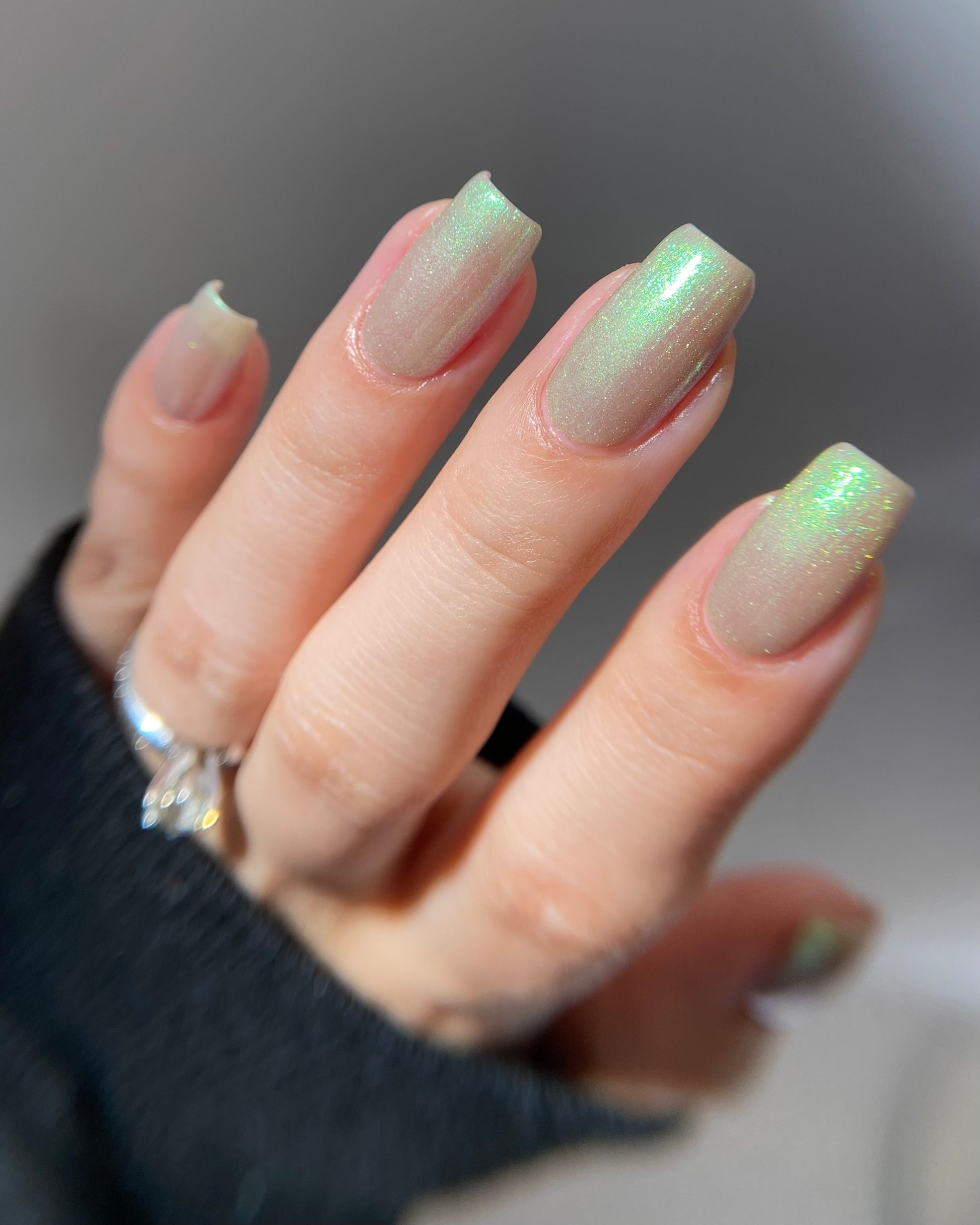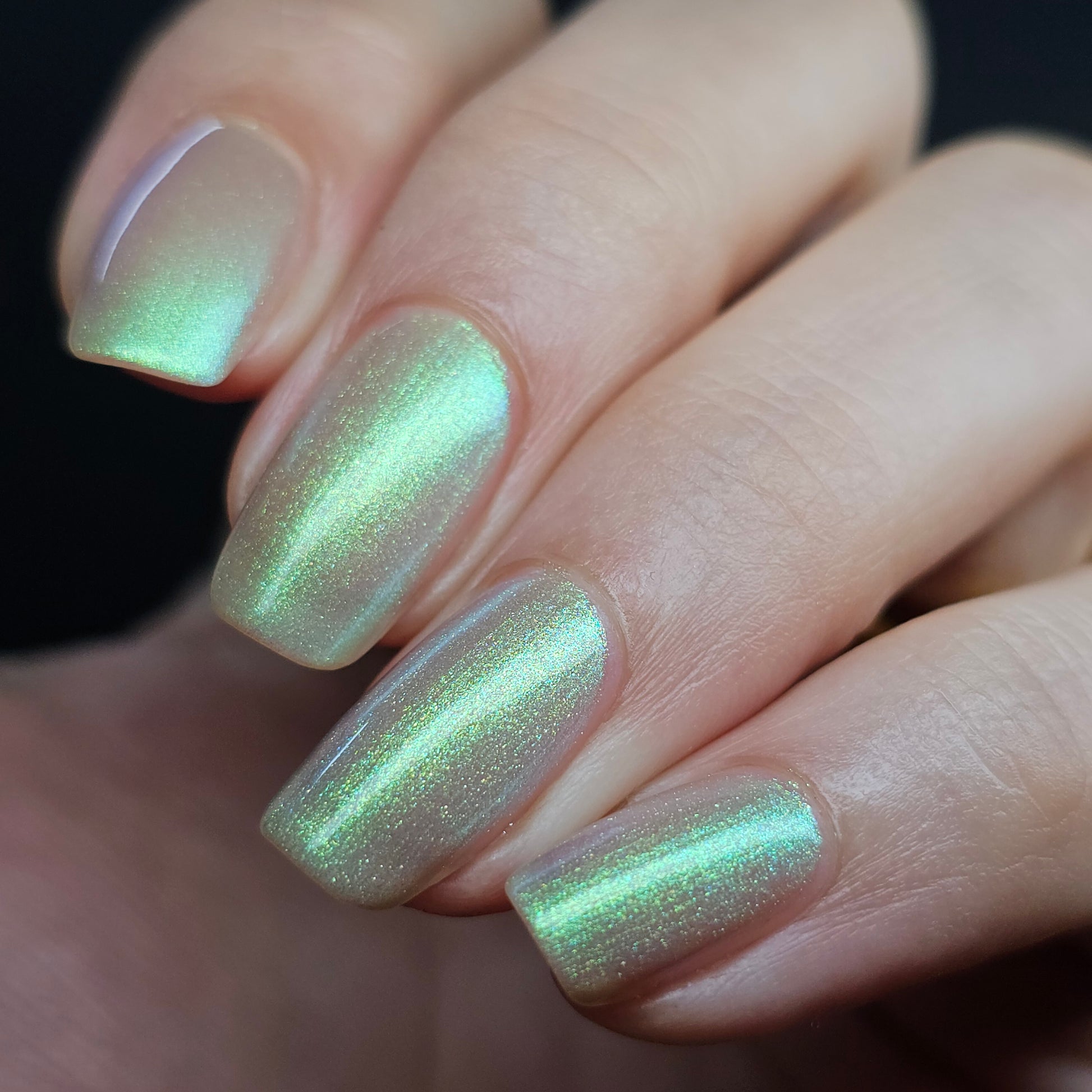 A semi-sheer taupe base with warm-toned green aurora shimmer that shifts to blue